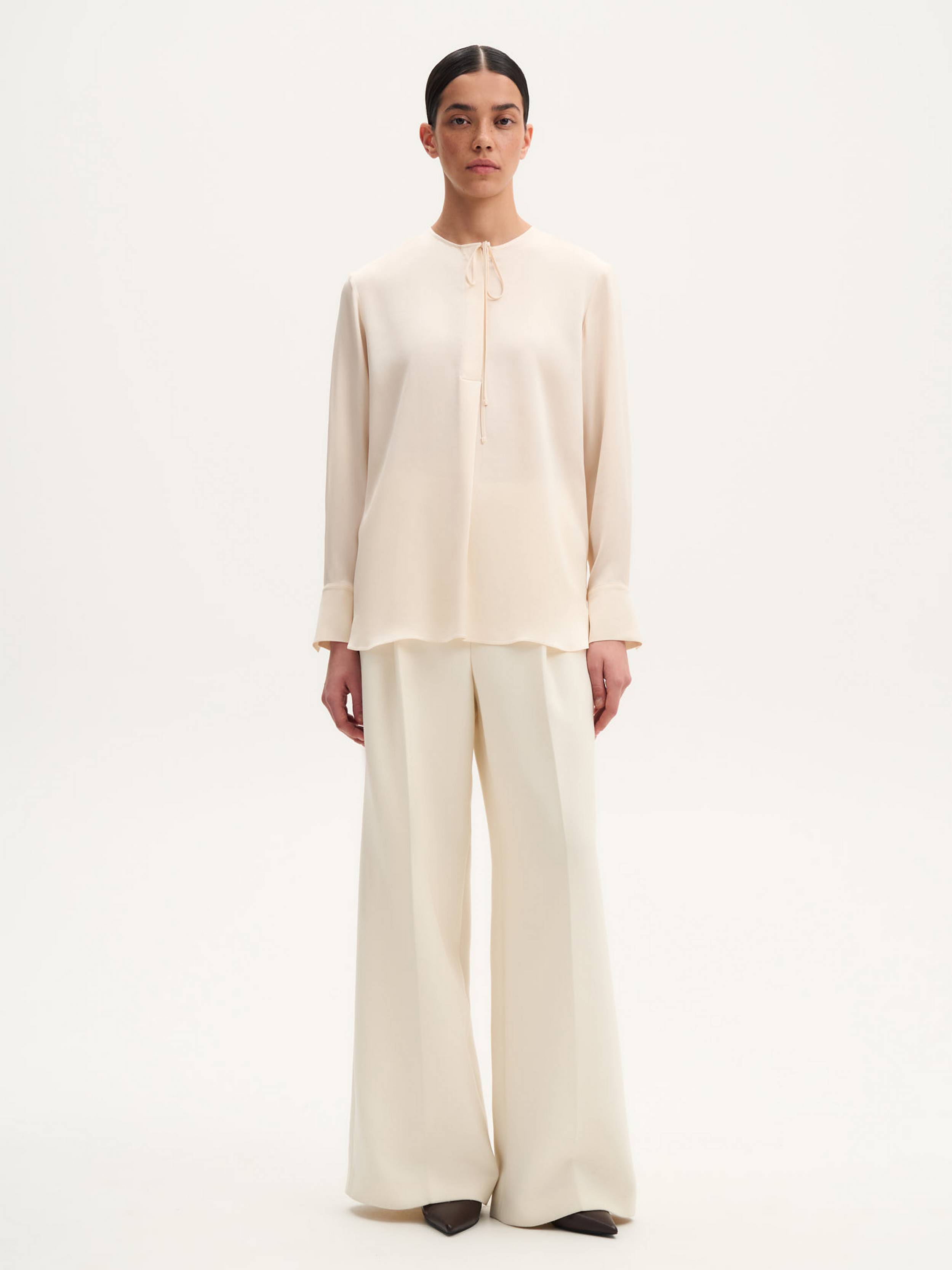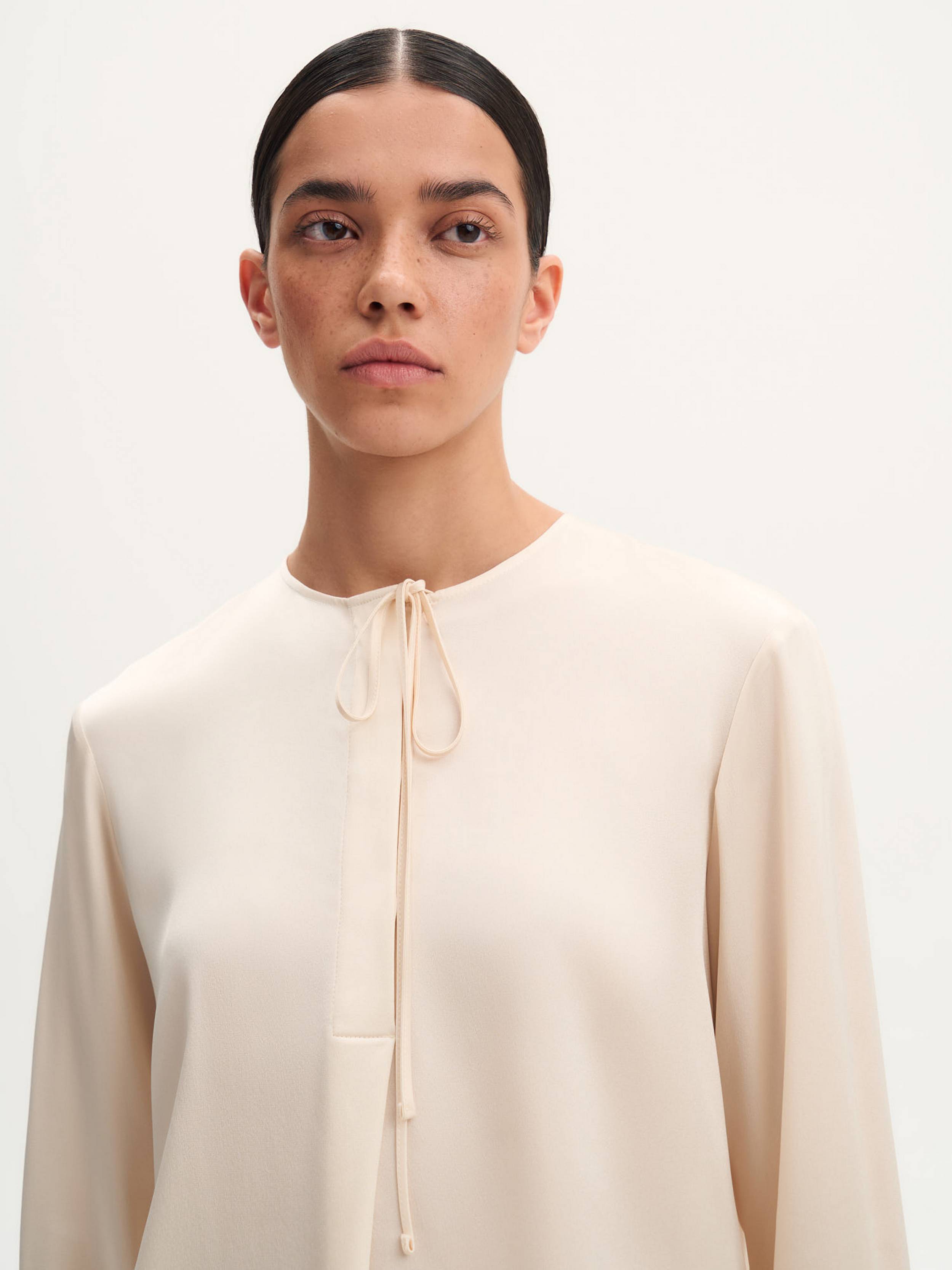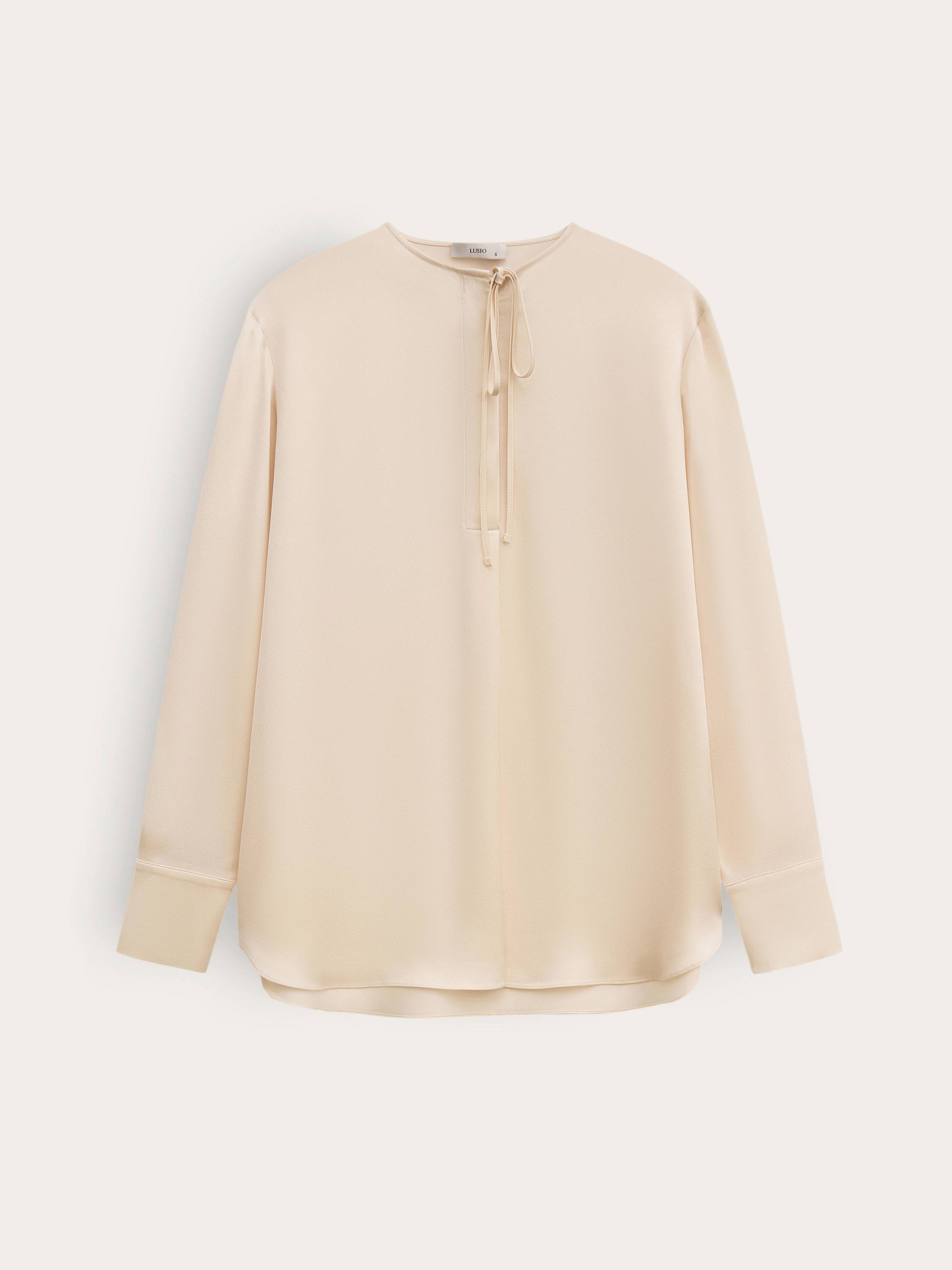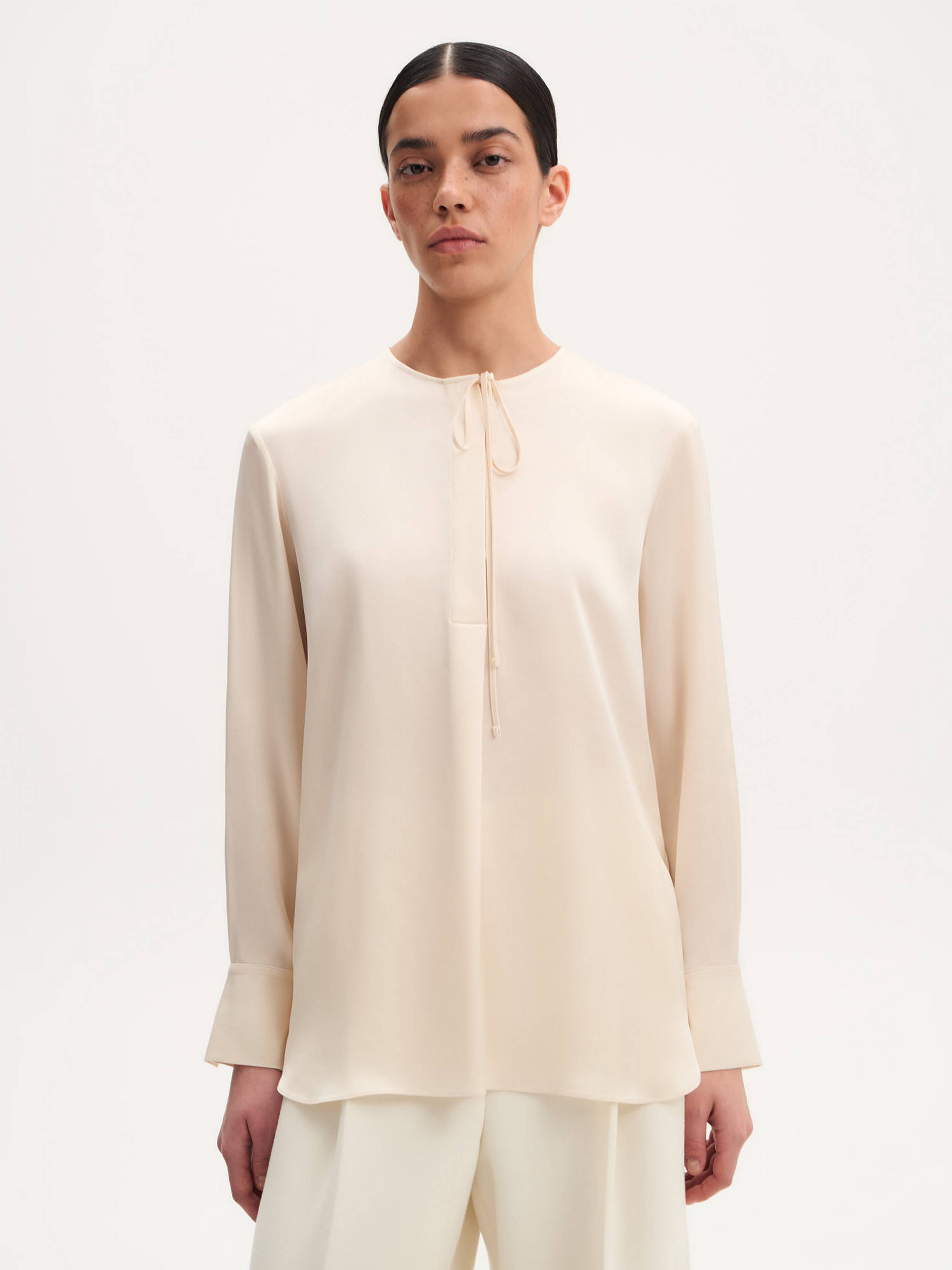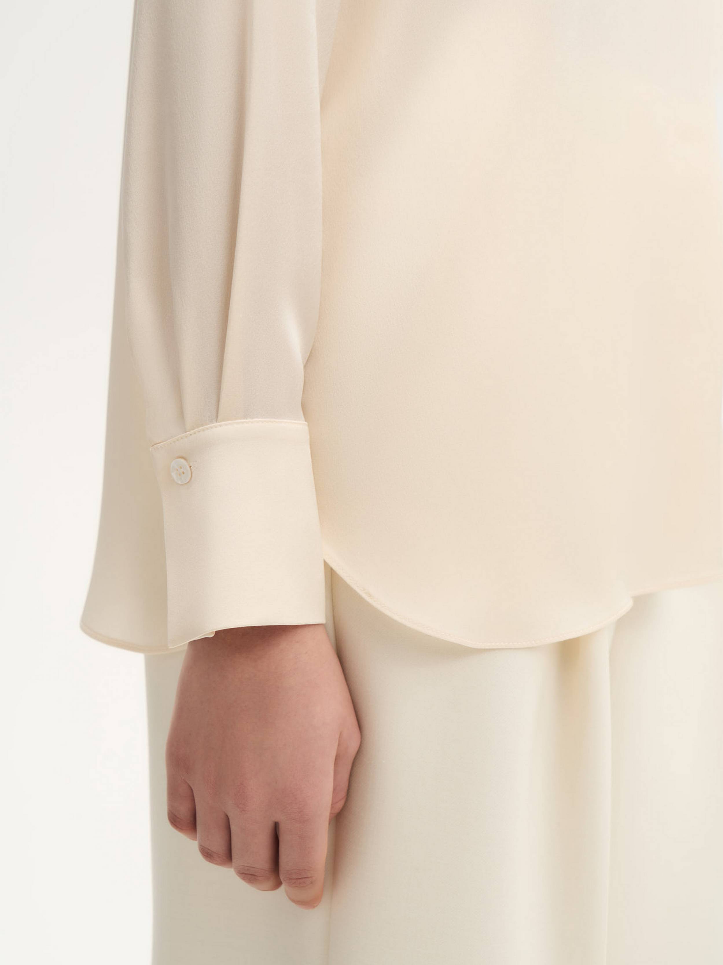 Блуза, в которой простота линий сочетается с благородством материала. Лаконичный крой с мягкой драпировкой, манжеты и легкая удлиненная спинка создают расслабленный, но собранный силуэт. Полотно сочетает в себе шелк и ацетат: первый придает ткани мягкость, деликатный блеск и плавное движение, а второй добавляет структуру, улучшает износостойкость и делает материал приятным на ощупь. Блуза легко вписывается в дневные и вечерние образы — как самостоятельный акцент или в паре с жакетом, юбкой или широкими брюками.