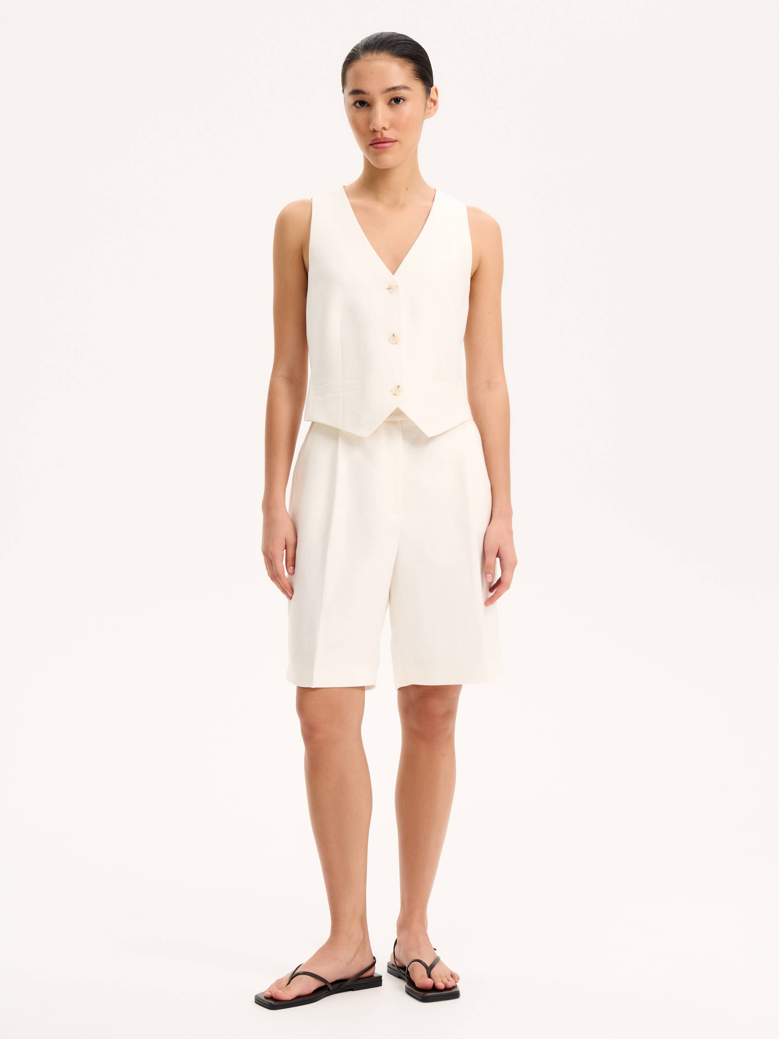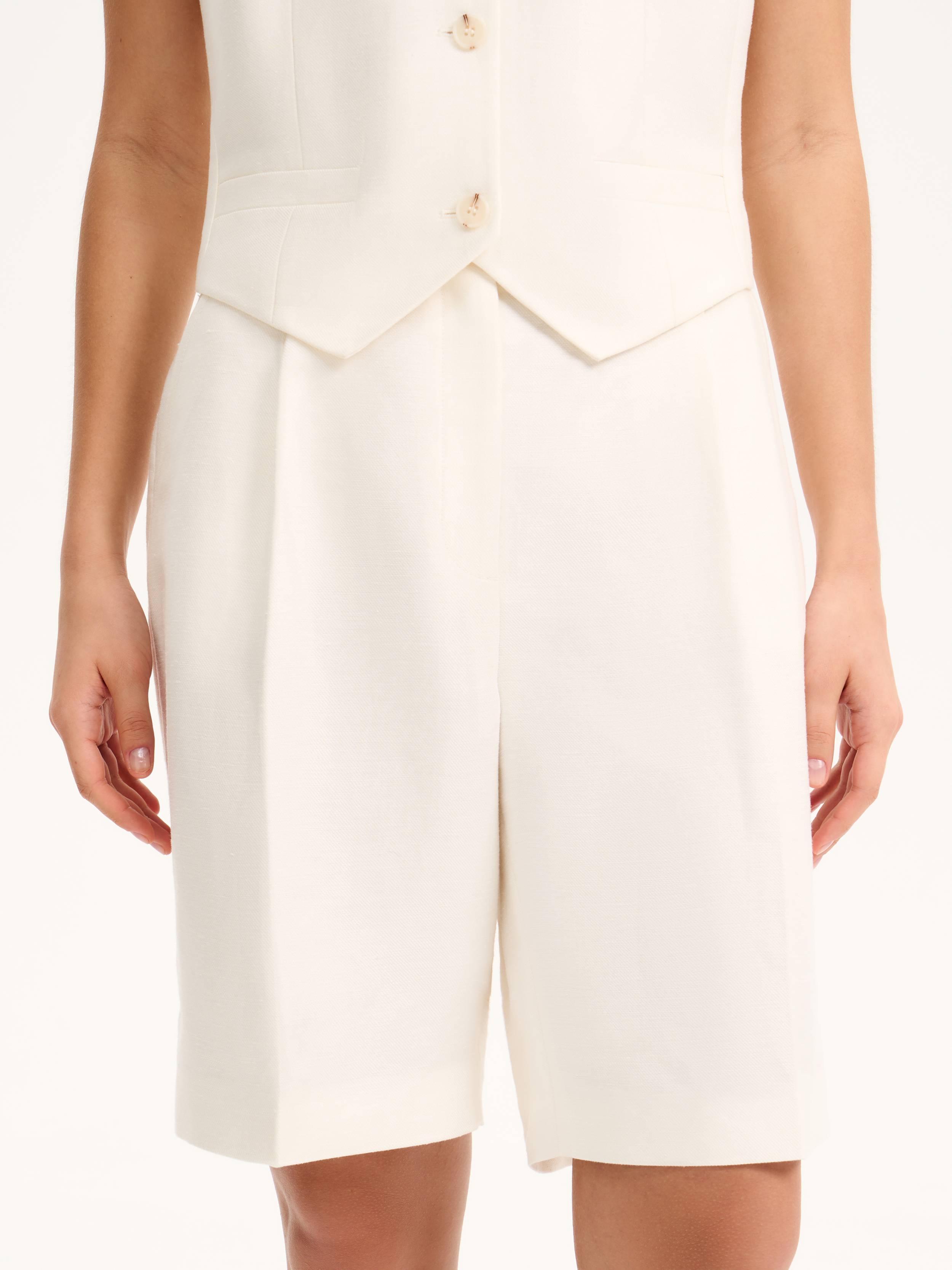 Свободные бермуды с выверенным силуэтом — актуальная интерпретация классической формы в летнем ключе. Модель с защипами спереди, аккуратным поясом со шлевками и мягкими отворотами по низу подчеркивает архитектуру кроя. Плотный лен с живой фактурой дышит и держит форму, оставаясь комфортным даже в жару. Прорезные карманы добавляют функциональности, не перегружая образ. Стилизуйте с топами на тонких бретелях, минималистичными рубашками, жилетами изо льна или мягкими трикотажными футболками. В качестве обуви подойдут сандалии, мюли или кожаные кеды — по настроению и ритму дня.