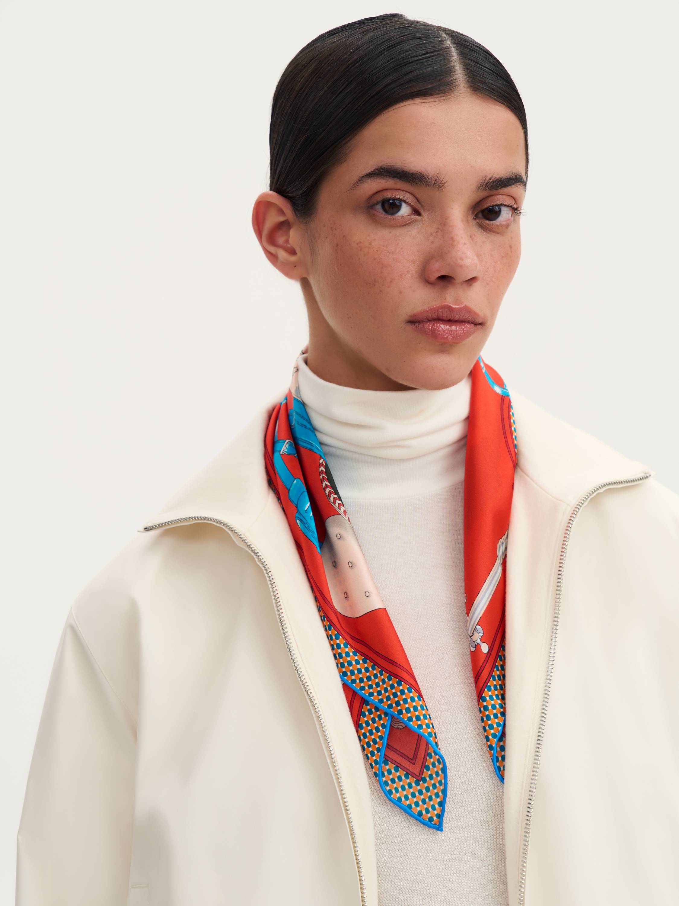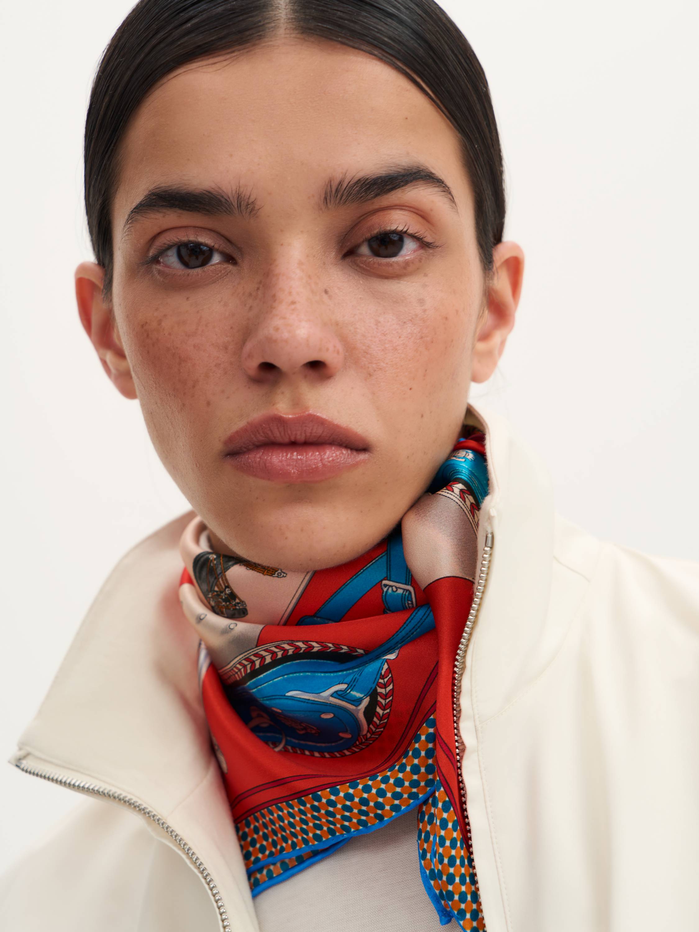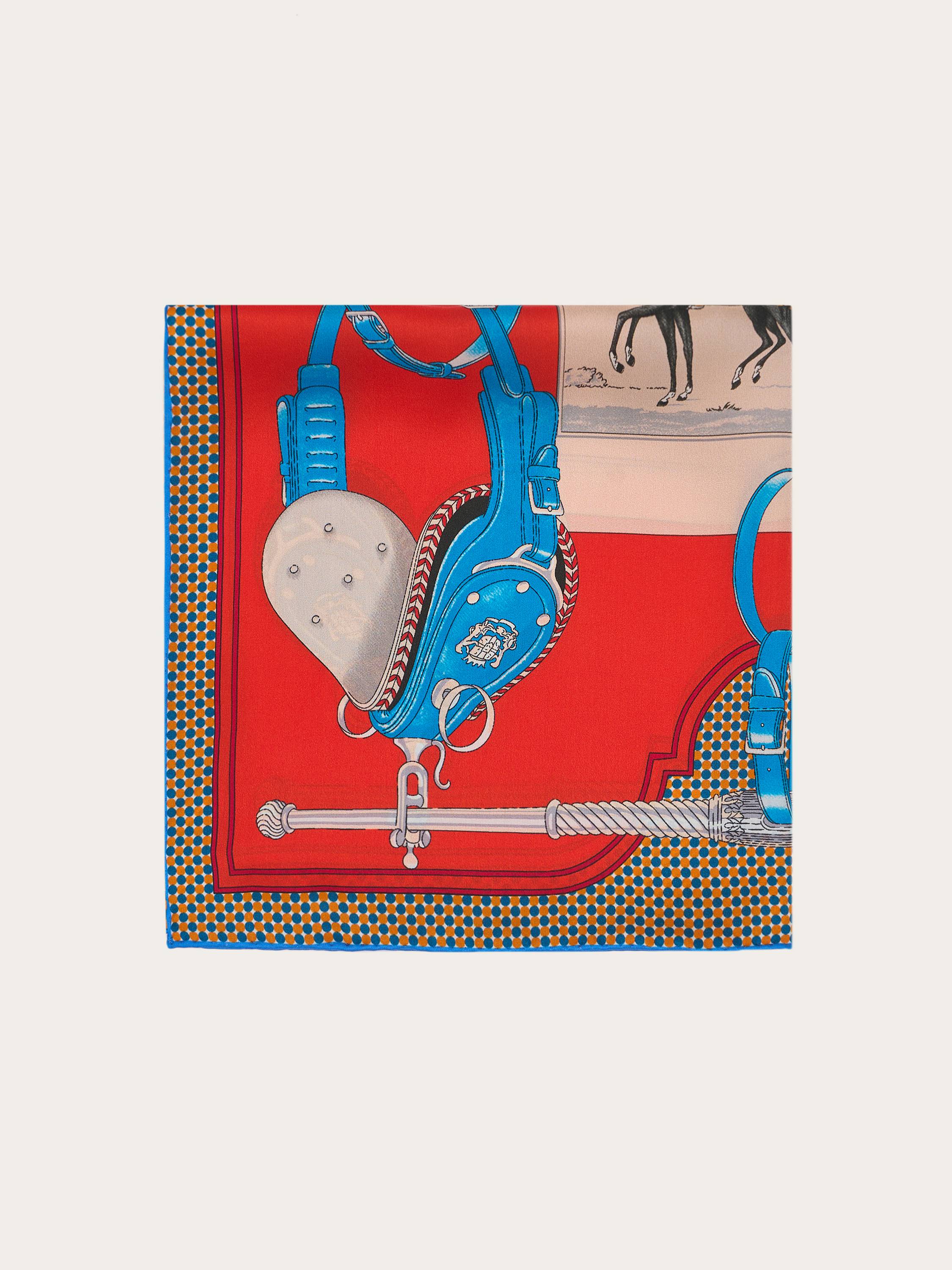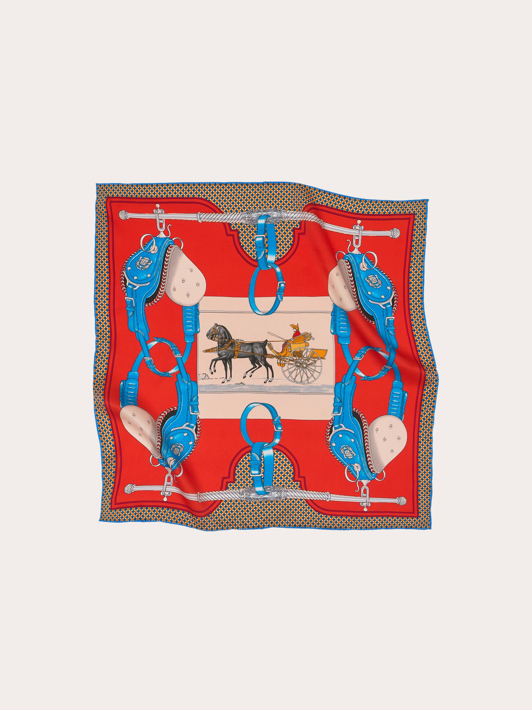 Платок из натурального шелка — элегантный аксессуар, вдохновленный конной тематикой. Гладкая, легкая ткань струится по коже, создавая ощущение комфорта и изысканности. Дизайн платка сочетает классические мотивы с динамичными деталями: в центре композиции изображены элементы конной упряжи, подчеркнутые контрастными оттенками. Фон выполнен в насыщенном красном цвете, который гармонично сочетается с глубокими синими и золотистыми акцентами, добавляя образу аристократичность. Окантовка придает рисунку завершенность и структурность. Этот платок станет стильным дополнением к классическим и элегантным ансамблям, легко вписываясь в гардероб и подчеркивая утонченность стиля. Его можно носить разными способами — на шее, в волосах, на запястье или в качестве стильного декора на сумке. Размер 53 х 53 см.