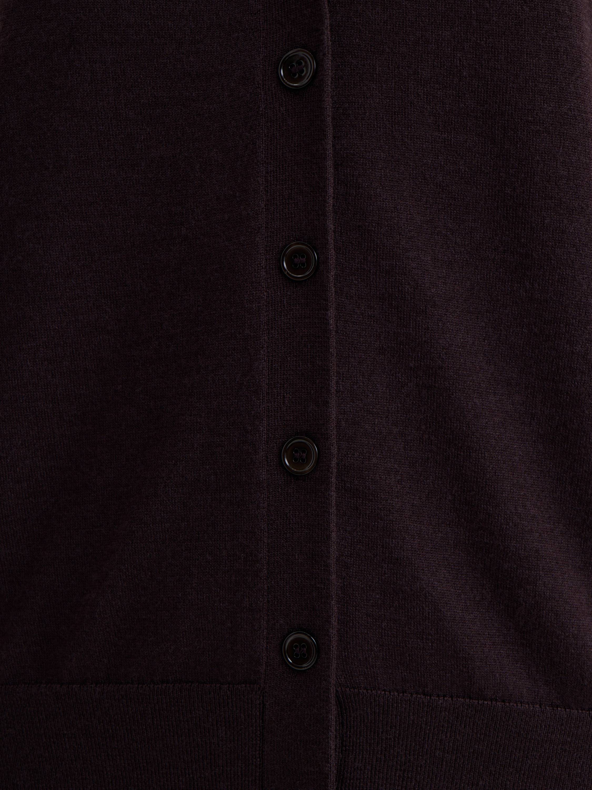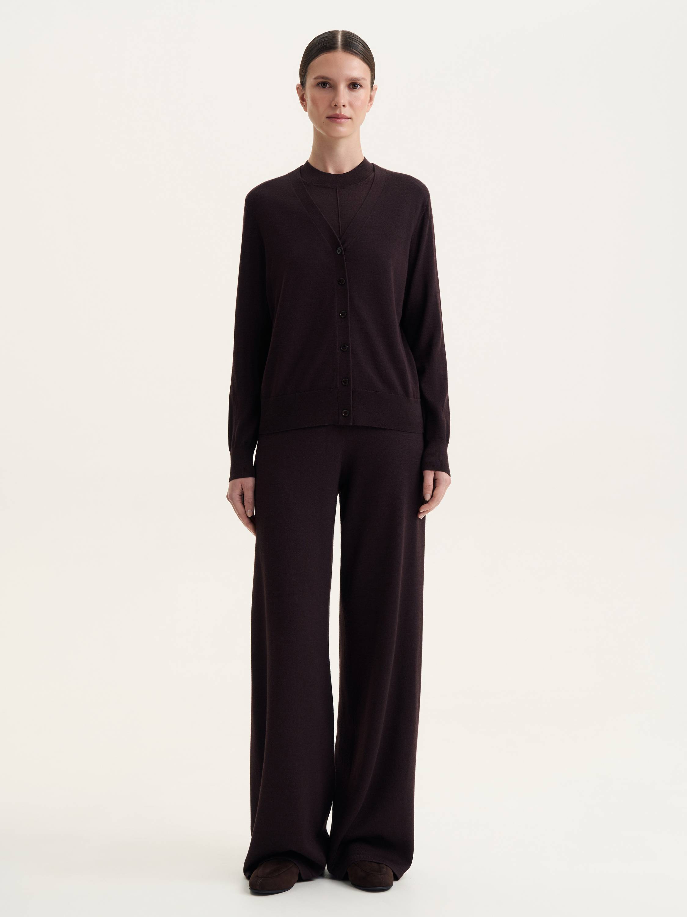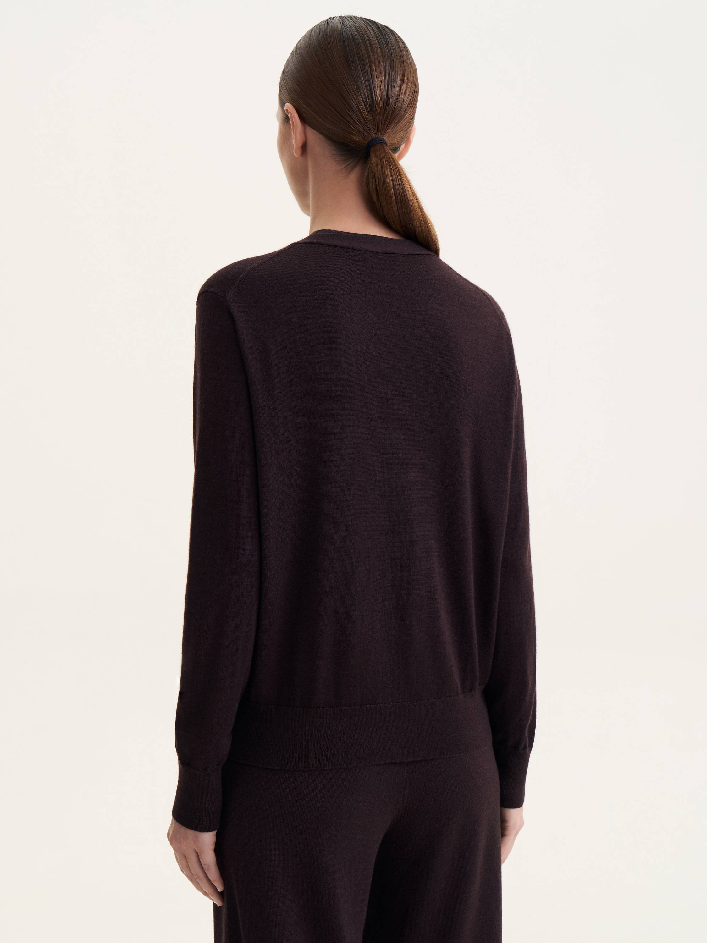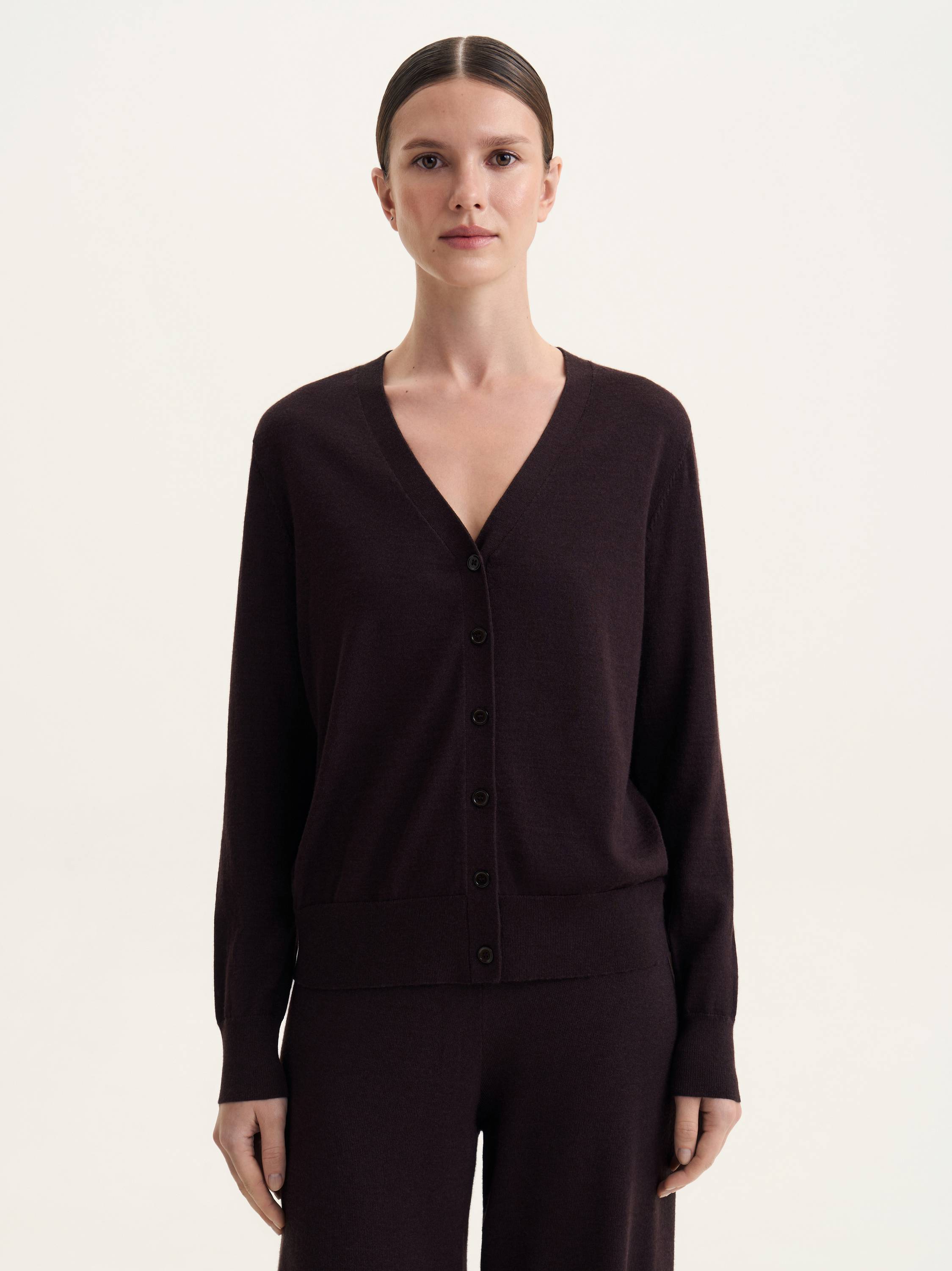 Кардиган из шерсти мериноса – универсальная база, сочетающая комфорт и элегантность. Мягкая, дышащая пряжа дарит тепло и комфорт в прохладное время года, обеспечивая легкость и пластичность. Лаконичный крой с V-образным вырезом и аккуратной застежкой на пуговицы подчеркивает чистоту линий, делая модель актуальной как для повседневных, так и для более формальных образов. Его можно носить самостоятельно, создавая расслабленный минималистичный стиль, или сочетать с водолазками, топами и блузами для многослойных комплектов. Качественная шерсть мериноса обеспечивает долговечность и сохраняет безупречный вид, делая этот кардиган незаменимым элементом продуманного гардероба.