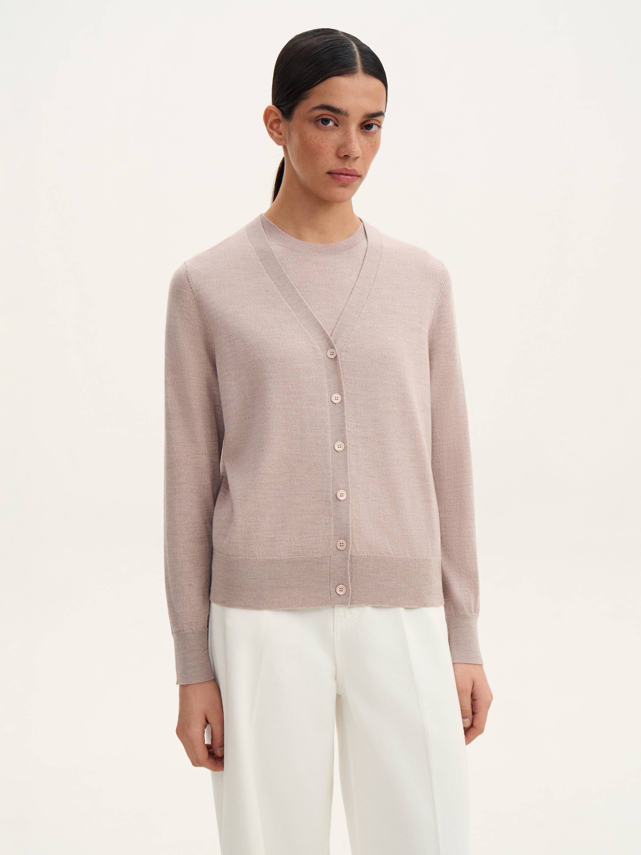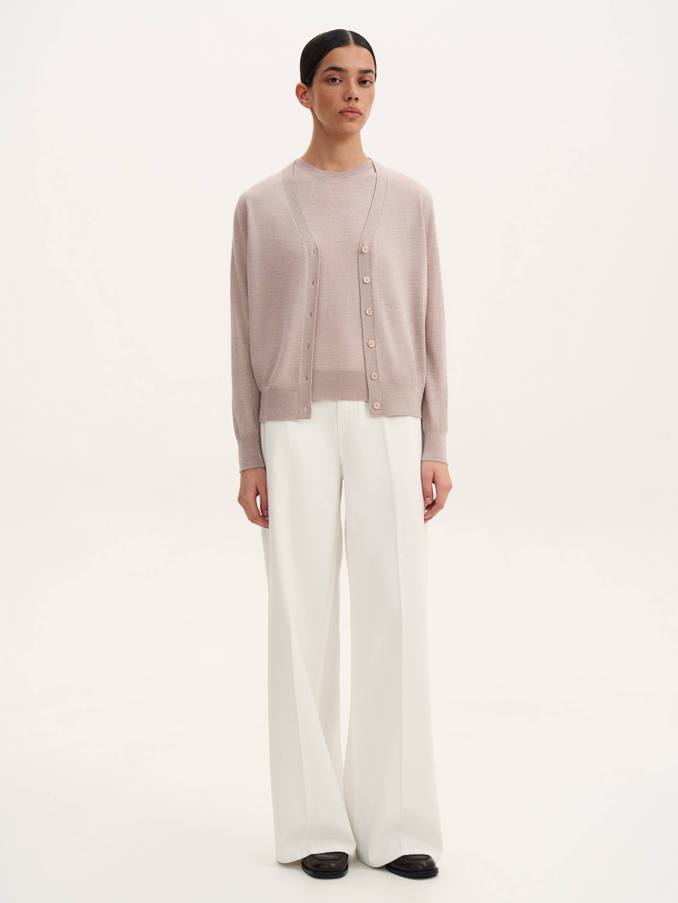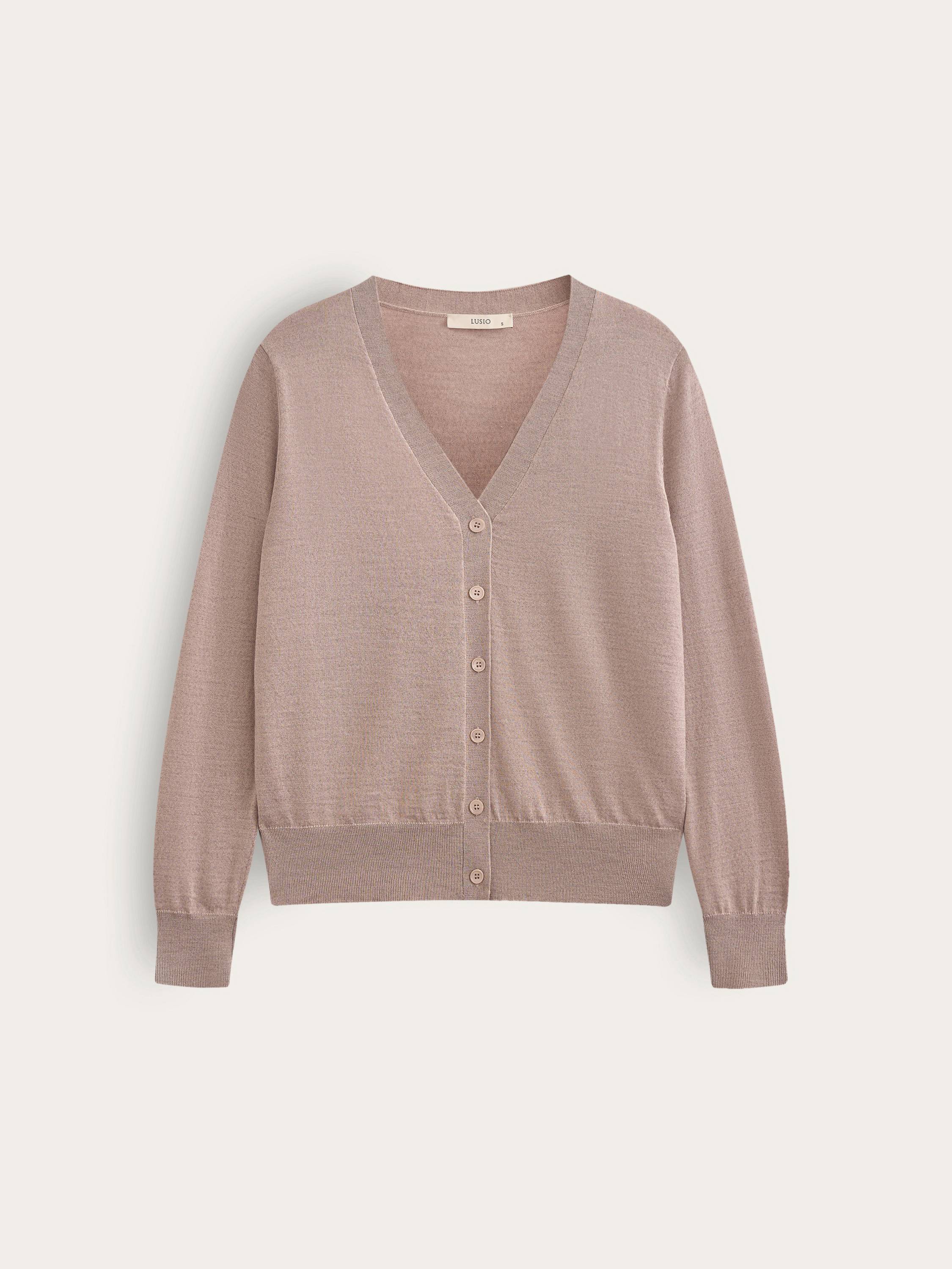 Кардиган из шерсти мериноса – универсальная база, сочетающая комфорт и элегантность. Мягкая, дышащая пряжа дарит тепло и комфорт в прохладное время года, обеспечивая легкость и пластичность. Лаконичный крой с V-образным вырезом и аккуратной застежкой на пуговицы подчеркивает чистоту линий, делая модель актуальной как для повседневных, так и для более формальных образов. Его можно носить самостоятельно, создавая расслабленный минималистичный стиль, или сочетать с водолазками, топами и блузами для многослойных комплектов. Качественная шерсть мериноса обеспечивает долговечность и сохраняет безупречный вид, делая этот кардиган незаменимым элементом продуманного гардероба.