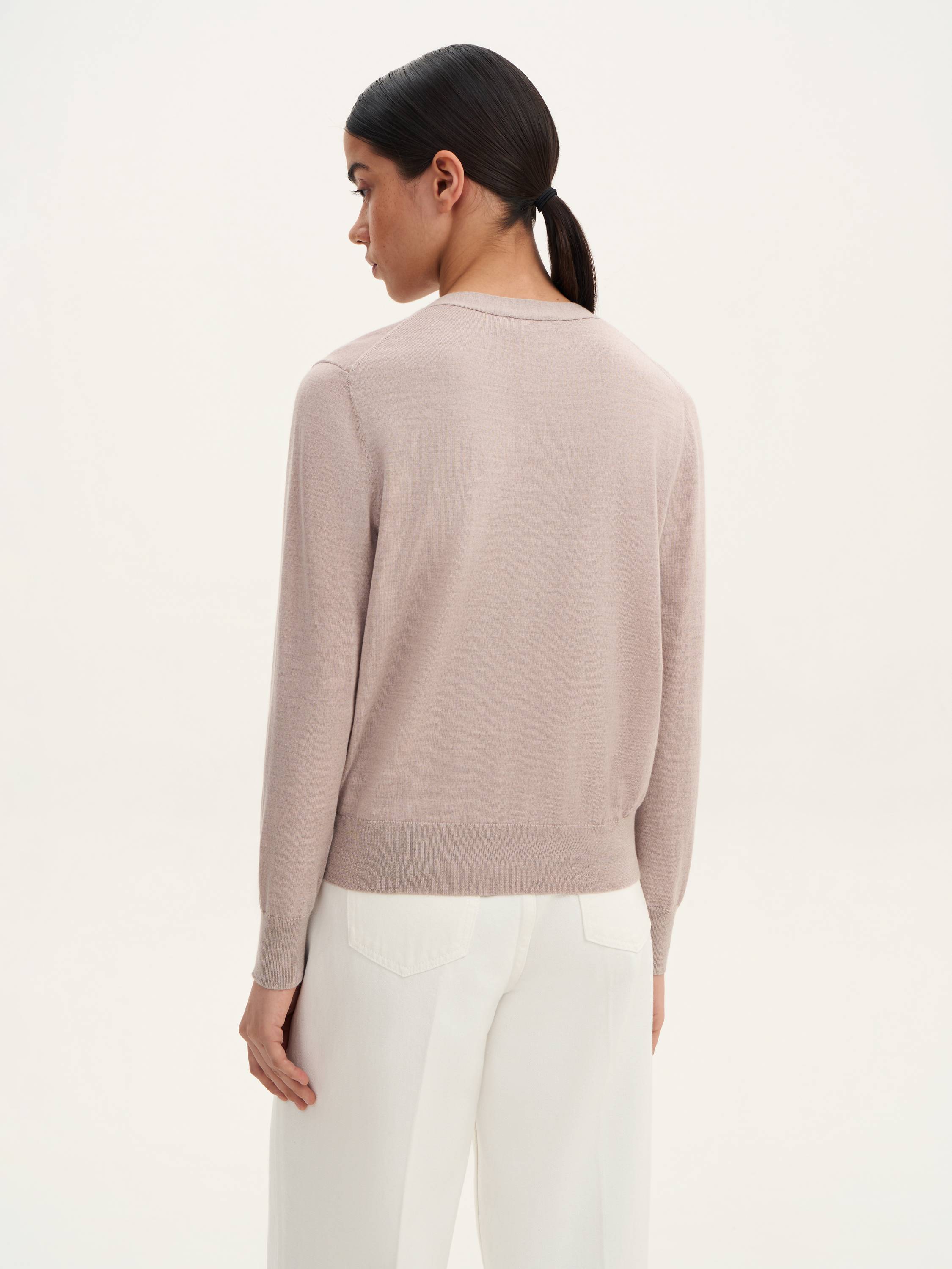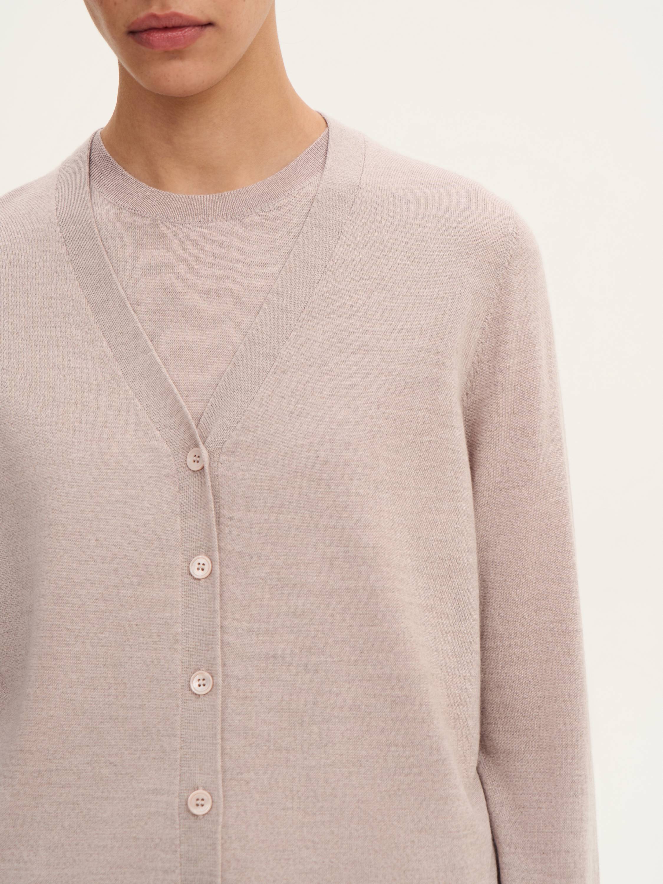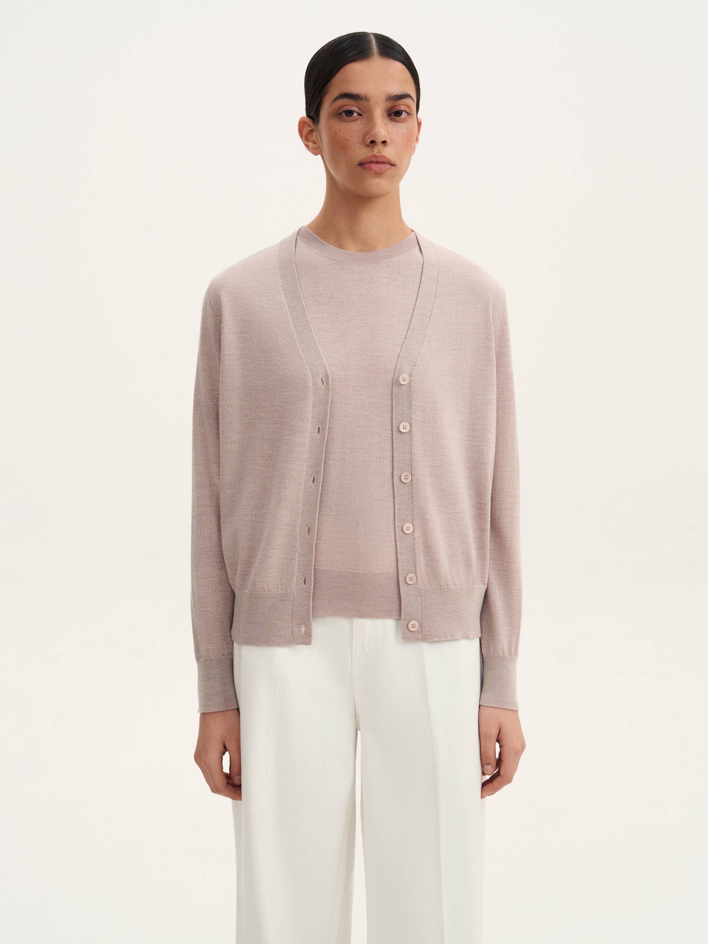 Кардиган из шерсти мериноса – универсальная база, сочетающая комфорт и элегантность. Мягкая, дышащая пряжа дарит тепло и комфорт в прохладное время года, обеспечивая легкость и пластичность. Лаконичный крой с V-образным вырезом и аккуратной застежкой на пуговицы подчеркивает чистоту линий, делая модель актуальной как для повседневных, так и для более формальных образов. Его можно носить самостоятельно, создавая расслабленный минималистичный стиль, или сочетать с водолазками, топами и блузами для многослойных комплектов. Качественная шерсть мериноса обеспечивает долговечность и сохраняет безупречный вид, делая этот кардиган незаменимым элементом продуманного гардероба.