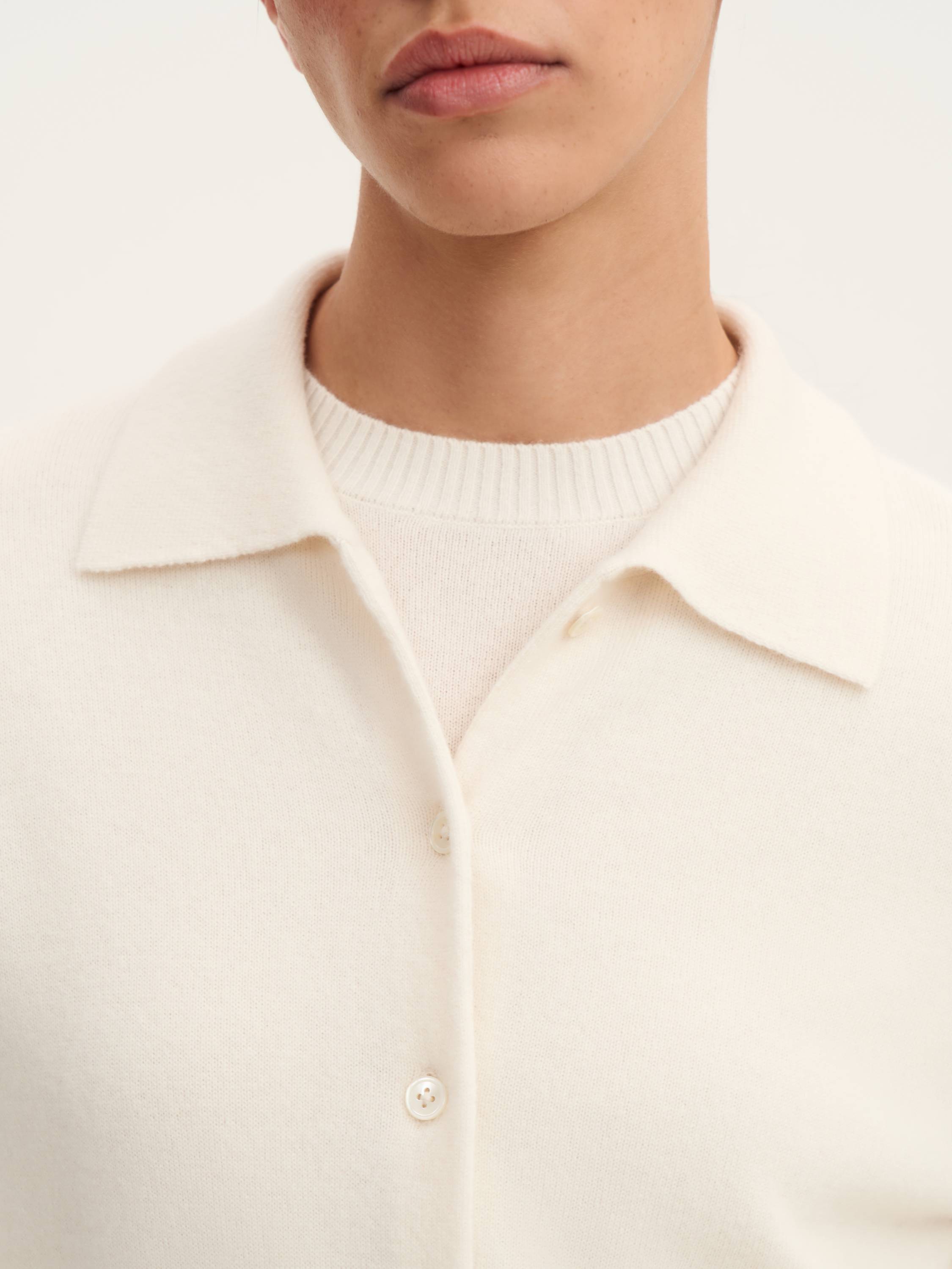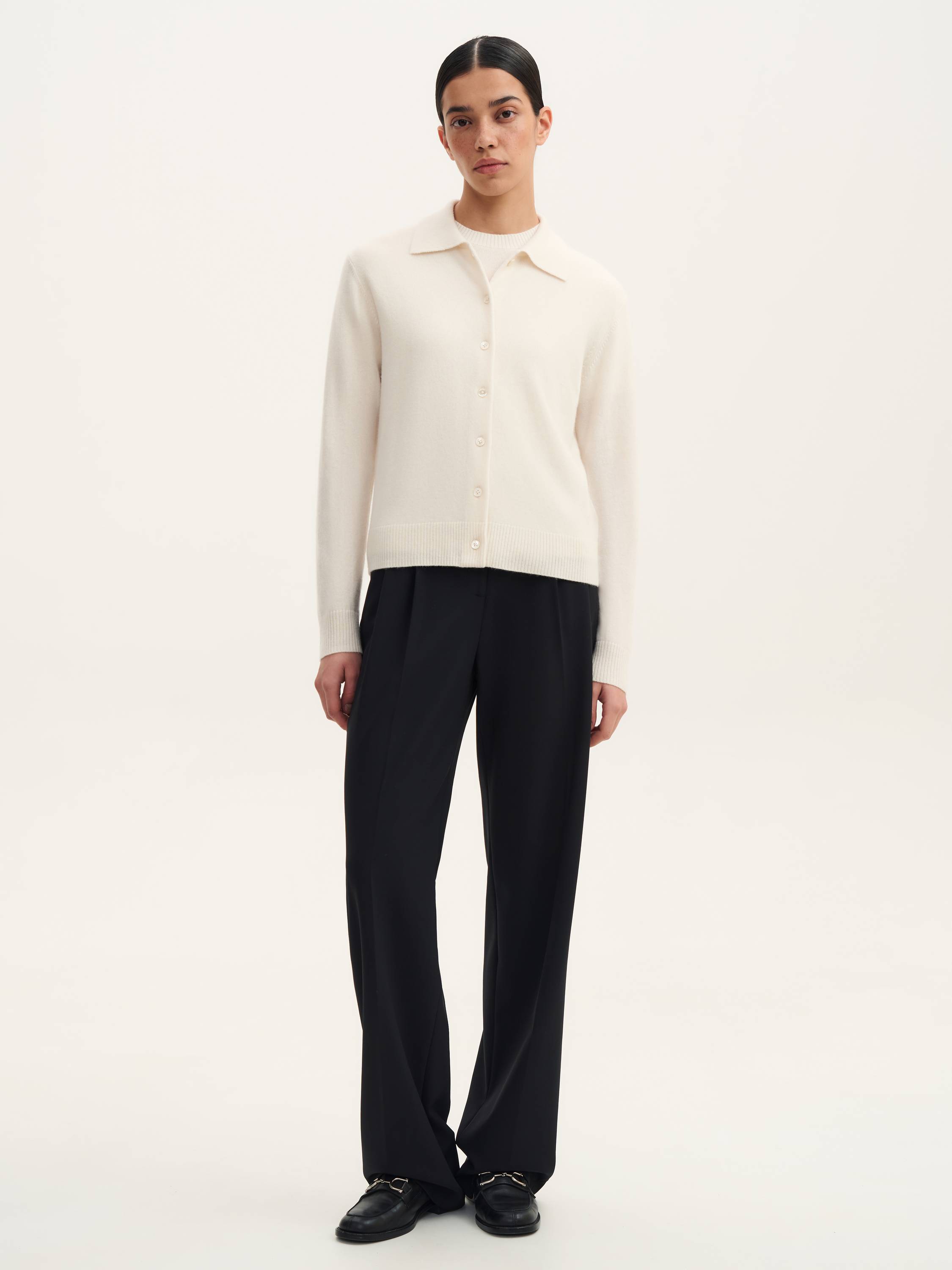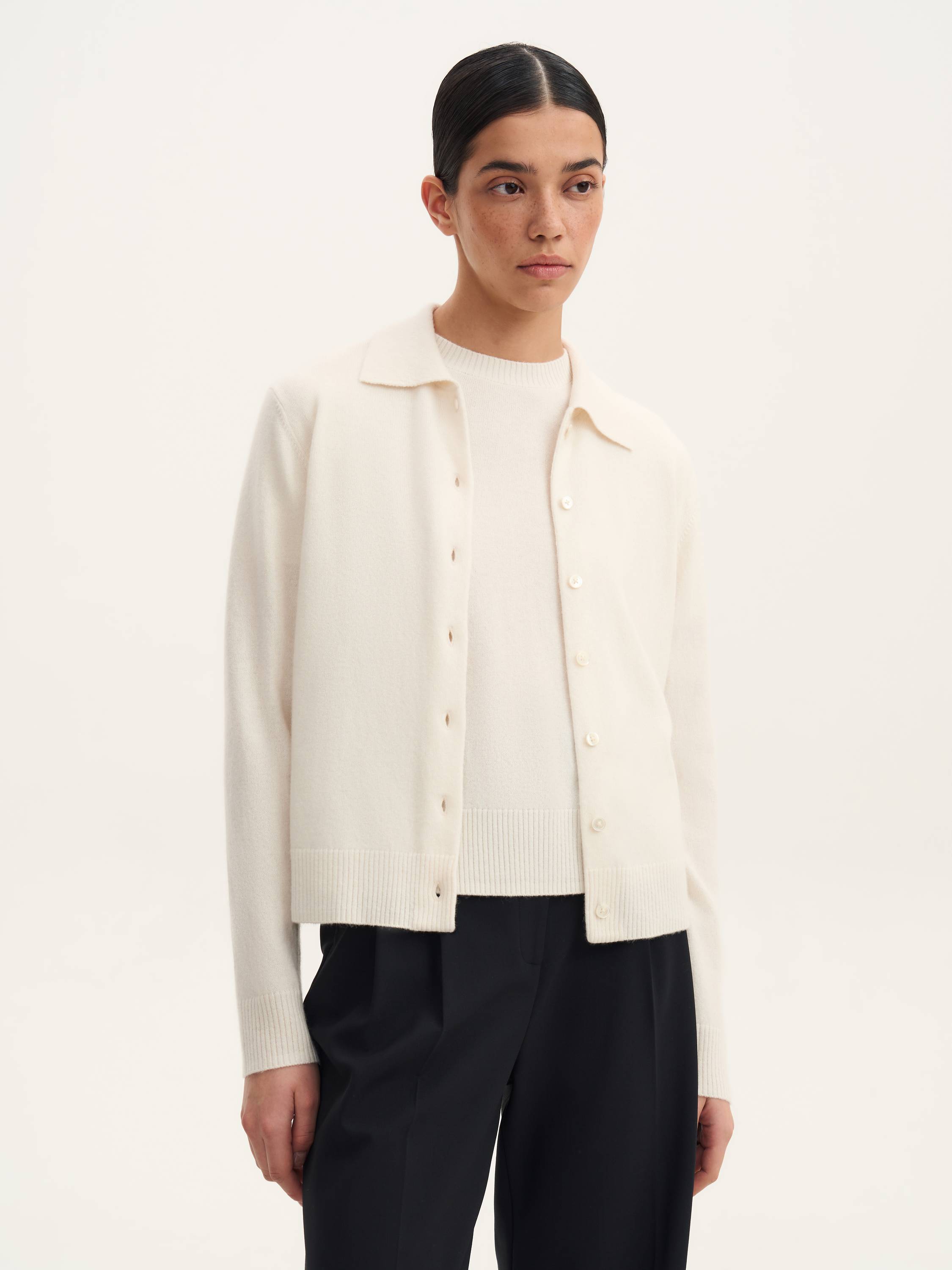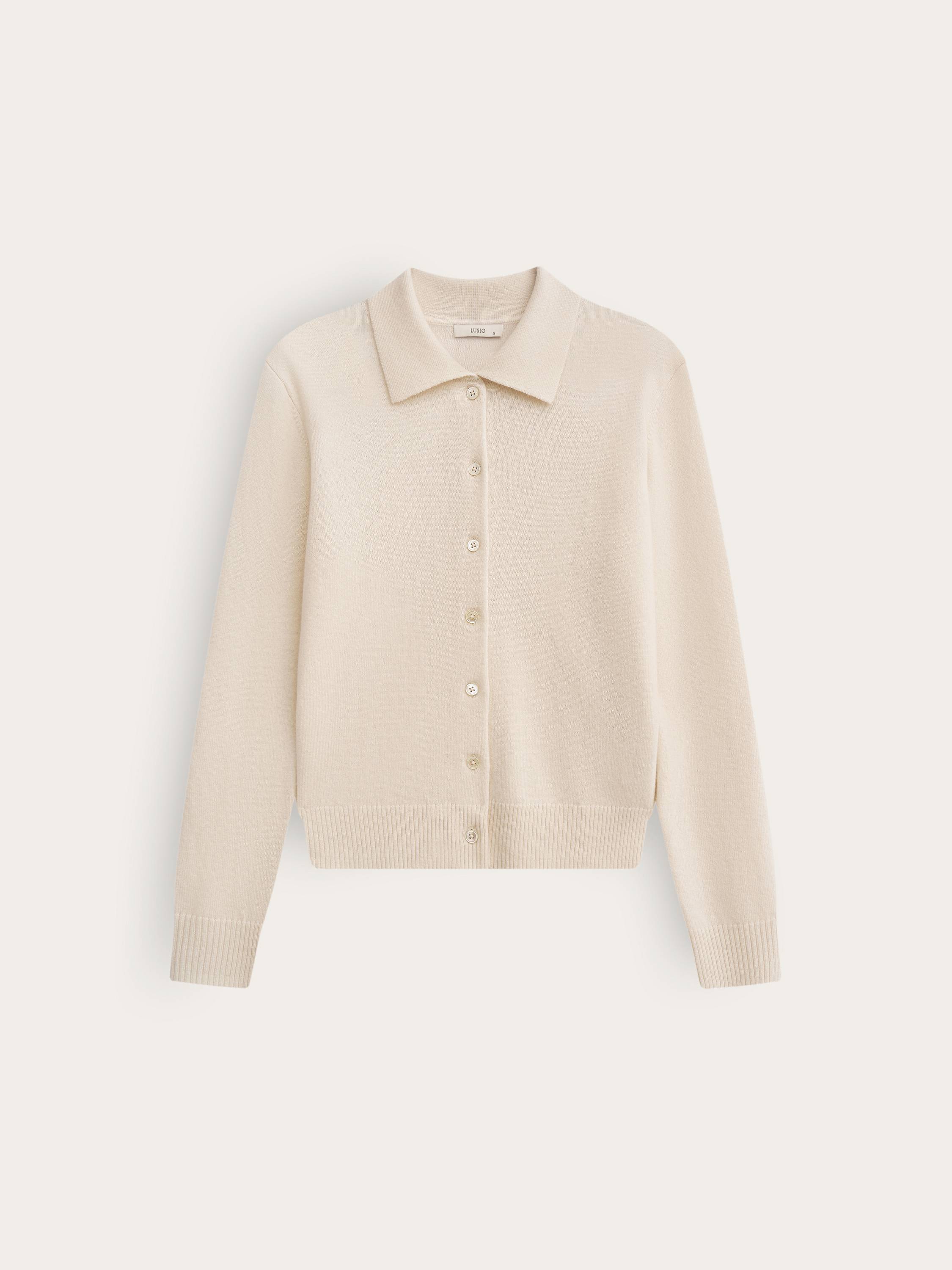 Кардиган из шерсти мериноса — это сочетание тепла, комфорта и элегантности. Натуральная шерсть обеспечивает мягкость, легкость и приятные тактильные ощущения, позволяя коже дышать и сохраняя тепло. Прямой крой дополнен классическим отложным воротником, который придает модели элегантность, а застежка на пуговицах делает кардиган универсальным элементом гардероба. Эластичные манжеты и аккуратная резинка по краю добавляют структуру силуэту. Нейтральный белый оттенок добавляет свежести и легко комбинируется с разными элементами гардероба. Кардиган можно носить как самостоятельный верх, сочетая с брюками или юбками, либо использовать в многослойных образах с рубашками, топами и трикотажем.