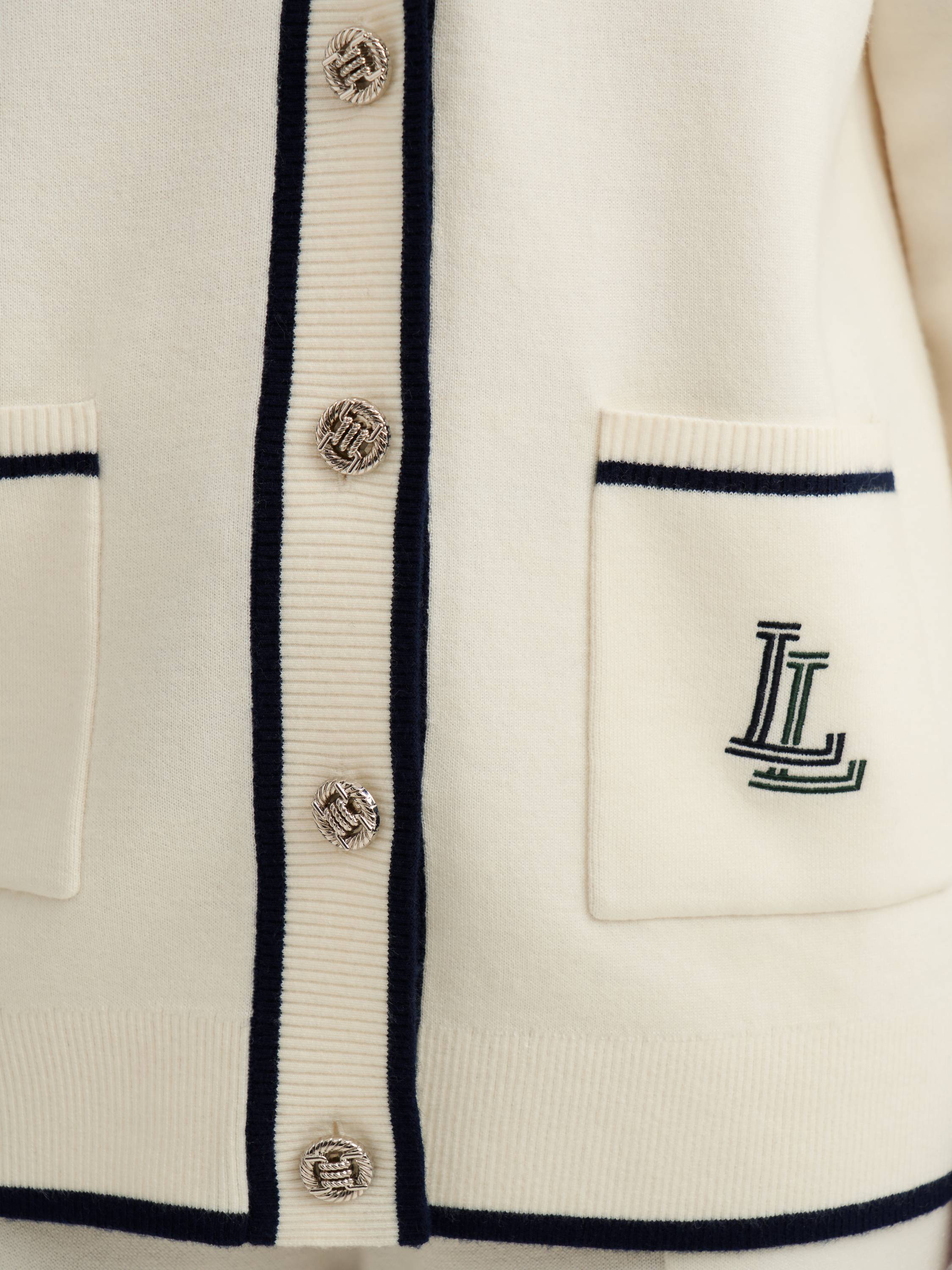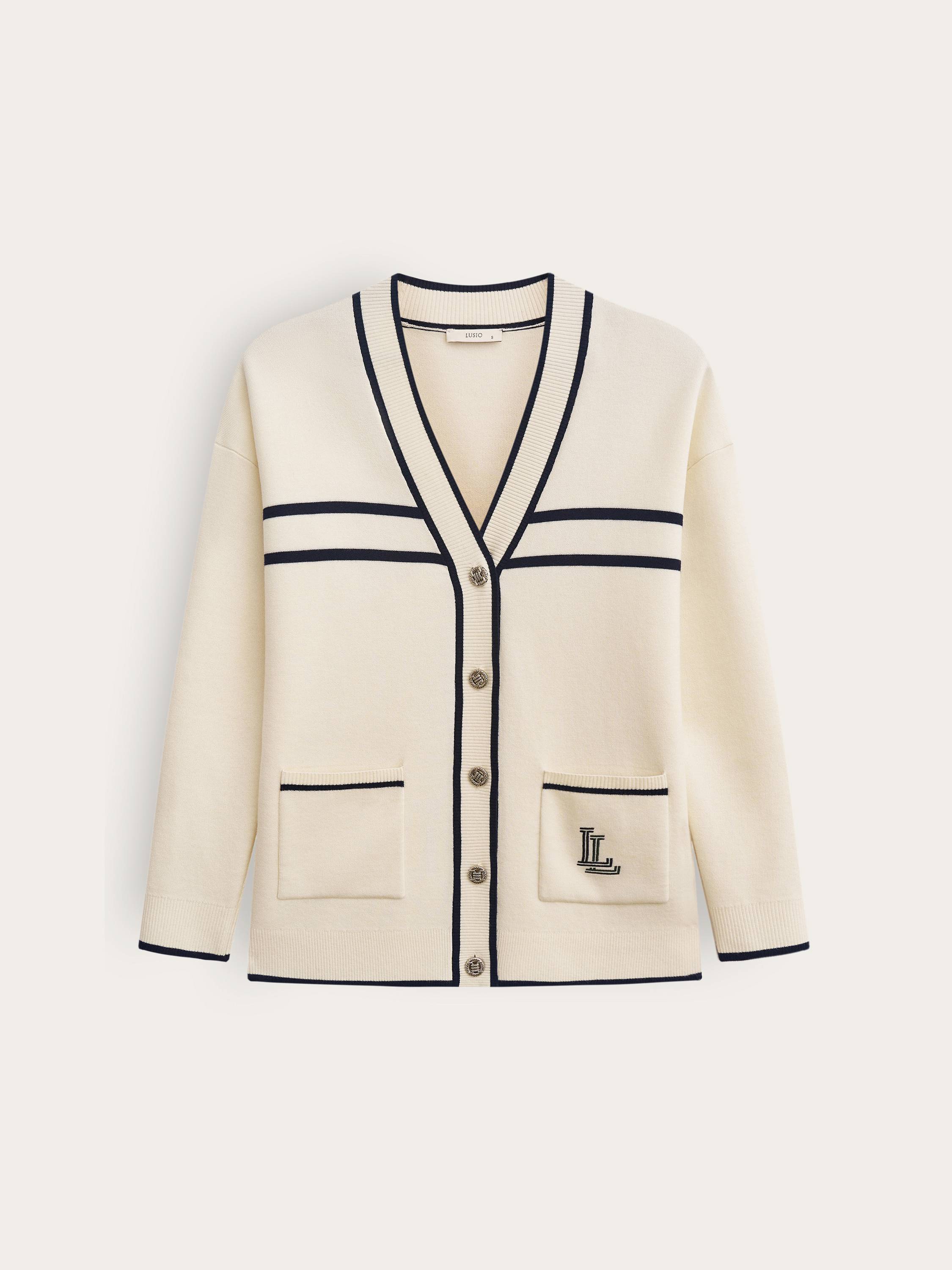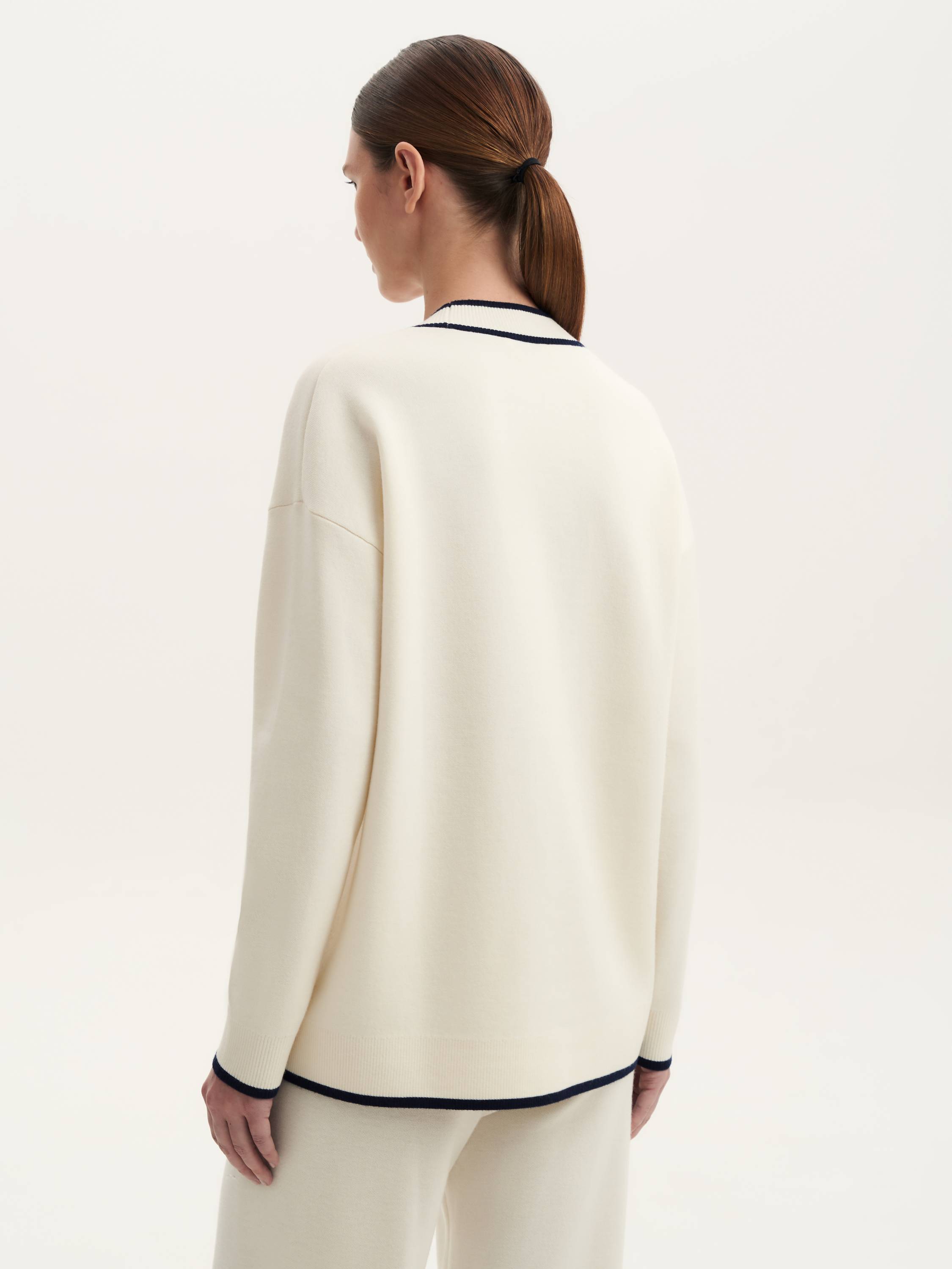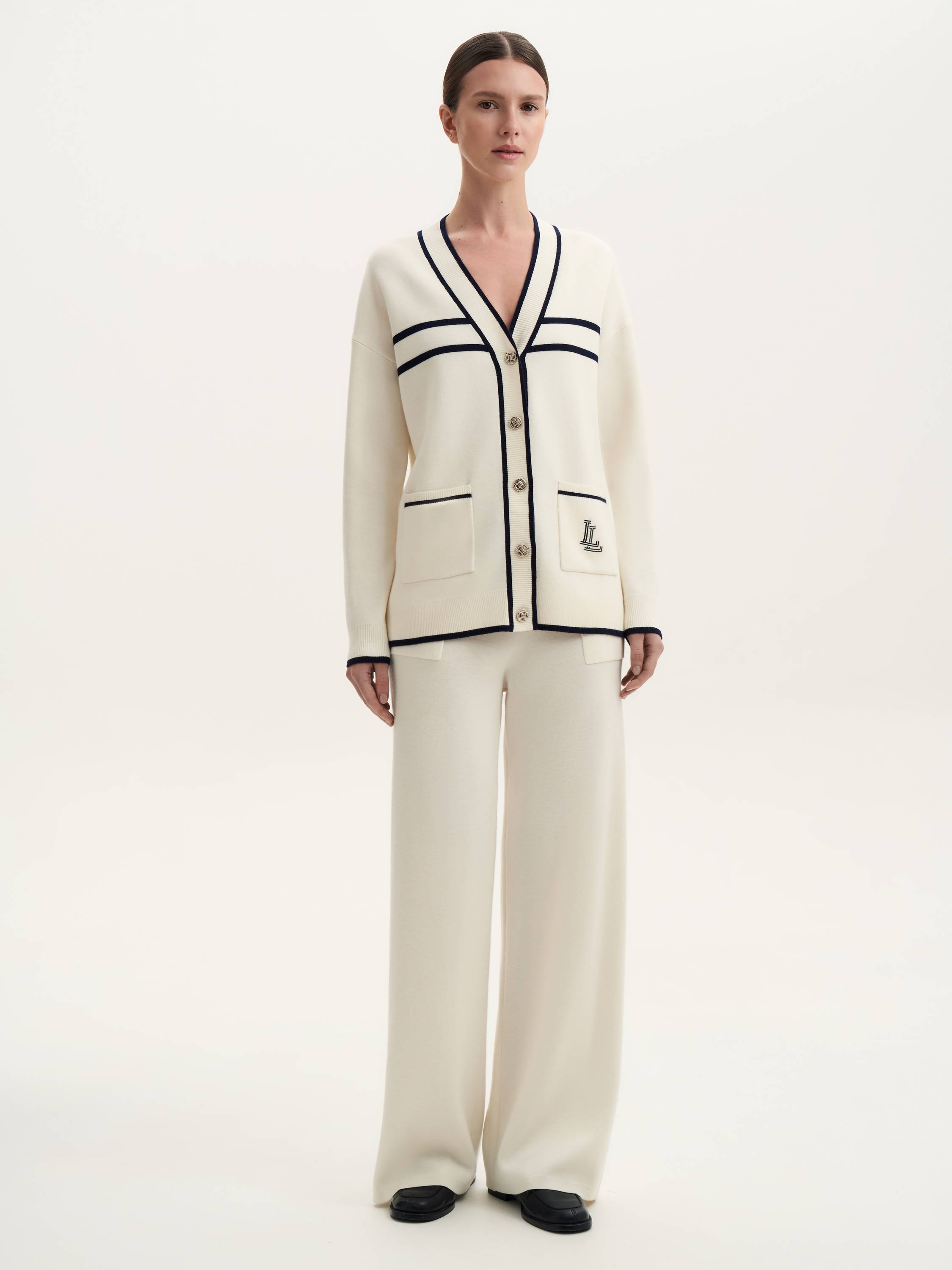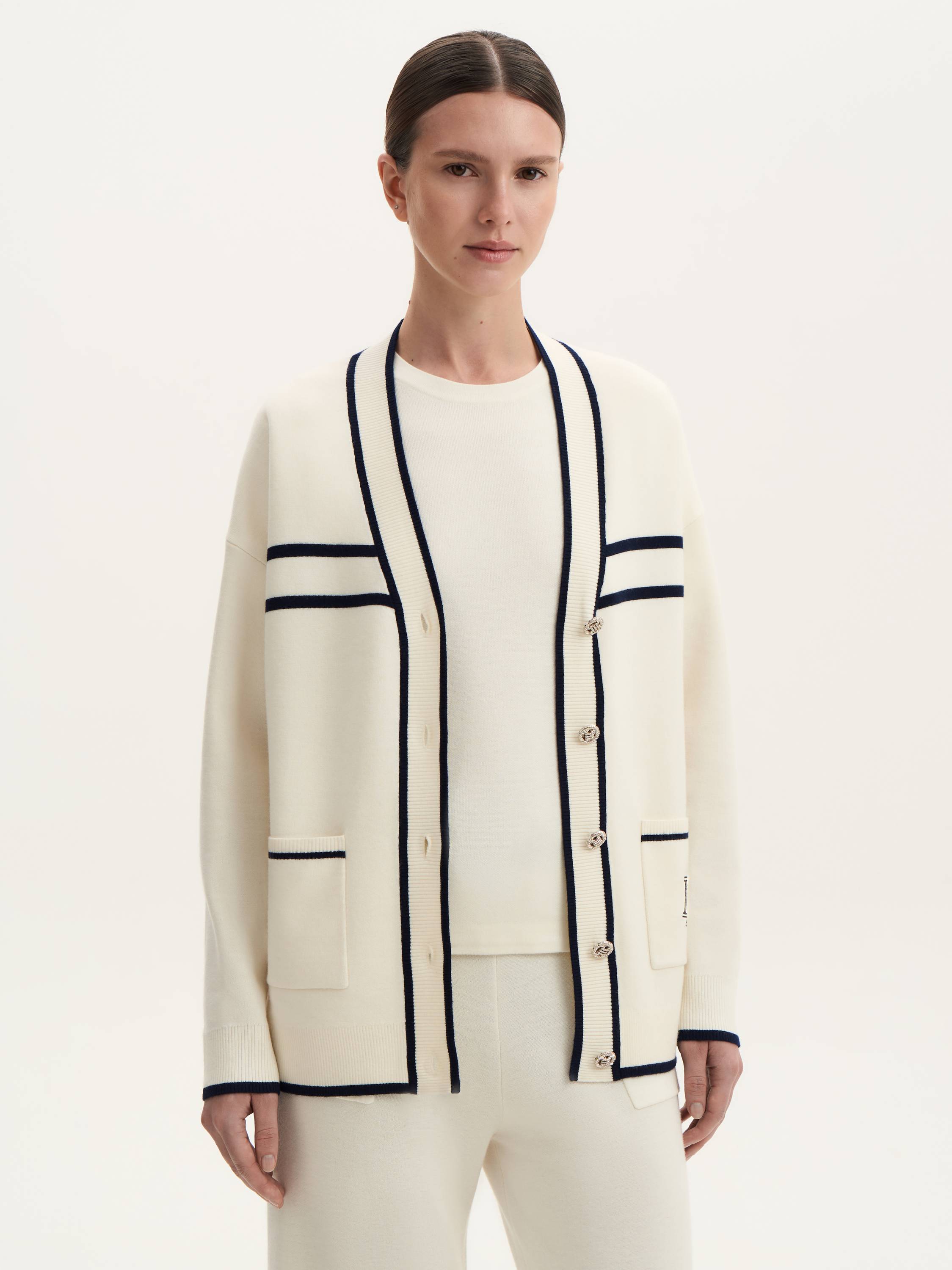 Кардиган с шерстью мериноса — стильная интерпретация классики с акцентом на детали. Натуральная шерсть делает ткань мягкой, теплой и приятной на ощупь. Контрастная окантовка подчеркивает геометрию кроя, создавая элегантный и одновременно расслабленный образ. Застежка на пуговицы с фактурной отделкой добавляет выразительности, а накладные карманы с вышитым логотипом придают модели индивидуальность. Универсальный силуэт и благородная фактура позволяют сочетать кардиган как с базовыми образами, так и с более структурированными комплектами, оставаясь актуальным элементом гардероба.