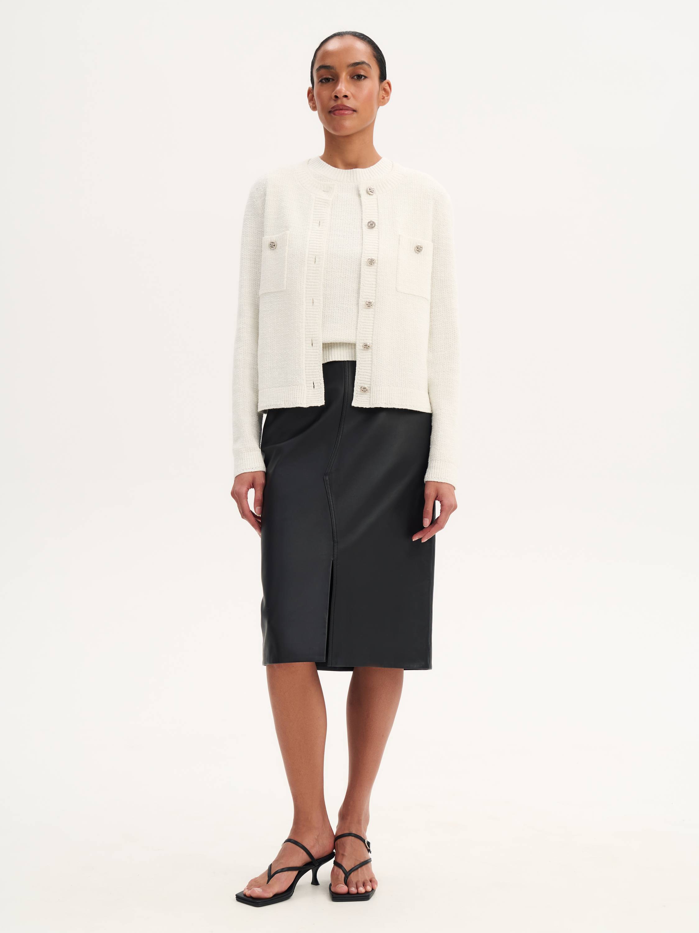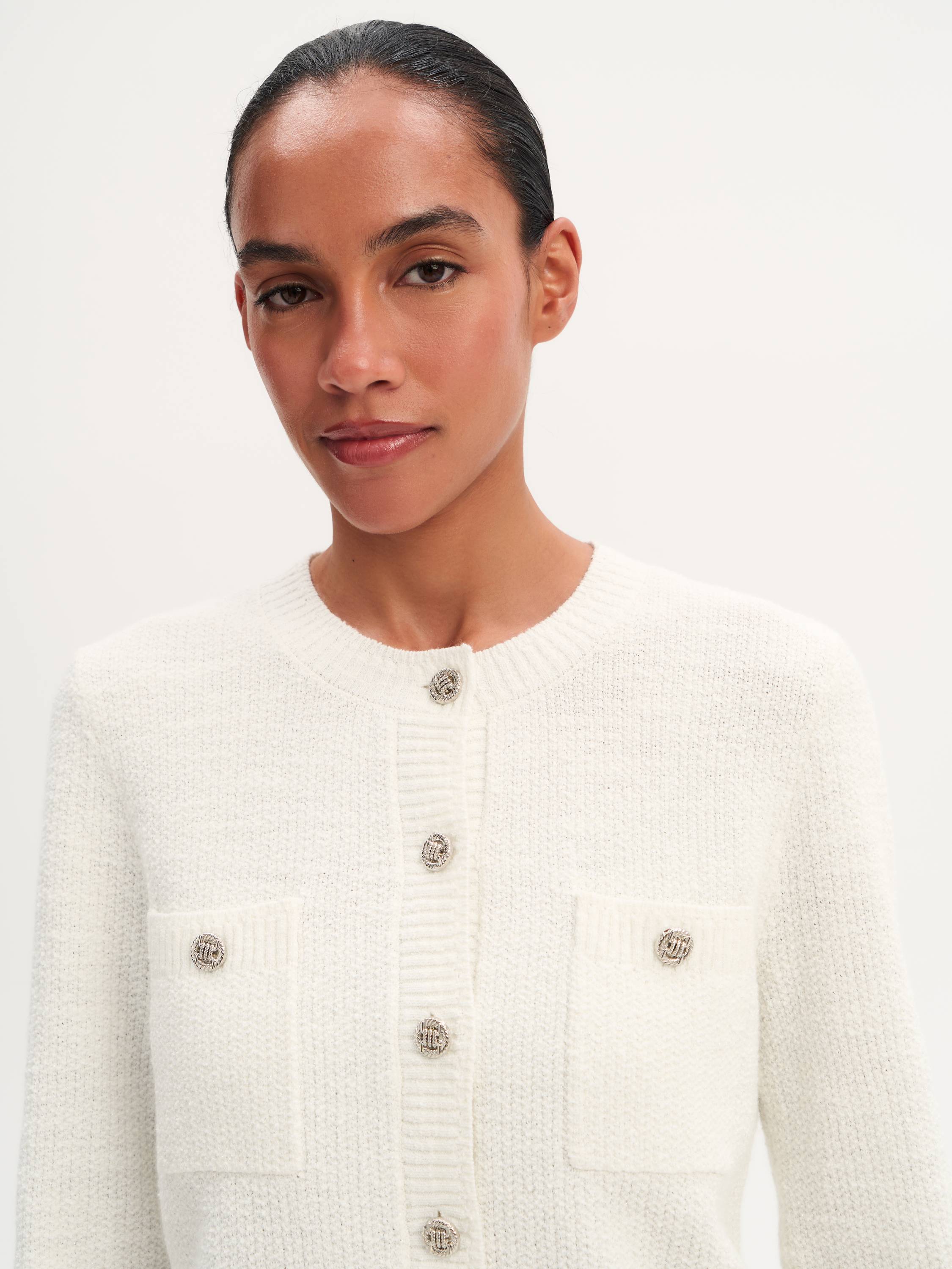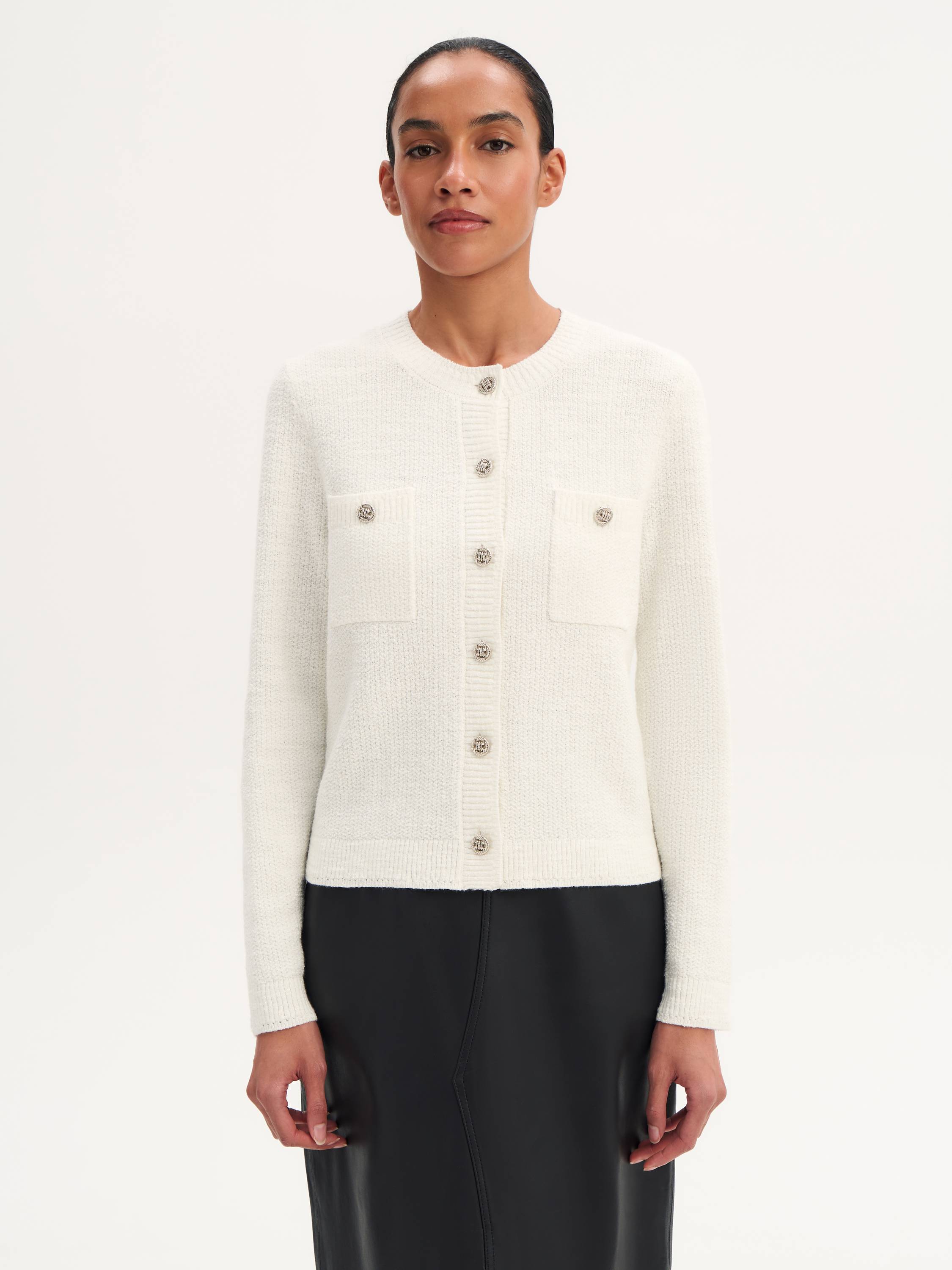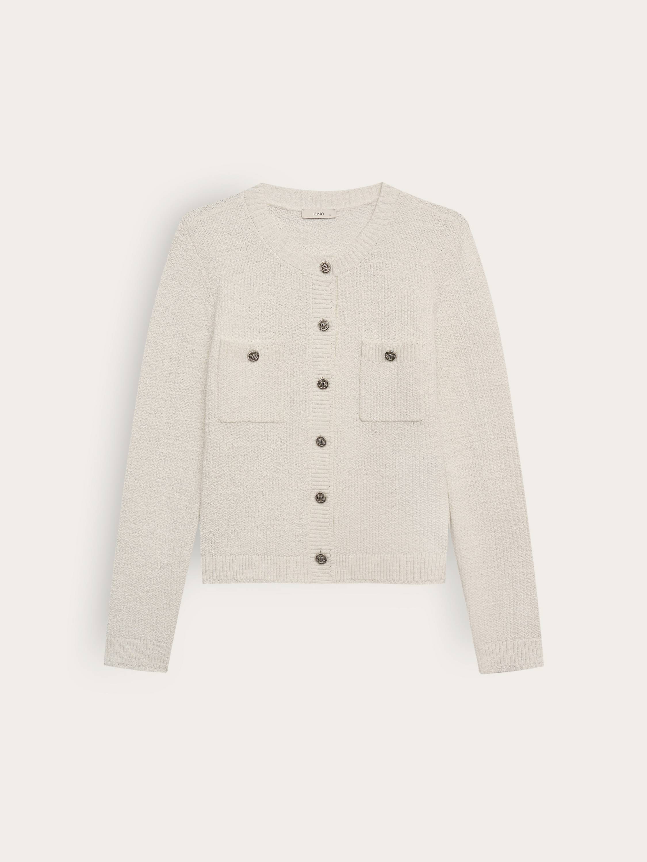 Добавьте в свой гардероб кардиган в стиле классической элегантности — универсальную модель, которая легко впишется в разные образы. Фактурная трикотажная ткань с добавлением шерсти мериноса дарит мягкость и комфорт, а прямой укороченный силуэт делает кардиган особенно актуальным. Минималистичный круглый вырез подчеркивает чистоту линий, а накладные карманы и акцентные пуговицы добавляют образу утонченность. Кардиган можно носить как самостоятельный элемент с брюками или юбками, а также в комплекте с вещами в тон, создавая продуманный, гармоничный аутфит.