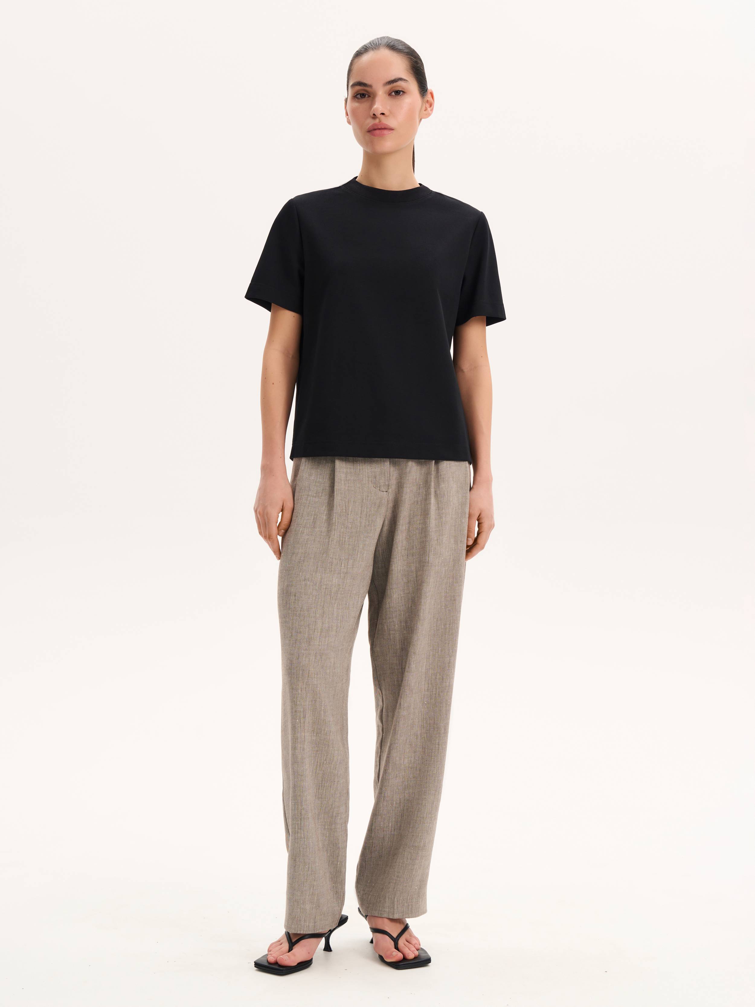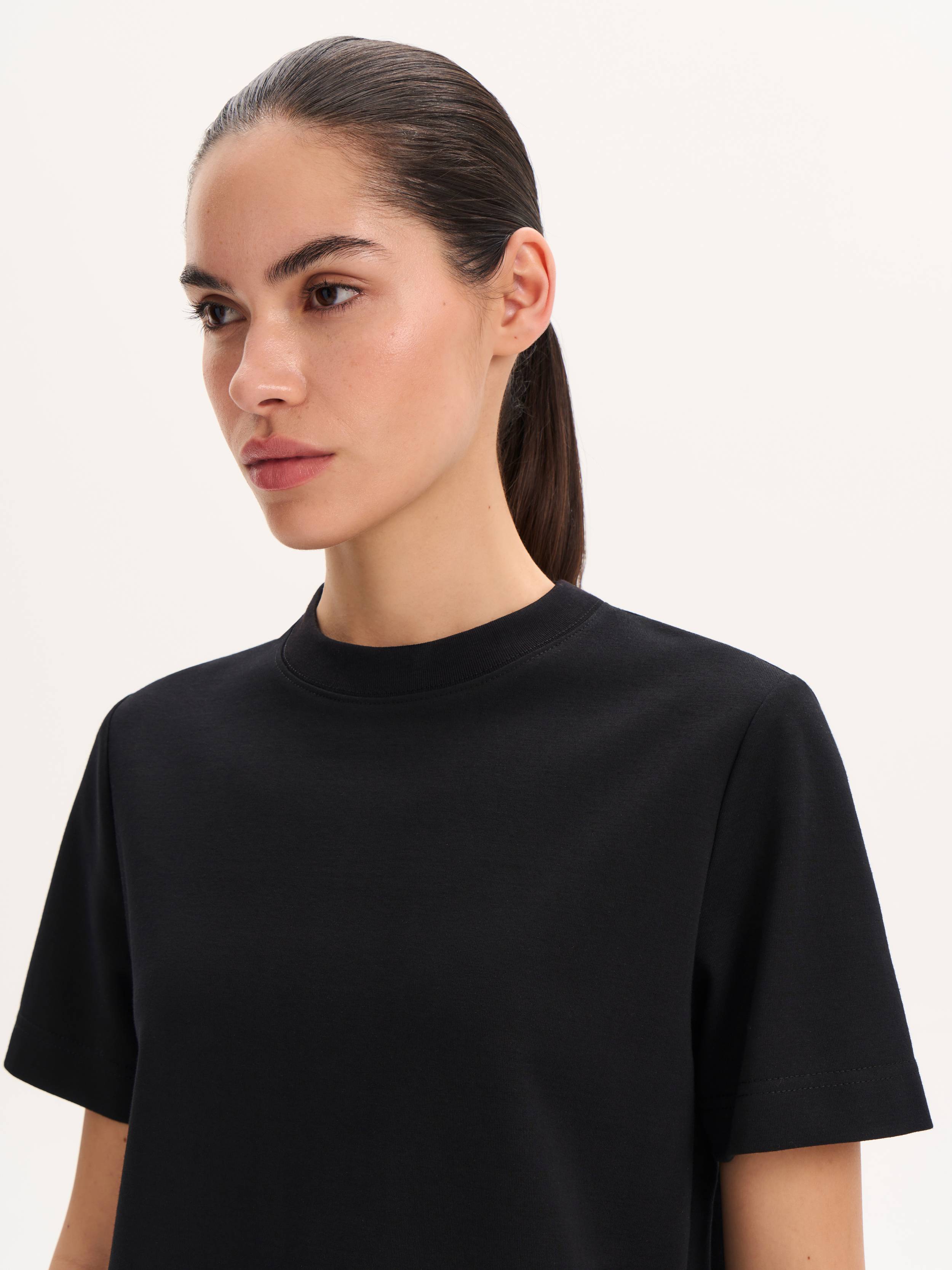Лаконичная хлопковая футболка с круглым вырезом — основа расслабленного летнего гардероба. Плотный хлопковый трикотаж держит форму, но остается мягким и комфортным к телу. Прямой силуэт с чуть укороченными рукавами и широким воротом — продуманный минимализм, который легко подстраивается под настроение: будь то деловая небрежность с жакетом или полное расслабление в дуэте с шортами. Три выверенных оттенка — белый, черный и темно-коричневый — на каждый день и без повода.