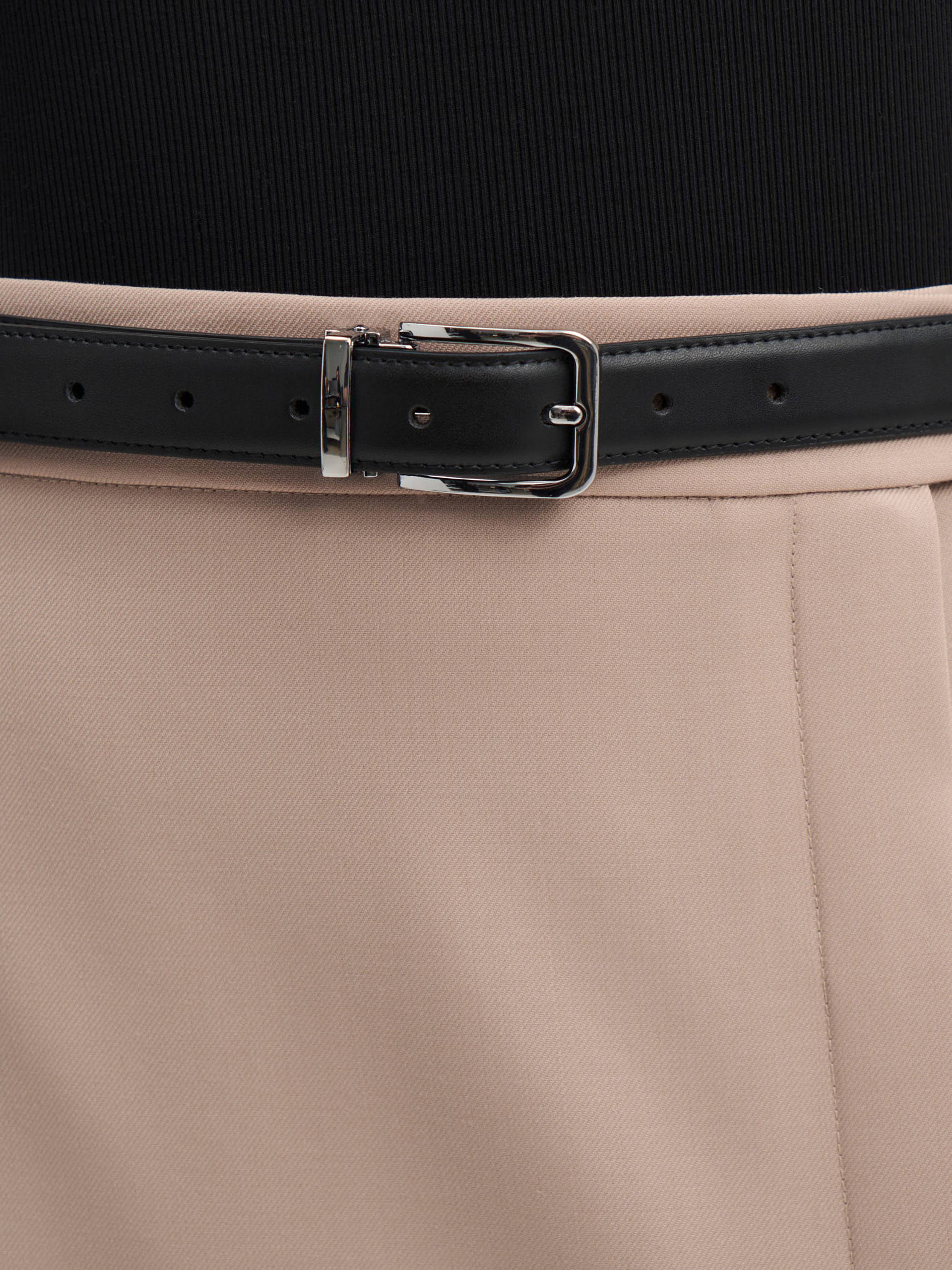 Ремень из натуральной кожи — универсальный аксессуар с лаконичным дизайном, который дополняет как классические, так и повседневные образы. Плавная текстура кожи обеспечивает приятные тактильные ощущения, а аккуратная строчка подчеркивает безупречное исполнение. Металлическая пряжка с гладкой поверхностью добавляет элегантности и надежно фиксирует ремень. Регулируемая длина позволяет легко адаптировать модель под индивидуальные параметры, обеспечивая комфортную посадку. Длина до среднего отверстия: 75 см. Ширина: 2,5 см.