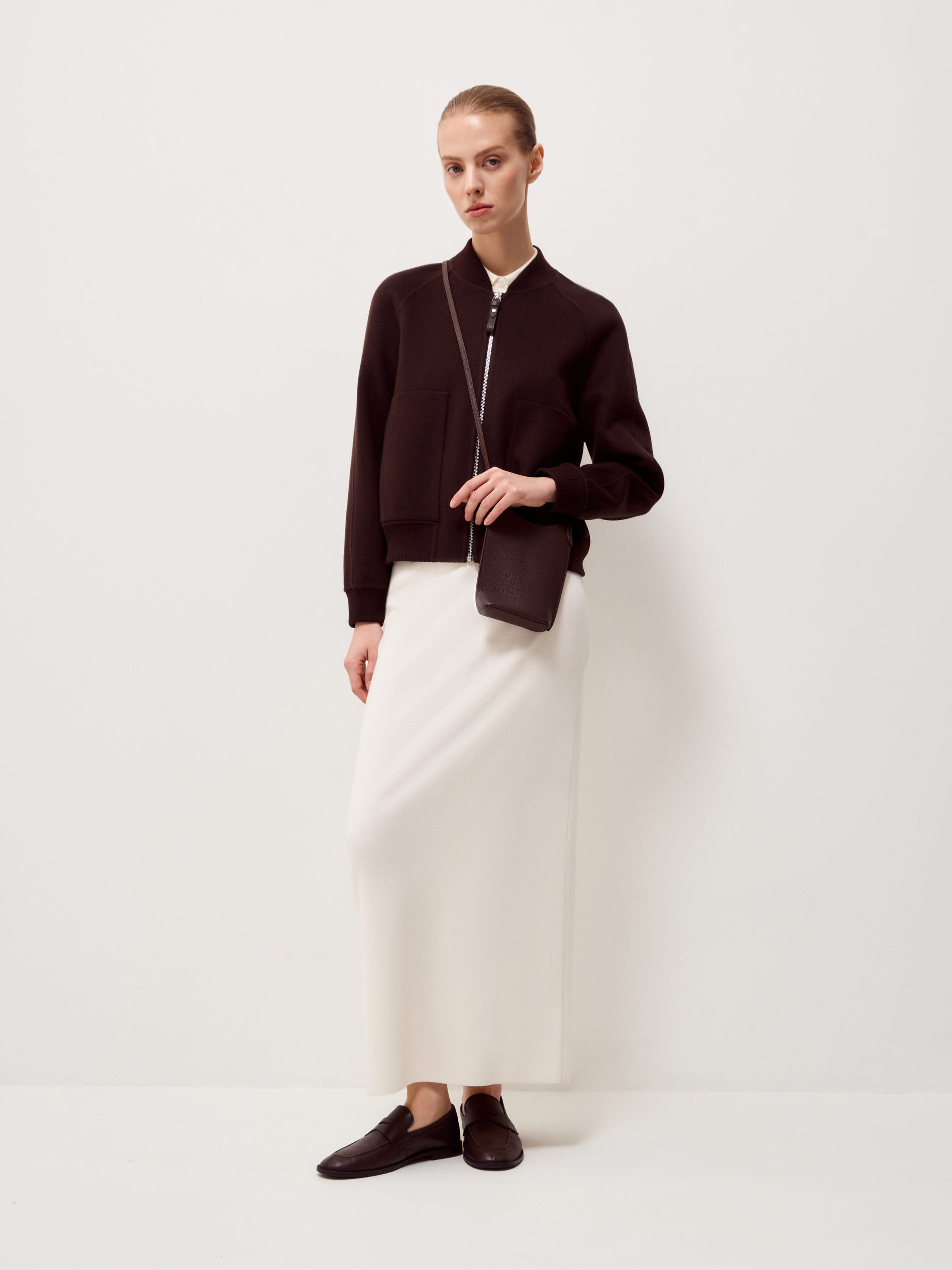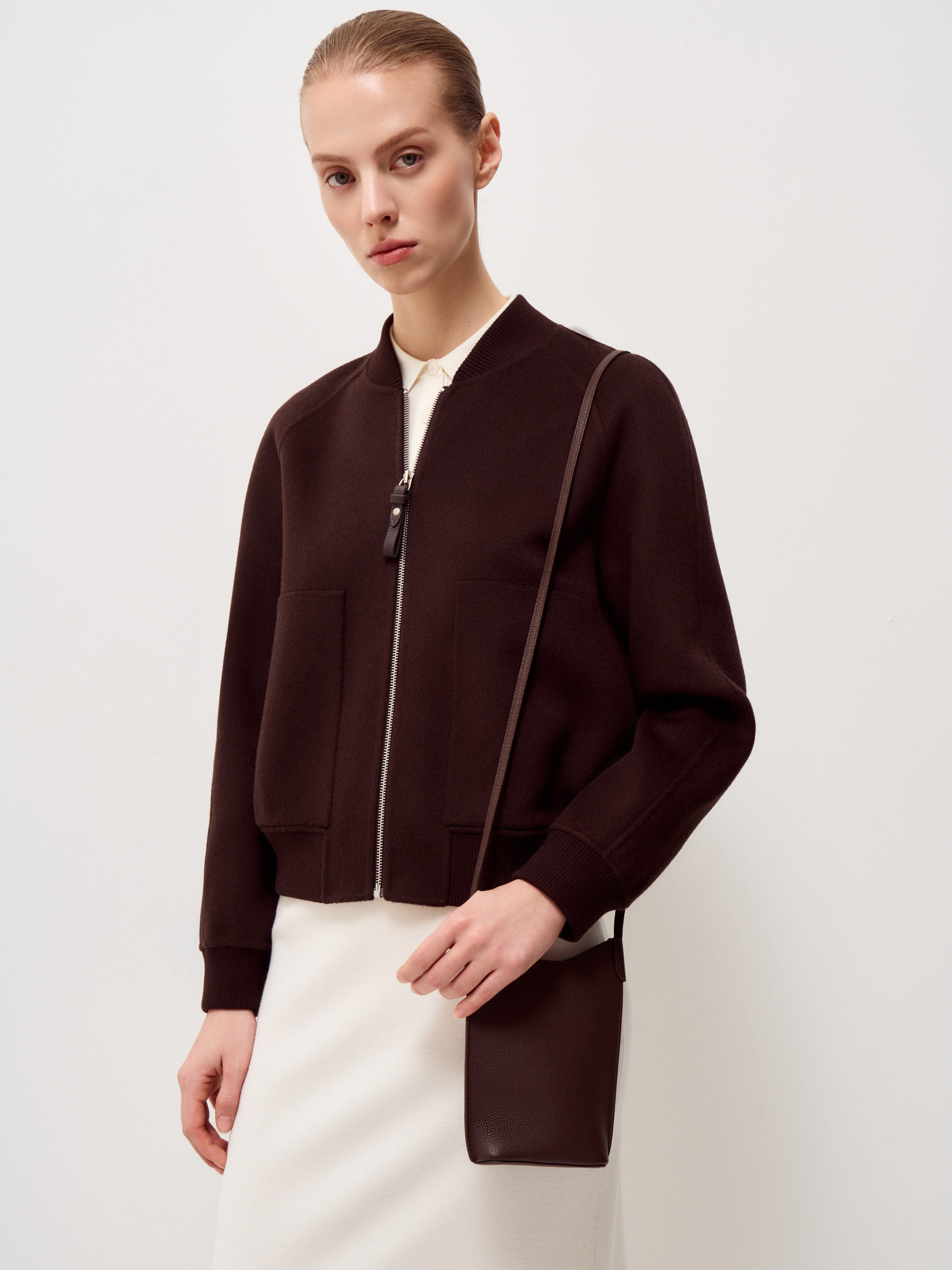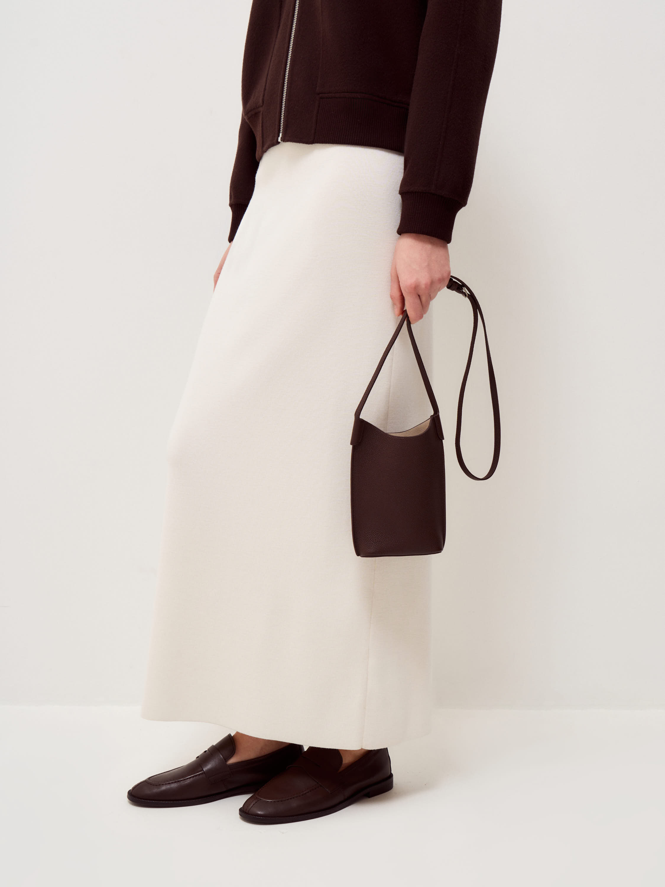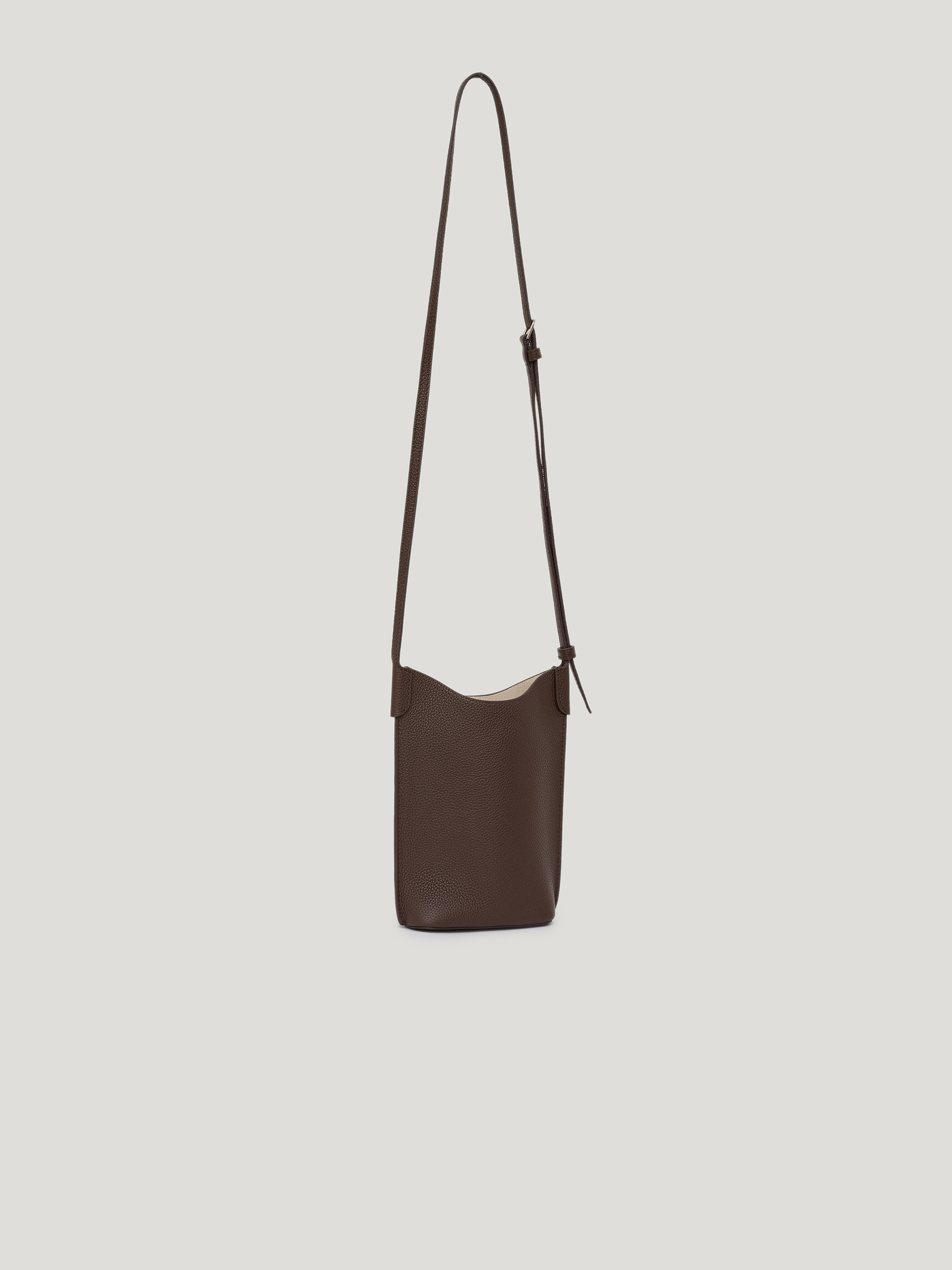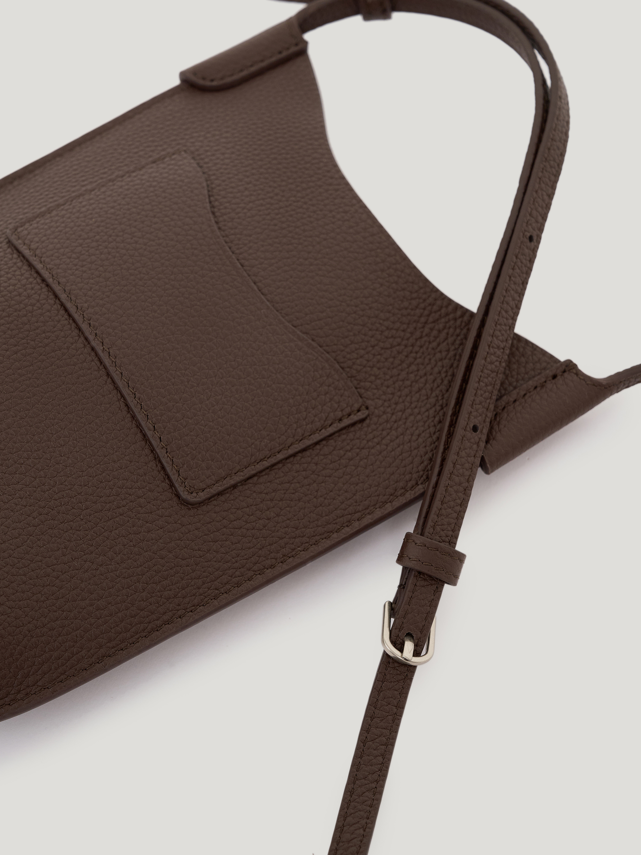 Сумка кроссбоди из натуральной кожи с выраженной зернистой фактурой. Поверхность рельефная, однородная, без глянца. Формат вытянутый по вертикали, с мягко скругленным верхним краем и цельным корпусом без декоративных элементов. Узкий регулируемый ремень позволяет носить модель через плечо или на плече. Оттенок глубокий темно-коричневый с теплым подтоном. Модель компактная по ширине и функциональная по высоте, подходит для повседневного использования и сохраняет четкость формы.