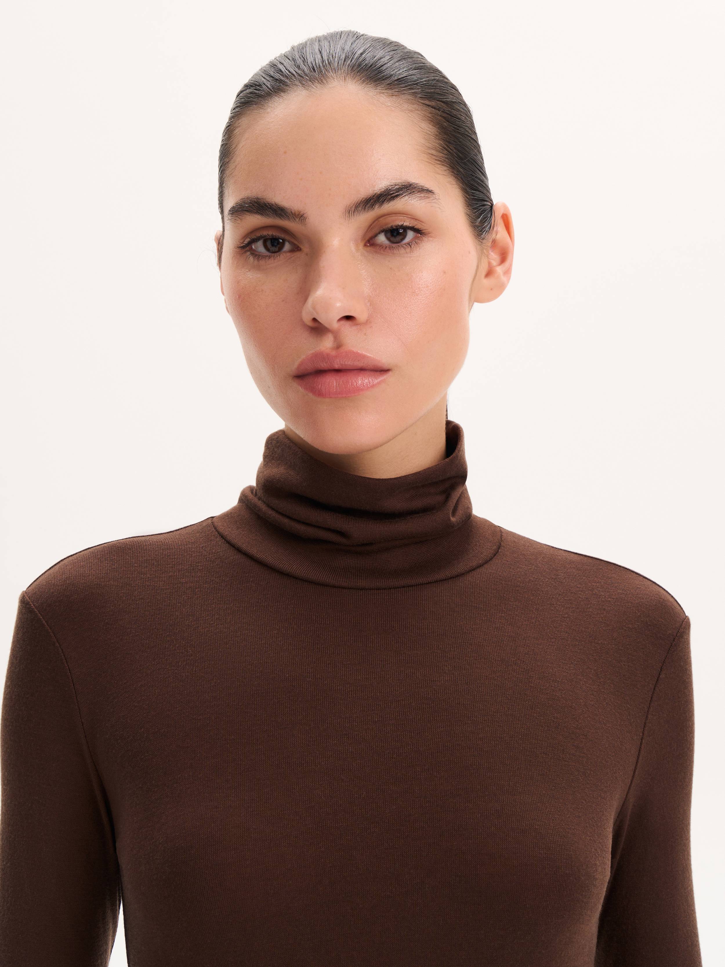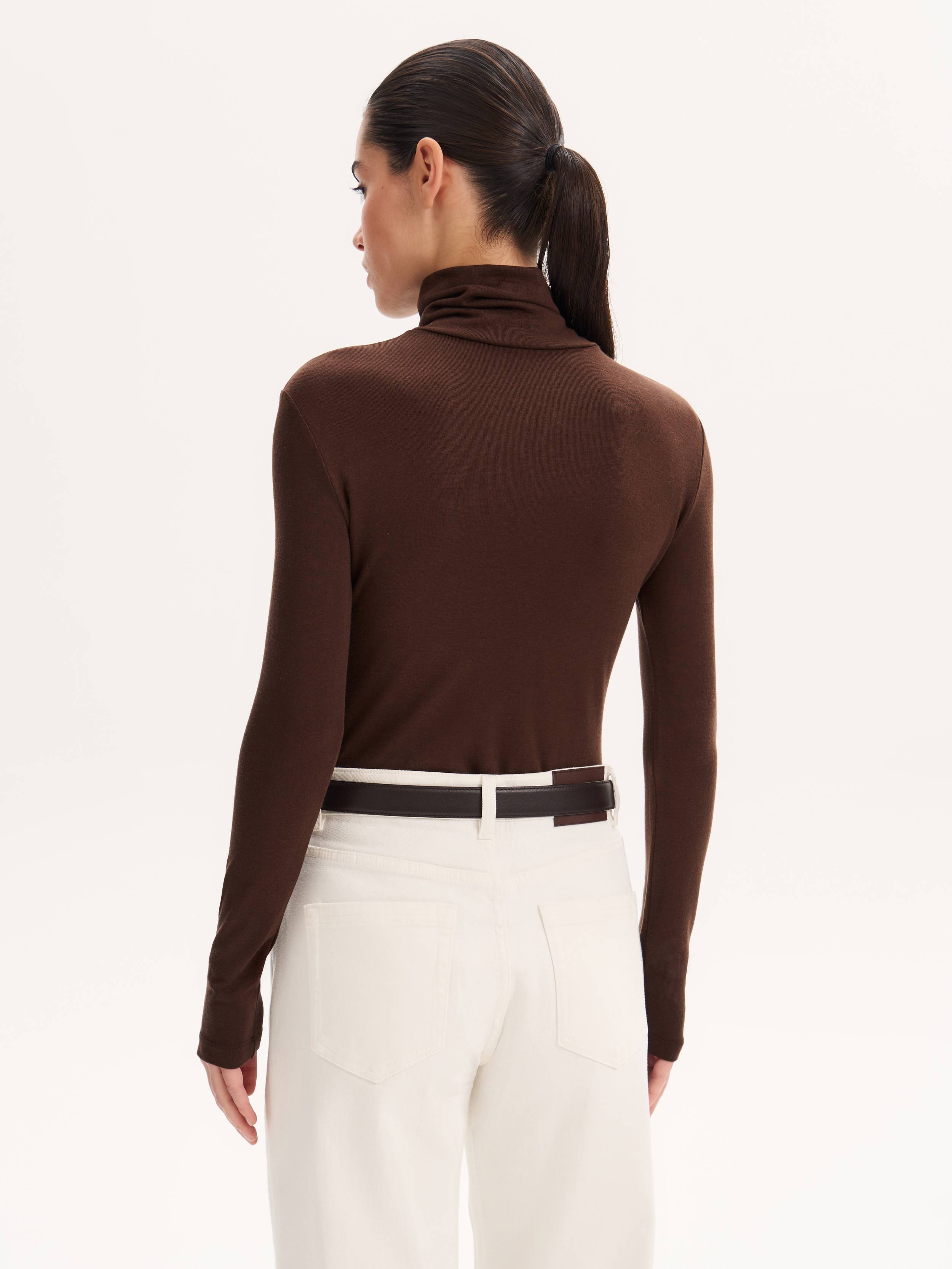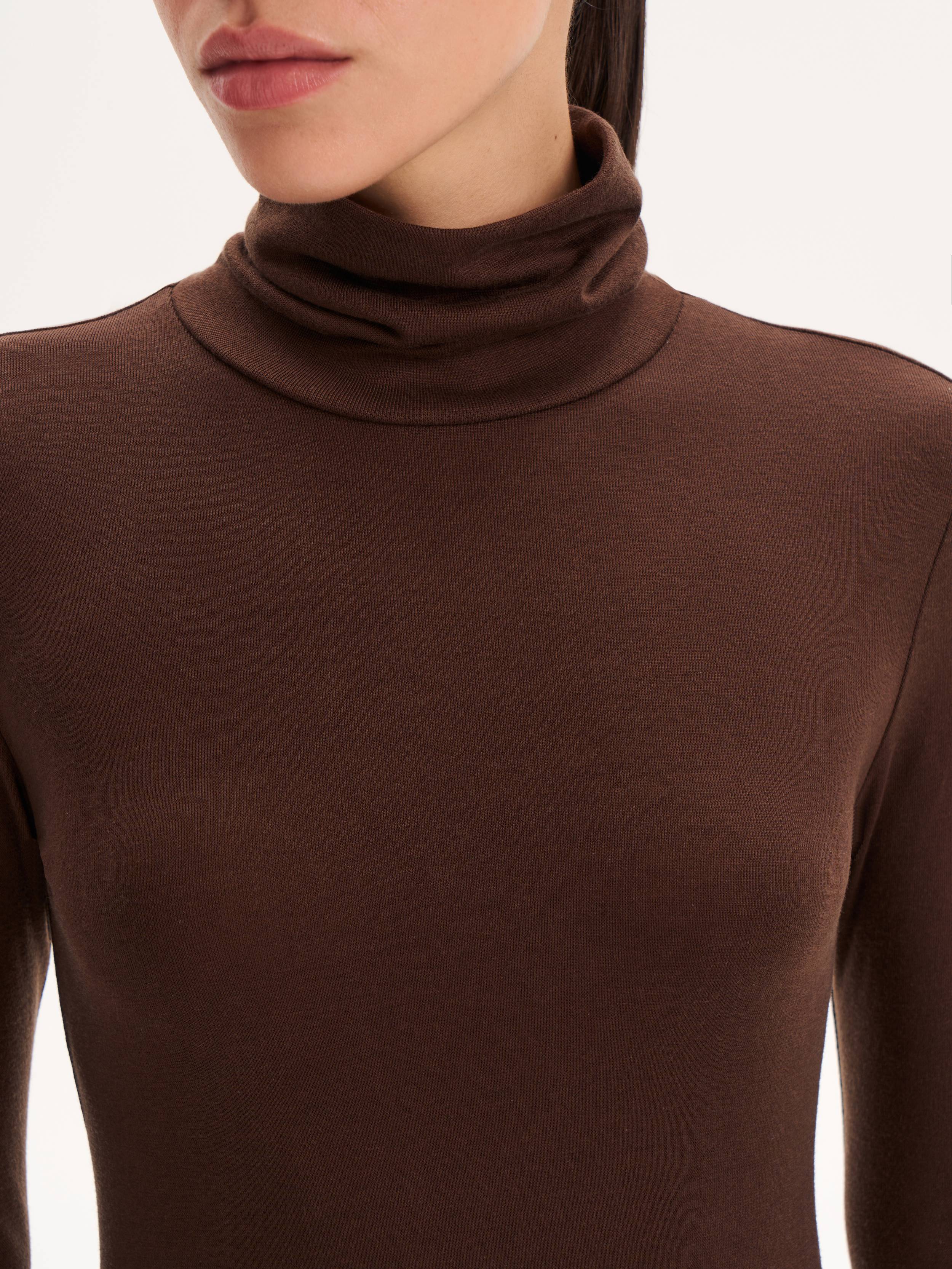 Водолазка из тонкого трикотажа на основе тенсела с добавлением шерсти отличается мягкостью и эластичностью, обеспечивая комфорт в течение дня. Приталенный силуэт аккуратно подчеркивает линии фигуры, а высокий воротник образует естественные драпировки, создавая изысканный акцент в образе. Благодаря лаконичному дизайну модель легко вписывается как в деловые, так и в повседневные комплекты, гармонируя с жакетами, юбками или брюками.