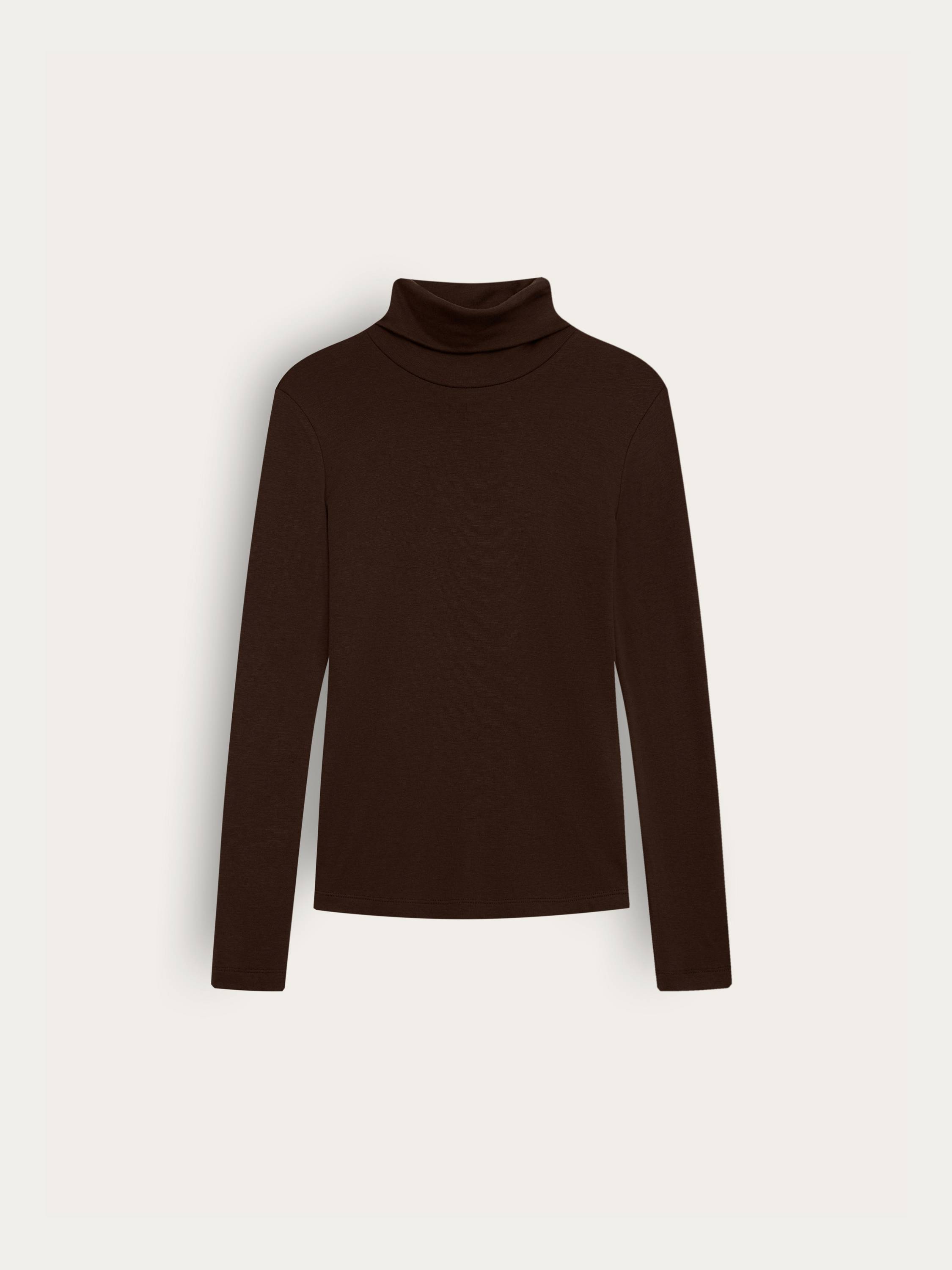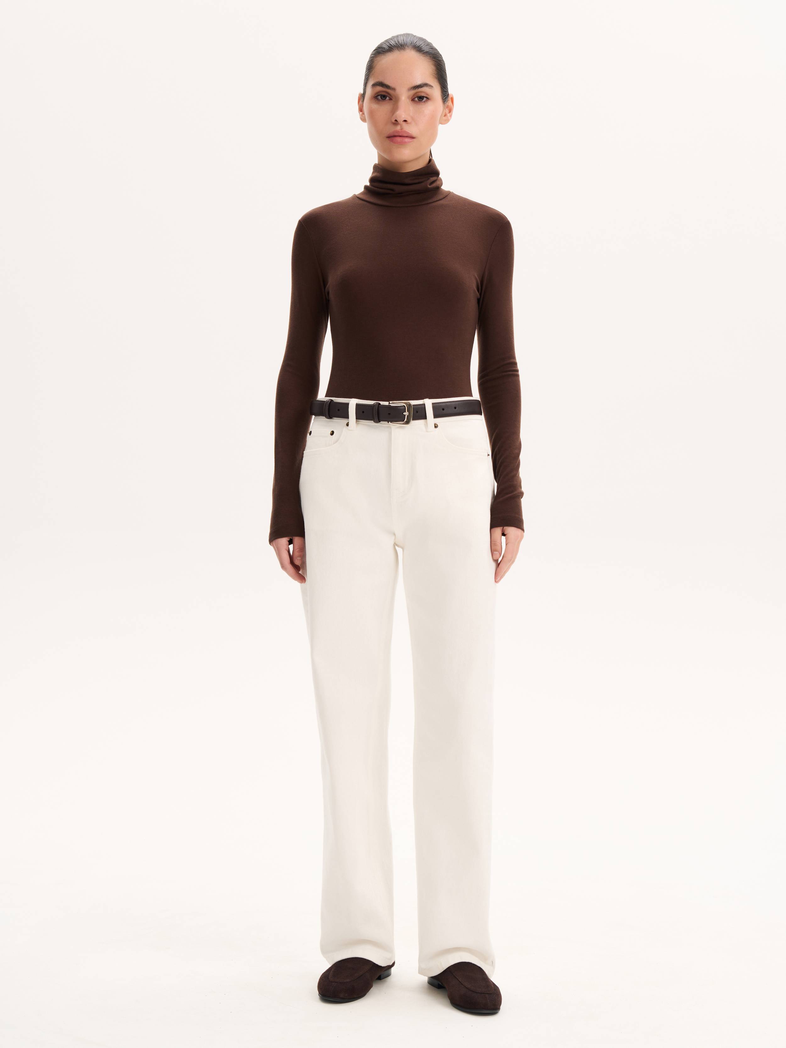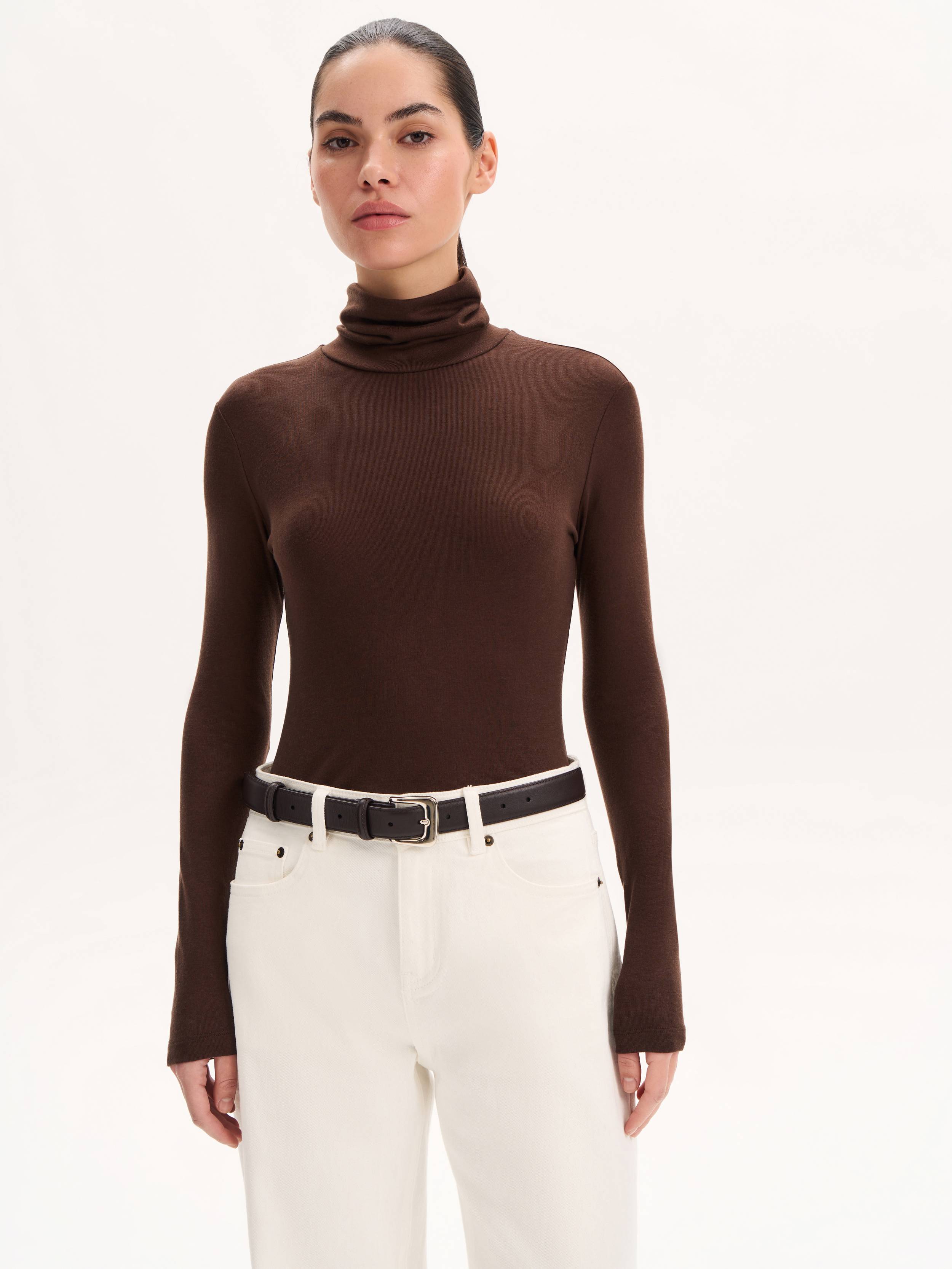 Водолазка из тонкого трикотажа на основе тенсела с добавлением шерсти отличается мягкостью и эластичностью, обеспечивая комфорт в течение дня. Приталенный силуэт аккуратно подчеркивает линии фигуры, а высокий воротник образует естественные драпировки, создавая изысканный акцент в образе. Благодаря лаконичному дизайну модель легко вписывается как в деловые, так и в повседневные комплекты, гармонируя с жакетами, юбками или брюками.
