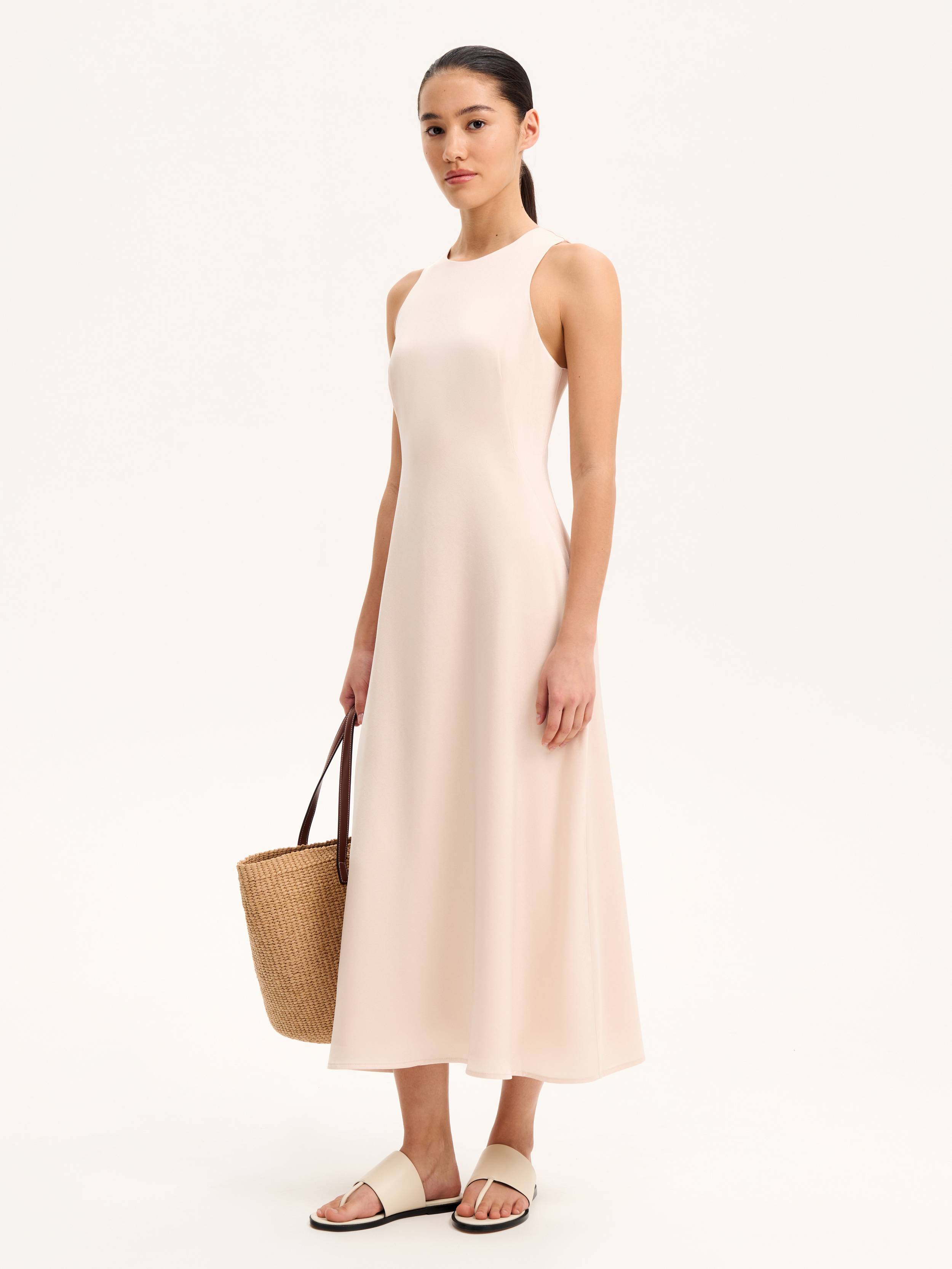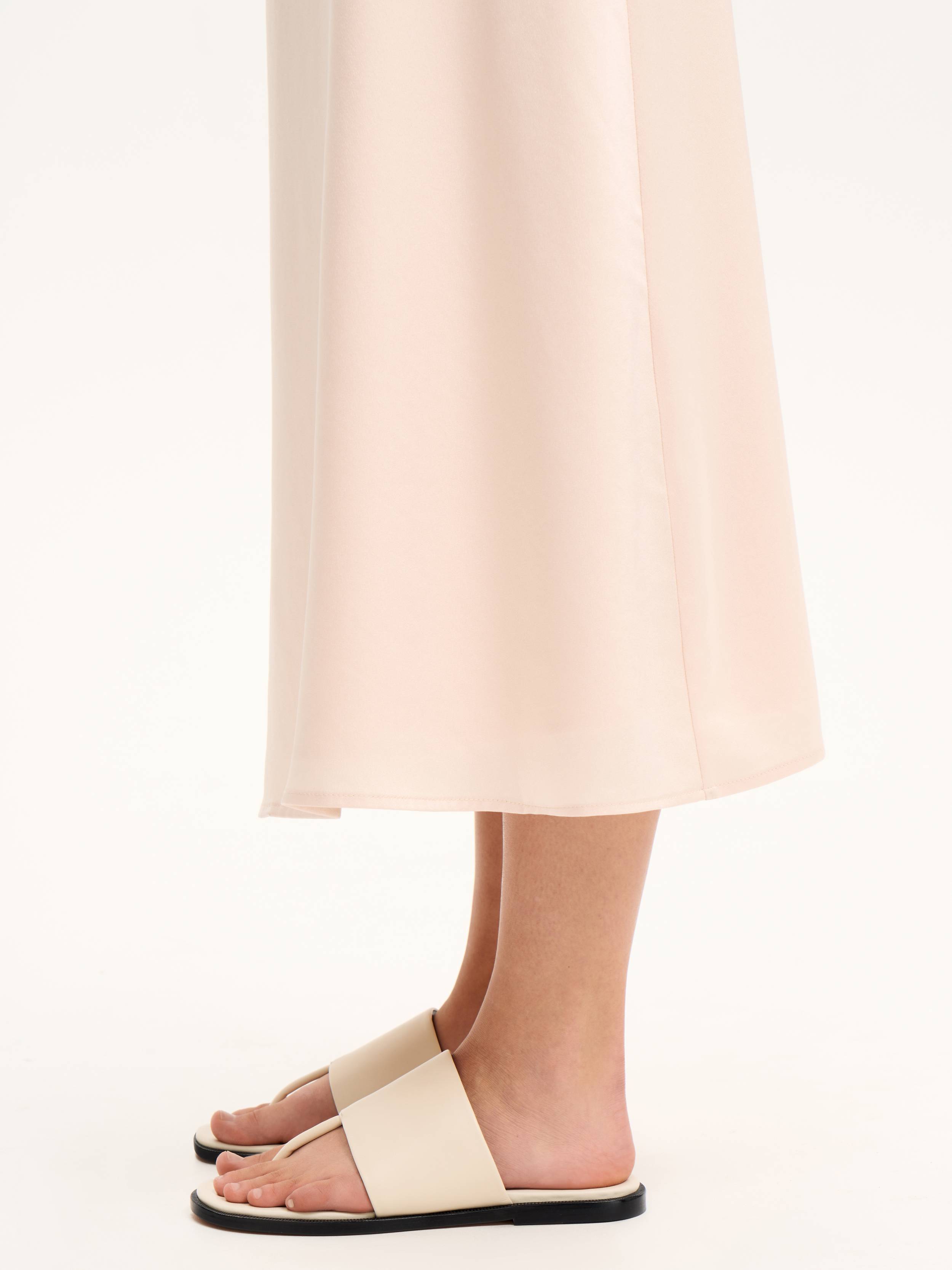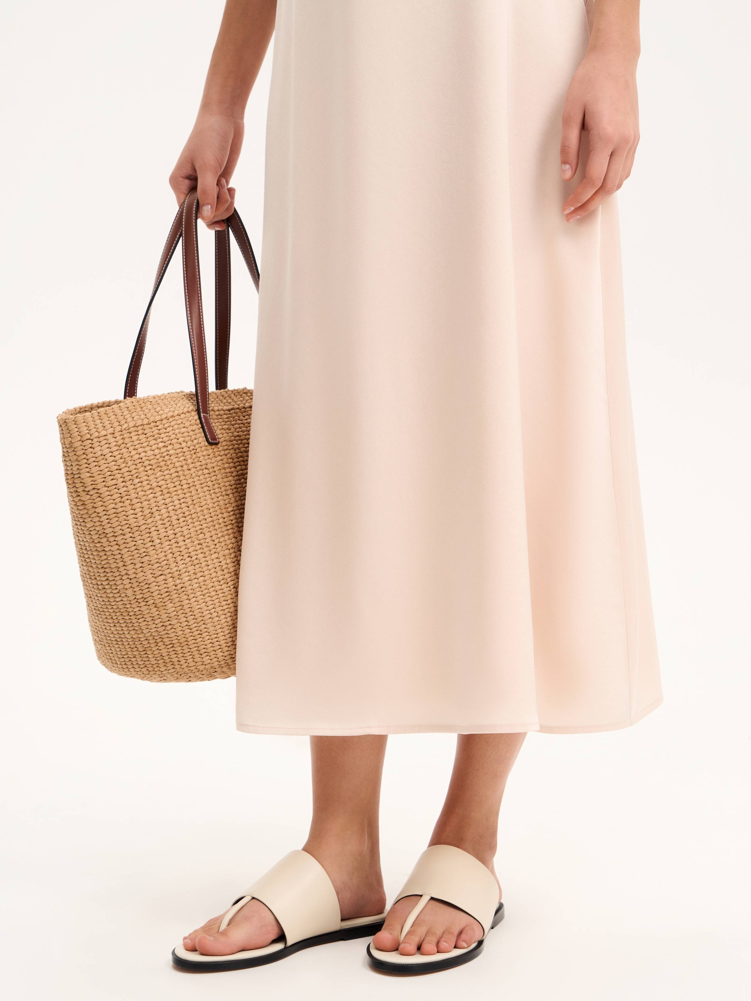 Минималистичные мюли из гладкой кожи — летняя база с архитектурным настроением. Широкий верхний ремень мягко охватывает стопу, а тонкая перемычка между пальцами добавляет легкости и подчеркивает открытость модели. Плоская подошва высотой 1 см обеспечивает комфорт при ходьбе, оставаясь почти невесомой. Чистые линии, матовая поверхность кожи и нейтральный оттенок делают пару универсальной — она легко впишется в повседневный гардероб, будь то городские образы с денимом или пляжные сочетания с льном и хлопком.