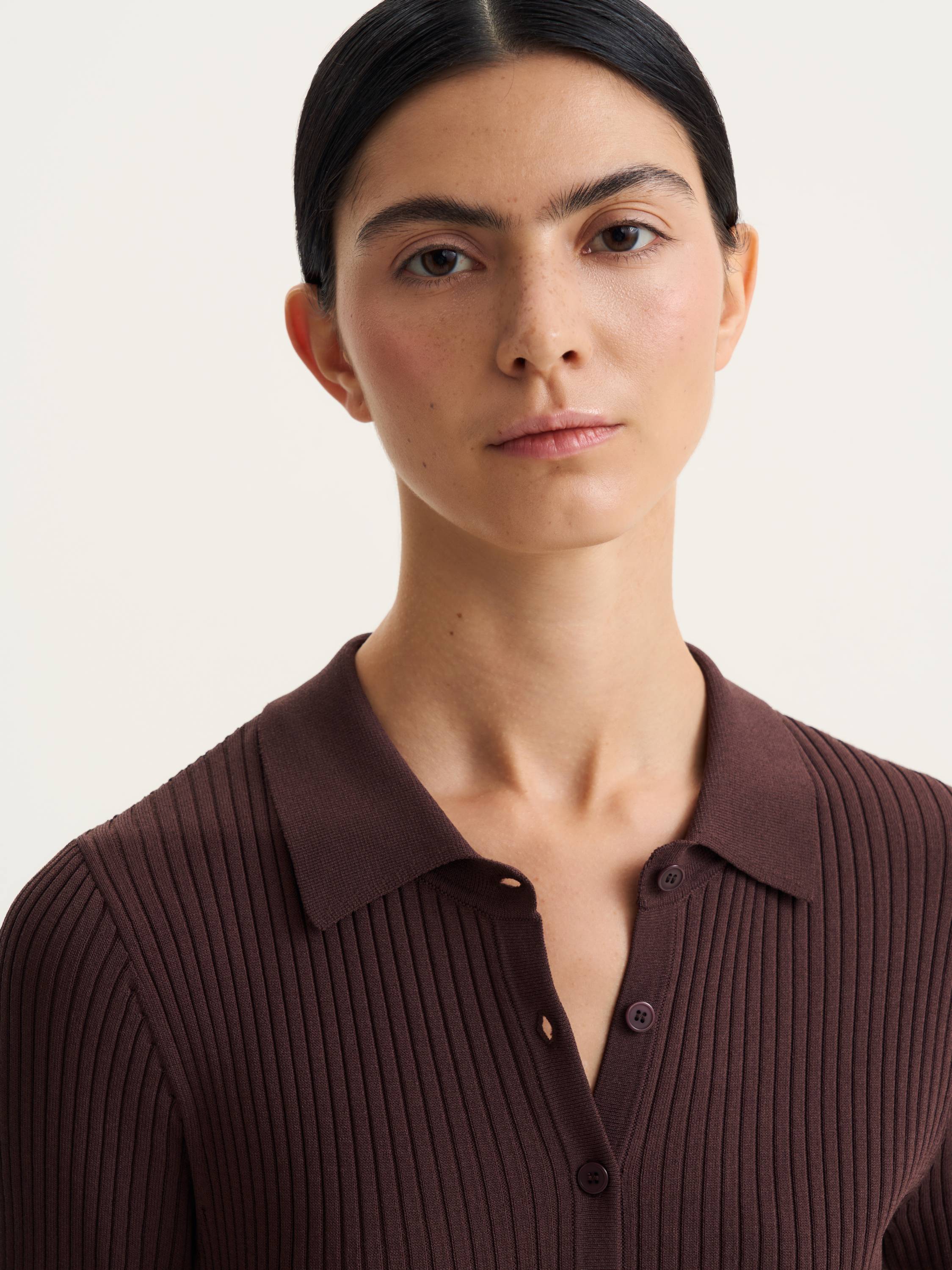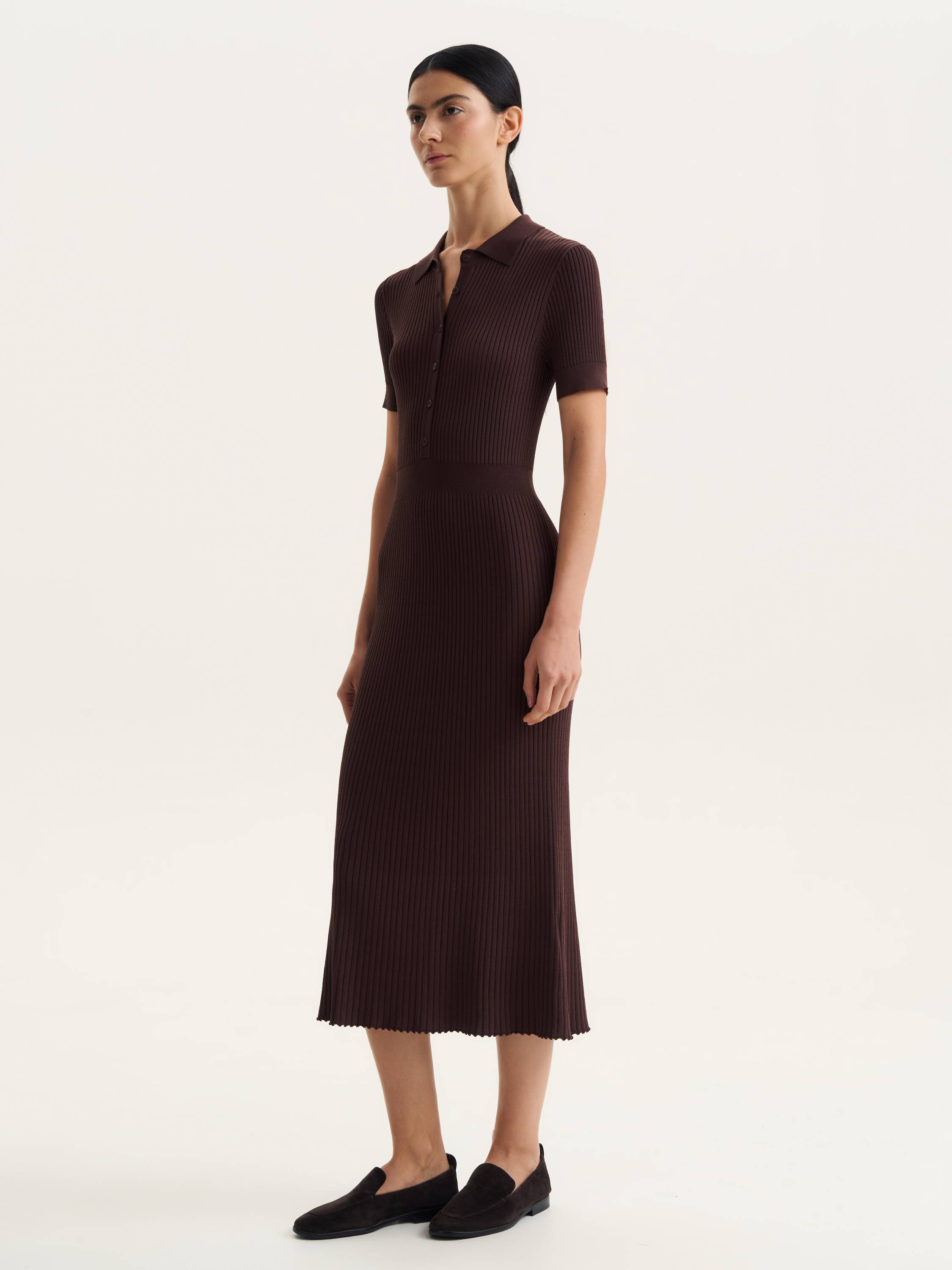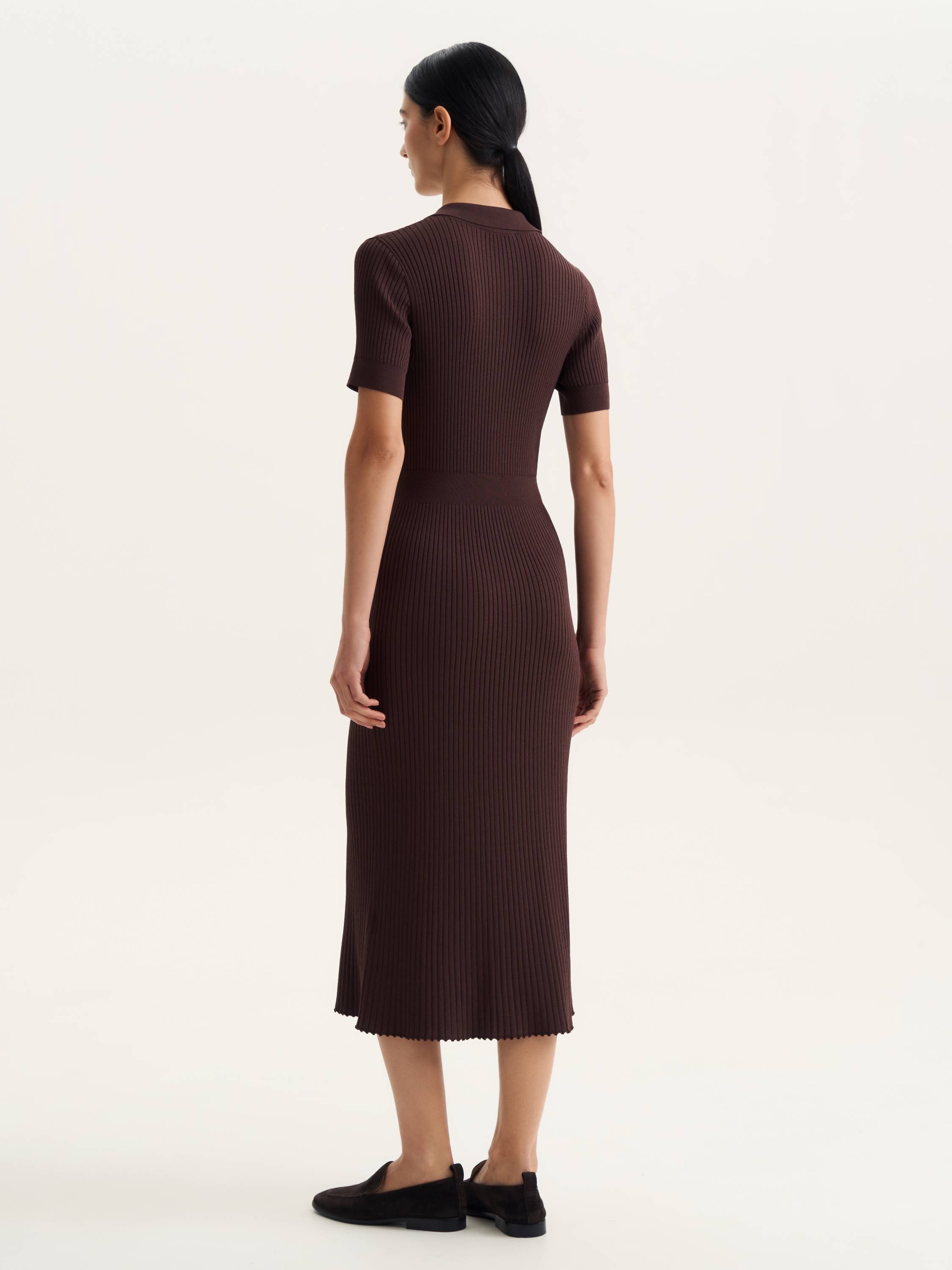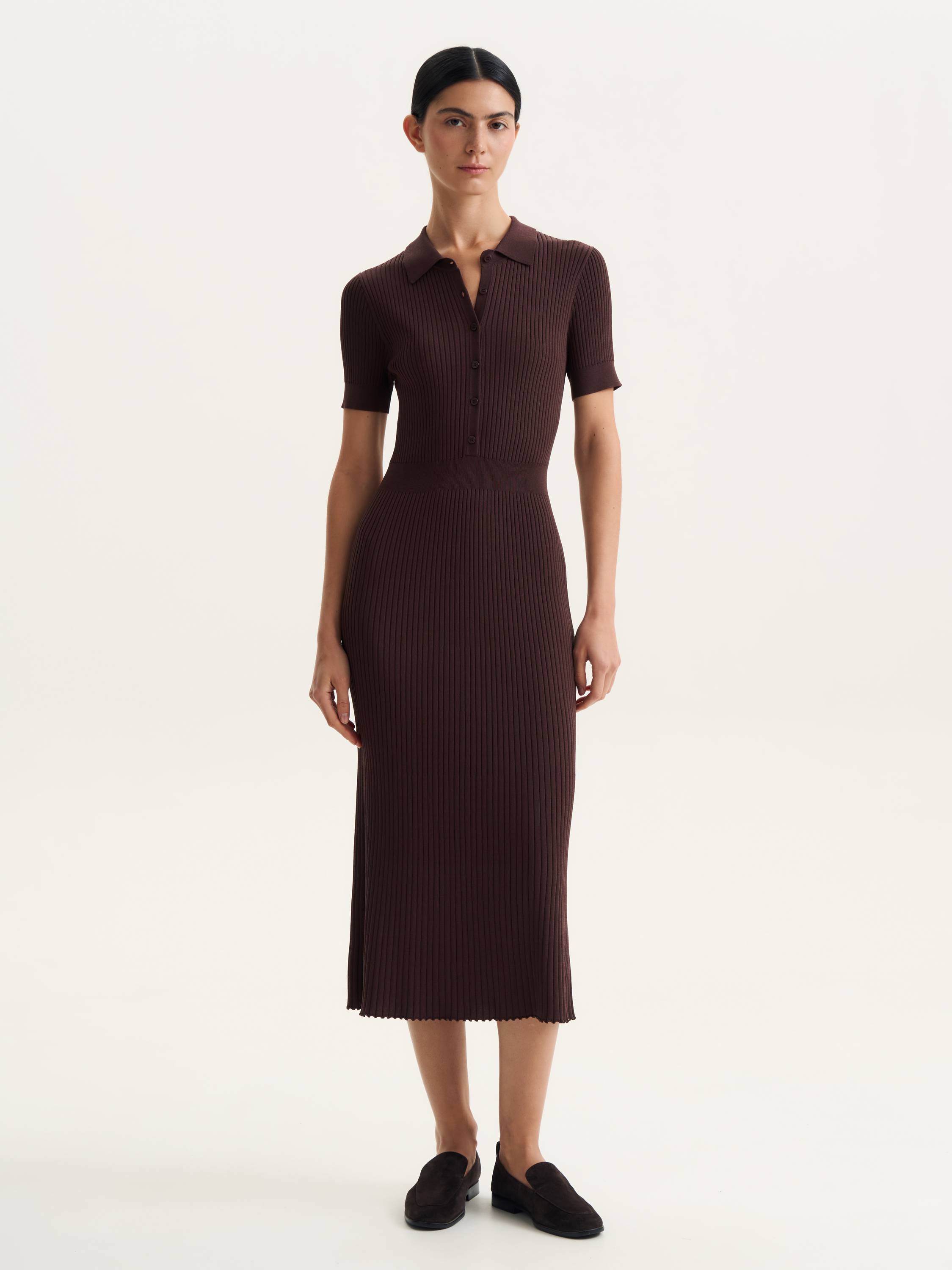 Трикотажное платье миди сочетает в себе элегантность и комфорт, создавая утонченный образ для разных случаев. Фактурная вязка в рубчик подчеркивает силуэт, создавая вертикальные линии, визуально вытягивающие фигуру. Приталенный крой гармонично садится по фигуре, а мягкая, пластичная ткань обеспечивает комфорт в течение всего дня. Классический отложной воротник и ряд аккуратных пуговиц придают образу сдержанную элегантность. Длина миди делает платье универсальным вариантом как для повседневных, так и для более формальных выходов. Этот лаконичный, но выразительный фасон легко дополнить обувью на плоском ходу для расслабленного образа или каблуками для более изысканного стиля.