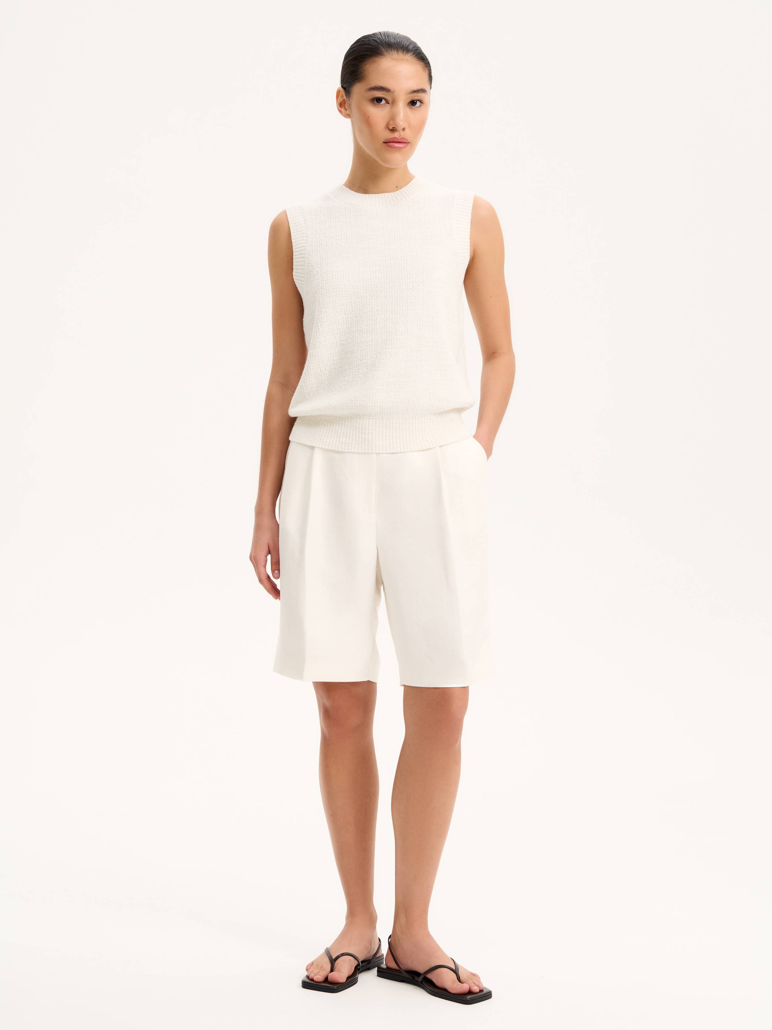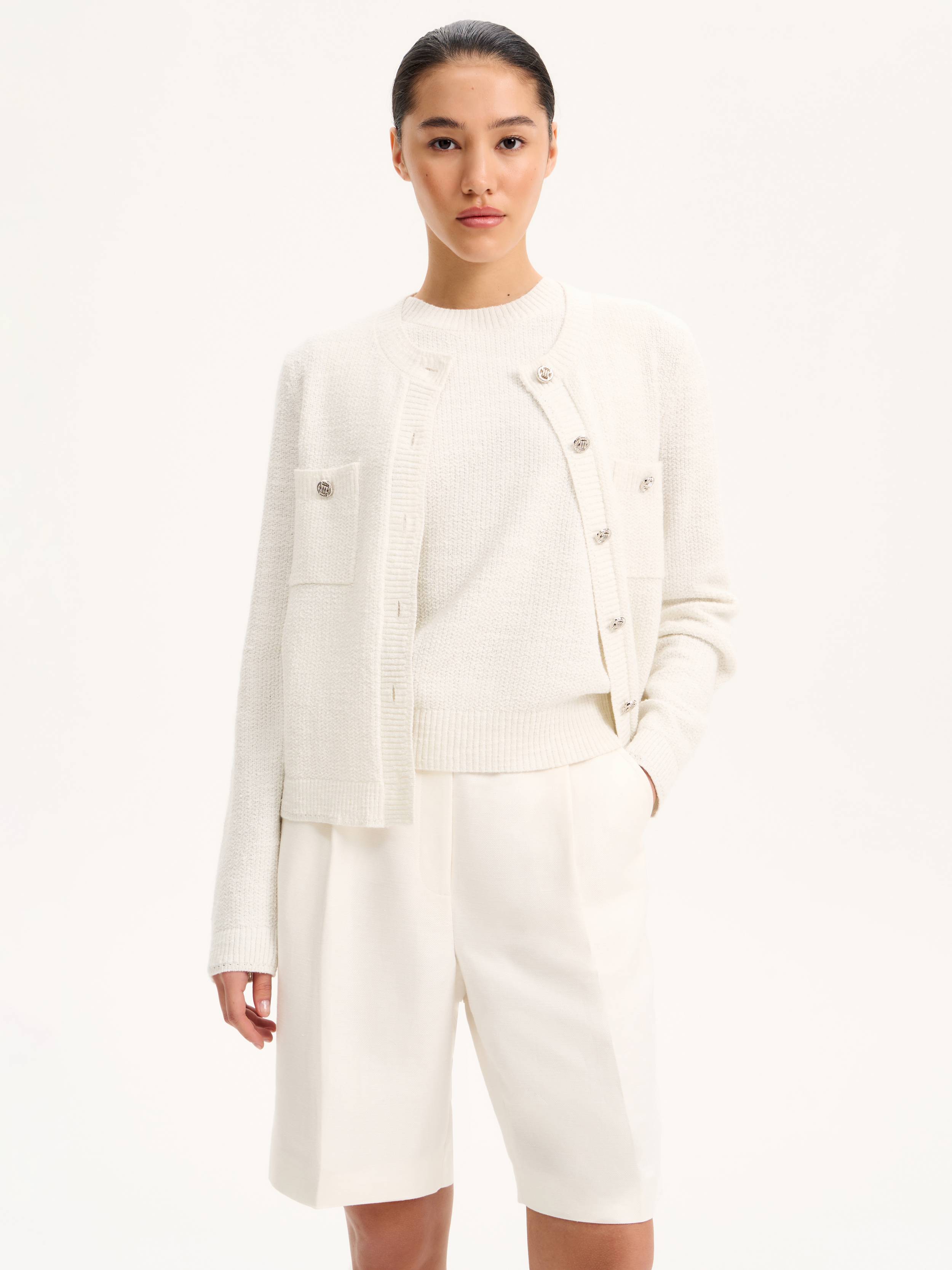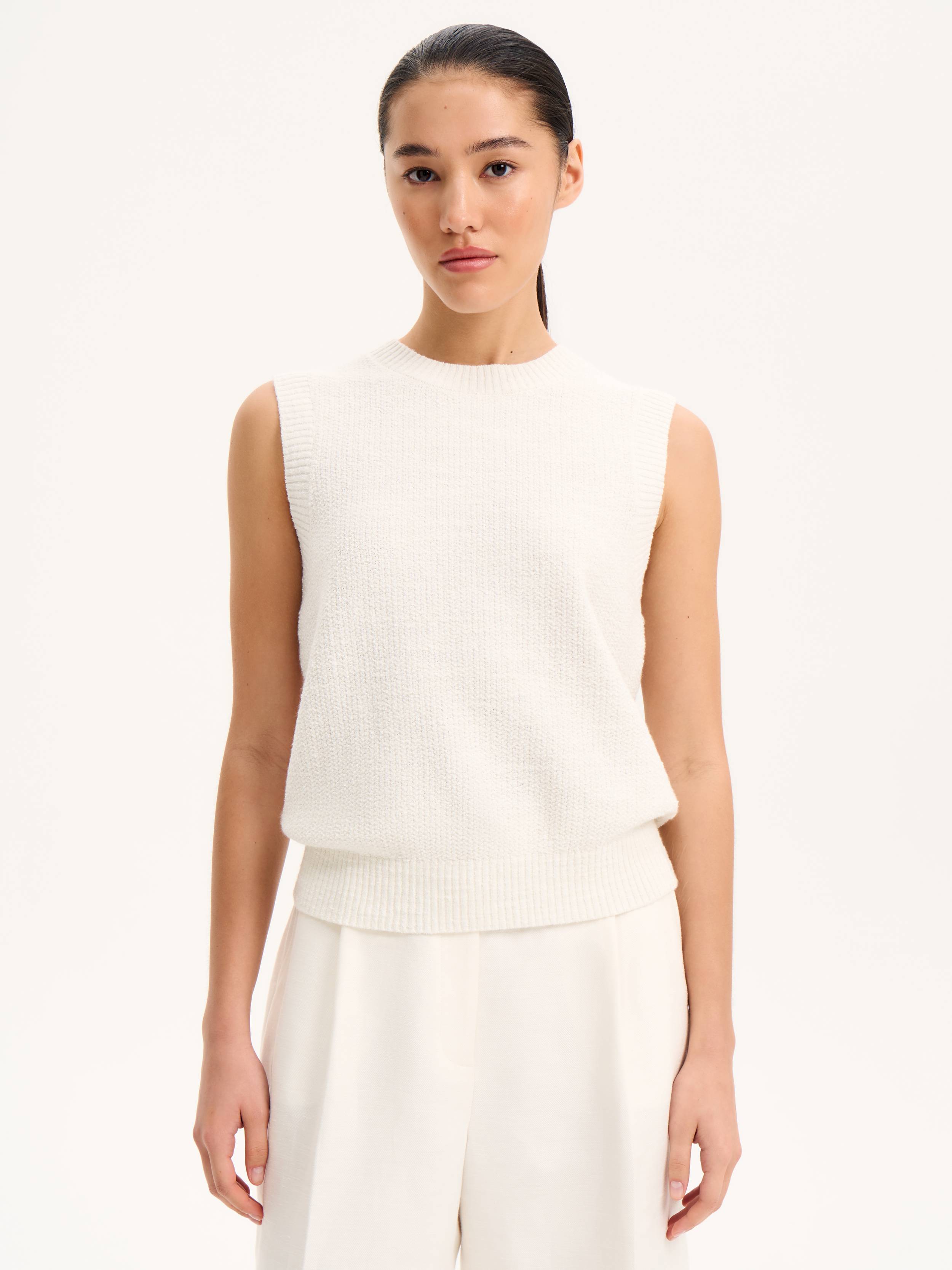Создавайте стильные многослойные образы с трикотажной жилеткой с добавлением шерсти мериноса. Фактурная вязка придает модели объем и делает ее особенно уютной, а полуприлегающий крой мягко ложится по фигуре. Лаконичный круглый вырез и широкие проймы подчеркивают минималистичный стиль, позволяя сочетать жилетку с рубашками, водолазками или носить соло. Эта модель легко вписывается в повседневный и деловой гардероб: с джинсами и кроссовками она подчеркнет расслабленный стиль, а с брюками и классическими аксессуарами создаст элегантный образ.