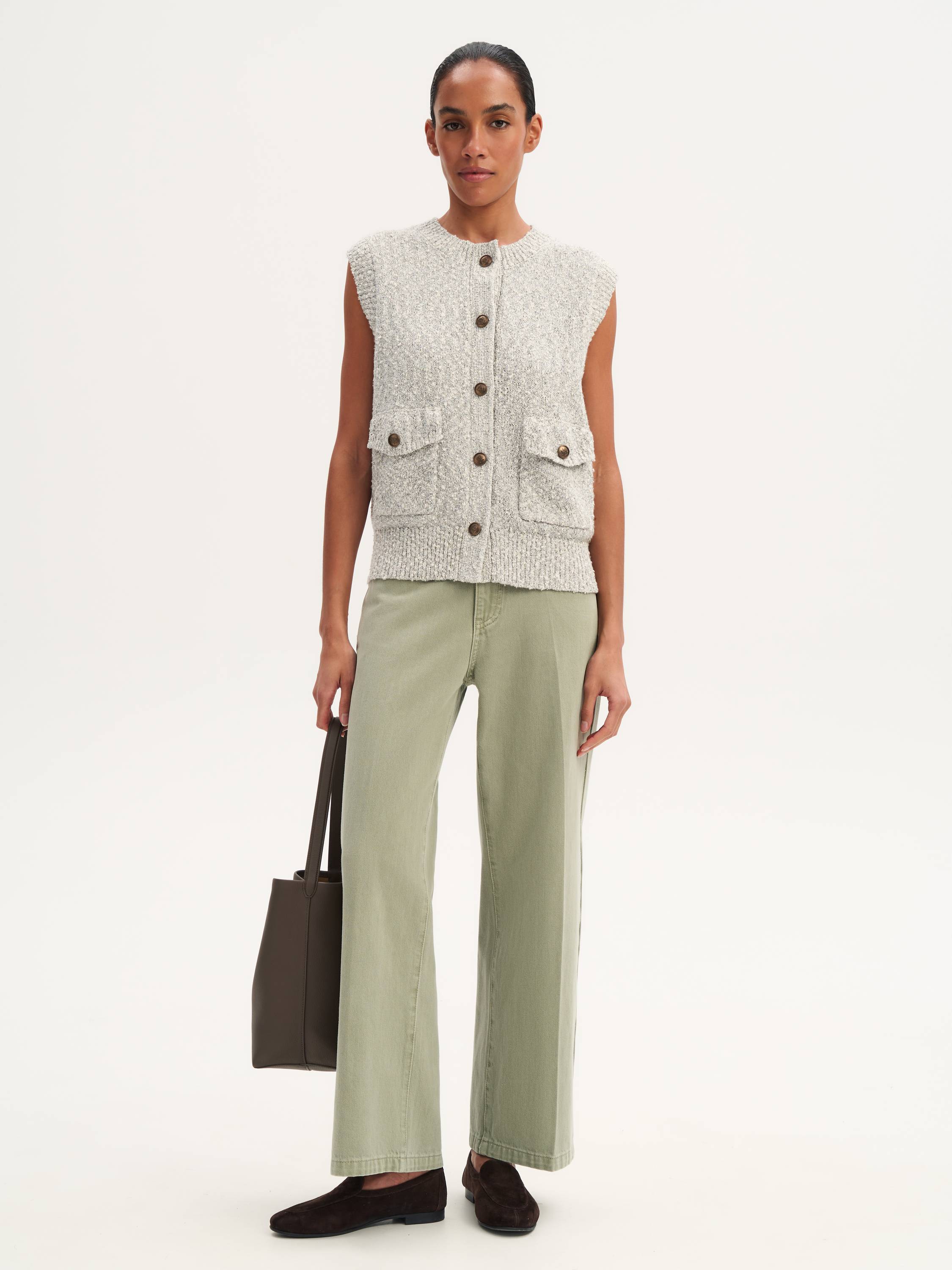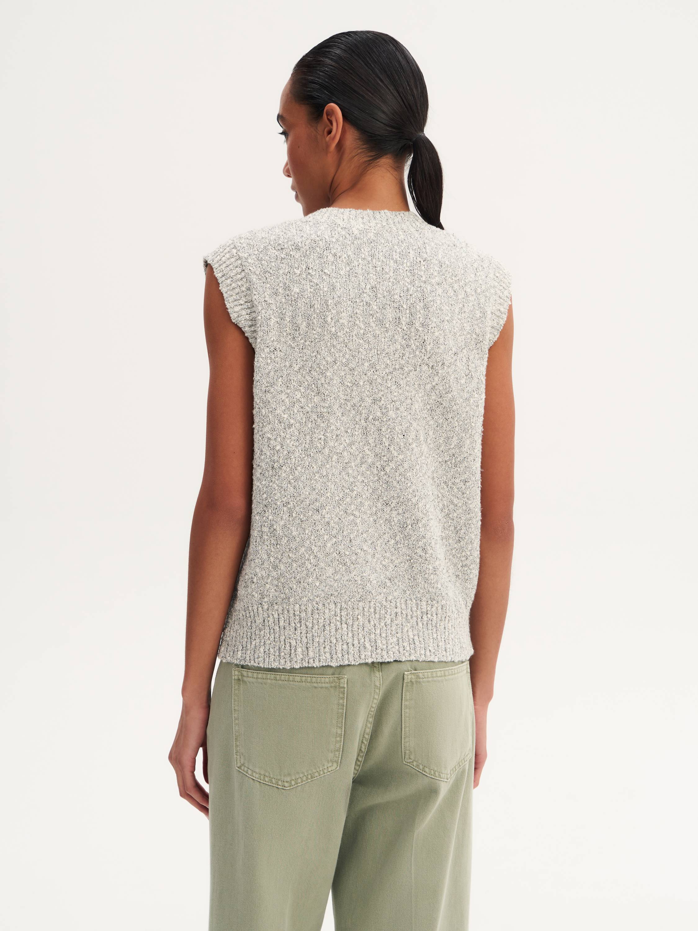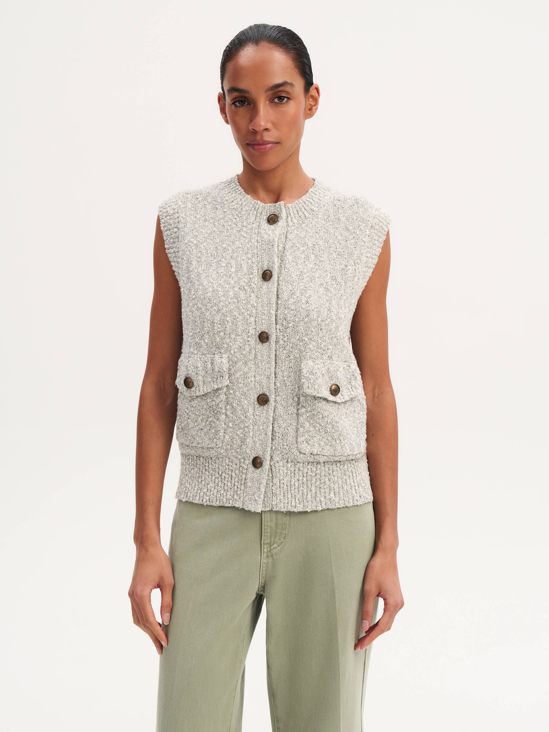 Современная интерпретация классики — лаконичная жилетка с акцентными деталями. Модель выполнена из мягкого трикотажа с добавлением хлопка, что делает ее комфортной и приятной к телу. Фактурная вязка добавляет текстурности, а округлый вырез придает образу утонченность. Накладные карманы с крупными пуговицами подчеркивают стильный характер вещи. Жилетка гармонично сочетается как с блузками и рубашками, так и с трикотажными лонгсливами, создавая многослойные образы в стиле smart casual. А в качестве самостоятельной вещи она отлично подчеркивает силуэт и добавляет образу текстурный акцент.