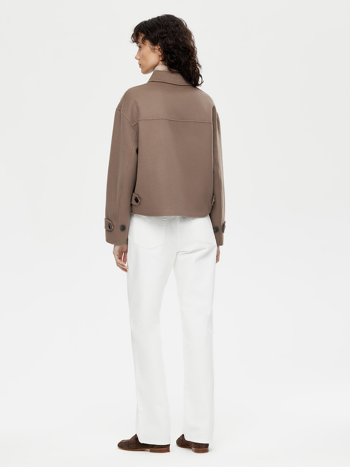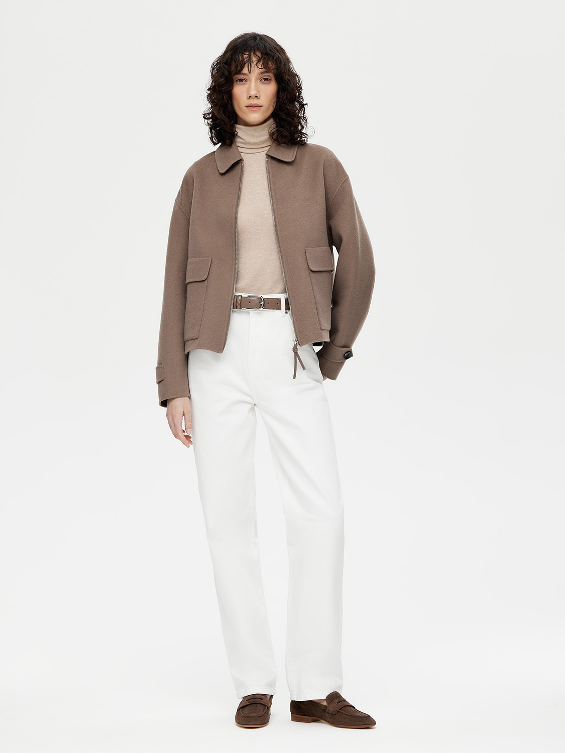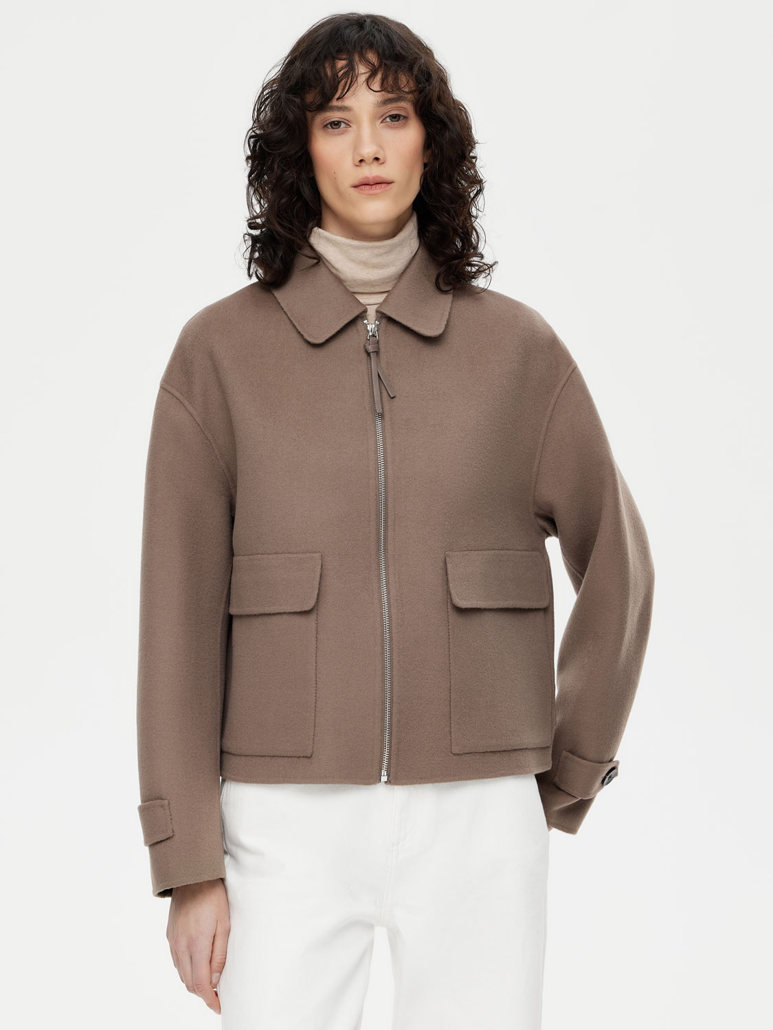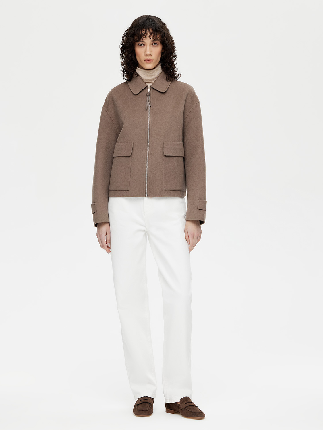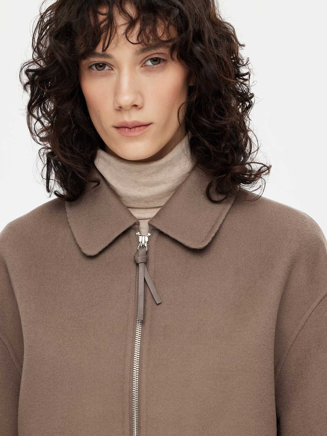 Лаконичное полупальто на молнии из тонкой и мягкой шерсти австралийского мериноса, которая напоминает кашемир. Пальто без подкладки, но два слоя ткани, прошитые невидимой строчкой по технологии double face, делают модель невероятно теплой и при этом очень легкой. Внутренние и часть внешних швов выполнены вручную. Застежка на молнии с собачкой, декорированной натуральной кожей. Накладные карманы с клапанами, отложной воротник и паты на рукавах добавляют акцентов. На модели размер S. Параметры модели: рост 177, 72-57-87.