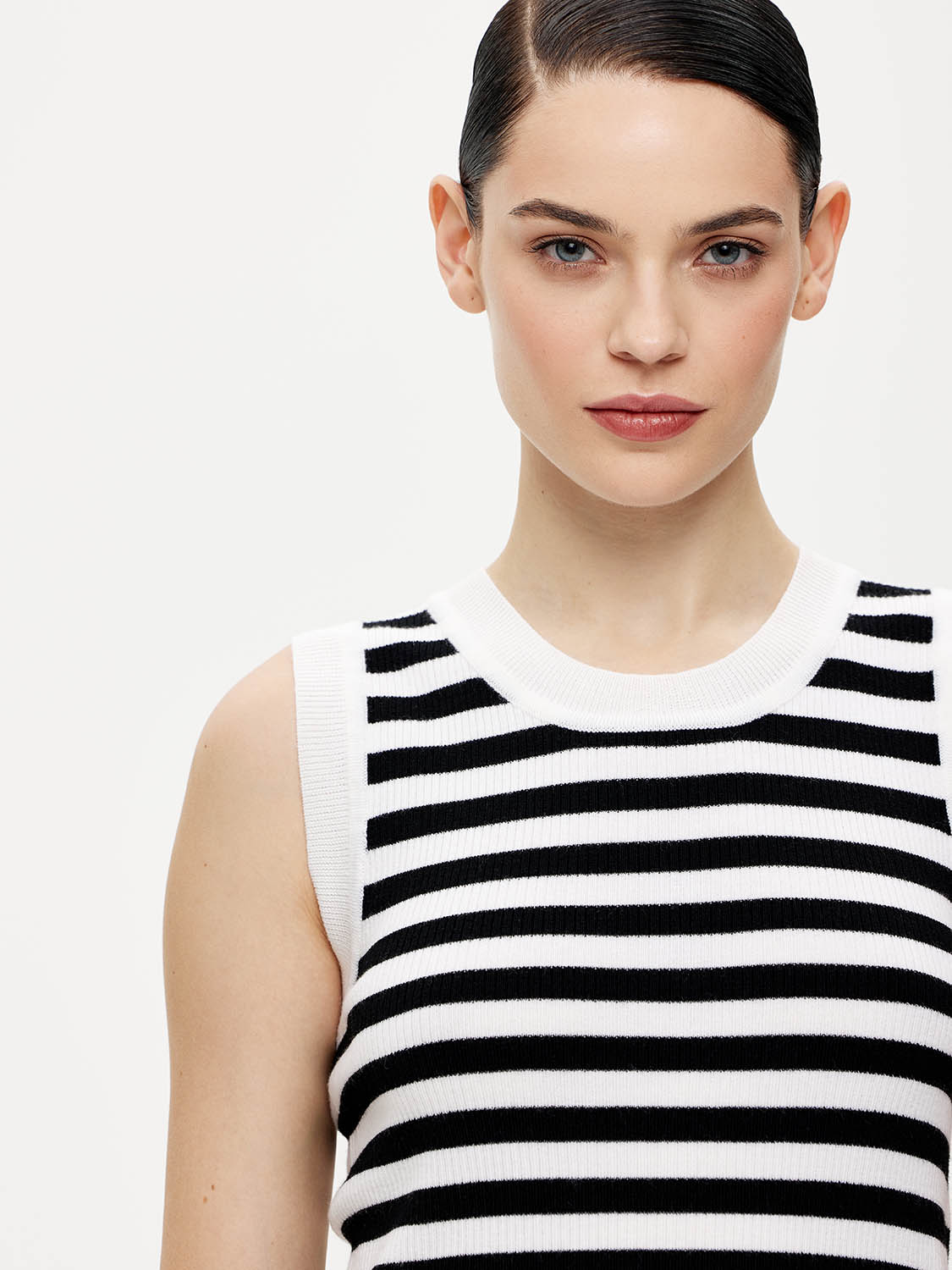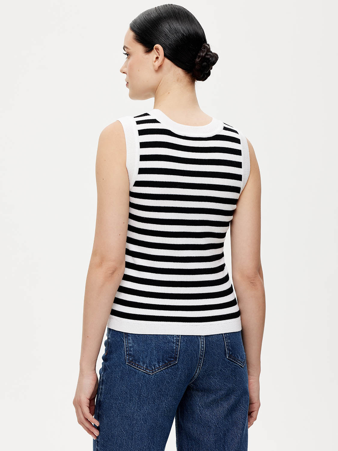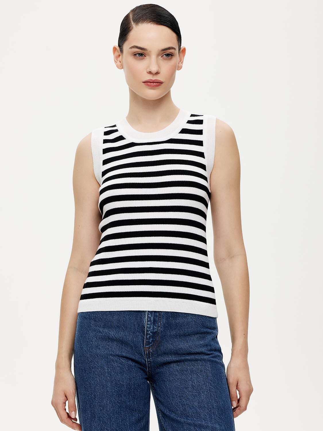Базовый трикотажный топ без рукавов в морском стиле. Классический округлый вырез и принт полоска. За комфорт отвечает мягкая шелковистая пряжа из шерсти мериноса. По сравнению с обычной шерстью ее волокна более длинные и гладкие, они не колются и не раздражают кожу. Такой топ сочетается с брюками, юбками, джинсами или шортами. Носите как самостоятельный элемент комплекта или в качестве первого слоя под кардиганы, жакеты и рубашки. На модели размер S. Параметры модели: рост 176, 89-67-94.