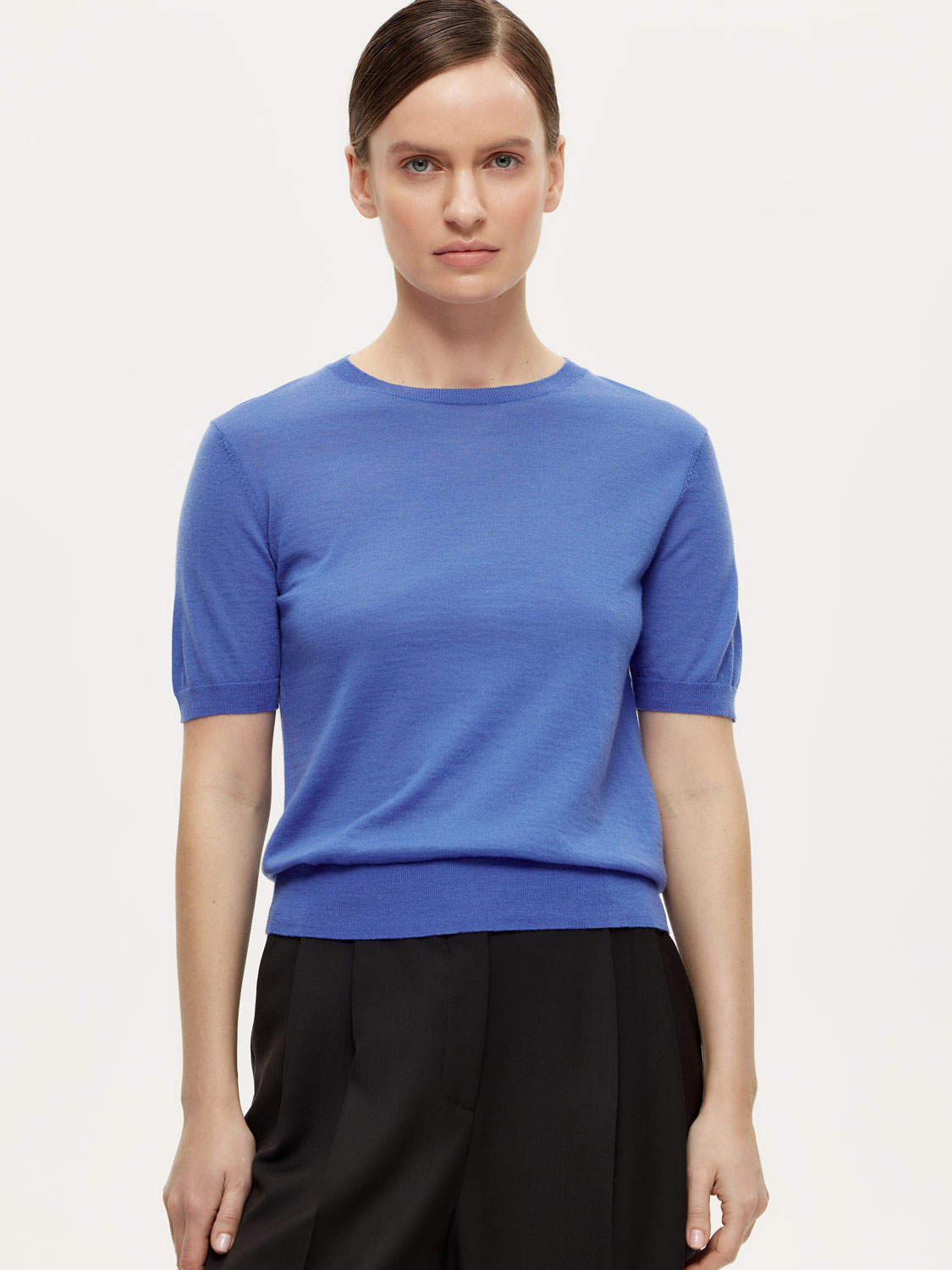 Трикотажная блуза с короткими рукавами из натуральной шерсти мериноса. У блузы округлый ворот, мягкая резинка по низу, шерстяная тканья мягкая на ощупь и согревающая. Блуза дополнит кэжуал образы с джинсами, классические образы с брюками или же с юбкой-миди для элегантного наряда. Мериносовая шерсть подойдет для прохладной погоды и будет согревать в холодные дни и в демисезон. На модели размер S. Параметры модели: рост 177, 83-61-89.