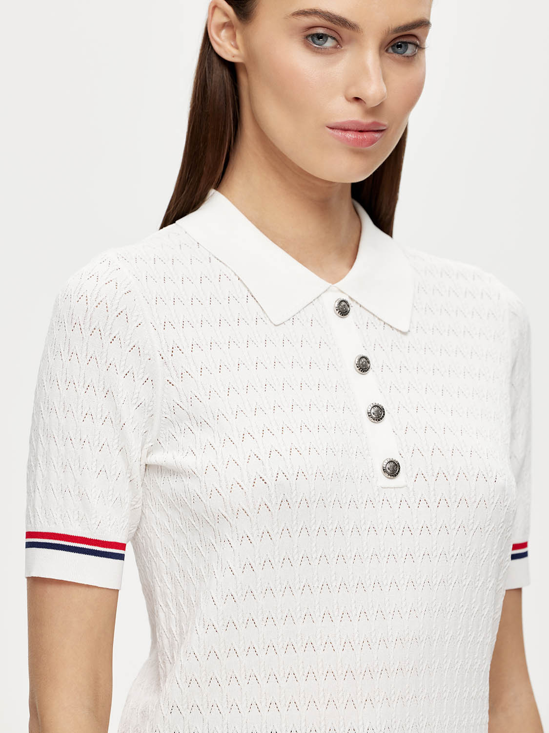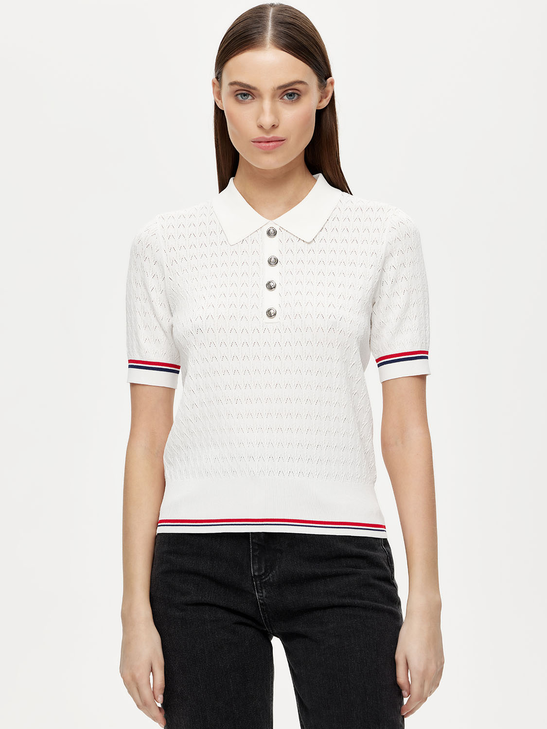 Трикотажный джемпер поло выглядит невероятно женственно благодаря фактурной ажурной вязке. Выполнен из воздушного мягкого вискозного полотна, которое укрепили нейлоном для прочности. Не вытягивается. У джемпера втачной рукав, декоративные металлические пуговицы. За яркость отвечают акцентные полоски по краям, а за удобство свободный крой. Комбинируйте с шортами, брюками и джинсами. На модели размер S. Параметры модели: рост 177, 85-61-92.