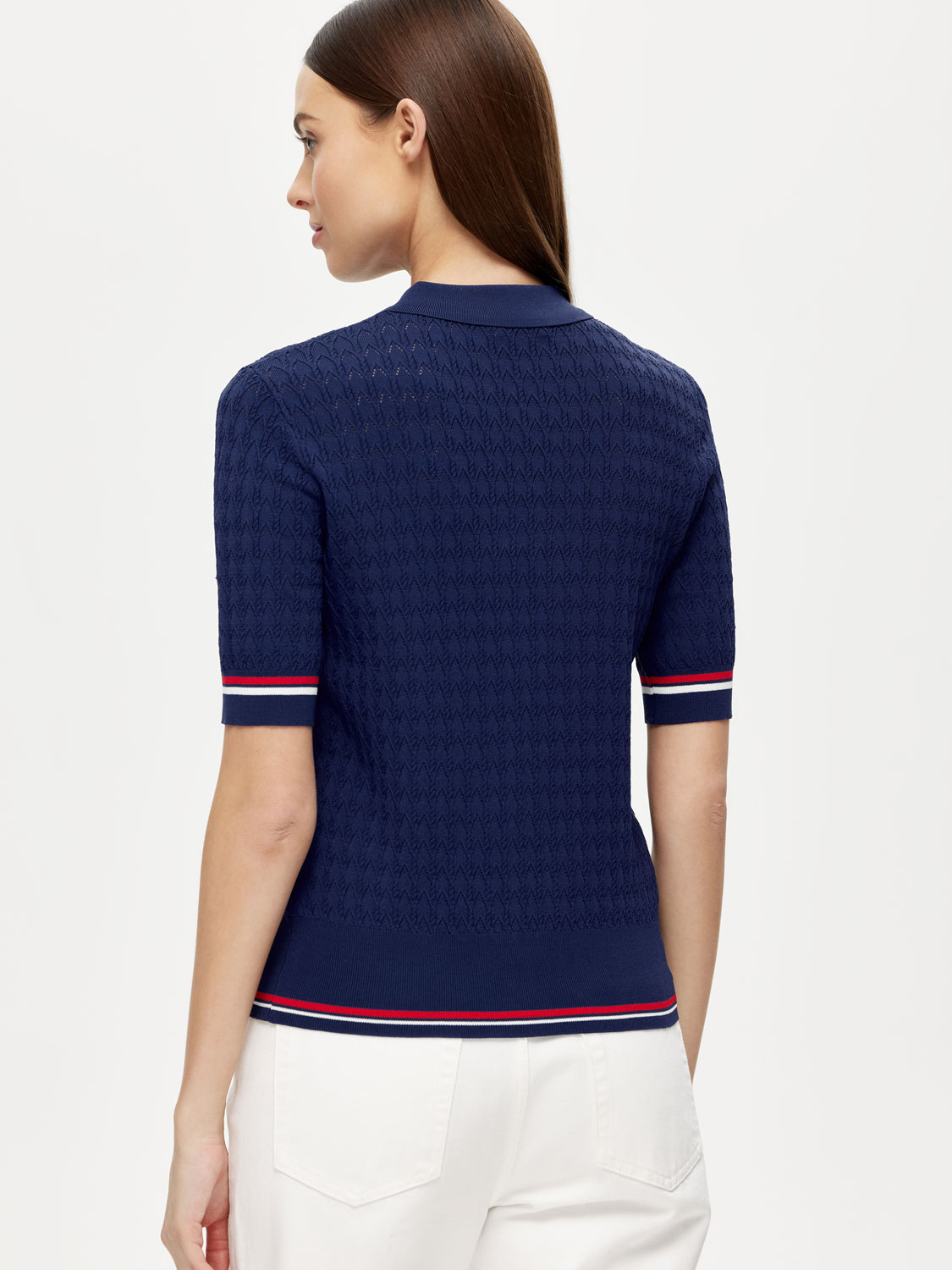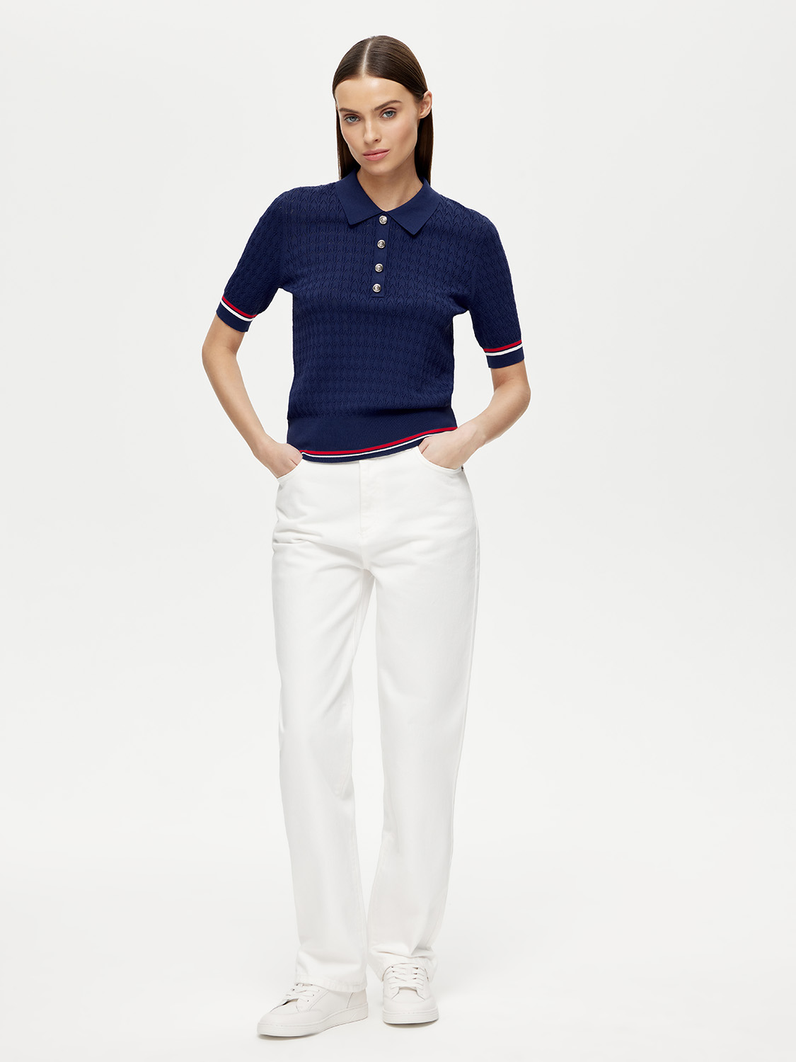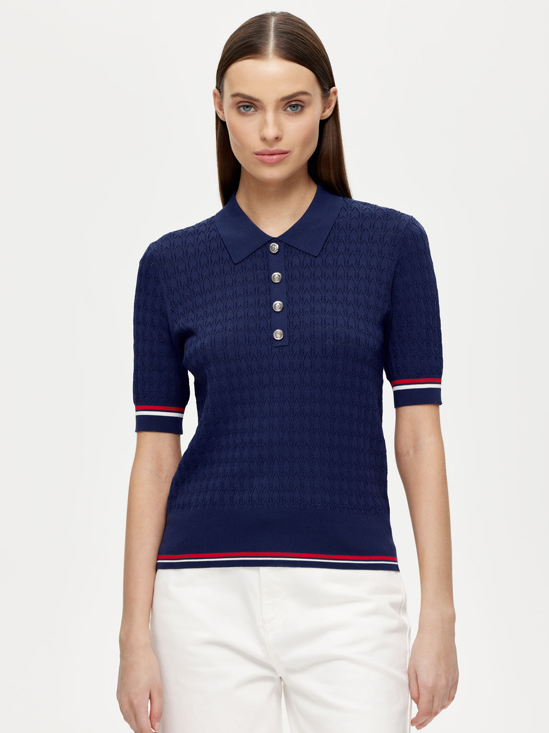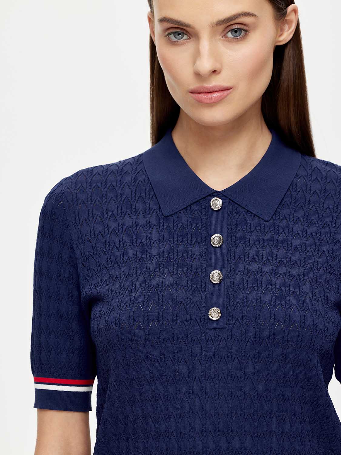 Трикотажный джемпер поло выглядит невероятно женственно благодаря фактурной ажурной вязке. Выполнен из воздушного мягкого вискозного полотна, которое укрепили нейлоном для прочности. Не вытягивается. У джемпера втачной рукав, декоративные металлические пуговицы. За яркость отвечают акцентные полоски по краям, а за удобство свободный крой. Комбинируйте с шортами, брюками и джинсами. На модели размер S. Параметры модели: рост 177, 85-61-92.