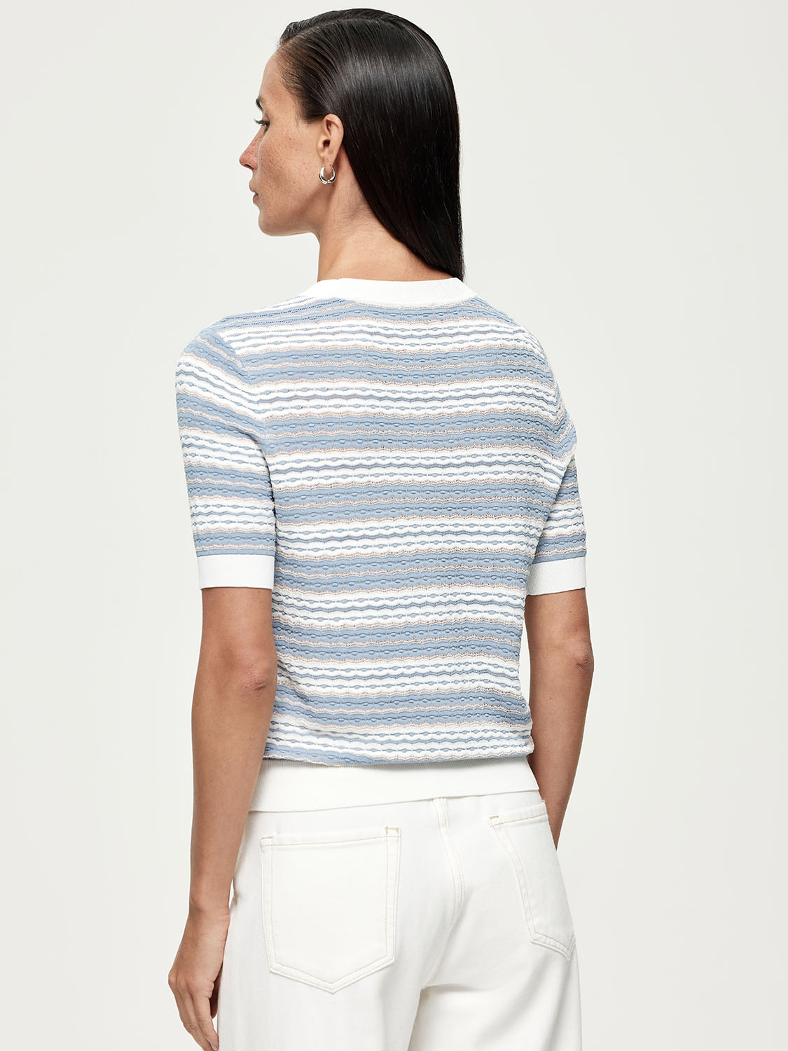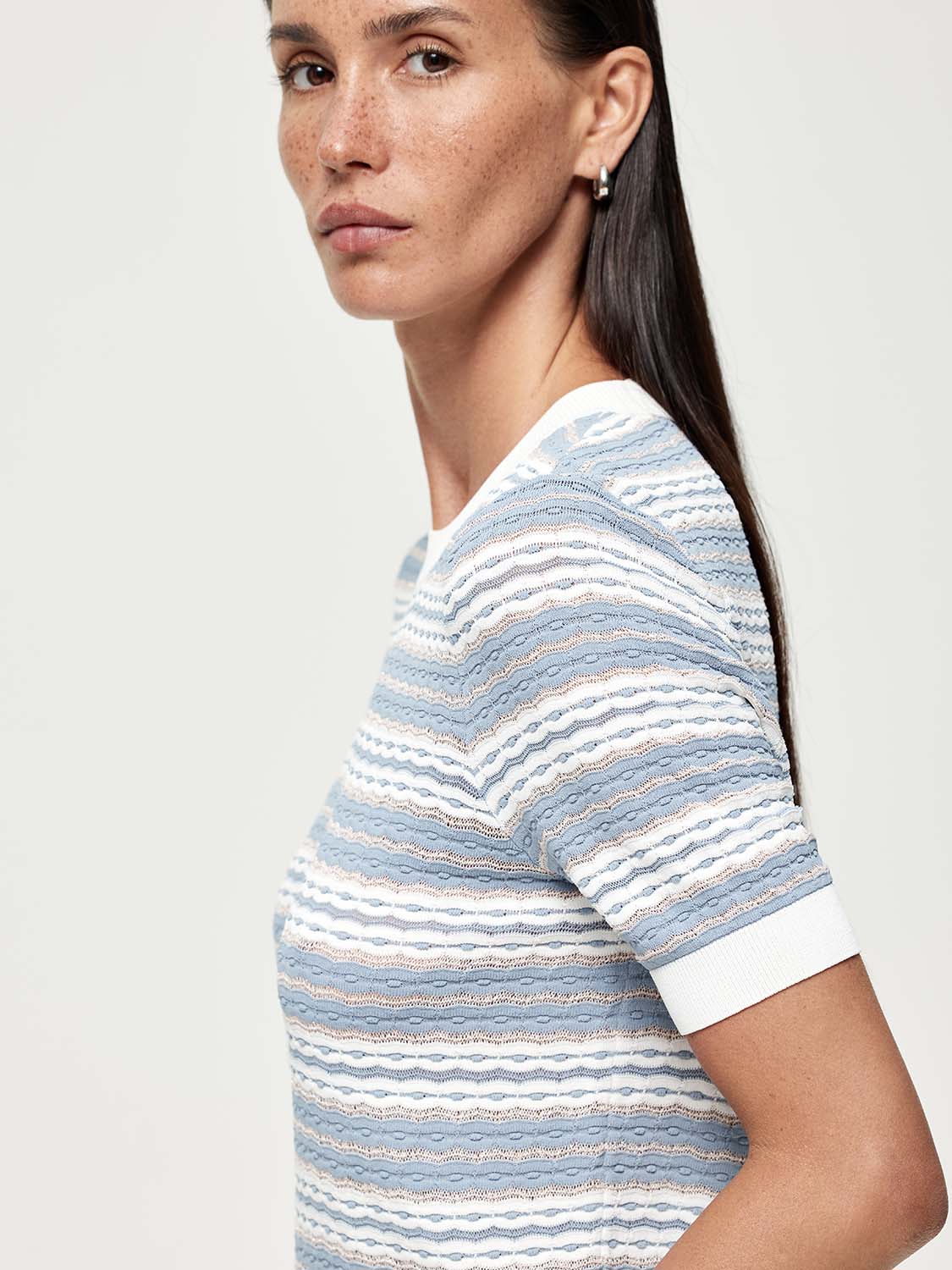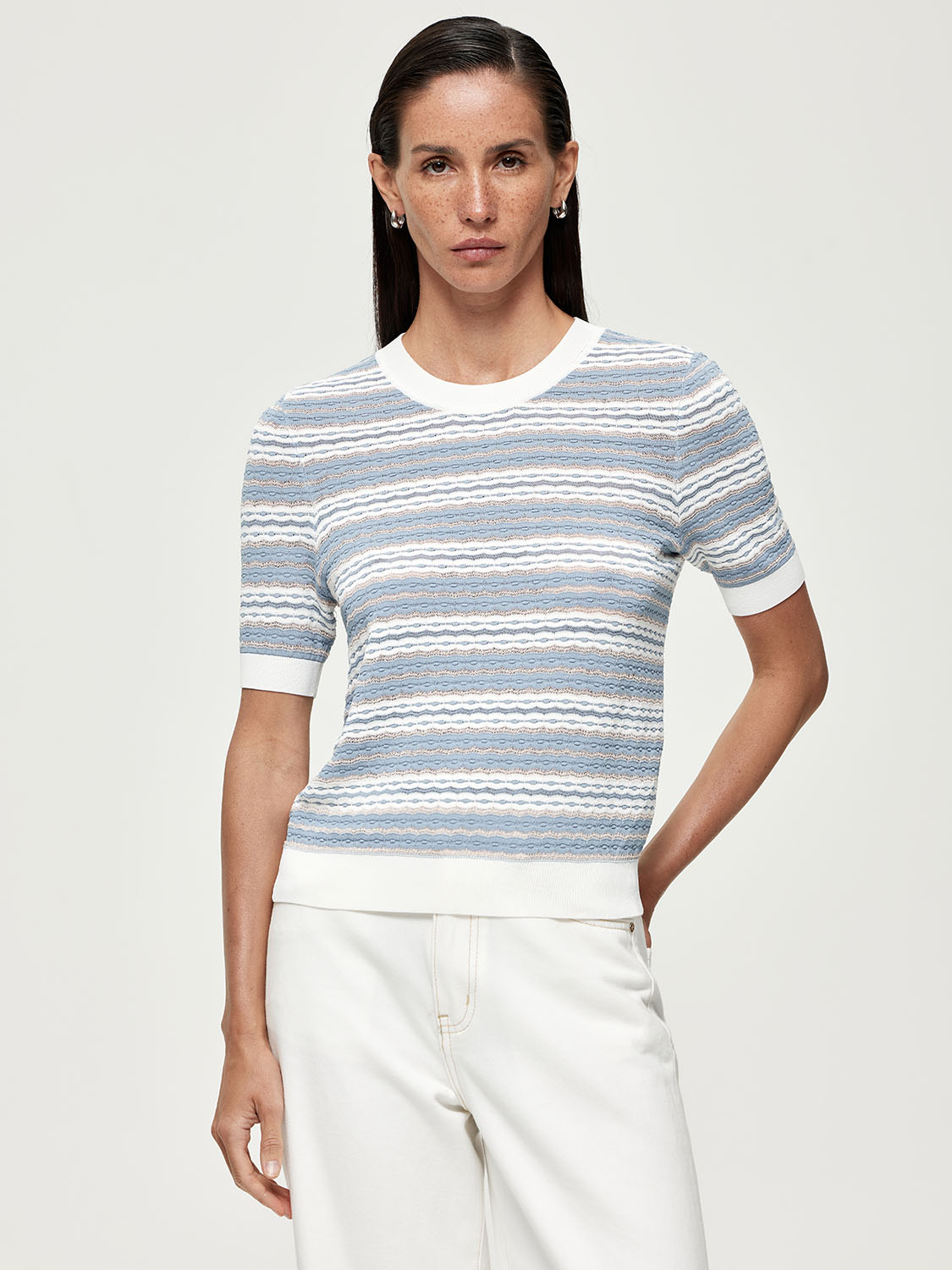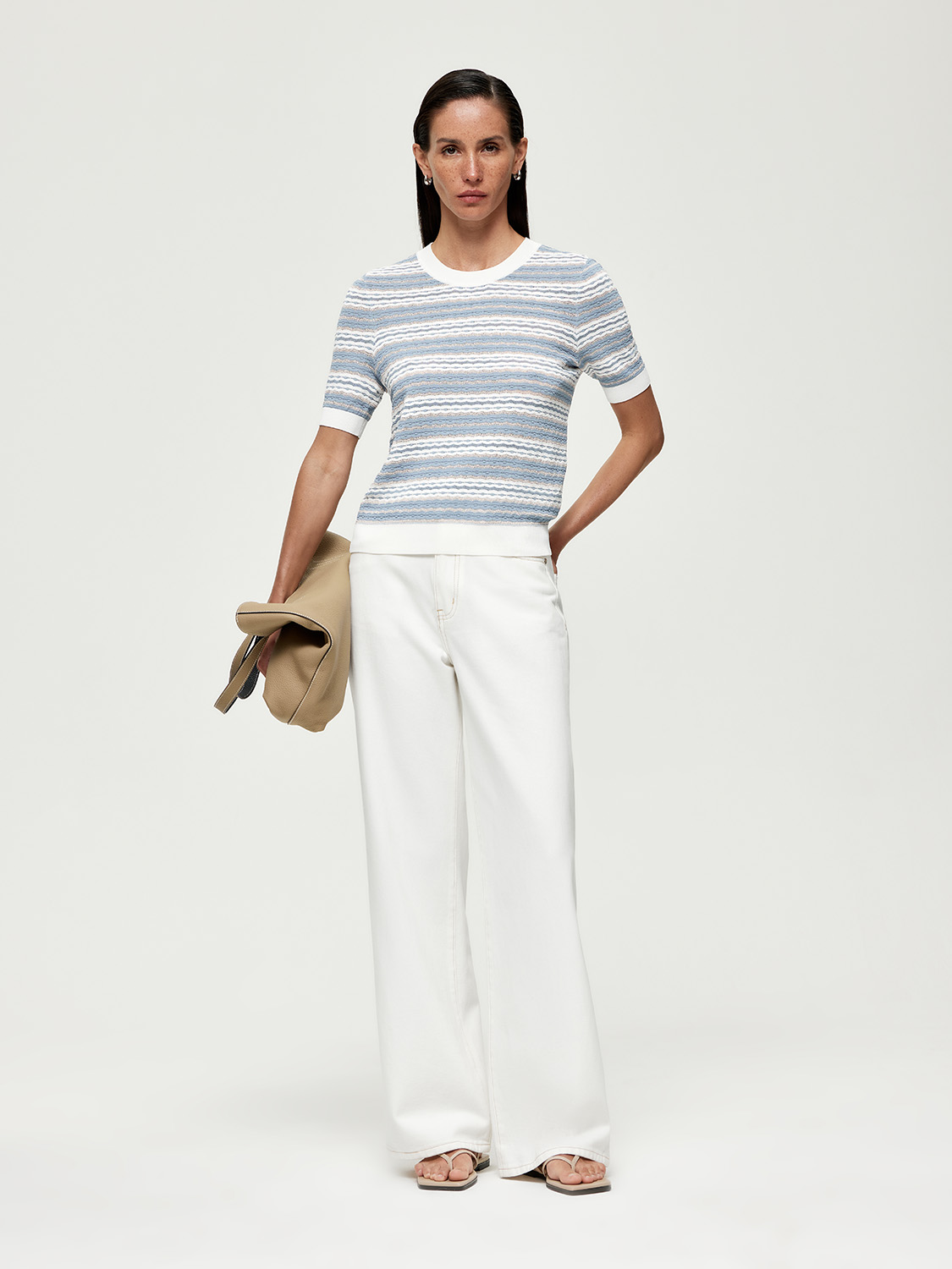 Трикотажный джемпер с коротким рукавом дополнит повседневные образы и станет отличной заменой хлопковой футболке. Связан из мягкой и легкой вискозной пряжи с добавлением люрекса, который добавляет изысканного сияния. Это полотно приятно к телу и хорошо пропускает воздух, поэтому в нем будет комфортно даже в жаркую погоду. Классический круглый вырез. Горловина, рукава и низ выполнены контрастной отделкой в рубчик. Рельефная фактура добавляет шарма. Комбинируйте с брюками, джинсами, юбками и шортами. На модели размер S. Параметры модели: рост 177, 83-61-89.