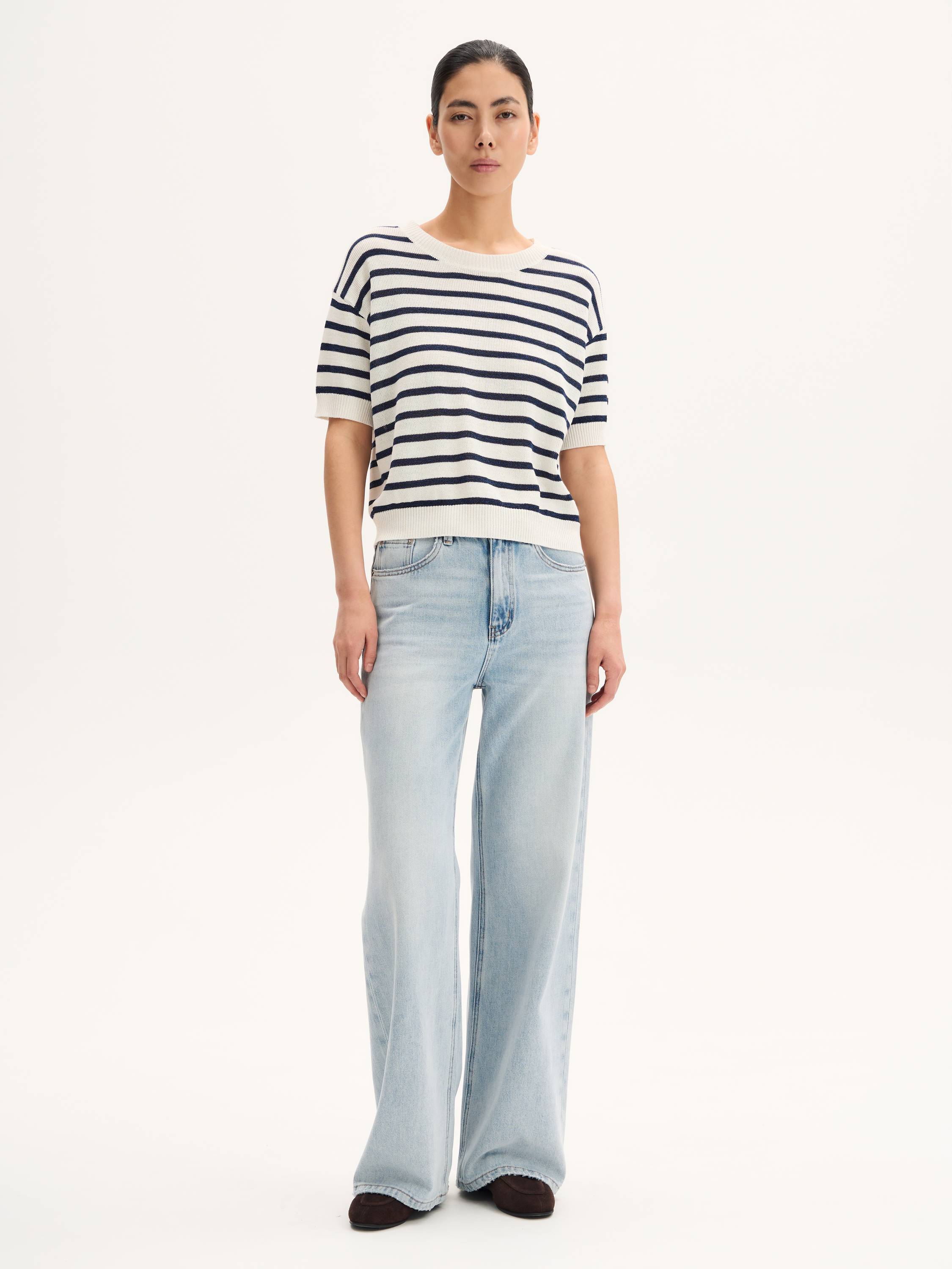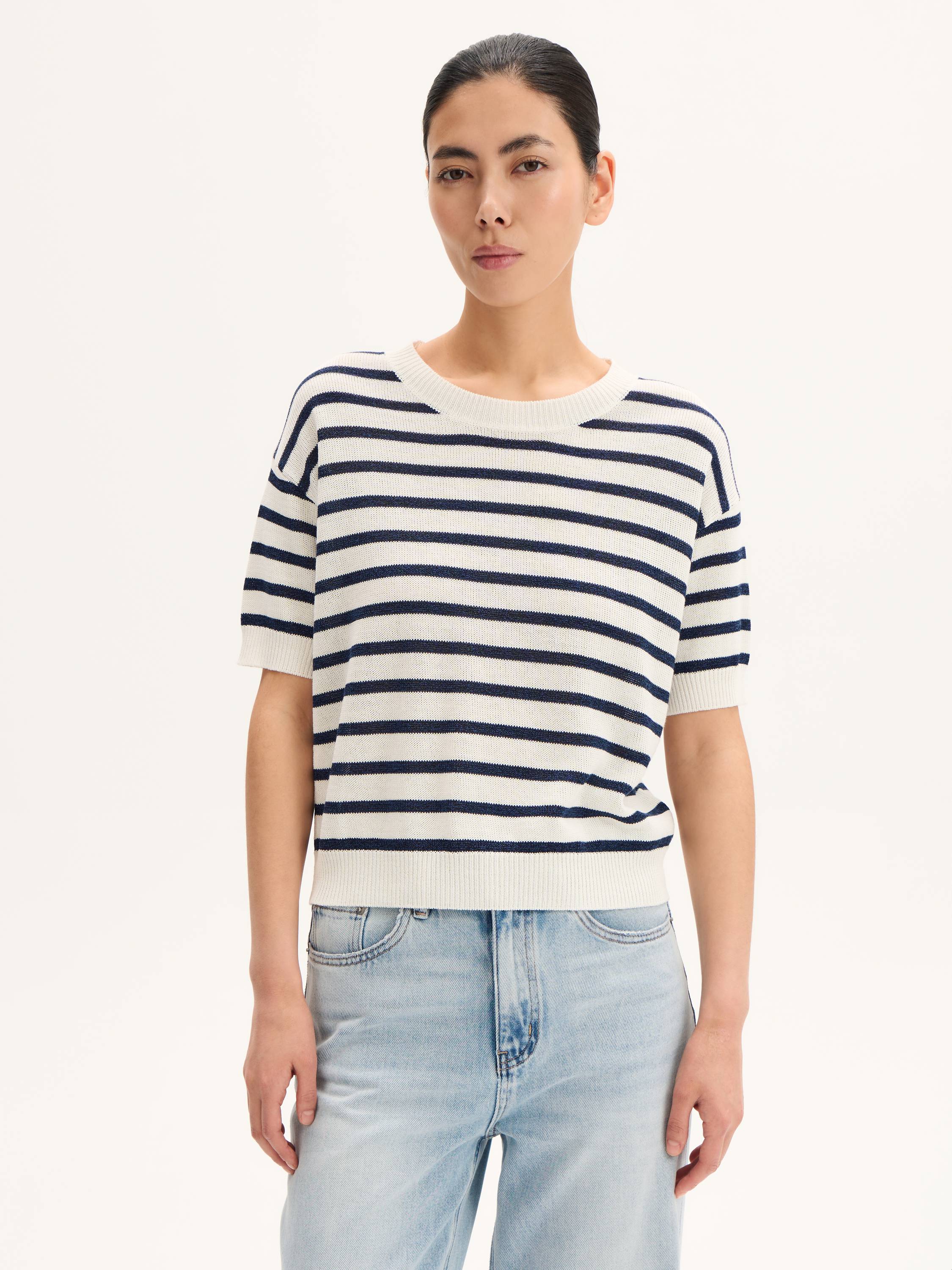 Трикотажный топ с укороченным рукавом и мягким округлым вырезом — универсальный элемент летнего гардероба. Полотно сочетает хлопок и район: оно дышит, приятно ощущается на коже и сохраняет форму в течение дня. Лаконичный крой позволяет носить топ навыпуск или заправленным, а классическиt оттенки делают его идеальным для сочетаний с денимом, льняными брюками и юбками.