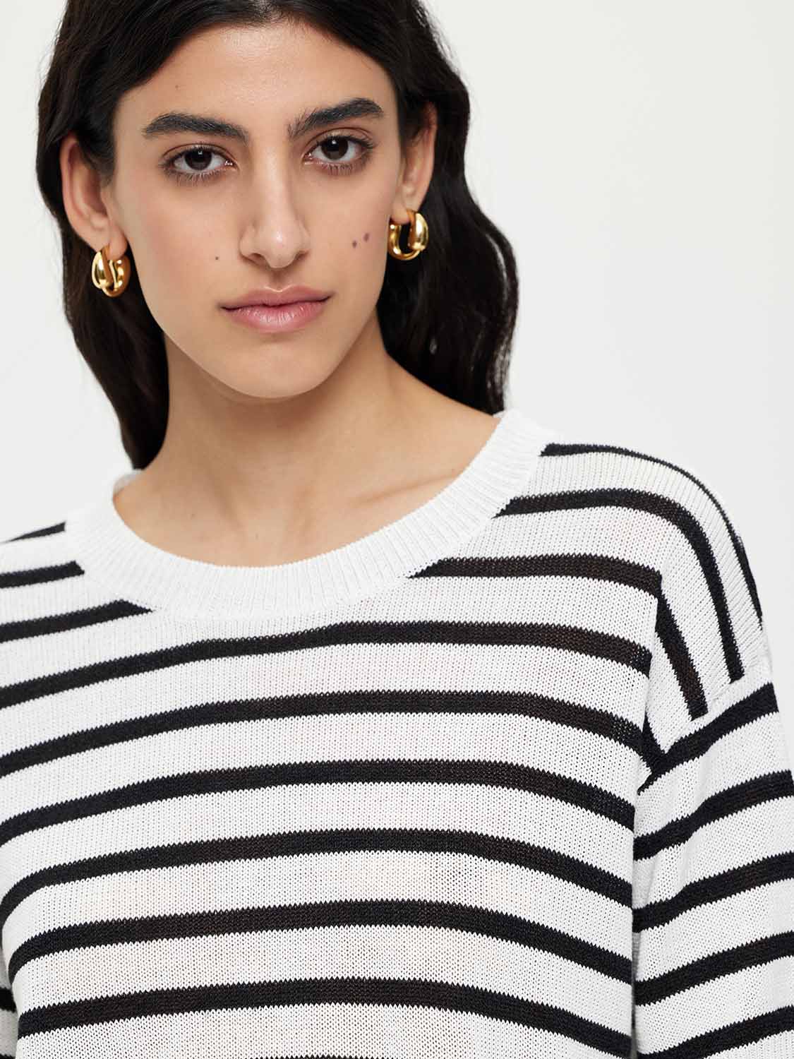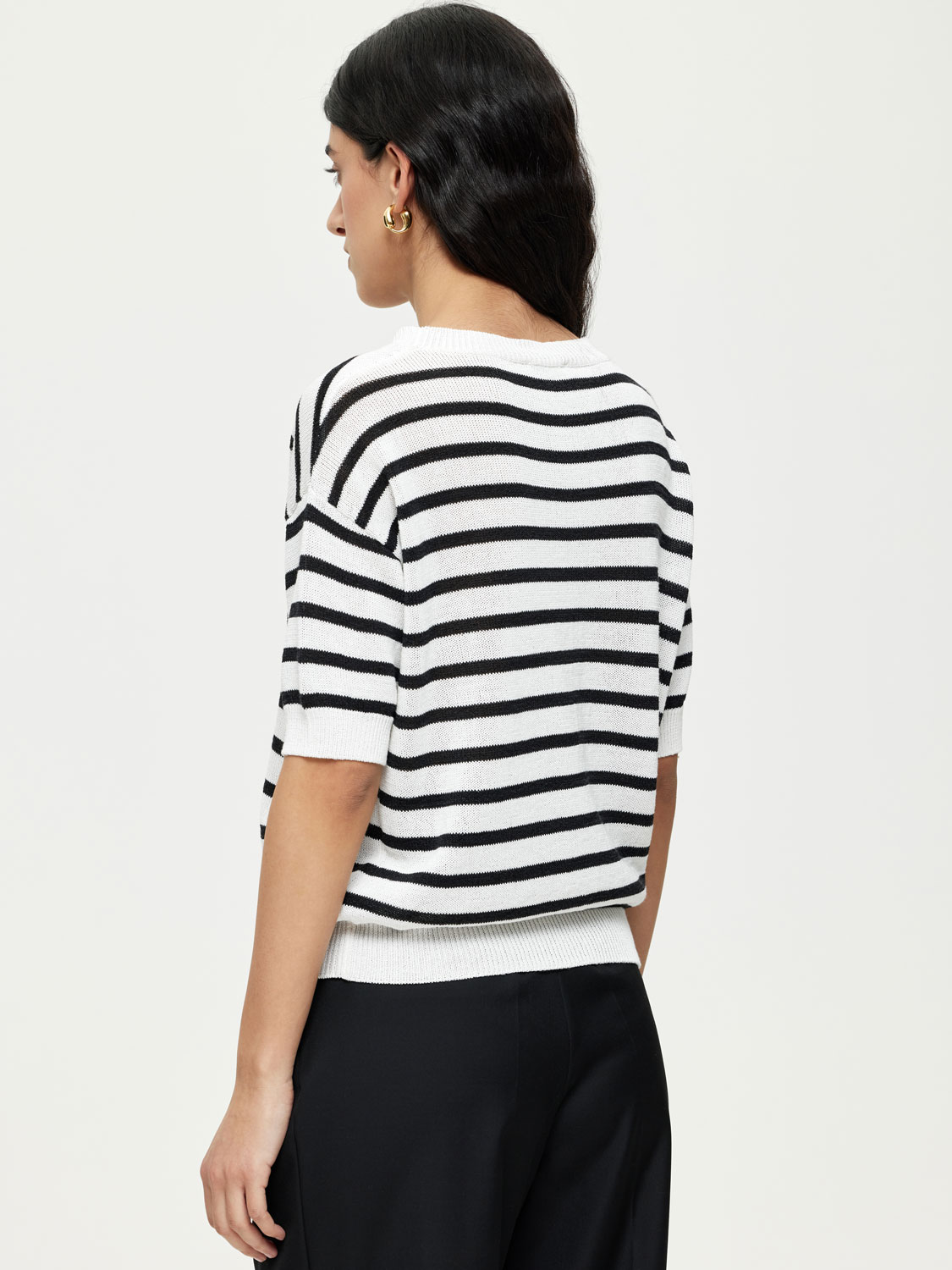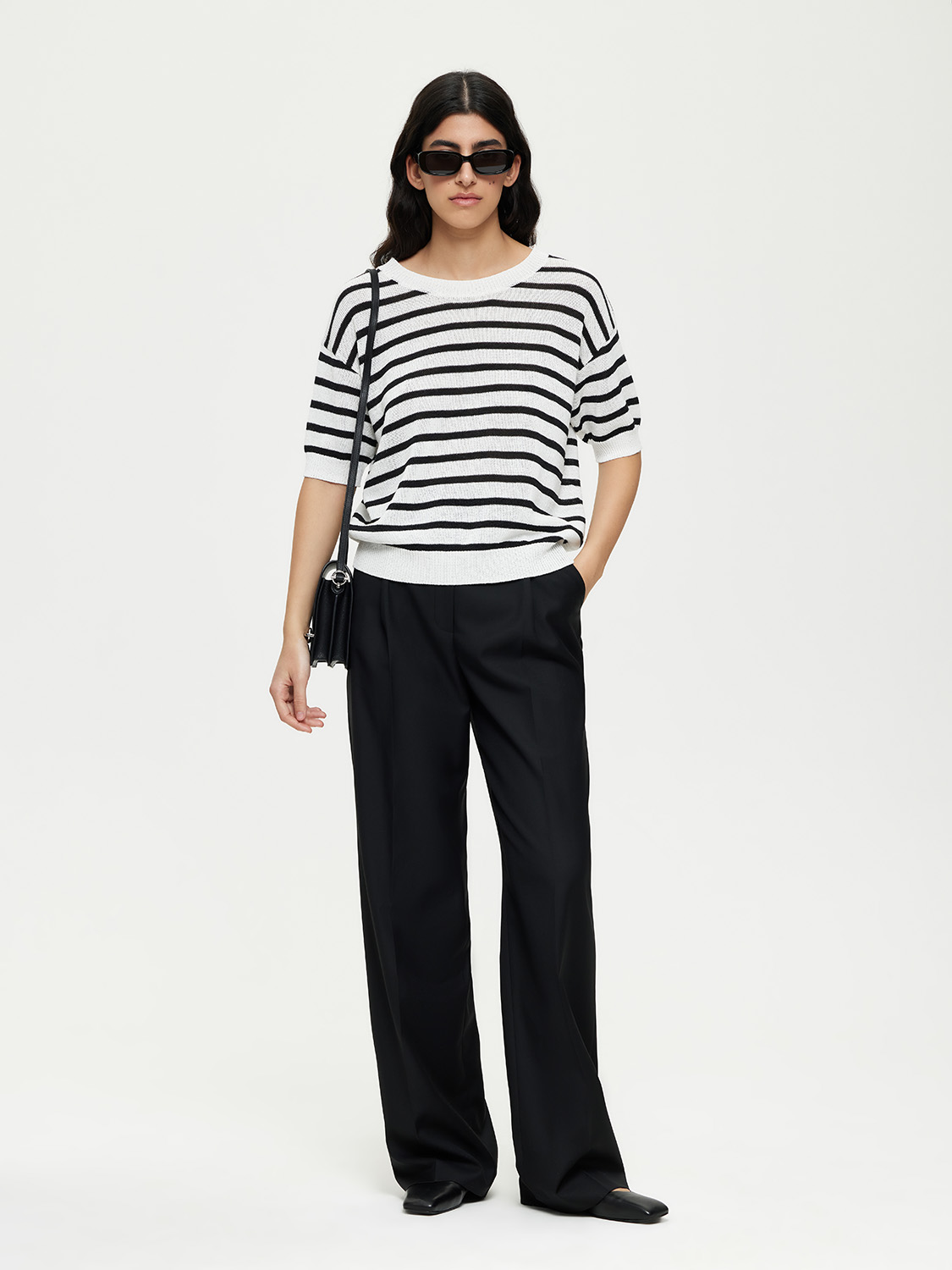 Полоска — вневременной прием, который всегда работает. Трикотажный топ в морском стиле с укороченным рукавом и мягким округлым вырезом — универсальный элемент летнего гардероба. Полотно сочетает хлопок и район: оно дышит, приятно ощущается на коже и сохраняет форму в течение дня. Лаконичный крой позволяет носить топ навыпуск или заправленным, а классический мотив делает его идеальным для сочетаний с денимом, льняными брюками и юбками.