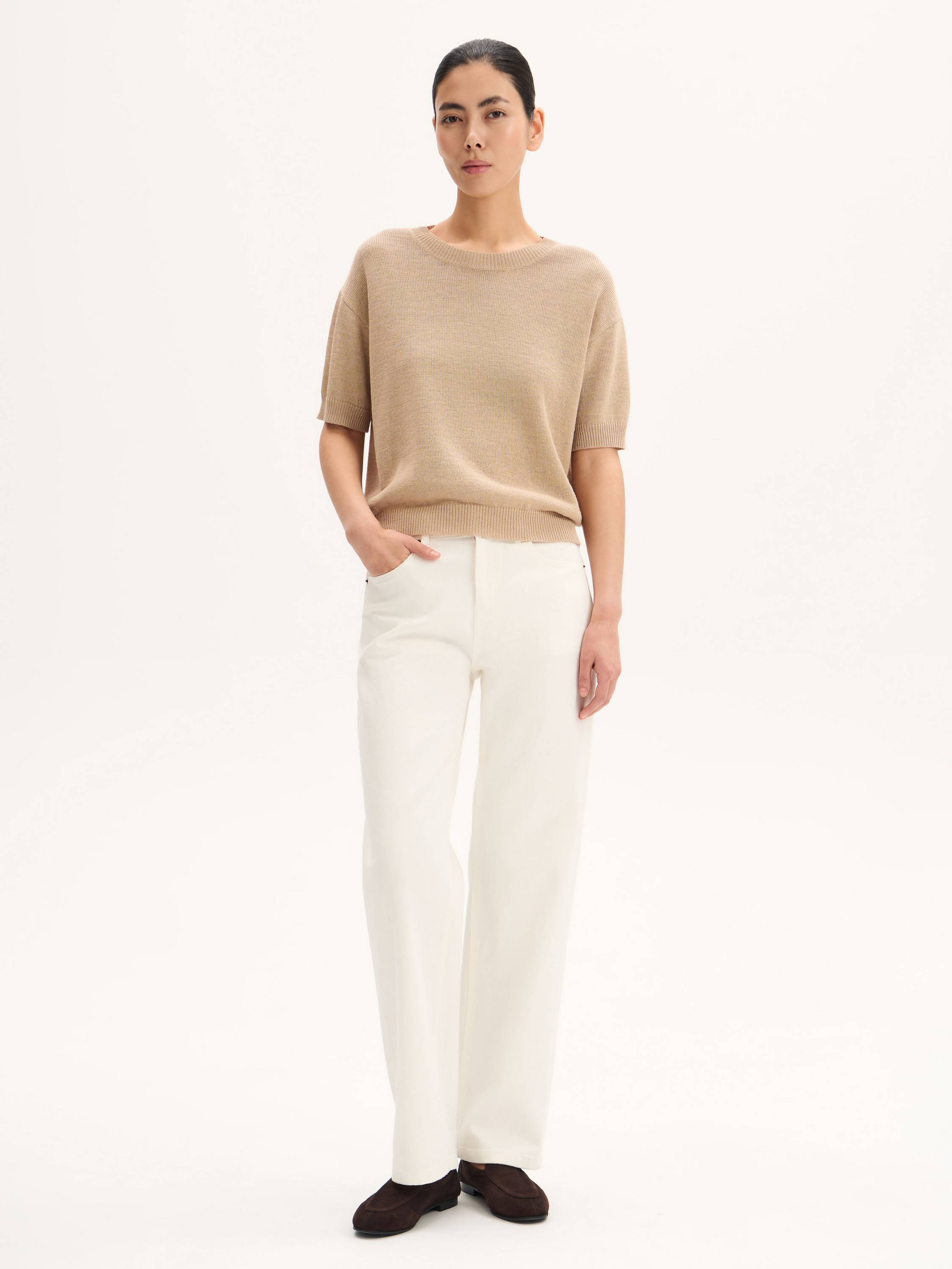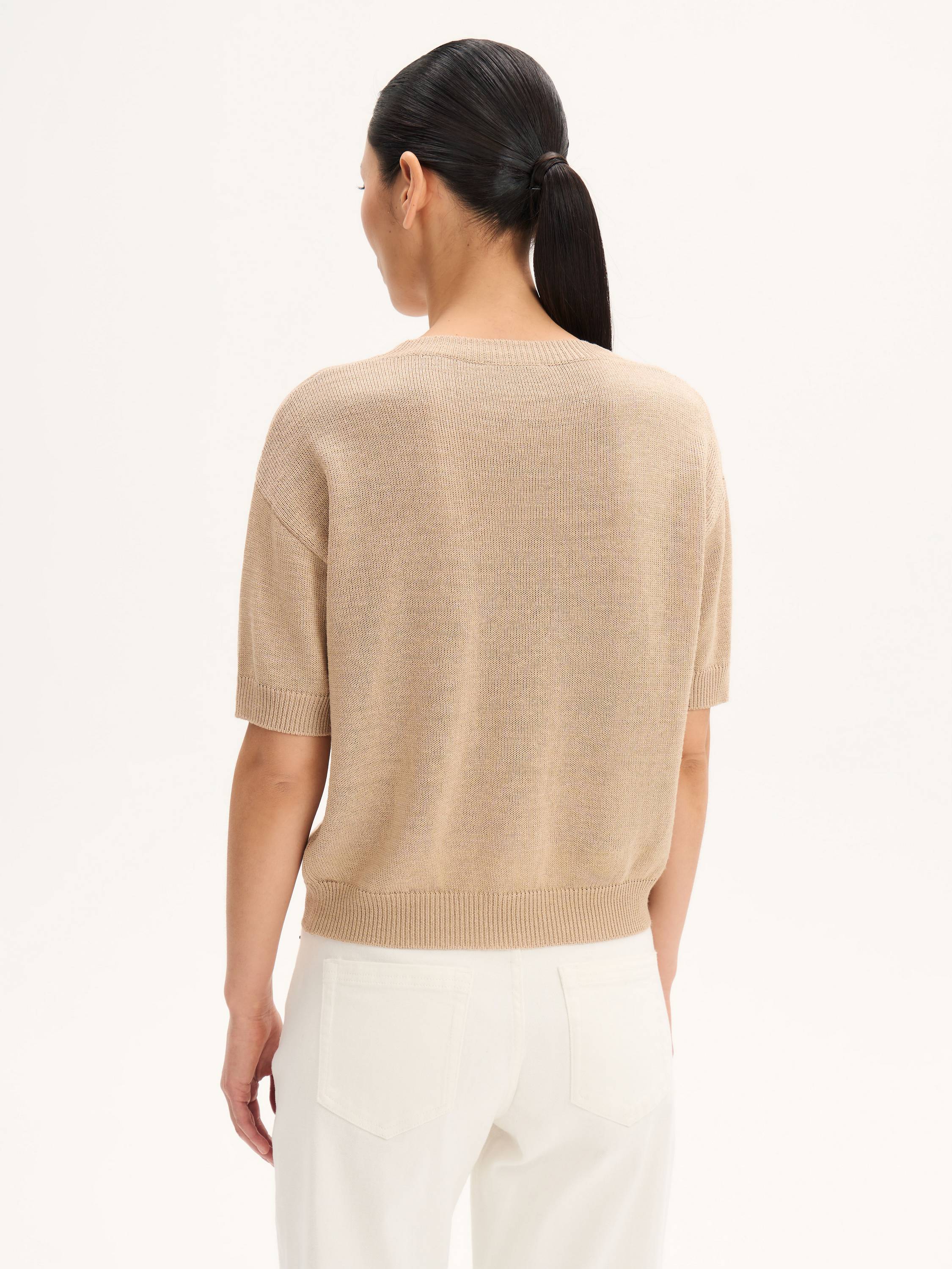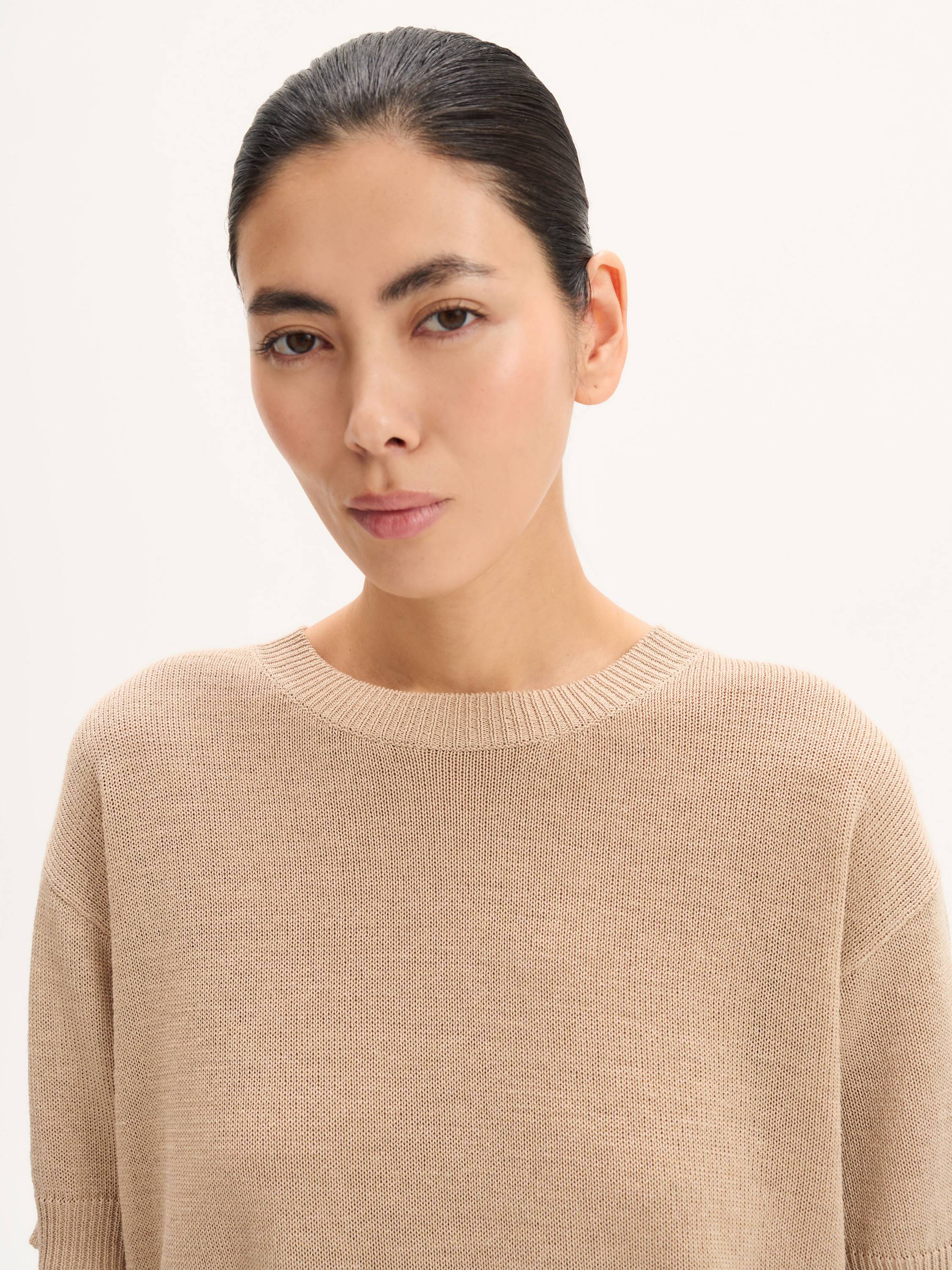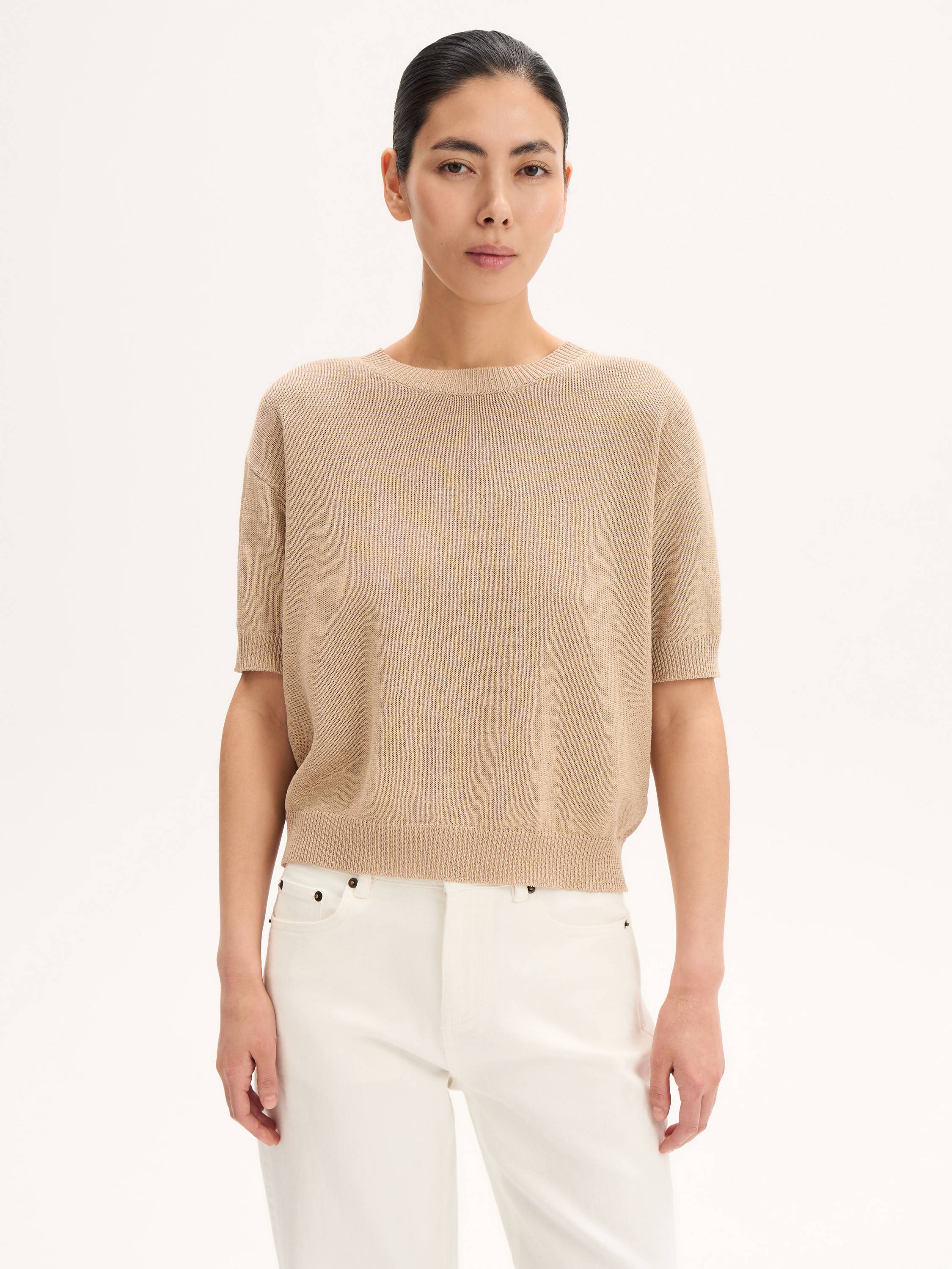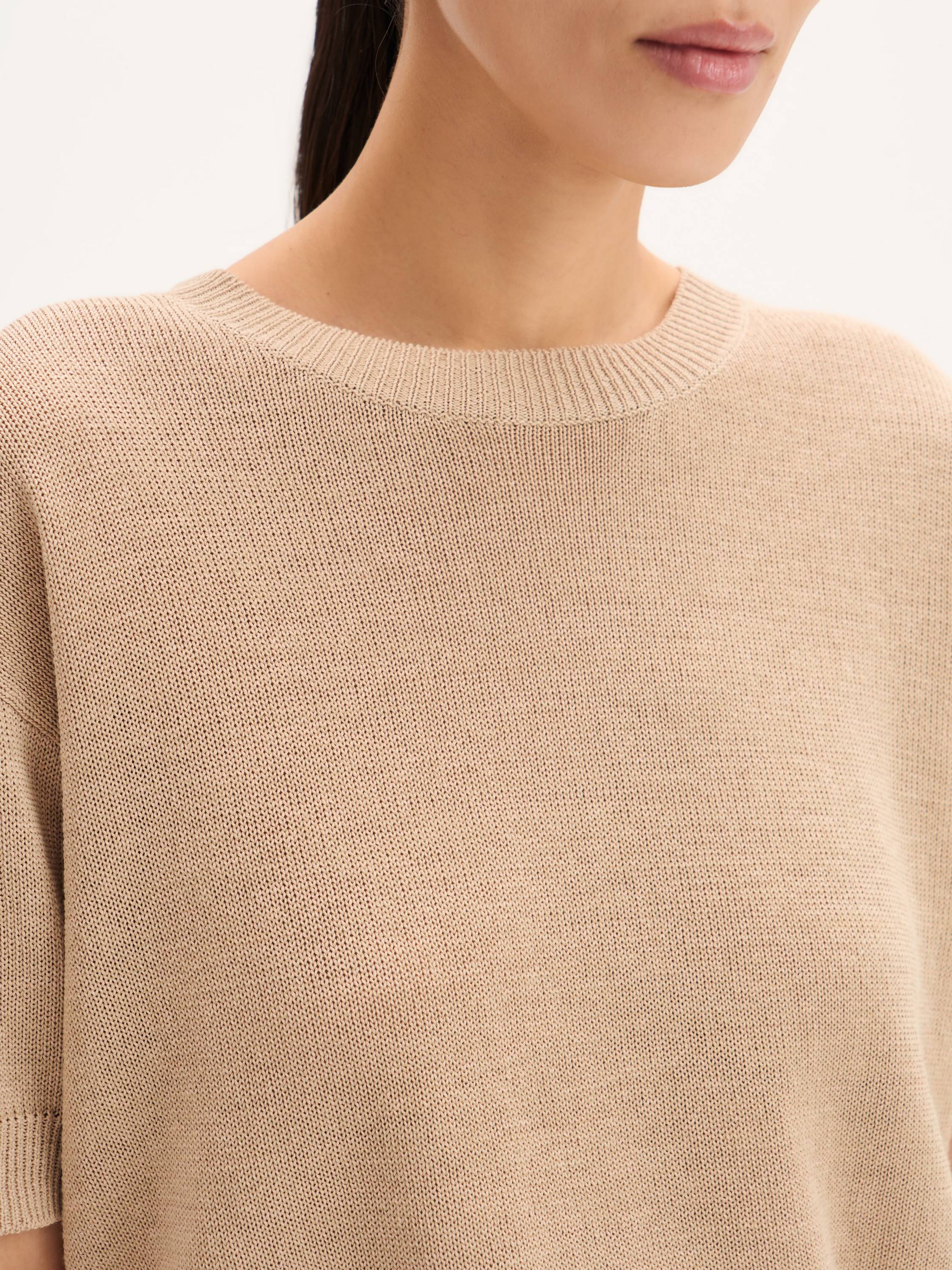 Полоска — вневременной прием, который всегда работает. Трикотажный топ в морском стиле с укороченным рукавом и мягким округлым вырезом — универсальный элемент летнего гардероба. Полотно сочетает хлопок и район: оно дышит, приятно ощущается на коже и сохраняет форму в течение дня. Лаконичный крой позволяет носить топ навыпуск или заправленным, а классический мотив делает его идеальным для сочетаний с денимом, льняными брюками и юбками.