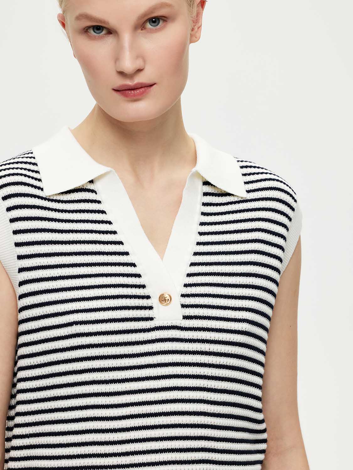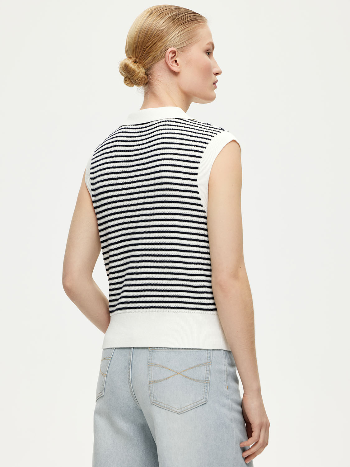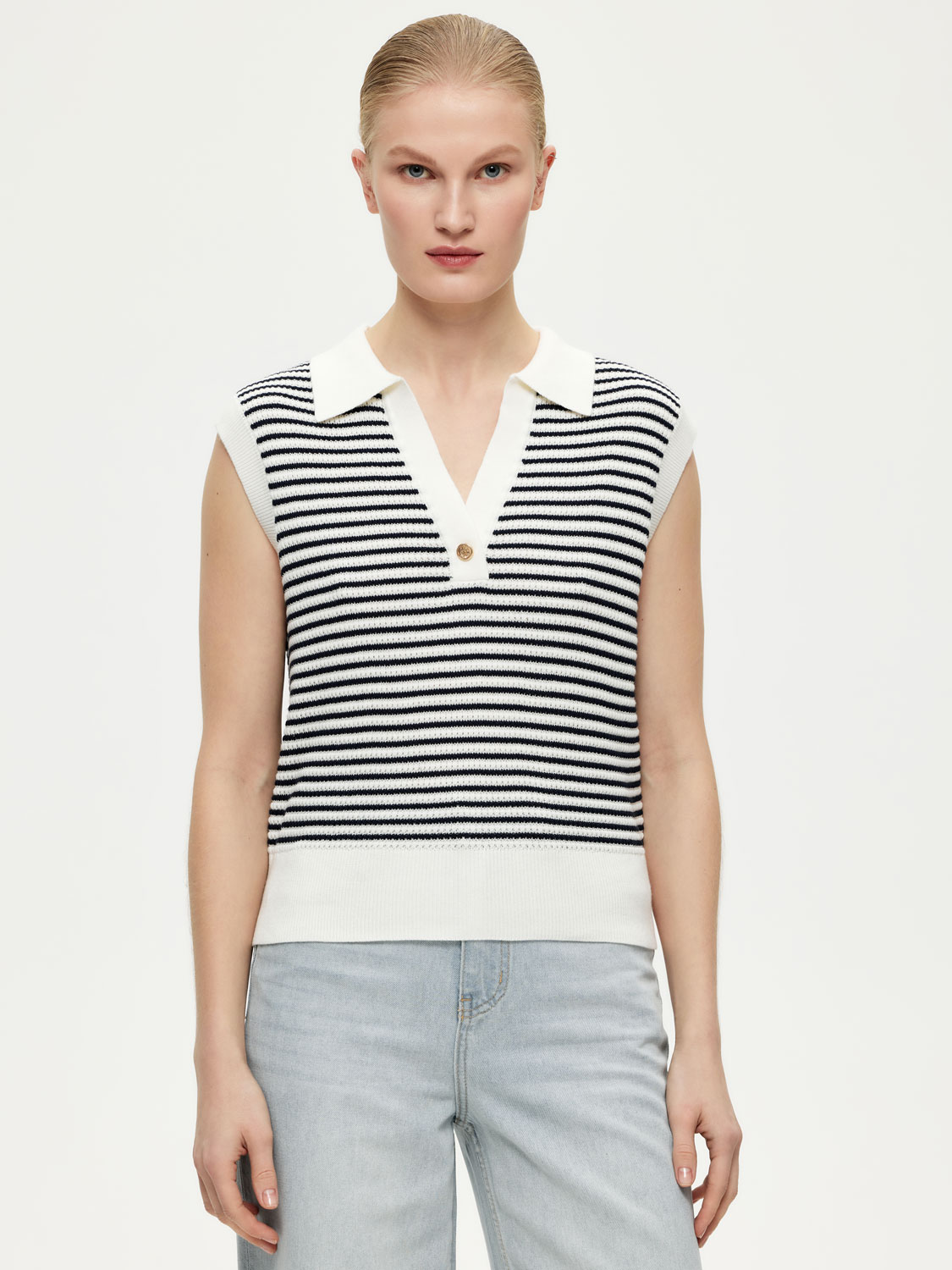 Базовый трикотажный топ без рукавов с воротом поло. Дизайнеры бренда сделали обновленную и трендовую версию воротника, где заменили привычную планку с пуговицами на V-образный вырез. Глубину выреза регулирует металлическая кнопка. Широкая резинка по низу. Топ выполнен из мягкого хлопка с добавлением волокон акрила, что обеспечивает хорошую посадку по фигуре и не вызывает неприятных ощущений на коже. Полоска добавляет свежести и легкости. Комбинируйте с широкими брюками и джинсами. На модели размер S. Параметры модели: рост 175, 80-63-89.
