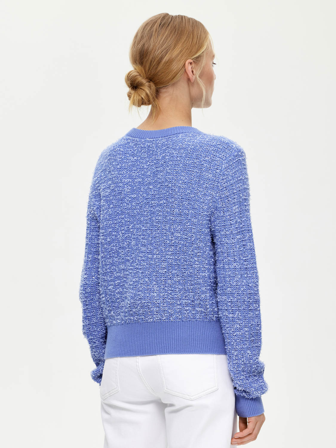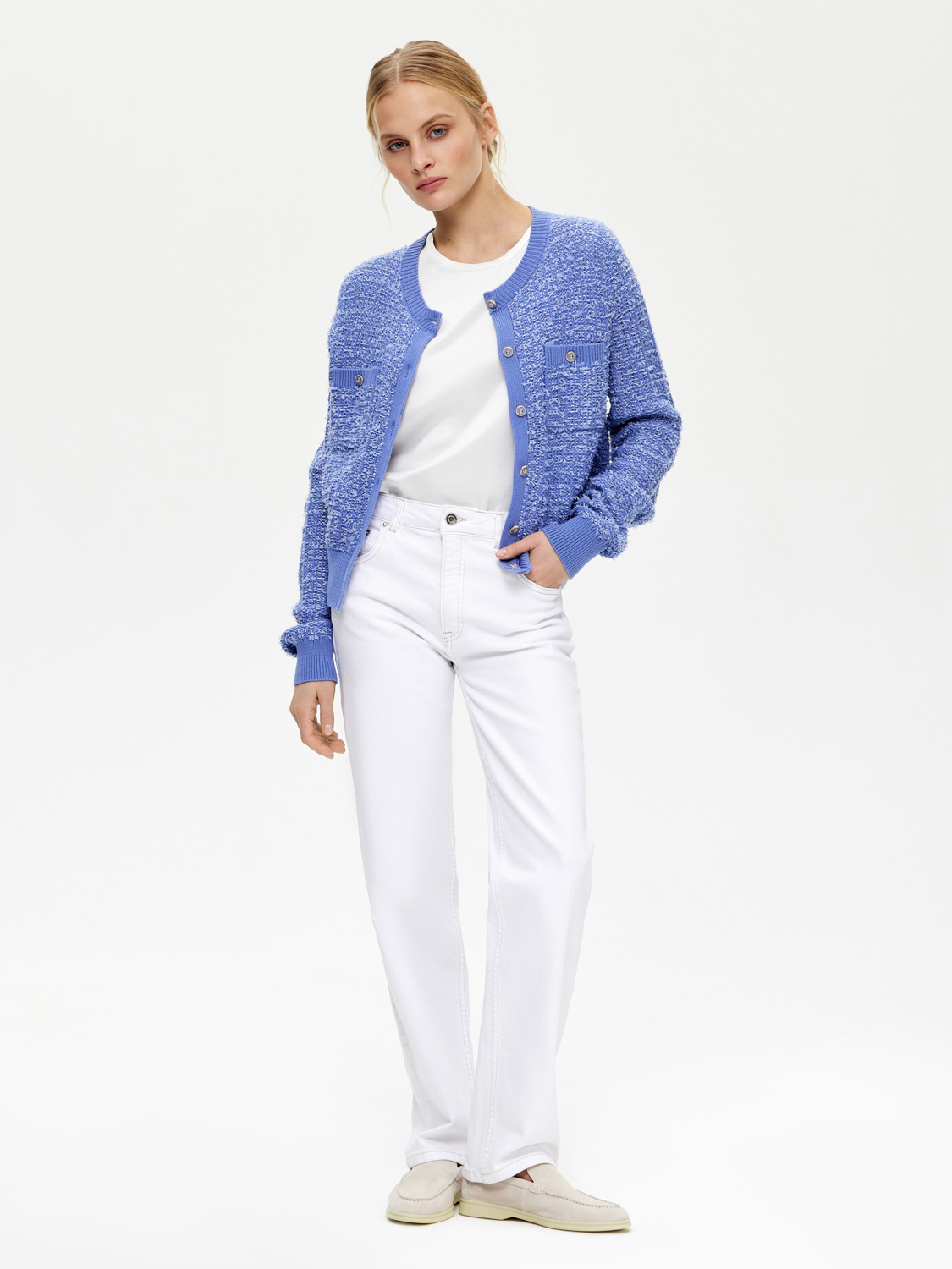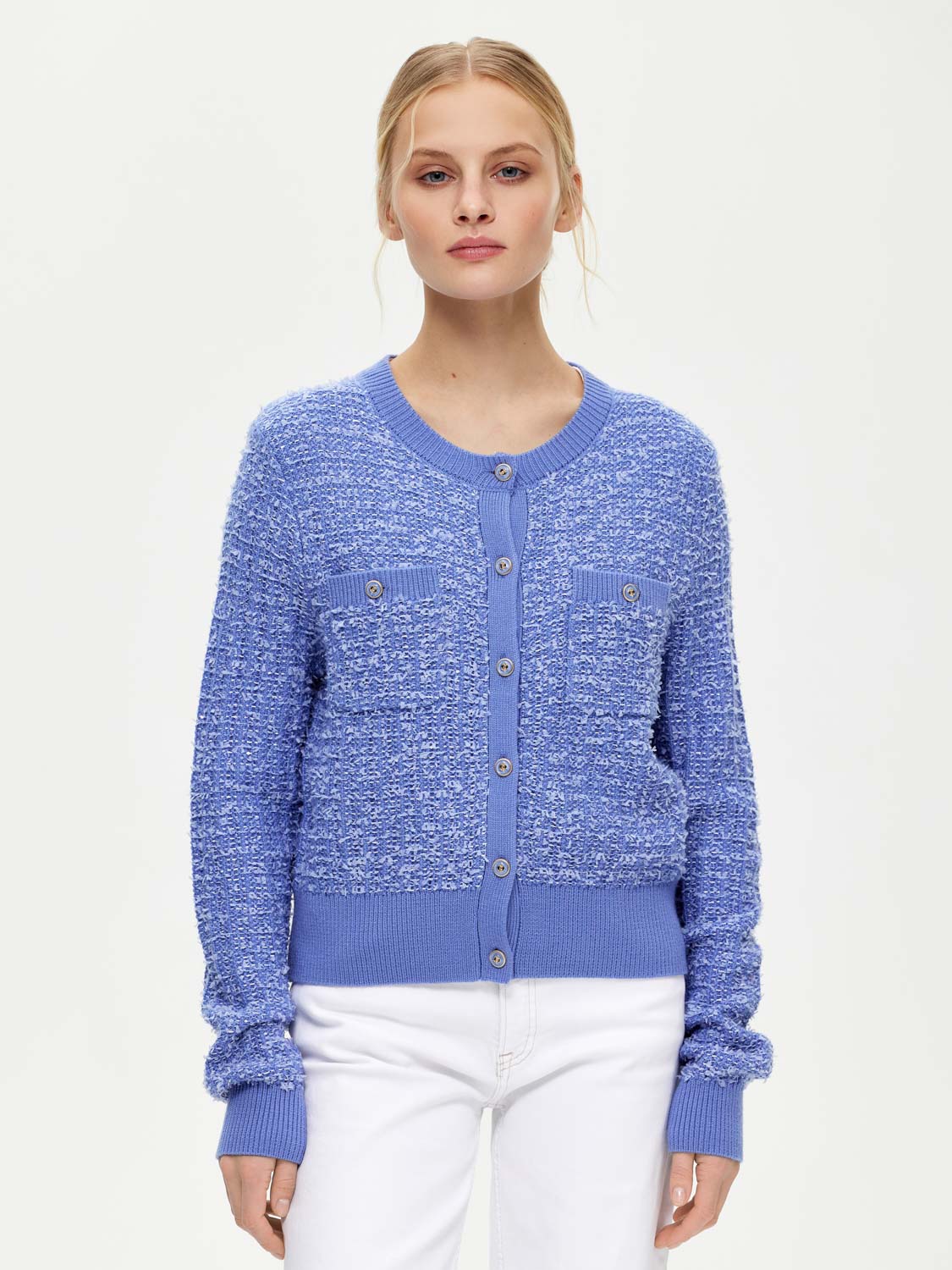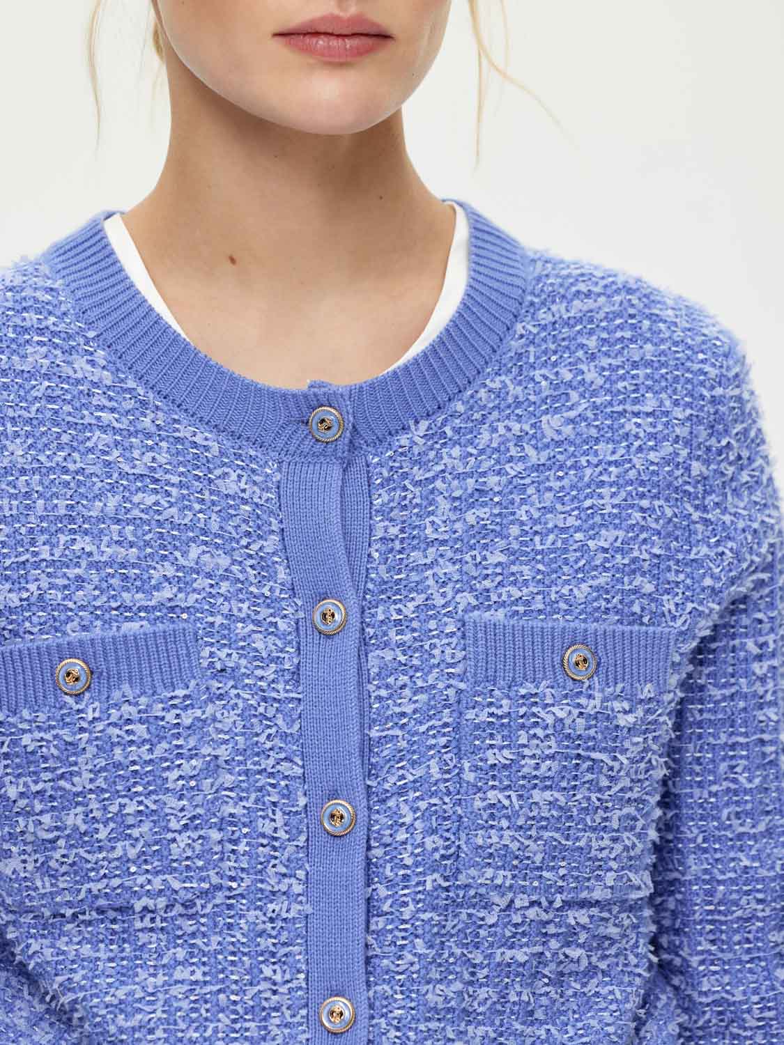 Фактурный кардиган с шерстью мериноса, выполненный в стиле короткого жакета Шанель, но более мягкий и уютный. Классический округлый вырез, акцентные золотистые пуговицы и накладные карманы. Широкие эластичные резинки, украшающие край и манжеты, подчеркивают фигуру и добавляют комфорта. Носите кардиган на голое тело или с топами и блузами под низ. Хорошо сочетается с юбками, брюками и джинсами. Будет выглядеть уместно на работе и отдыхе. На модели размер S. Параметры модели: рост 172, 81-58-87.