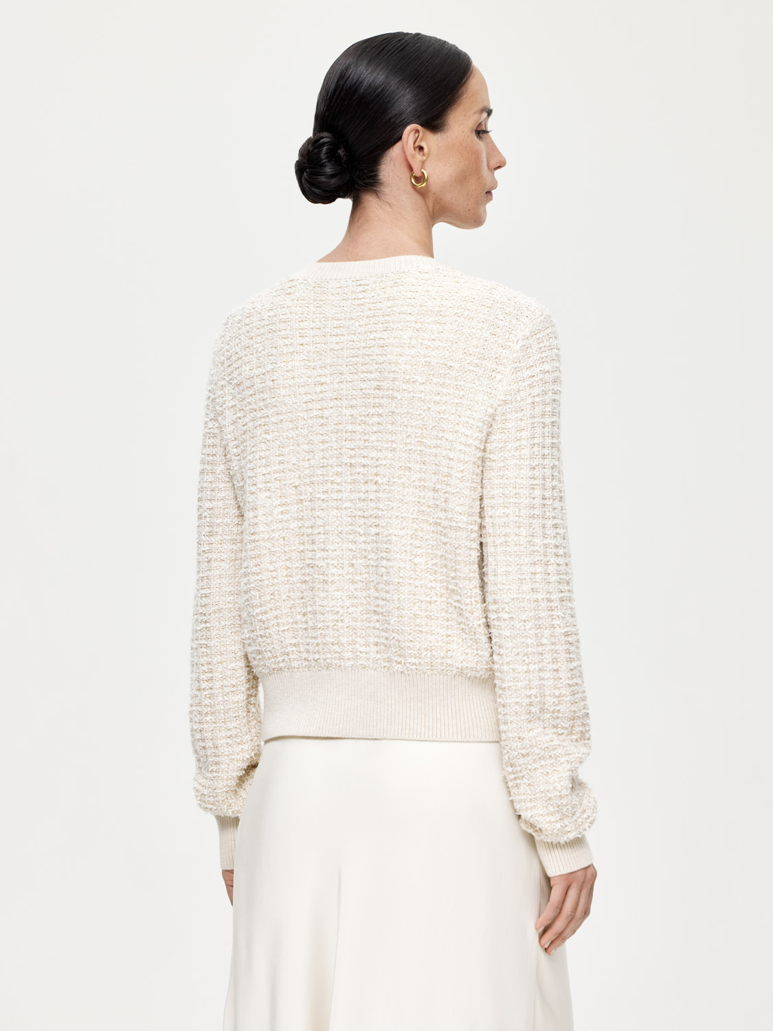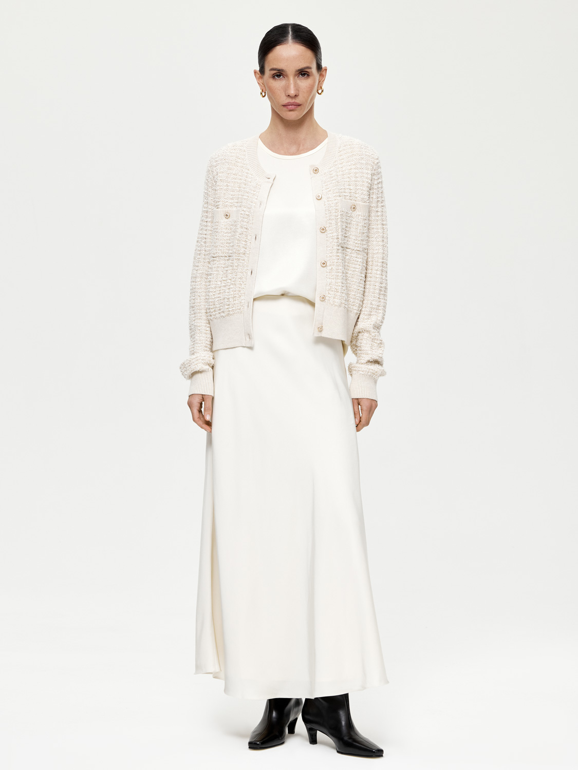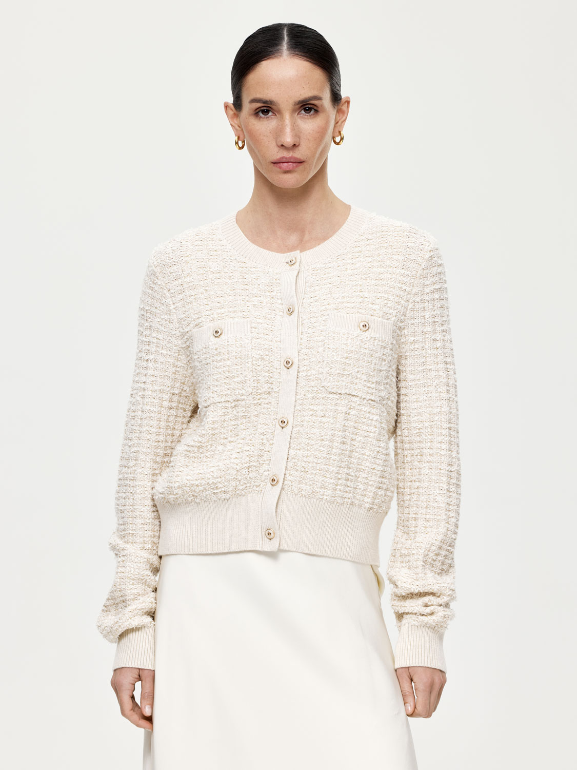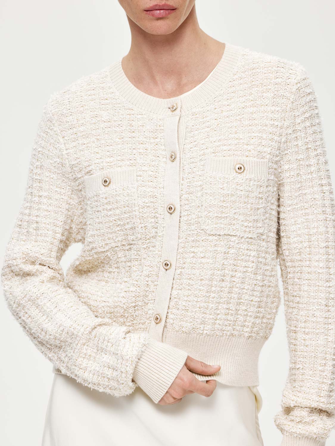 Фактурный кардиган с шерстью мериноса, выполненный в стиле короткого жакета Шанель, но более мягкий и уютный. Классический округлый вырез, акцентные золотистые пуговицы и накладные карманы. Широкие эластичные резинки, украшающие край и манжеты, подчеркивают фигуру и добавляют комфорта. Носите кардиган на голое тело или с топами и блузами под низ. Хорошо сочетается с юбками, брюками и джинсами. Будет выглядеть уместно на работе и отдыхе. На модели размер S. Параметры модели: рост 172, 81-58-87.