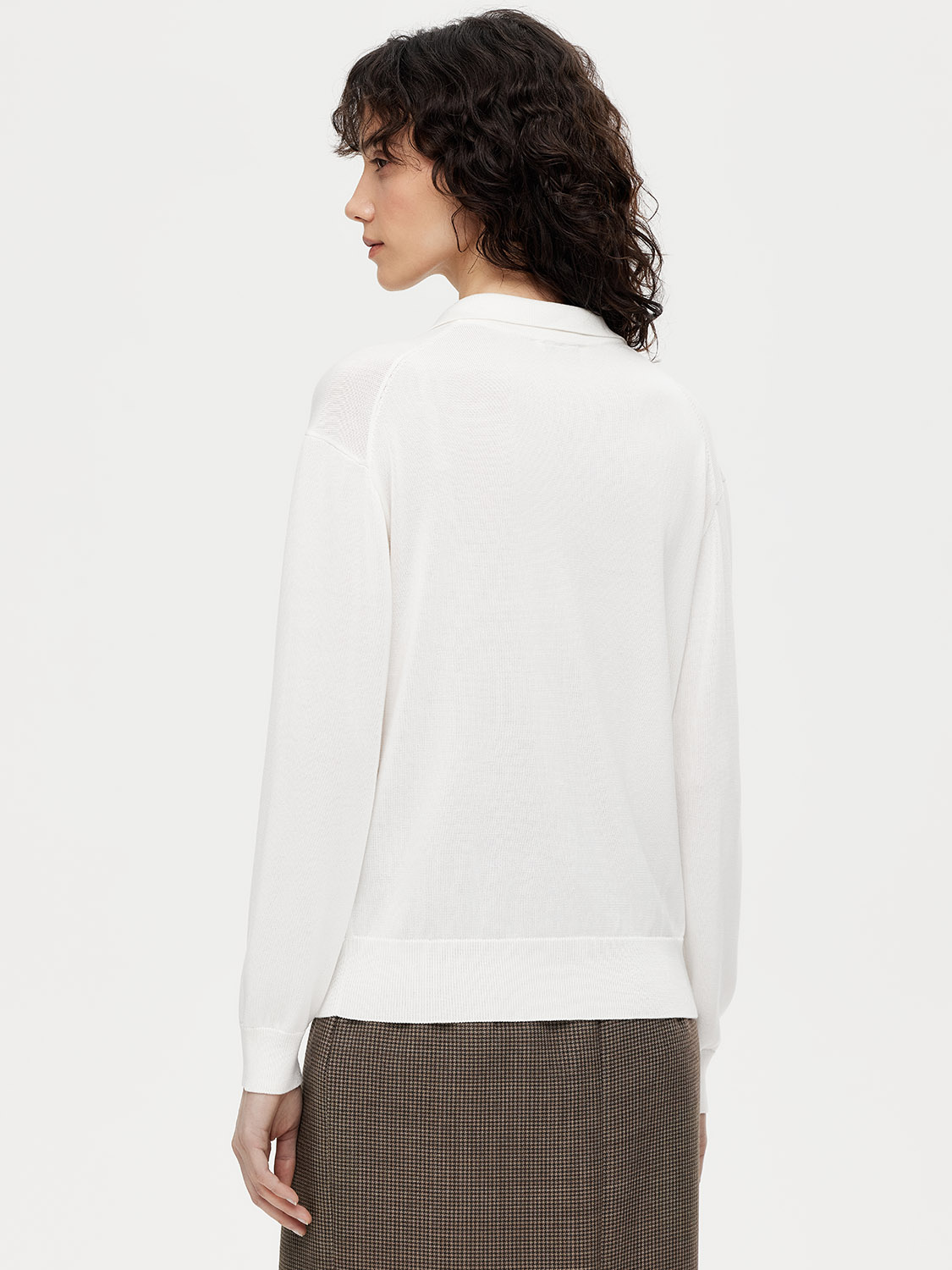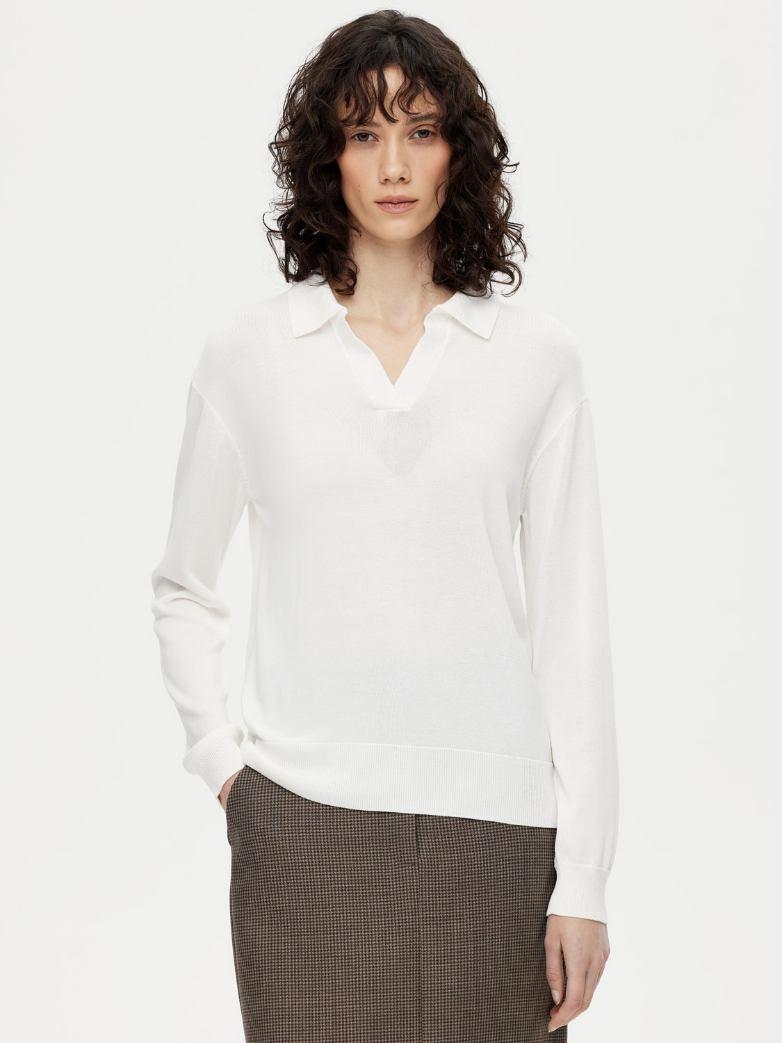Дизайнеры бренда сделали обновленную и трендовую версию джемпера-поло, где заменили привычную планку с пуговицами на V-образный вырез. Получился классический джемпер с длинными рукавами в современном прочтении. Модель свободного кроя со спущенной линией плеча выполнена из 100% лиоцелла. Это полотно хорошо пропускает воздух, что позволяет с комфортом носить джемпер на голое тело. На рукавах и крае широкие резинки. На модели размер S. Параметры модели: рост 177, 83-61-89.