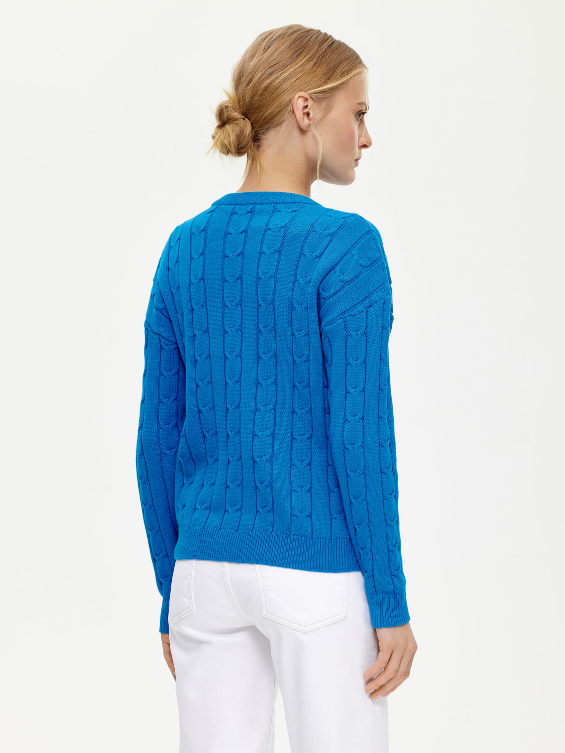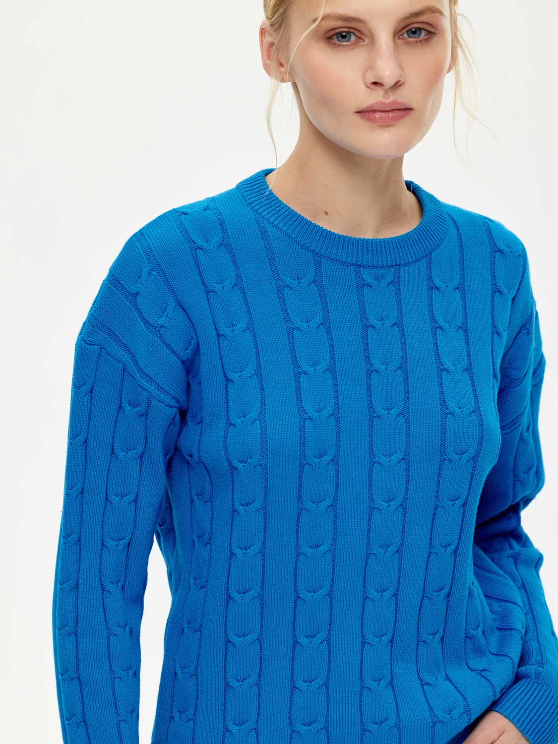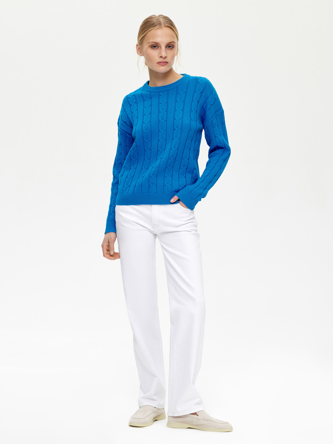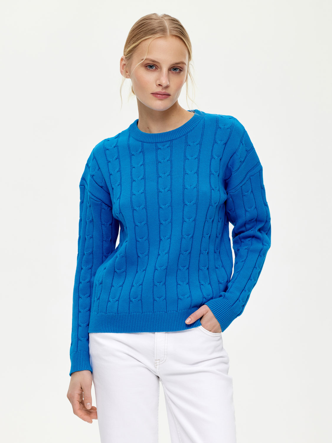 Классический базовый джемпер, выполненный из мягкого хлопка. Округлый вырез, манжеты и край в рубчик. Опущенная линия плеча. Фактурный плетеный узор добавляет благородства и изящества. На таком фоне джинсы смотрятся сложнее и богаче, а костюмные юбки – не так строго. Делайте джемпер акцентом вашего образа или составляйте многослойные варианты, дополняя жакетом. На модели ризмер S. Параметры модели: рост 177, 83-61-89.
