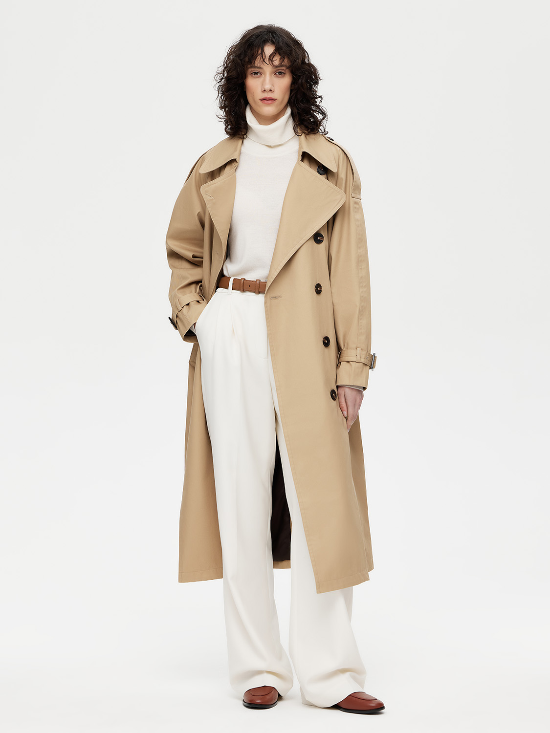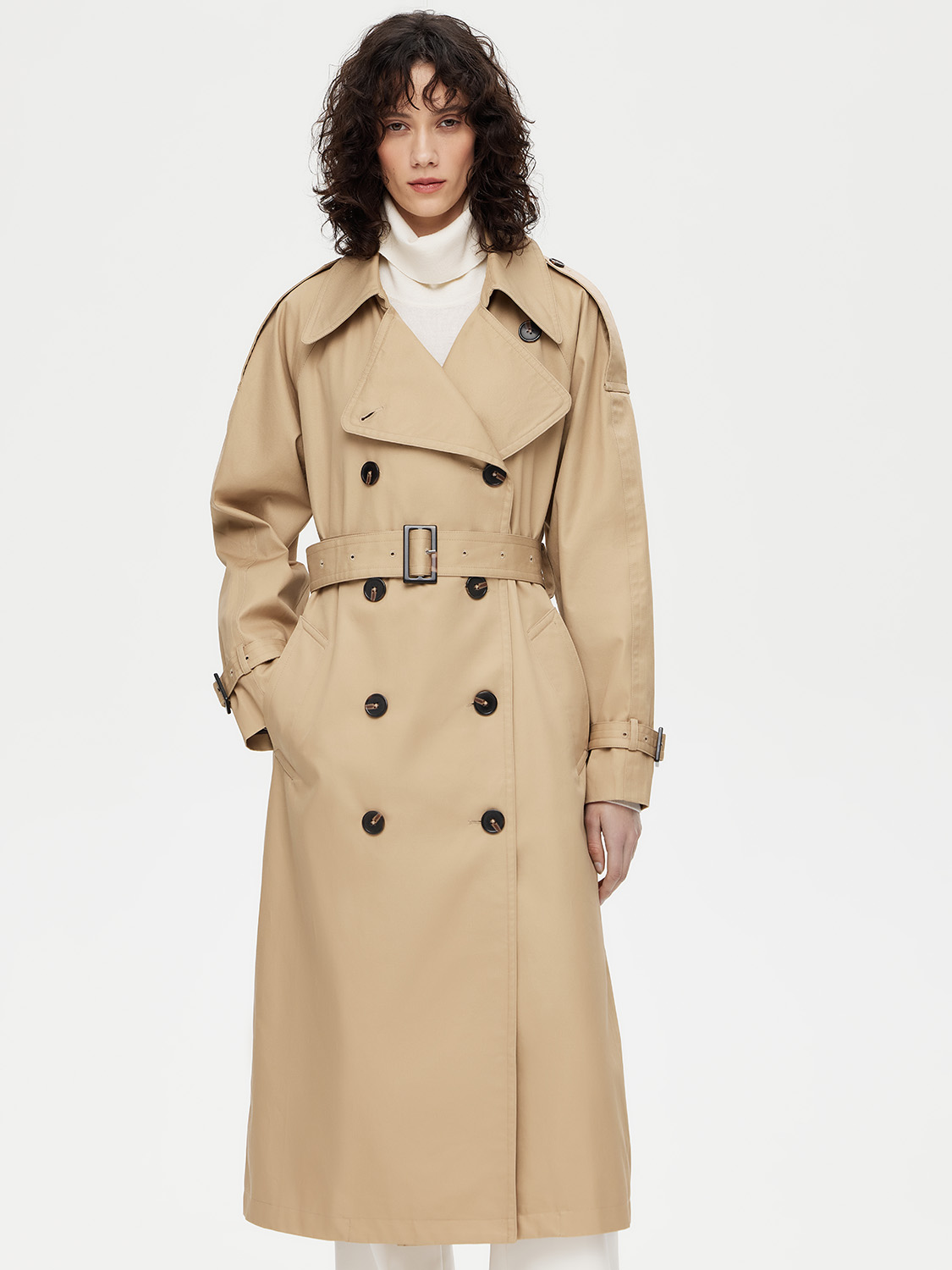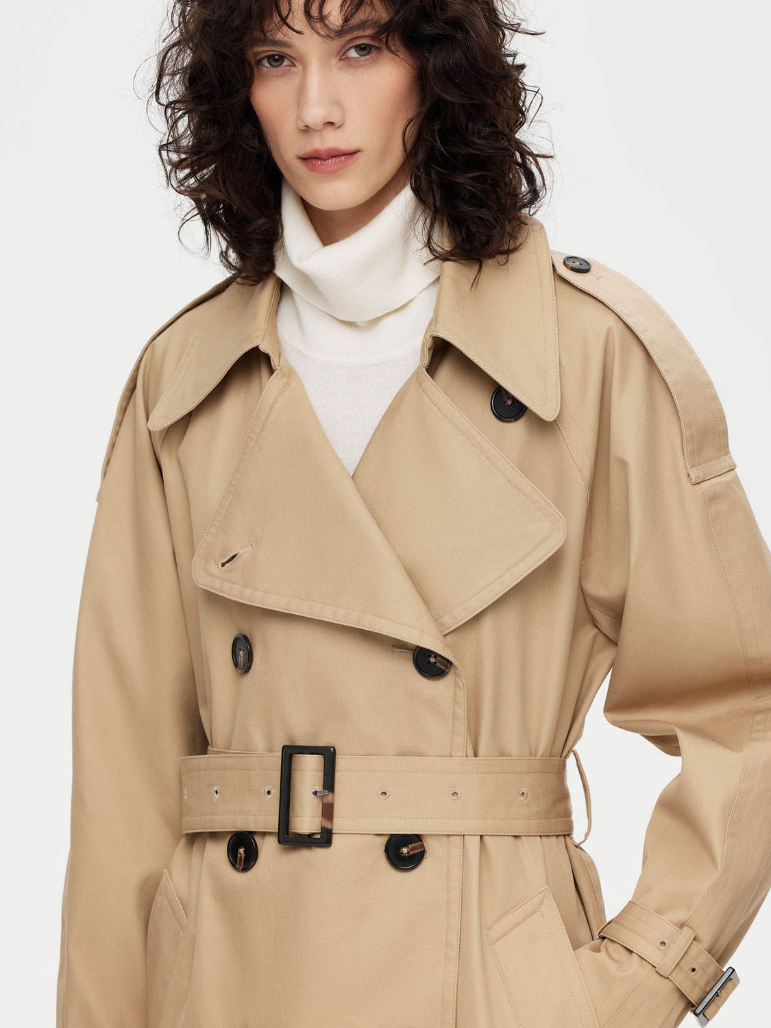 Классический двубортный тренч длиной миди – настоящая инвестиция в гардероб. Выполнен из 100% плотного хлопка. Свободный крой дарит комфорт, а съемный пояс с пряжкой моделирует изящный силуэт и акцентирует внимание на талии. Контрастные пуговицы, паты на рукавах и погоны на плечах – неизменные детали, добавляющие благородный шик. Широкий отложной воротник можно поднять и застегнуть в холодную погоду. Лаконичная база, которая сочетается с платьями, костюмами и джинсами. Нейтральные цвета не ограничивает в выборе дополнительных оттенков. На модели размер S. Параметры модели: рост 177, 72-57-87.