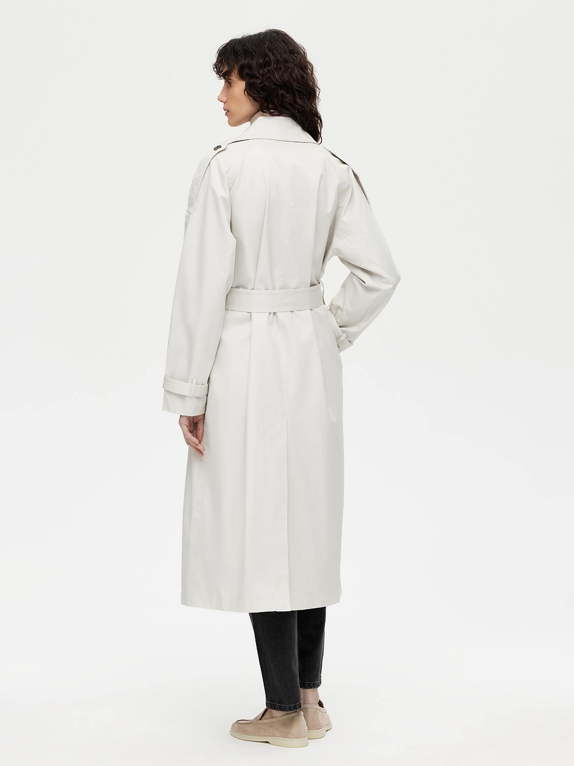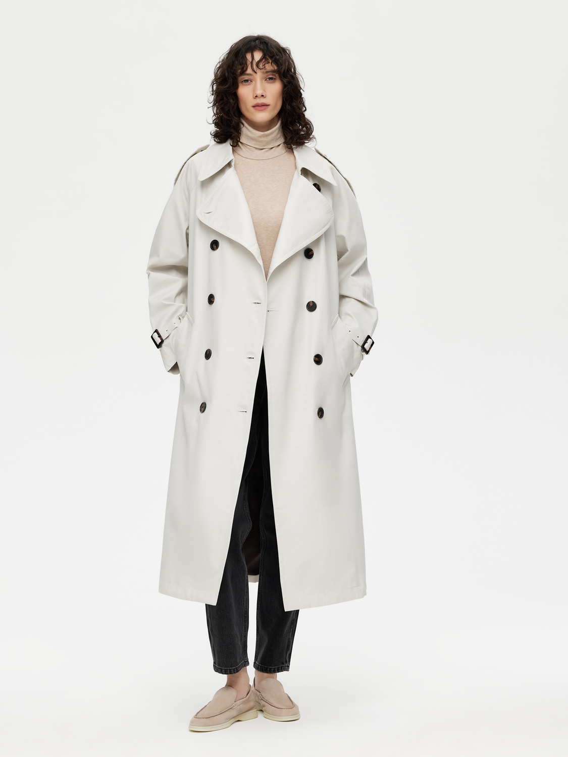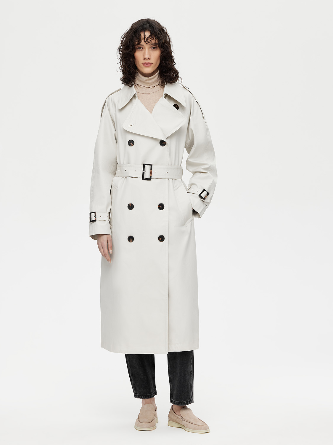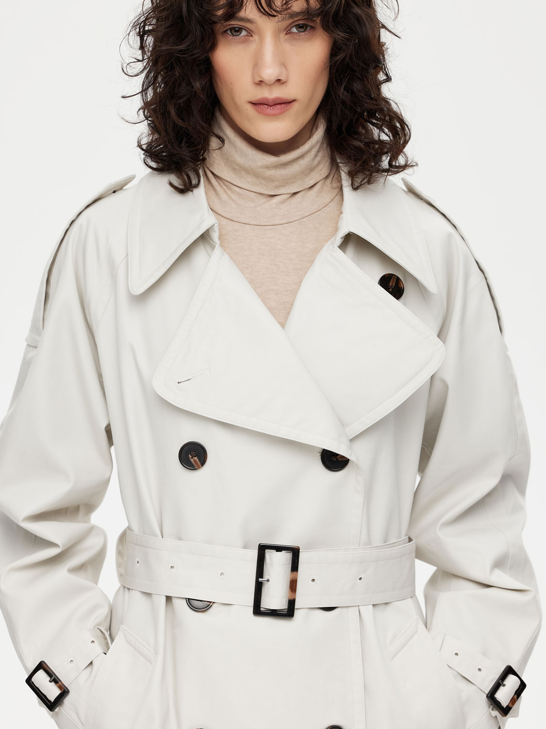 Классический двубортный тренч длиной миди – настоящая инвестиция в гардероб. Выполнен из 100% плотного хлопка. Свободный крой дарит комфорт, а съемный пояс с пряжкой моделирует изящный силуэт и акцентирует внимание на талии. Контрастные пуговицы, паты на рукавах и погоны на плечах – неизменные детали, добавляющие благородный шик. Широкий отложной воротник можно поднять и застегнуть в холодную погоду. Лаконичная база, которая сочетается с платьями, костюмами и джинсами. Нейтральные цвета не ограничивает в выборе дополнительных оттенков. На модели размер S. Параметры модели: рост 177, 72-57-87.