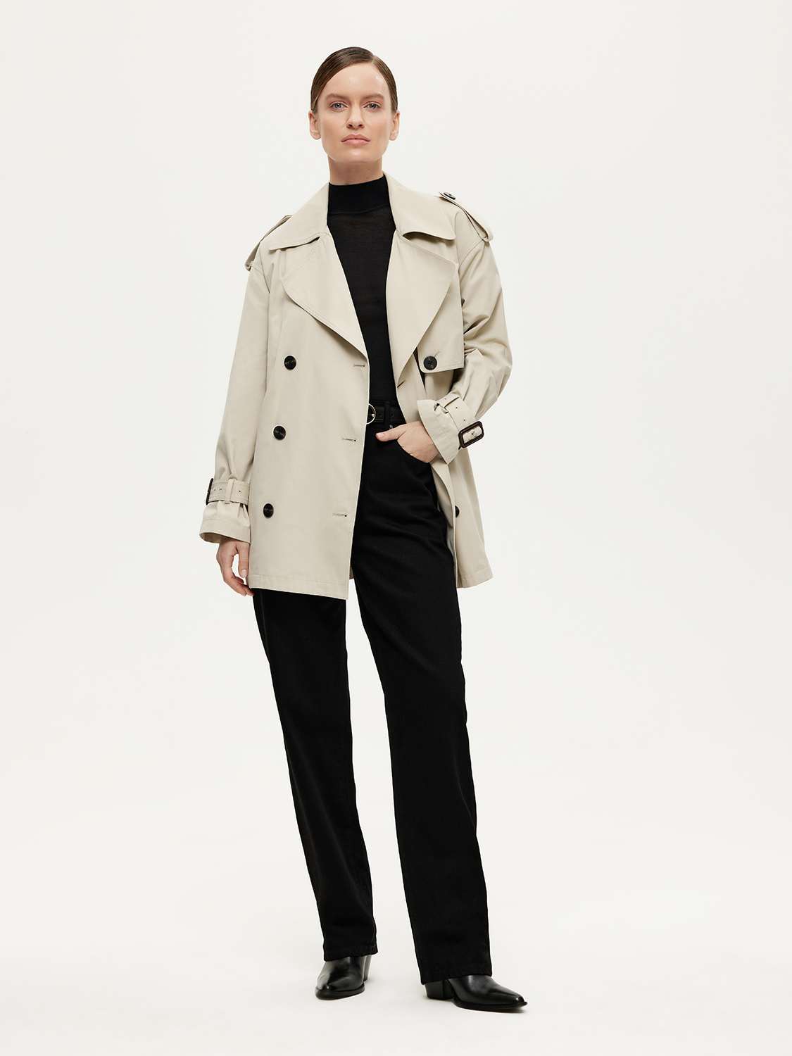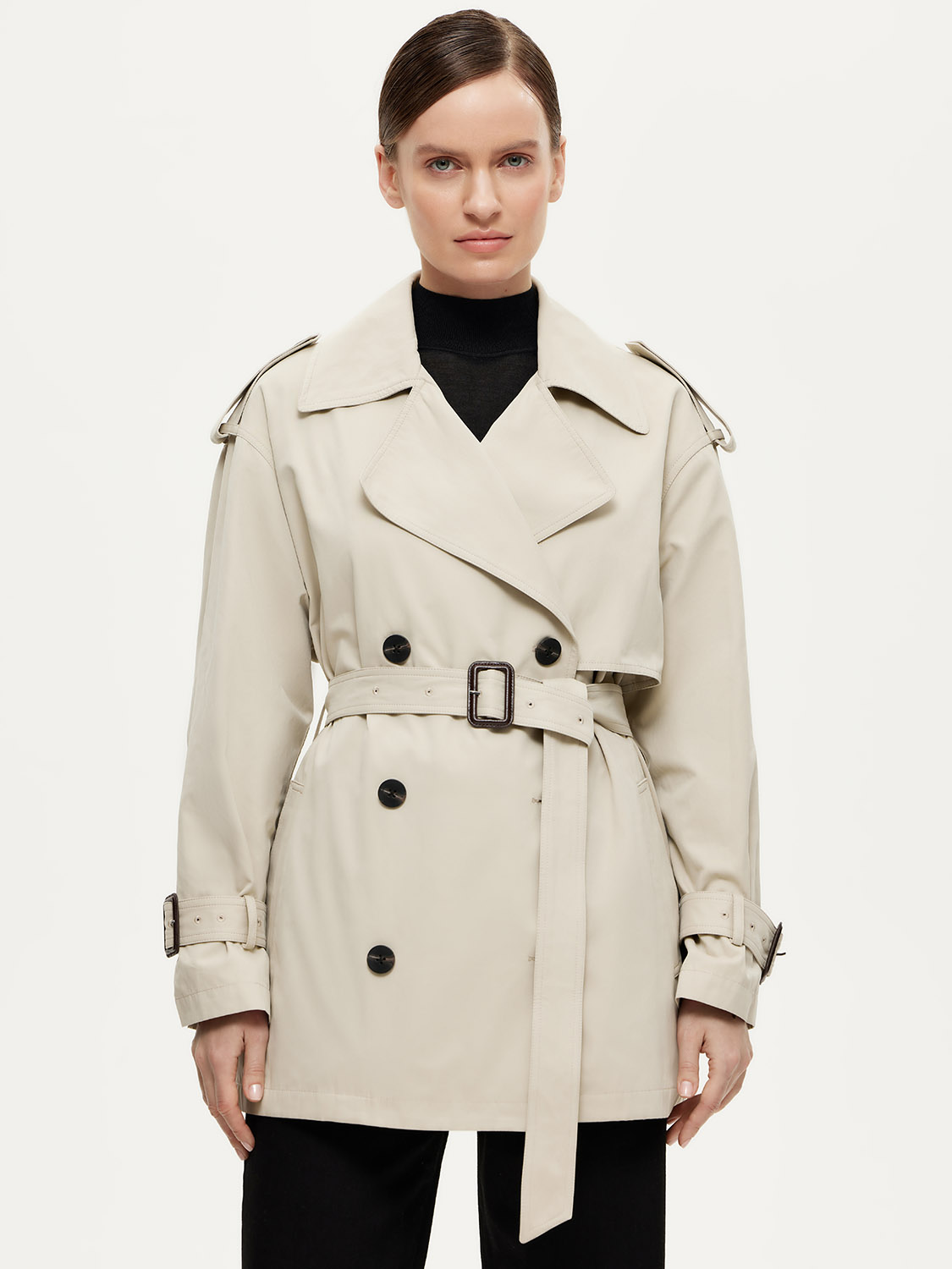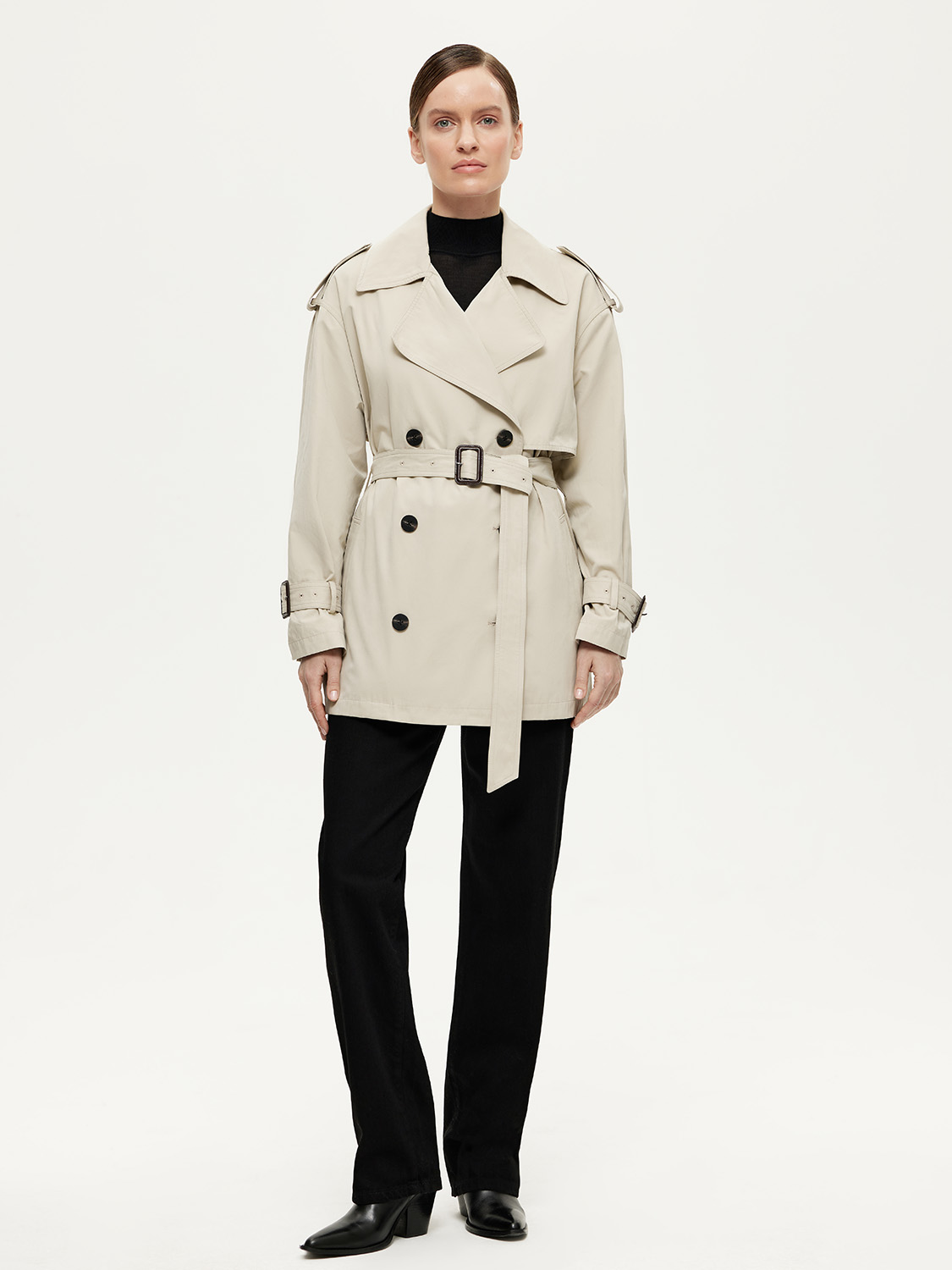 Укороченный двубортный тренч выполнен из плотного хлопка, на подкладке. Свободный крой, опущенная линия плеча. Съемный длинный пояс с акцентной пряжкой позволяет моделировать приталенный силуэт. Тренч с удобными боковыми карманами, широкими лацканами, отложным воротом и характерными погонами. Носите с джинсами и брюками. Для дополнительного утепления можно отвернуть лацканы и поднять воротник, а также надеть под низ теплый трикотаж или жакет. На модели размер S. Параметры модели: рост 175, 83-61-89.