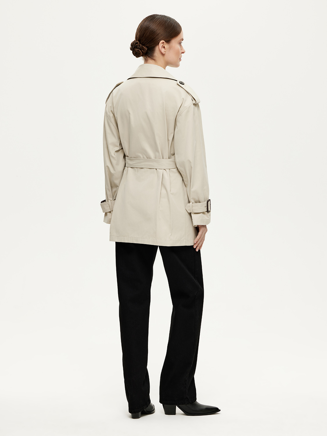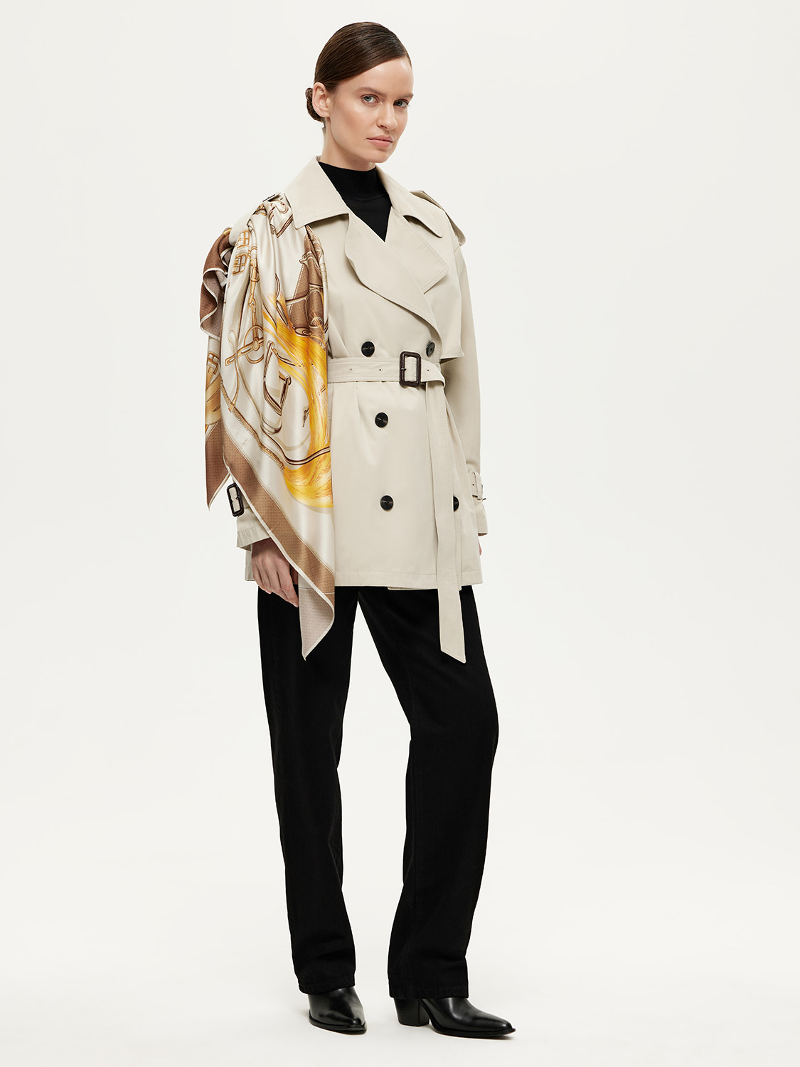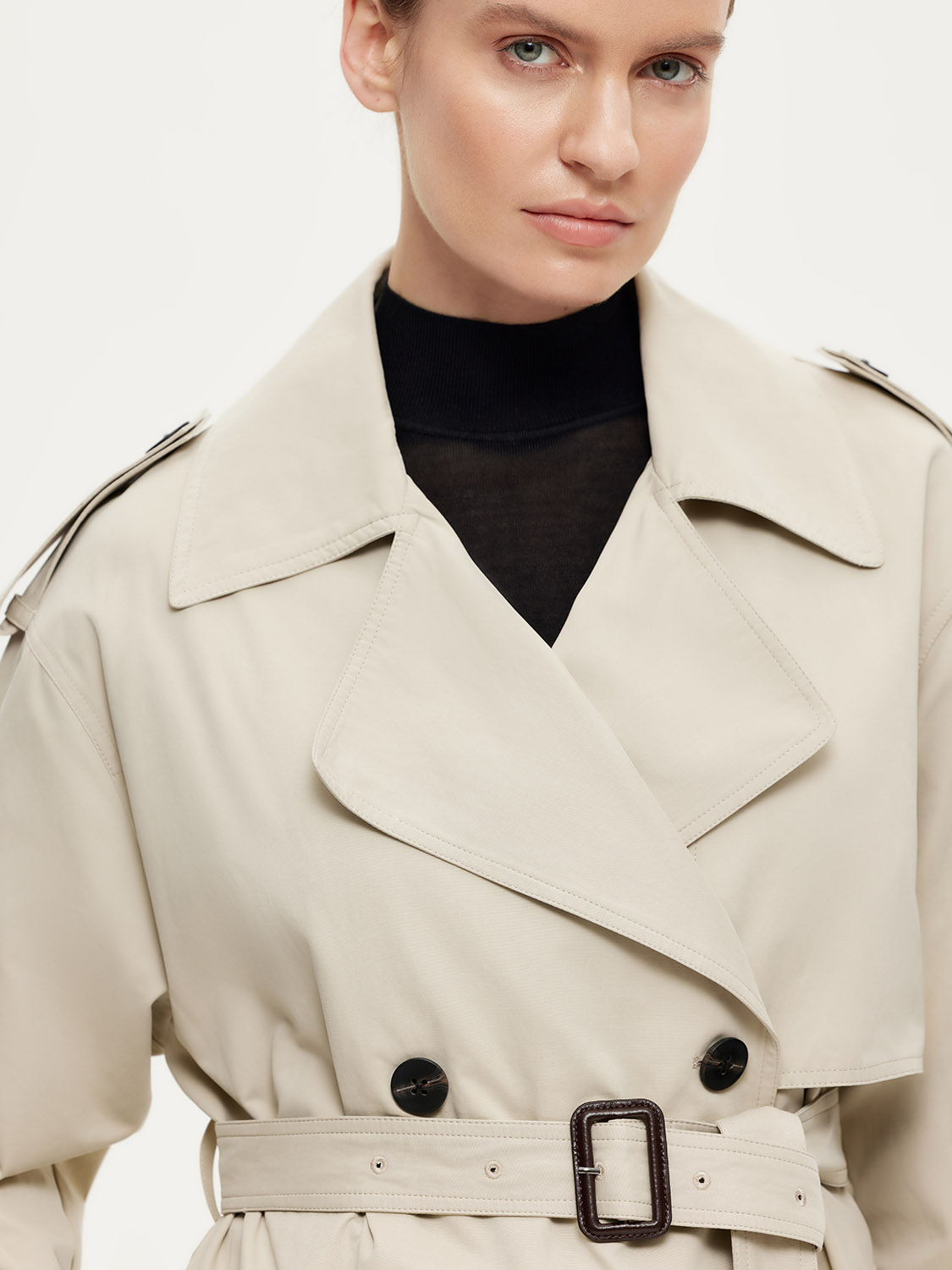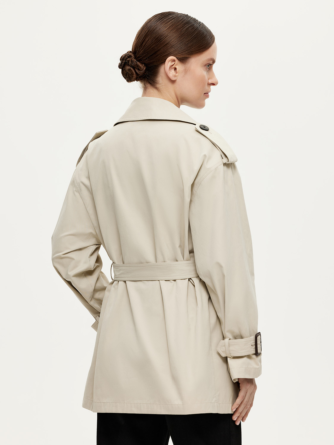 Укороченный двубортный тренч выполнен из плотного хлопка, на подкладке. Свободный крой, опущенная линия плеча. Съемный длинный пояс с акцентной пряжкой позволяет моделировать приталенный силуэт. Тренч с удобными боковыми карманами, широкими лацканами, отложным воротом и характерными погонами. Носите с джинсами и брюками. Для дополнительного утепления можно отвернуть лацканы и поднять воротник, а также надеть под низ теплый трикотаж или жакет. На модели размер S. Параметры модели: рост 175, 83-61-89.