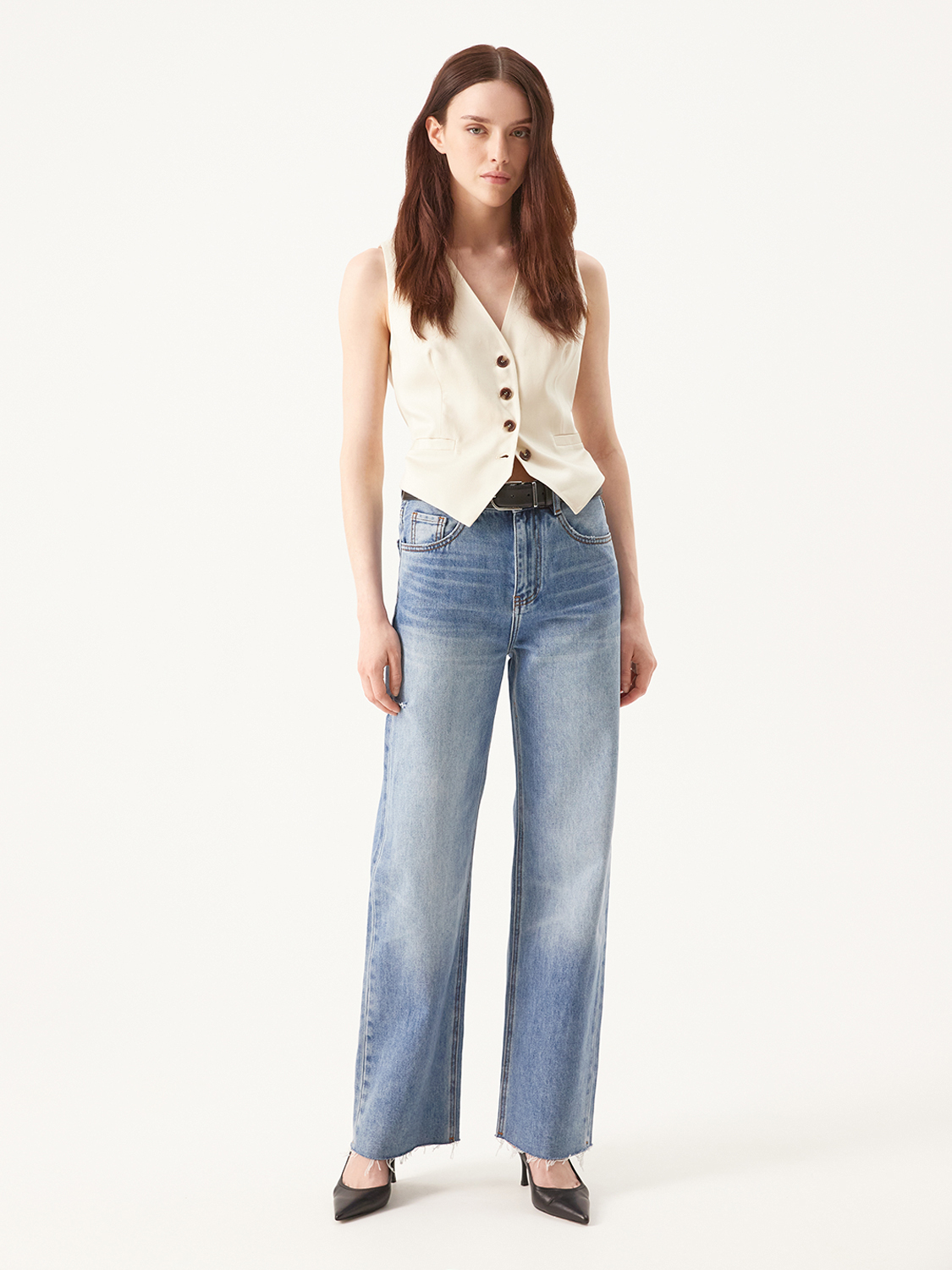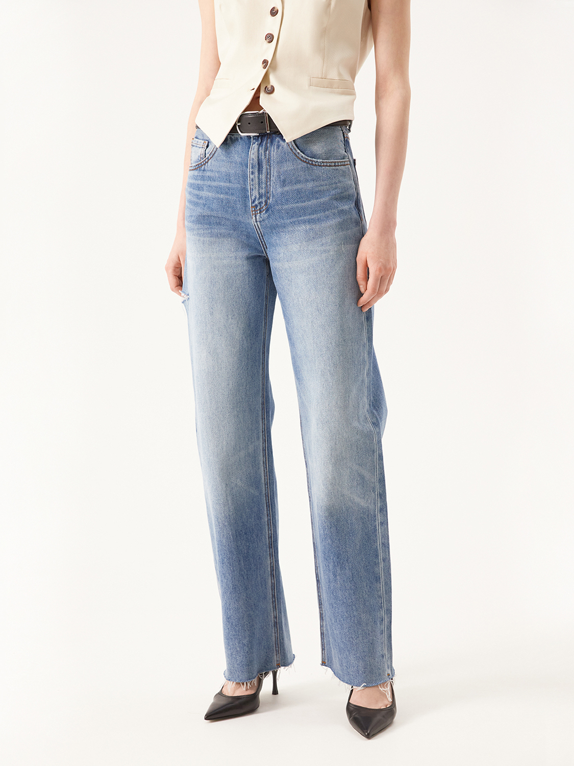 Джинсы на высокой посадке свободного фита с необработанным краем и боковым разрезом добавят дерзости в ваш образ. Выполнены из плотного хлопка, который пропускает воздух и хорошо держит форму. Джинсы выбелили и создали выразительный эффект делаве. Пояс со шлевками, которые можно дополнить кожаным ремнем. Комбинируйте с жилетами, топами и рубашками. Дополняйте туфлями, босоножками, сандалиями и лоферами. На модели размер 26. Параметры модели: рост 176, 81-63-89.