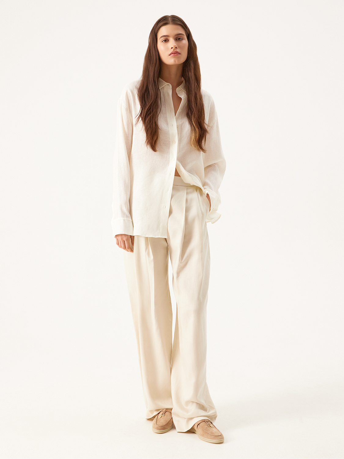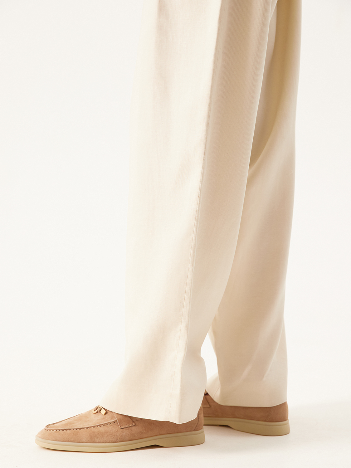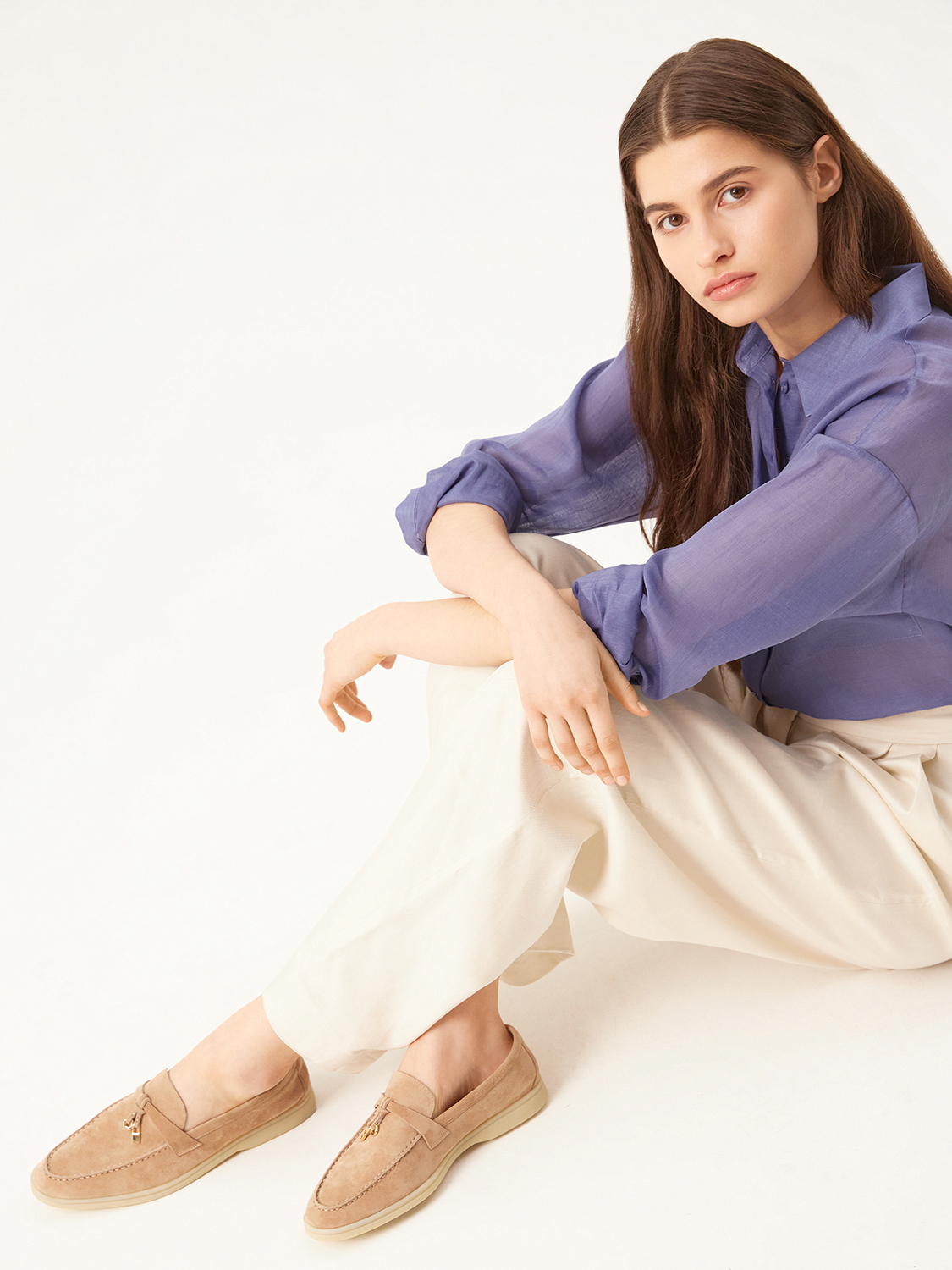 Лаконичные и элегантные лоферы созданы для комфорта в течение всего дня. Выполнены из натуральной мягкой замши, которая добавит непринужденной роскоши и благородства даже простому образу. С удобной стелькой из натуральной кожи. Контрастная молочная подошва добавляет гибкости и легкости походке, а металлический декор игривости. Станут дополнением для костюмов, романтичных платьев и образов с джинсами.