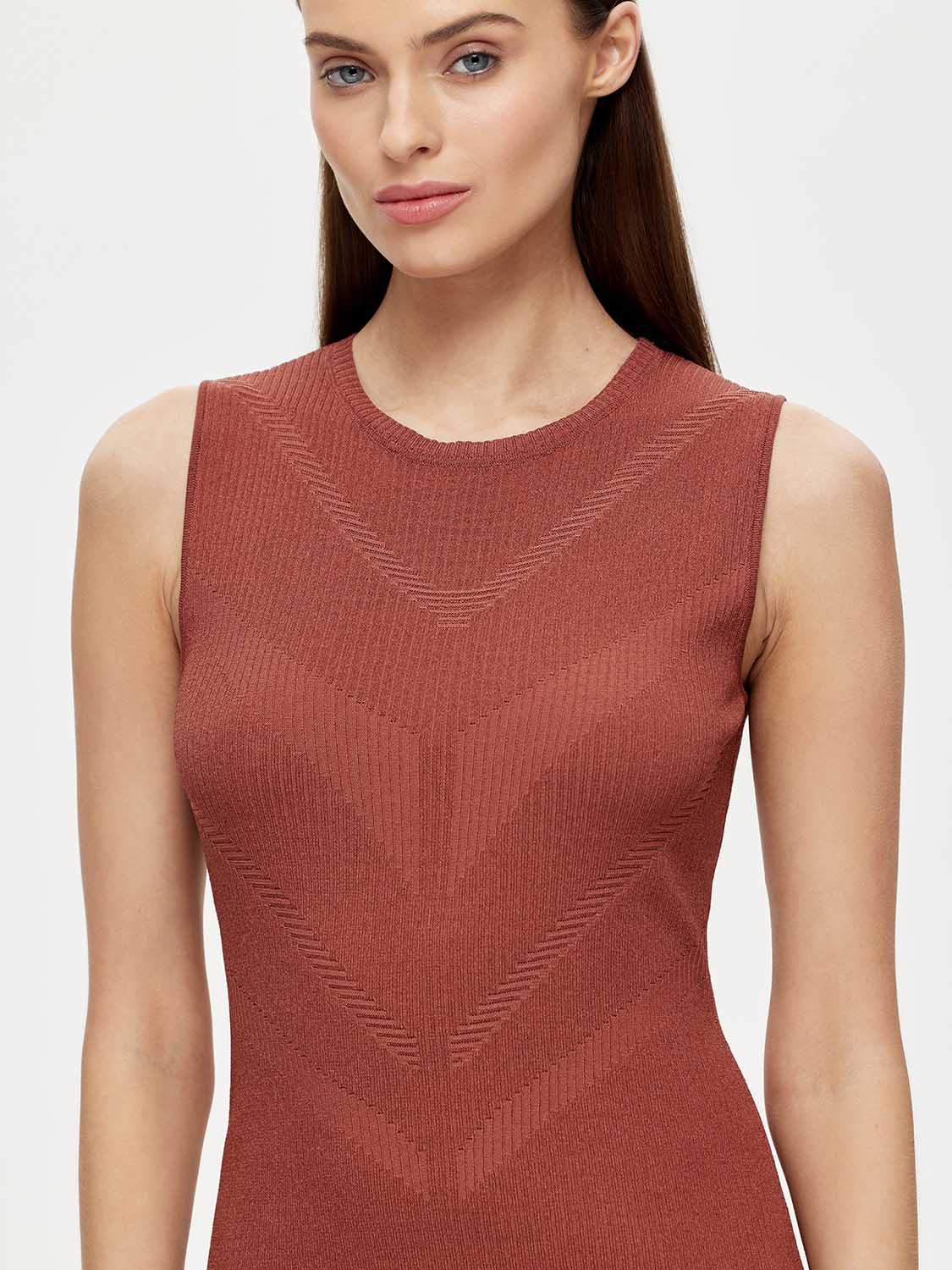 Облегающее трикотажное платье длины мини. Без рукавов, с круглым вырезом. Эффектно подчеркивает фигуру. Выполнено из мягкого и фактурного вискозного трикотажа с добавлением люрекса, деликатное мерцание которого добавляет изысканности и шарма. Тактильно приятное и комфортное в носке. Выразительности придает узор на груди. Носите как самостоятельный элемент или дополняйте жакетами, кардиганами, куртками и тренчами. Лаконичная сумочка завершит образ. На модели размер S. Параметры модели: рост 177, 80-59-89.
