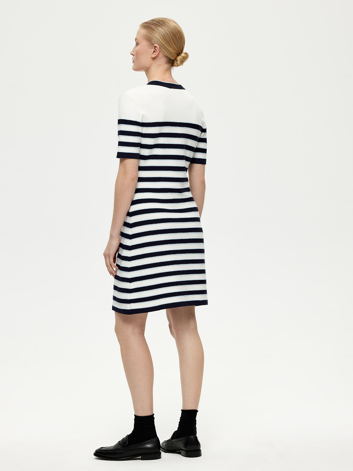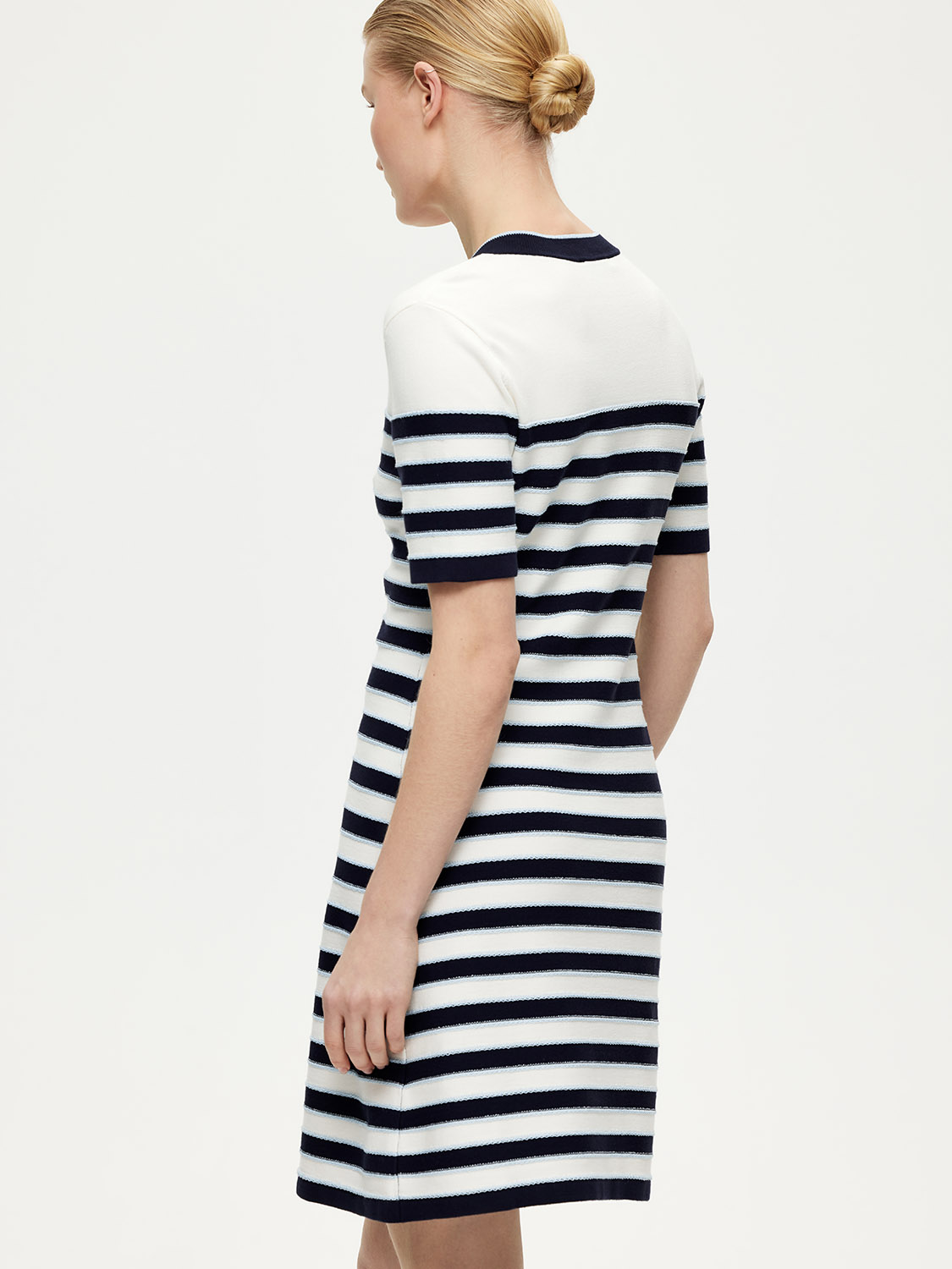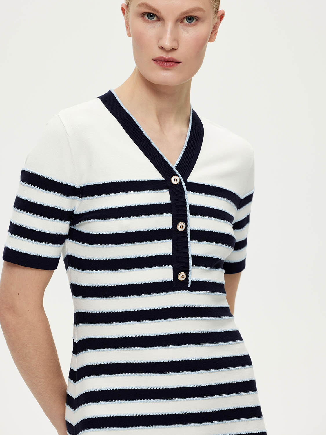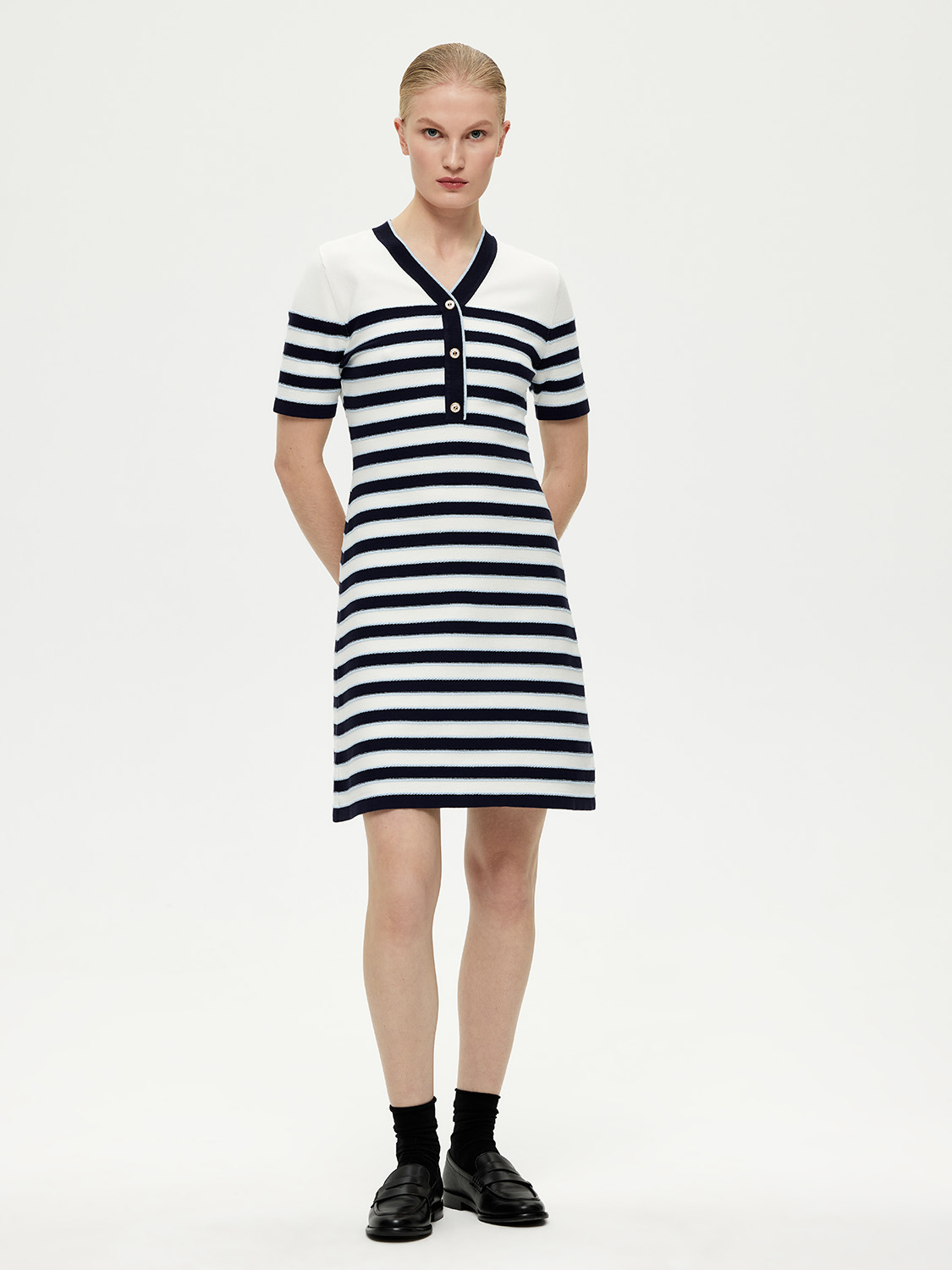 Игривое трикотажное платье длиной мини. Выполнено из гладкого плотного трикотажа на основе шелковистой вискозы, приятное к телу и комфортное в носке. Платье слегка расклешенного кроя изящно подчеркивает изгибы. V-образный вырез с пуговичной планкой, короткий рукав и актуальный принт в полоску. Подойдет для прогулок и неформальных встреч. Сочетайте с лоферами или кедами. На модели размер S. Параметры модели: рост 175, 80-63-89.