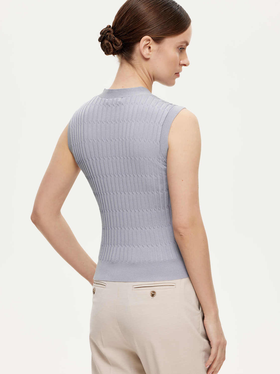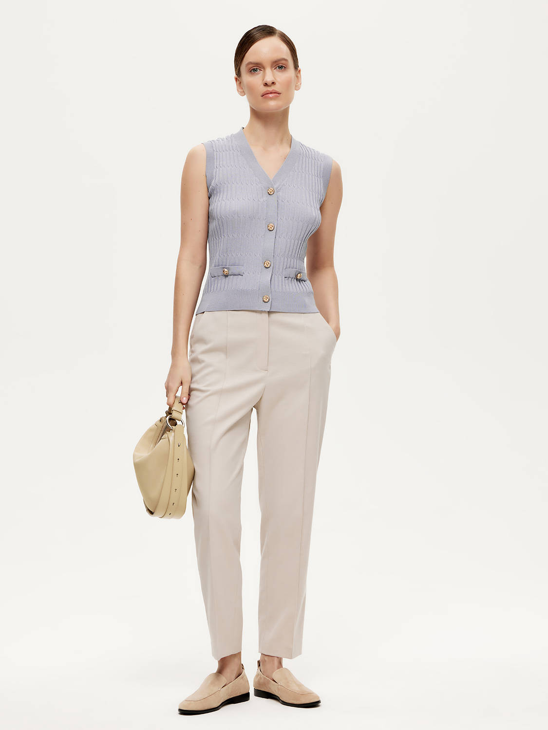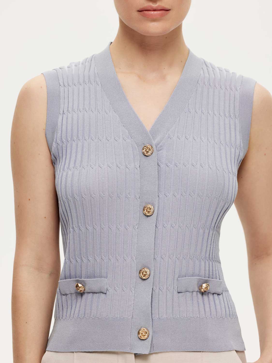 Трикотажный жилет, облегающего силуэта, эффектно смотрится как на голое тело, так и поверх водолазок. Рельефное вискозное полотно приятно к телу и изящно подчеркивает фигуру. V- образный вырез открывает ключицы и визуально вытягивает силуэт. Акцентные золотистые пуговицы грамотно расставляют акценты и добавляют благородной роскоши. Носите жилет с джинсами, брюками или юбками. Как самостоятельный элемент комплекта или под жакеты. На модели размер S. Параметры модели: 177, 83-61-89.