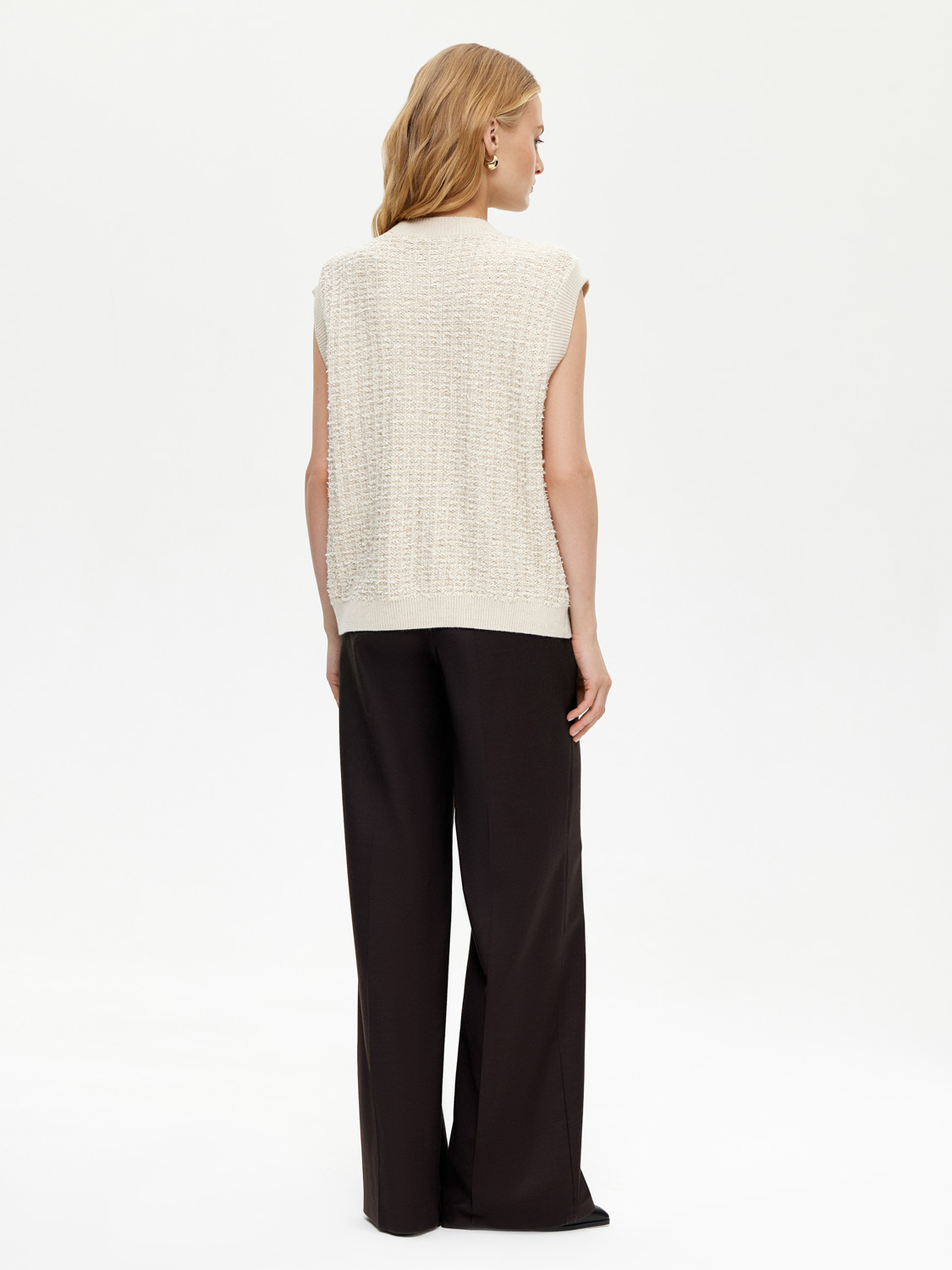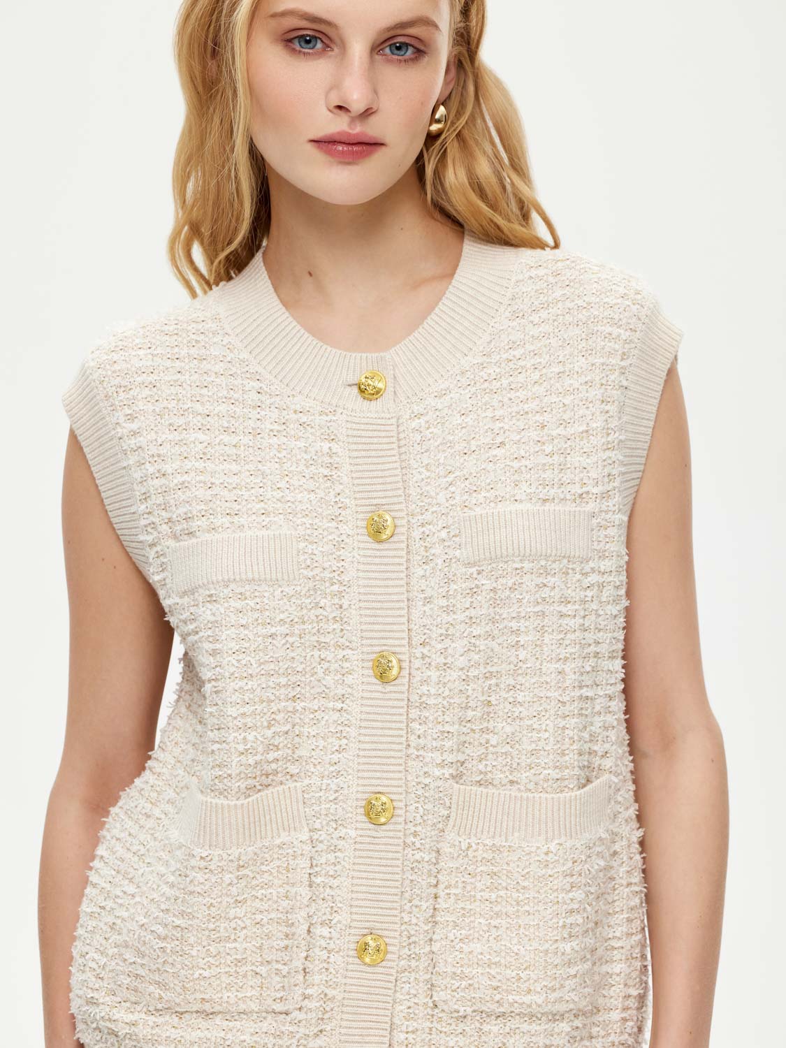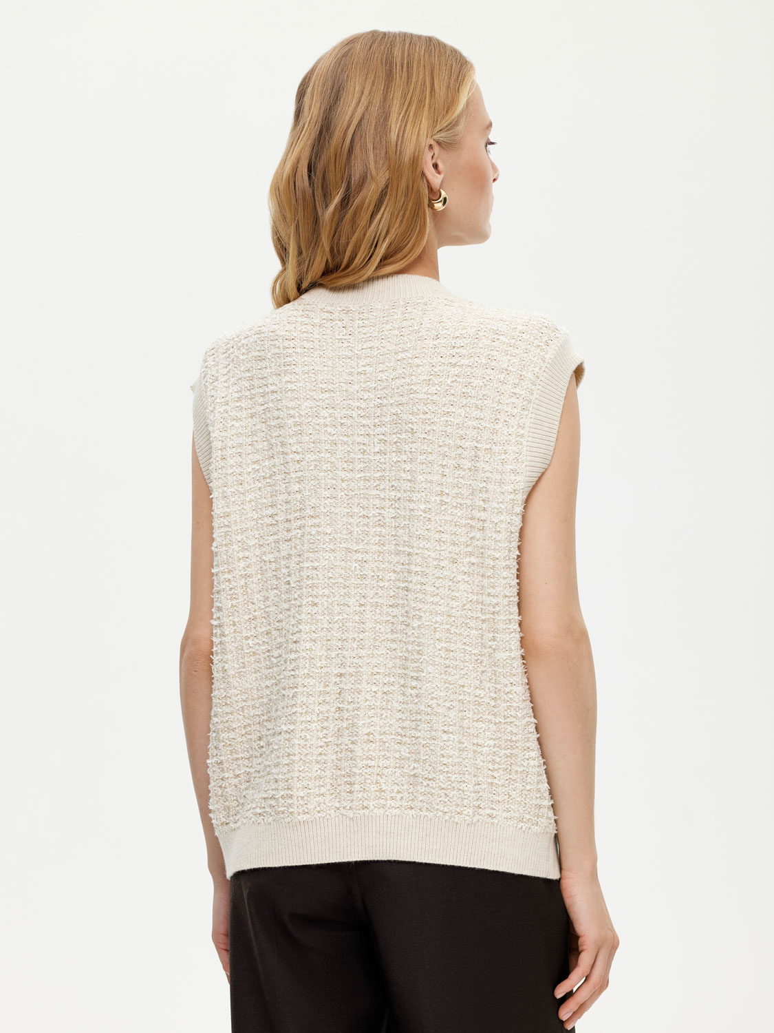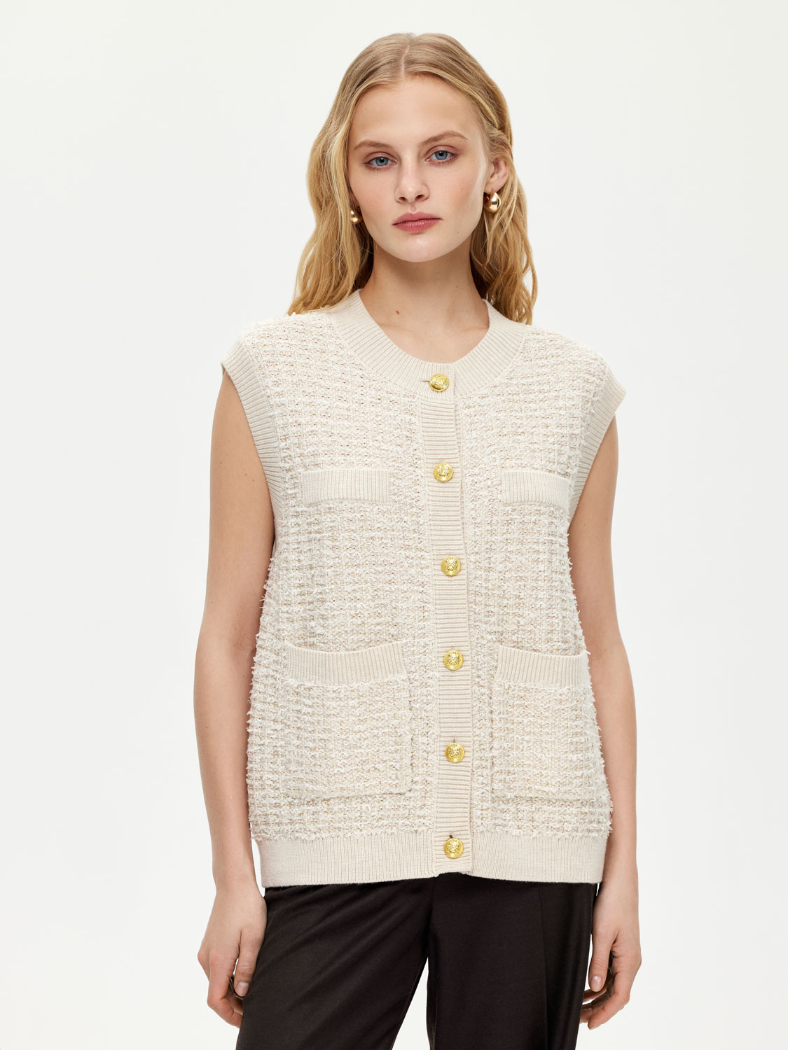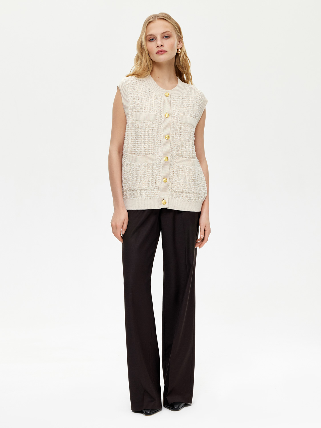 Трикотажная жилетка из мягкого трикотажа с добавлением натуральной шерсти мериноса. У жилетки прямой крой, вкрапления деликатно сияющих пайеток, изящные пуговицы и накладные карманы. Смесовая ткань с натуральной шерстью мягкая и приятная на ощупь, дышащая и износостойкая. Жилетка подойдет для элегантных образов с брюками и юбками, а также для нарядных повседневных образов с джинсами. На модели размер S. Параметры модели: рост 172, 81-58-87.