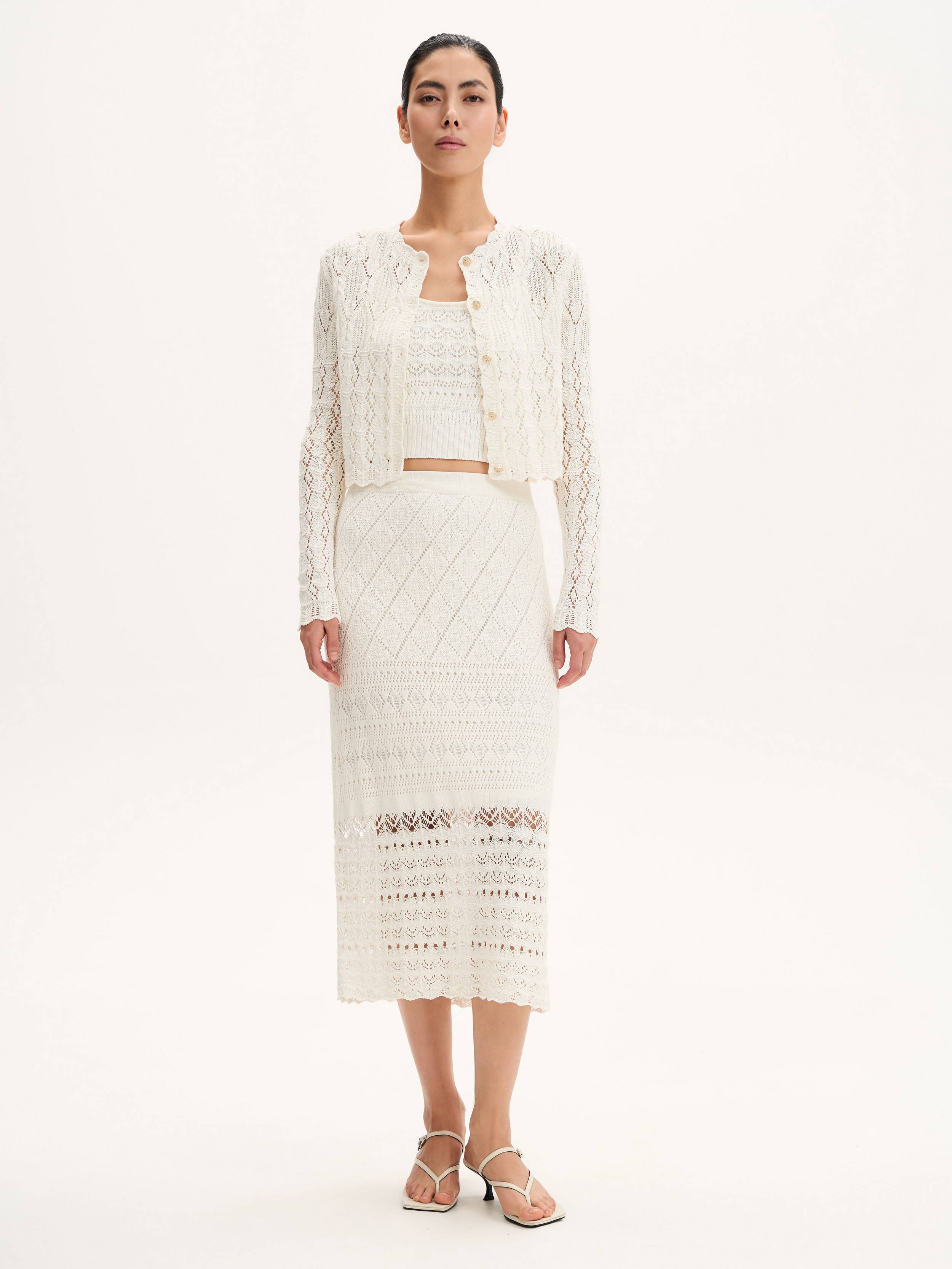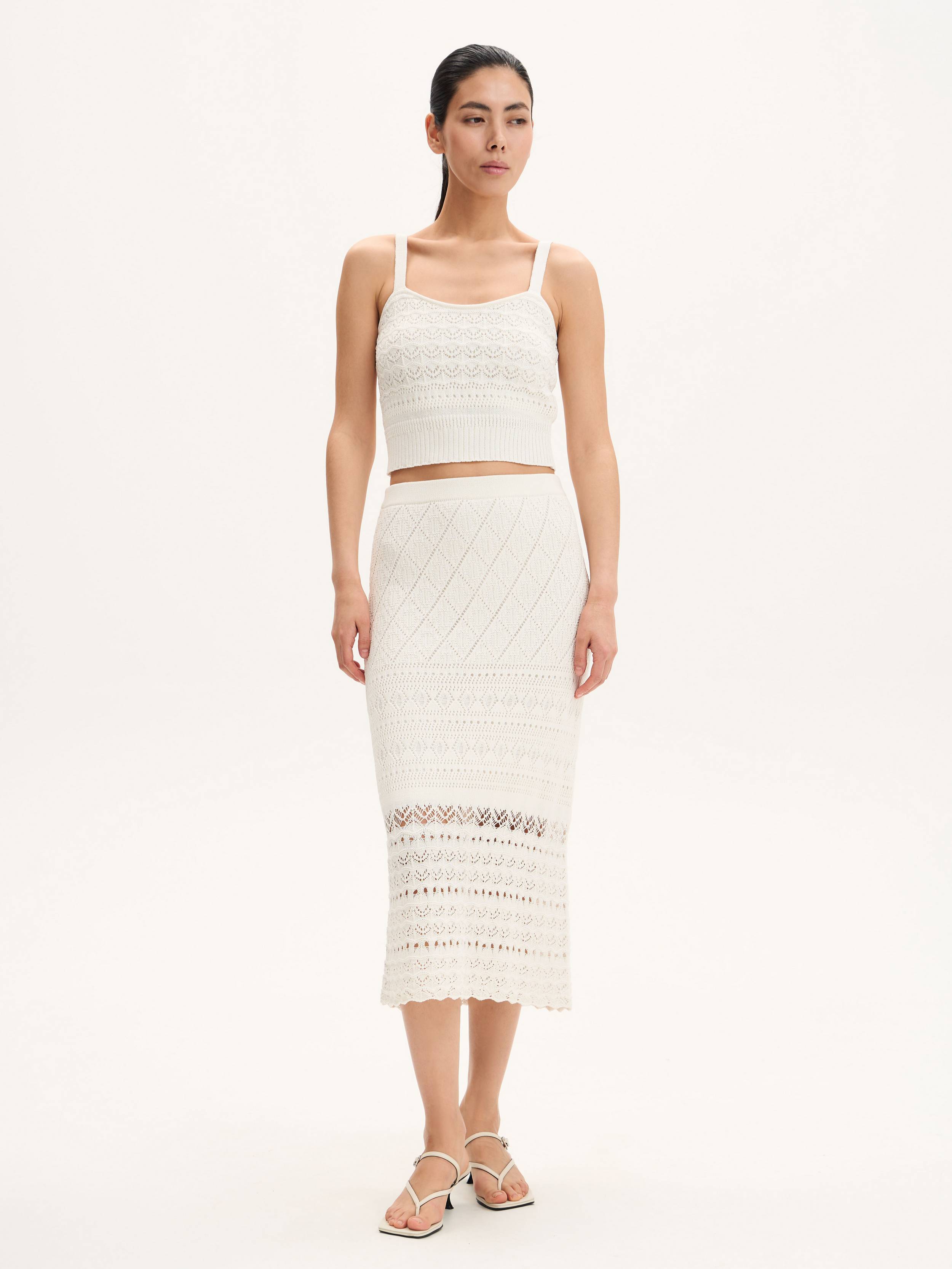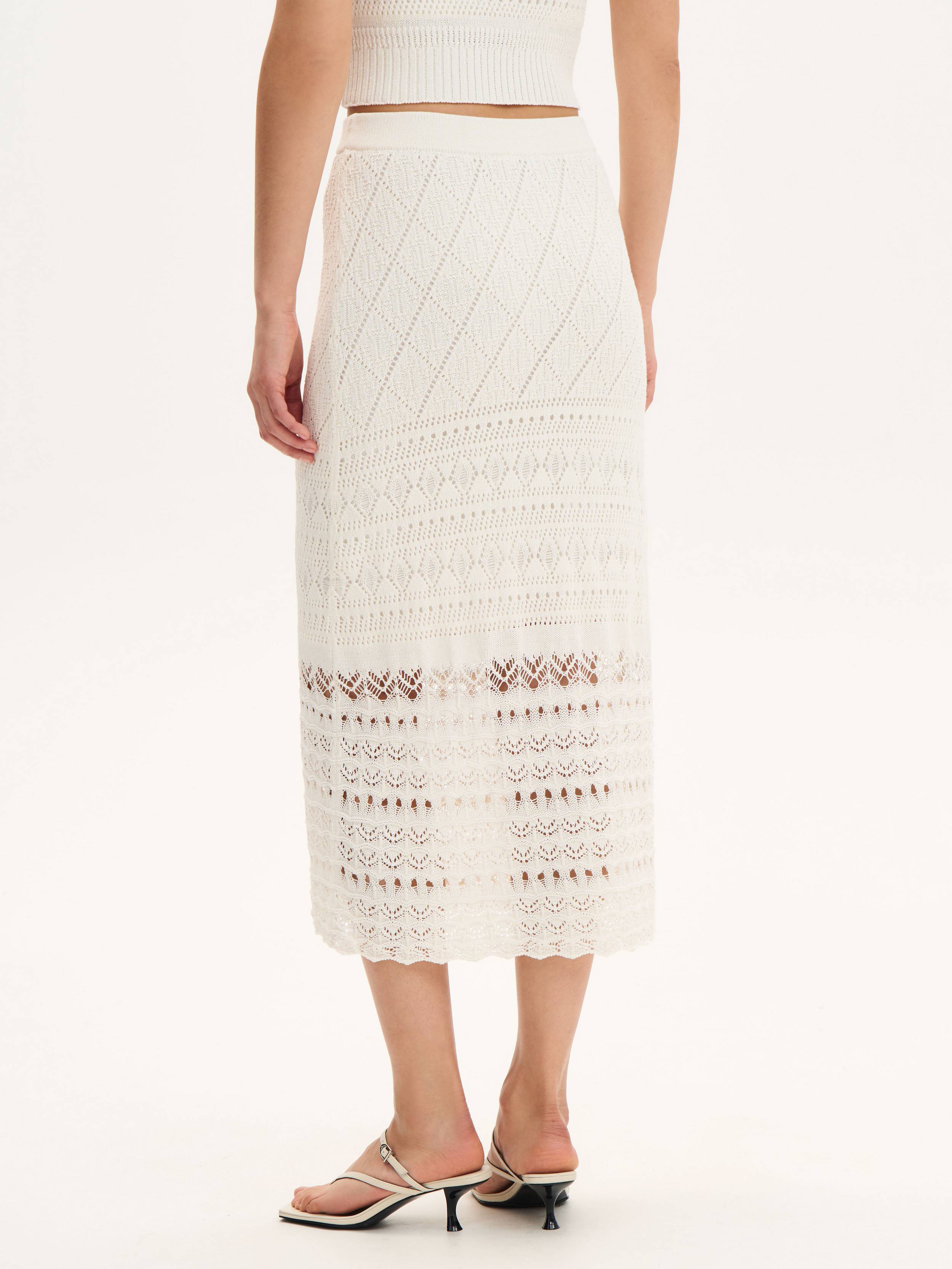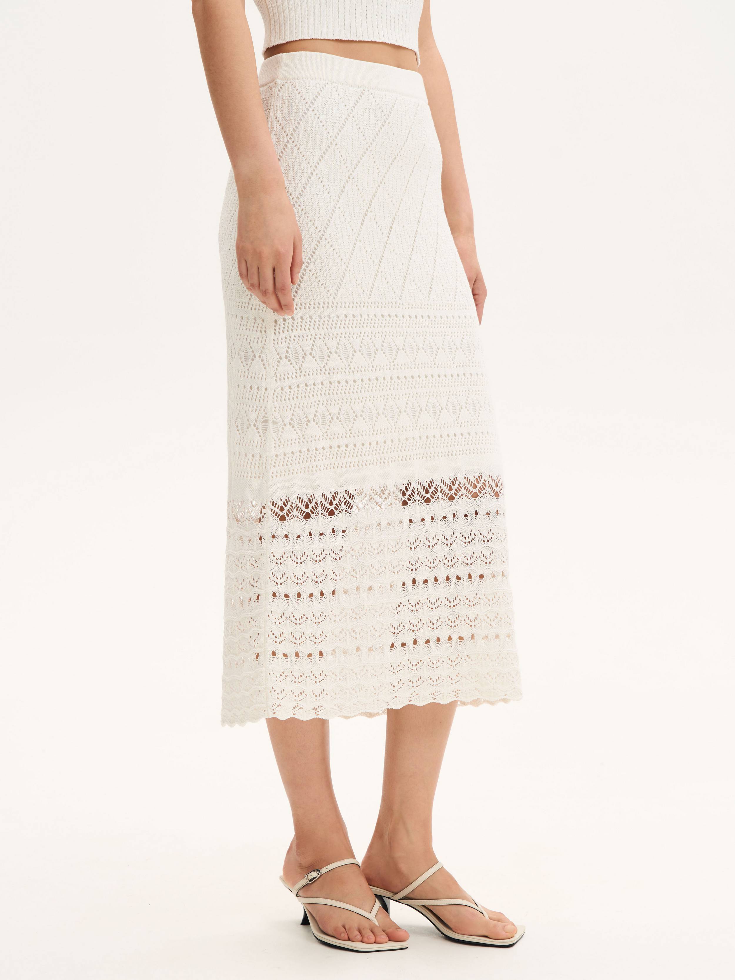 Изящная ажурная юбка миди в технике кроше. Добавляет романтичности и нежности. Выполнена из мягкого хлопка с добавлением полиамида, благодаря которому не вытягивается и сохраняет форму. Приятна к телу. Удобства добавляет широкий пояс на резинке. Искусное переплетение нитей добавляет воздушности и поддерживает тренд на прозрачность. Для комфортного ношения мы добавили подкладку, создав дополнительную игру длин. Комбинируйте с парным кроп-топом и кардиганом, рубашками и джемперами. На модели размер S. Параметры модели: рост 177, 80-59-89.