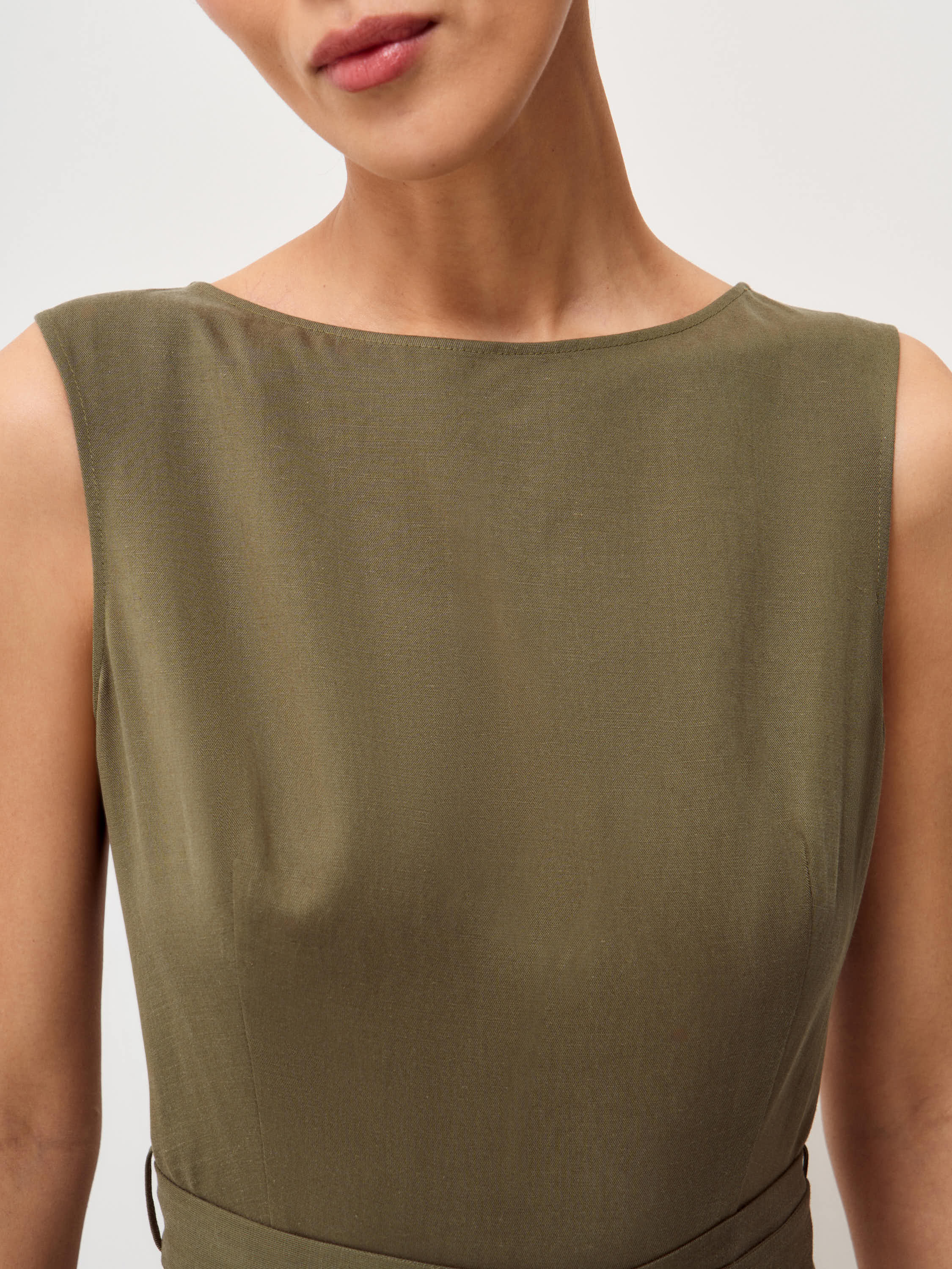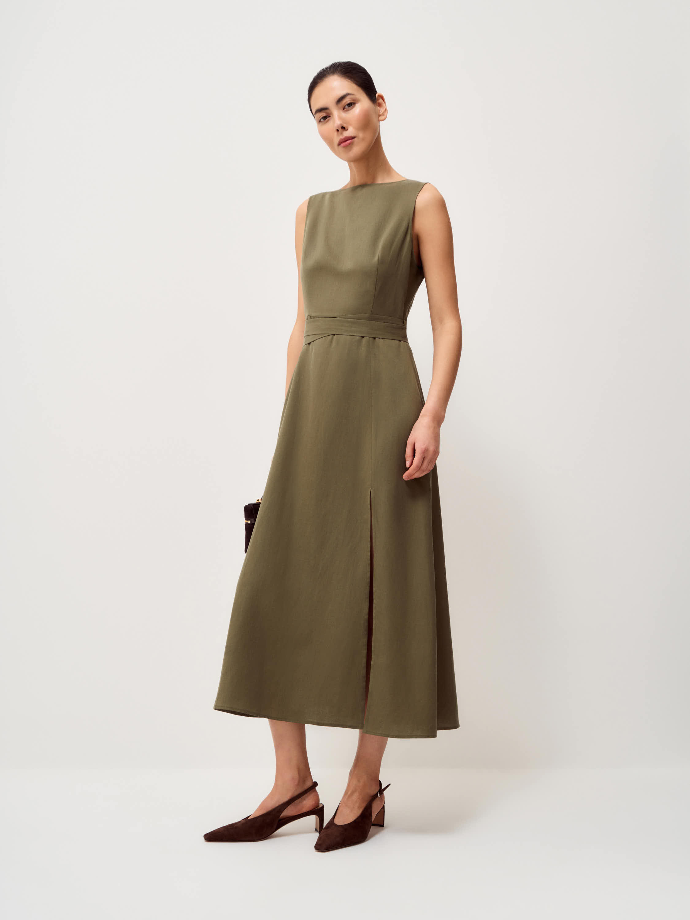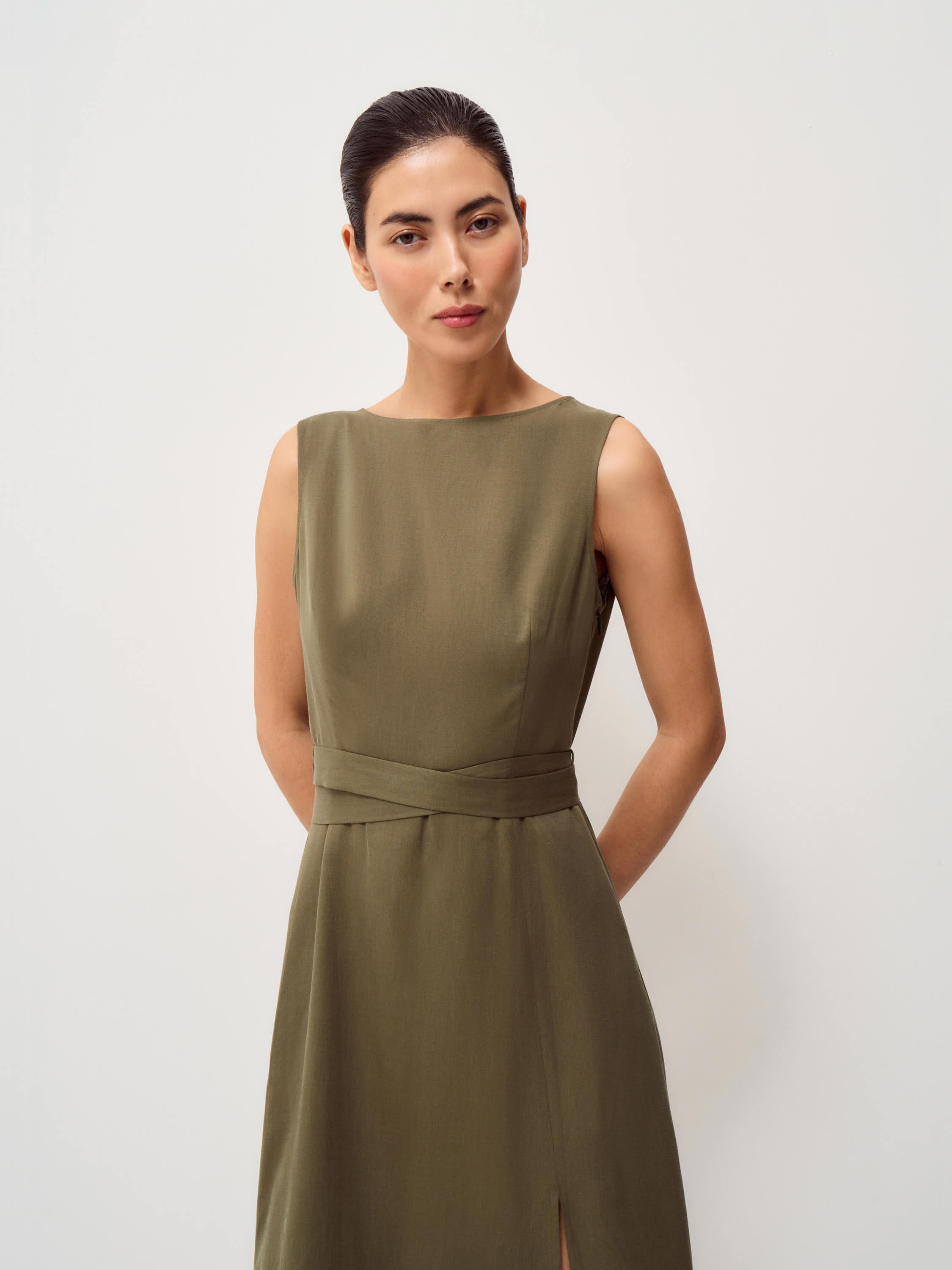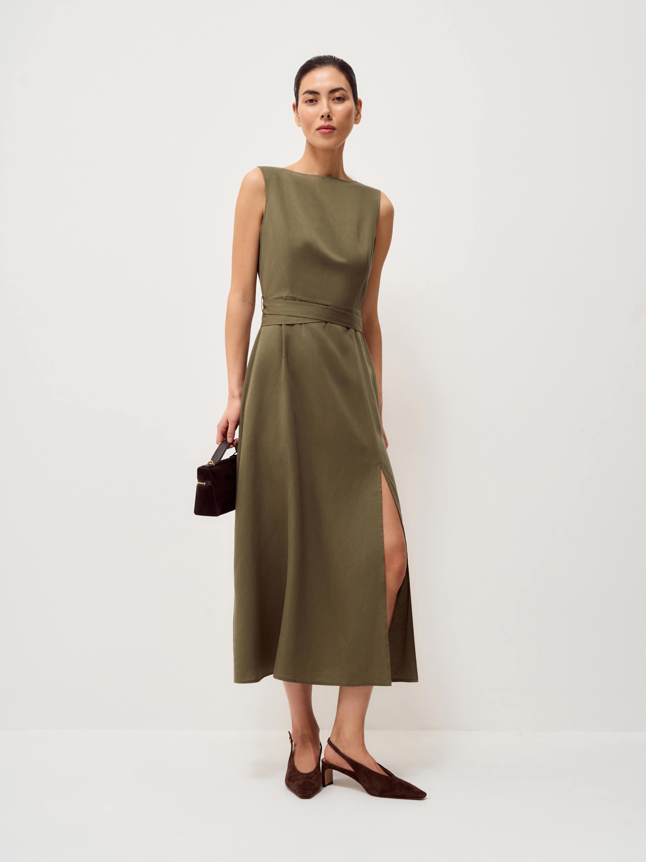 Платье приталенного силуэта выполнено из смесовой ткани на основе тенсела и льна. Материал сочетает мягкость и пластичность тенсела с характерной фактурой льна, благодаря чему ткань выглядит выразительно, хорошо драпируется и комфортна в носке. Модель с лаконичной линией горловины и аккуратно сформированной линией талии, дополненной поясом. Юбка плавно расширяется книзу, а высокий разрез сбоку добавляет силуэту динамику и подчеркивает легкость движения ткани. Спокойный оливковый оттенок делает модель универсальной и позволяет легко сочетать платье с лаконичными аксессуарами и обувью.
