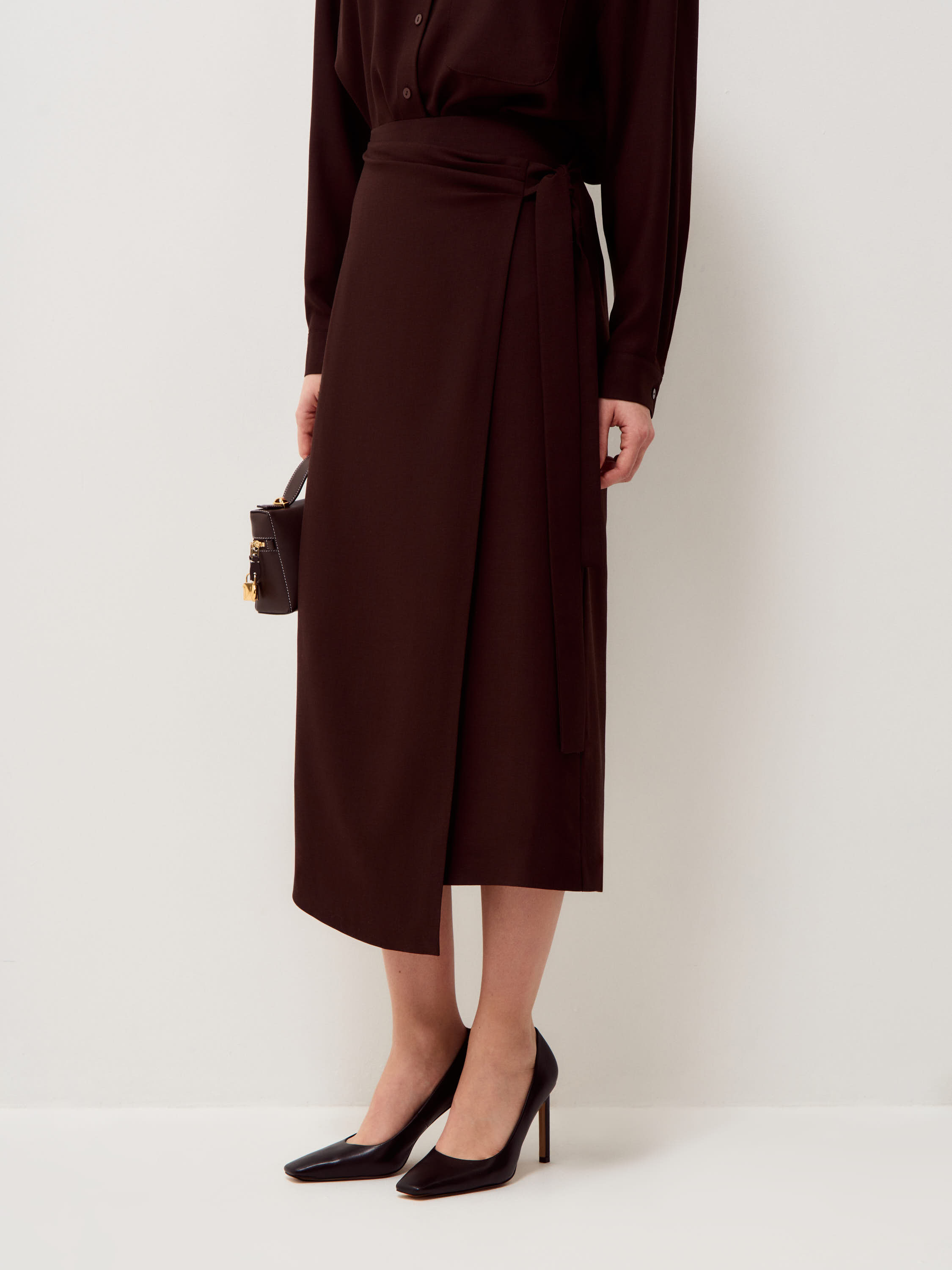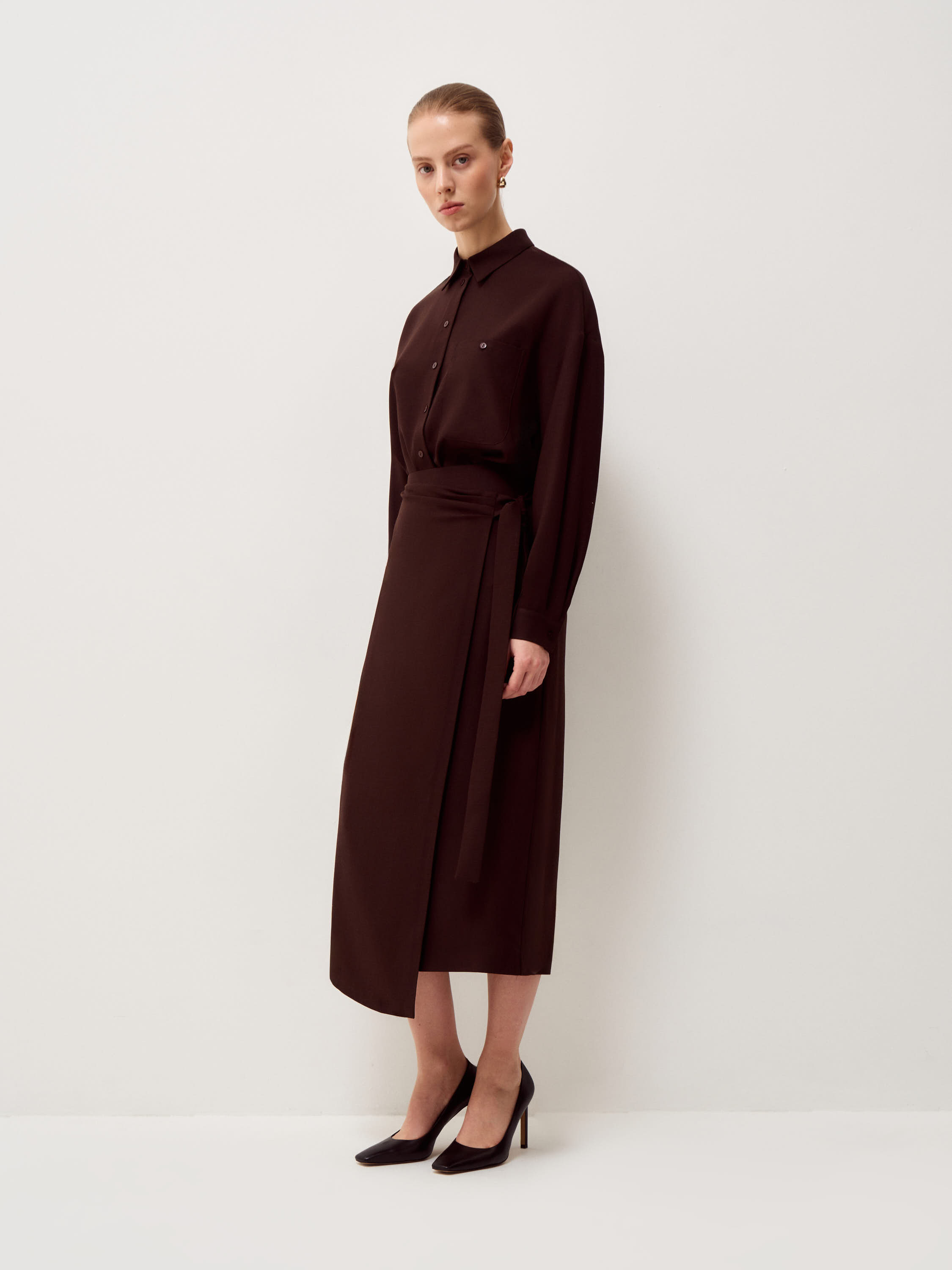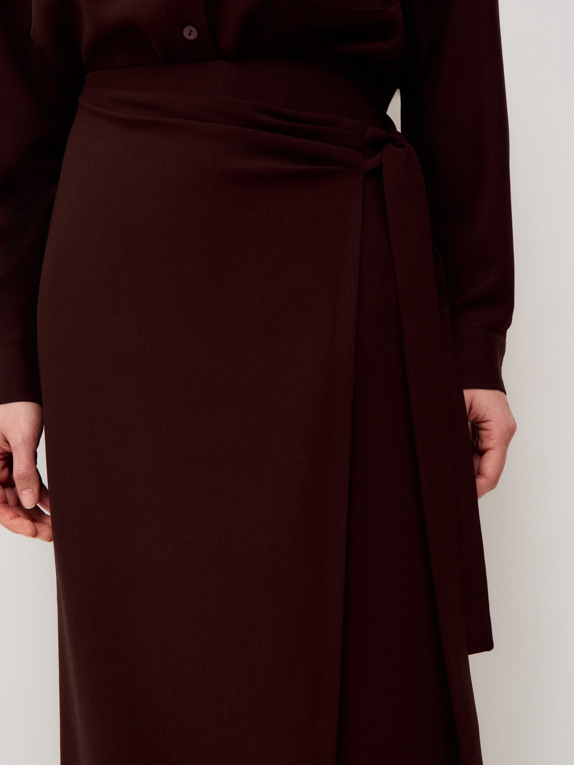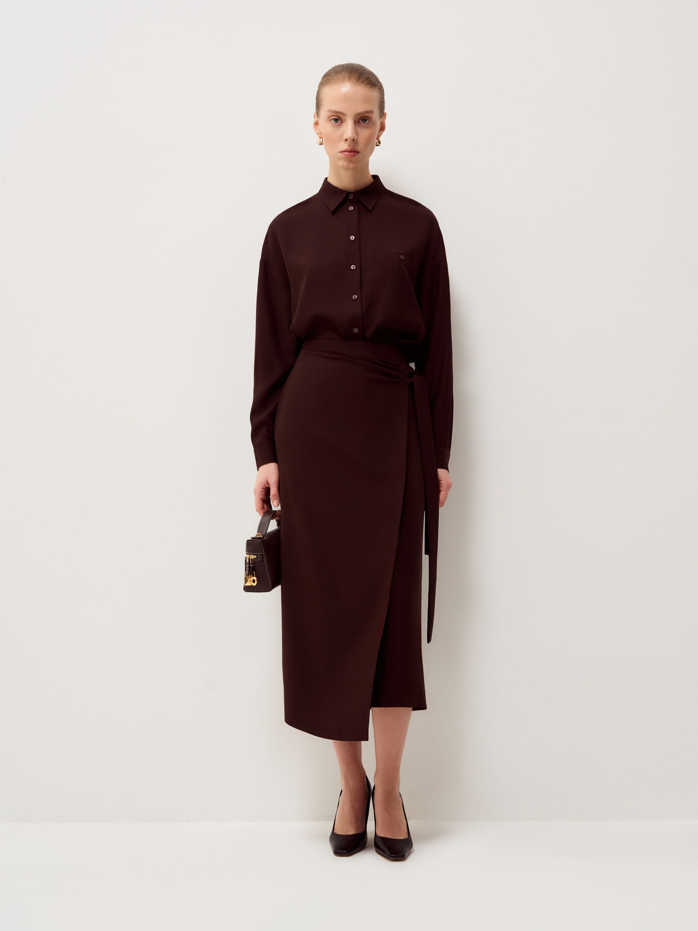Юбка выполнена из плотной смесовой ткани на основе шерсти. Модель с запахом и асимметричной передней деталью, которая формирует выразительную диагональ и делает силуэт более собранным. Посадка высокая, акцент на талии подчеркнут широкой притачной частью и длинным поясом, который фиксируется сбоку и мягко драпируется. Длина миди закрывает колено и выглядит уместно как в деловых сочетаниях, так и в более повседневных образах. Оттенок глубокий, темный, с винно-коричневым подтоном, который хорошо сочетается со светлыми молочными, бежевыми и насыщенными шоколадными цветами.