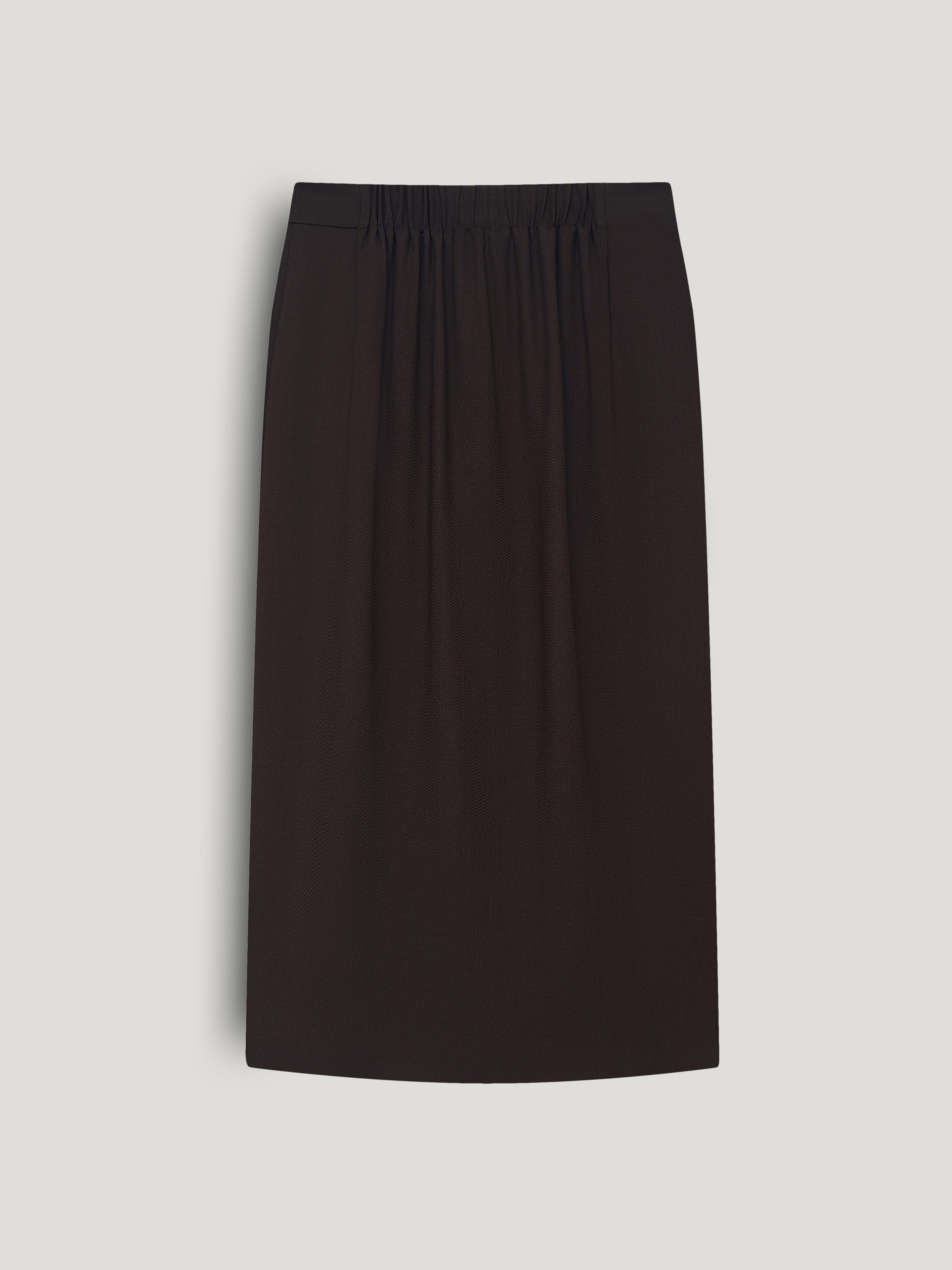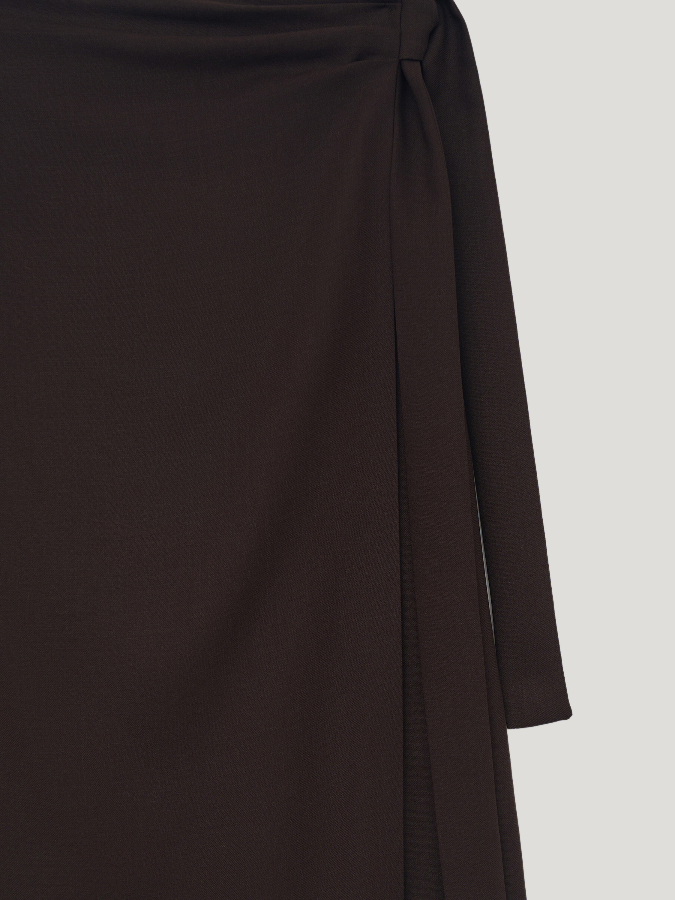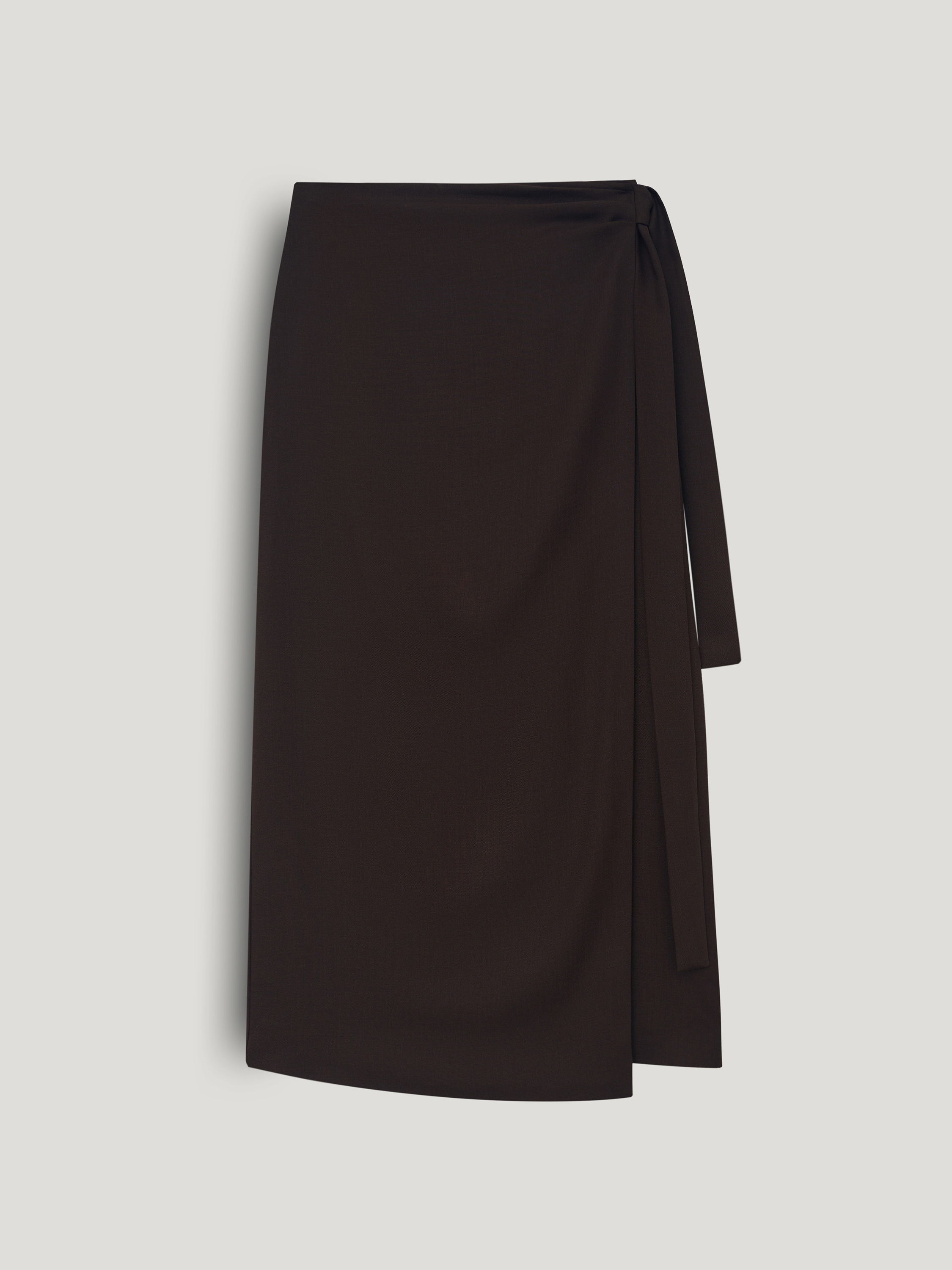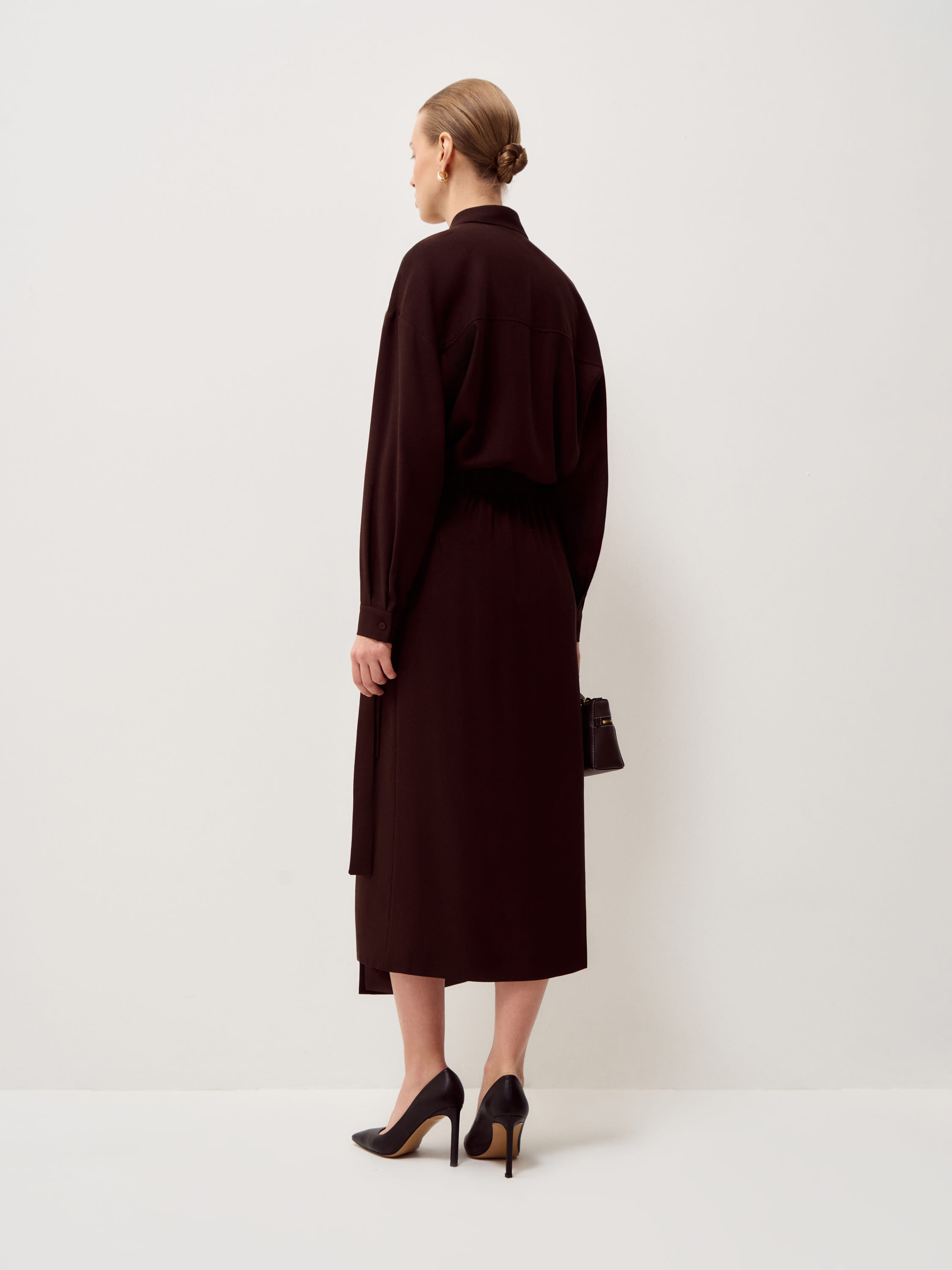 Юбка выполнена из плотной смесовой ткани на основе шерсти. Модель с запахом и асимметричной передней деталью, которая формирует выразительную диагональ и делает силуэт более собранным. Посадка высокая, акцент на талии подчеркнут широкой притачной частью и длинным поясом, который фиксируется сбоку и мягко драпируется. Длина миди закрывает колено и выглядит уместно как в деловых сочетаниях, так и в более повседневных образах. Оттенок глубокий, темный, с винно-коричневым подтоном, который хорошо сочетается со светлыми молочными, бежевыми и насыщенными шоколадными цветами.