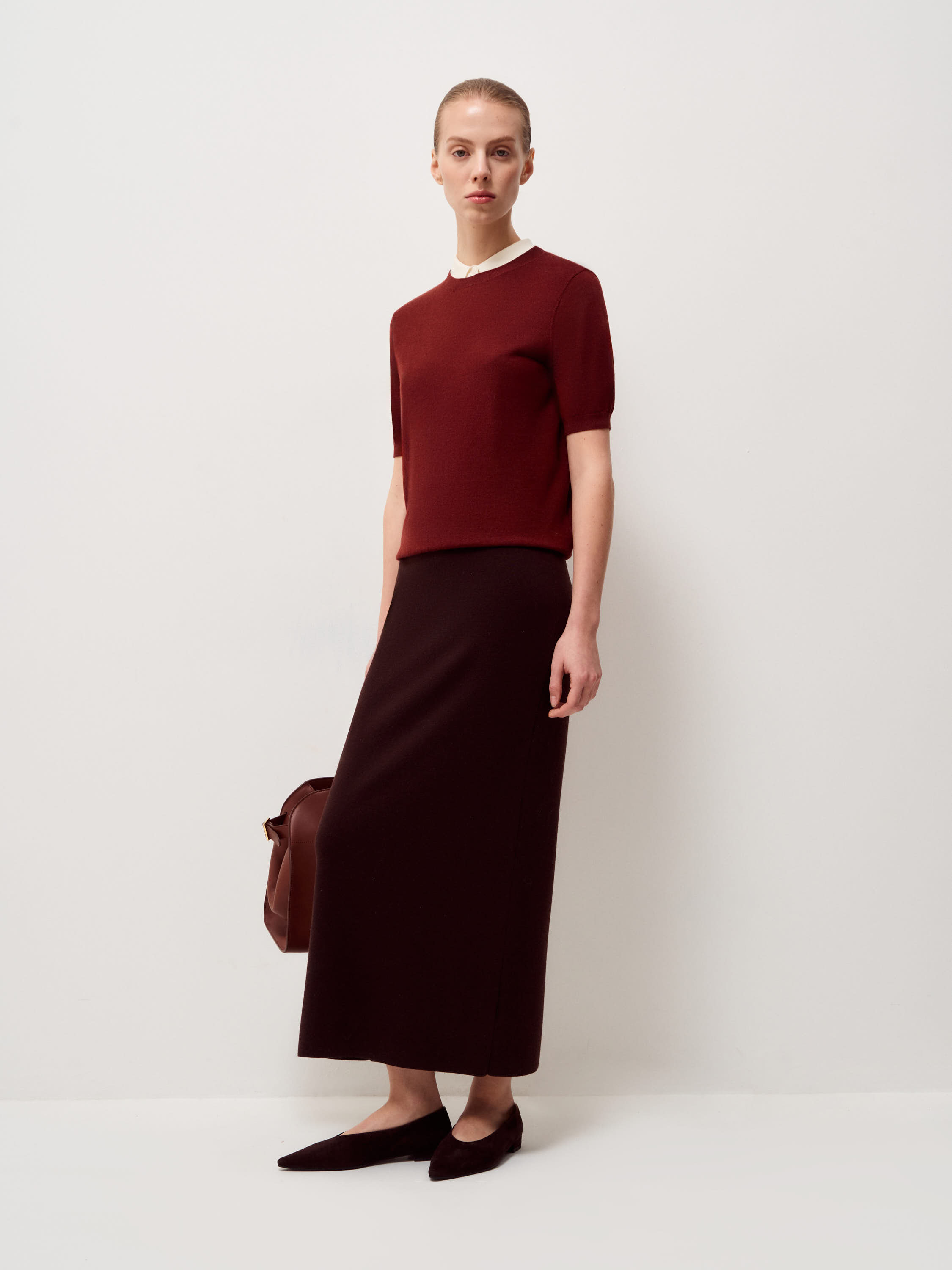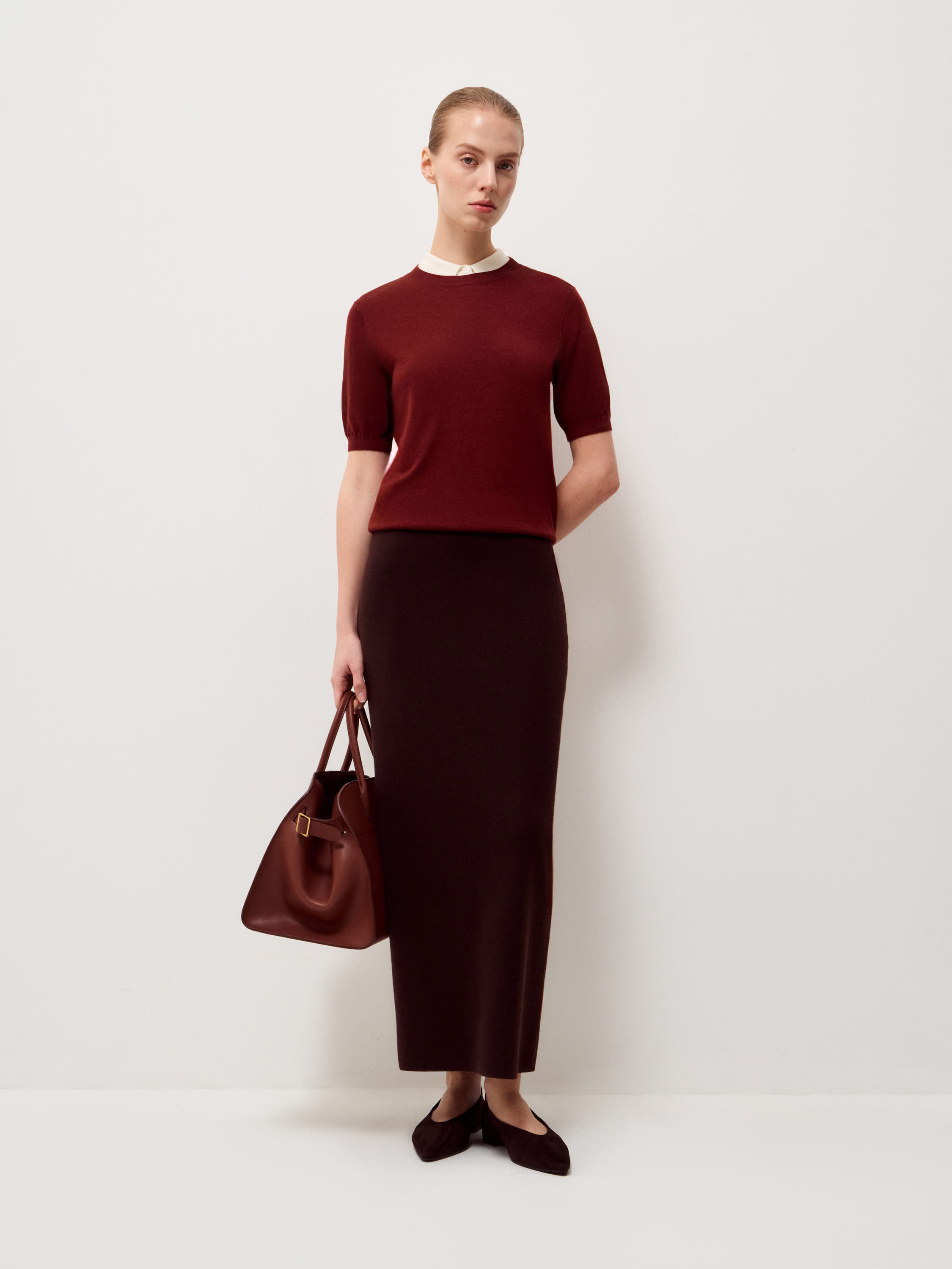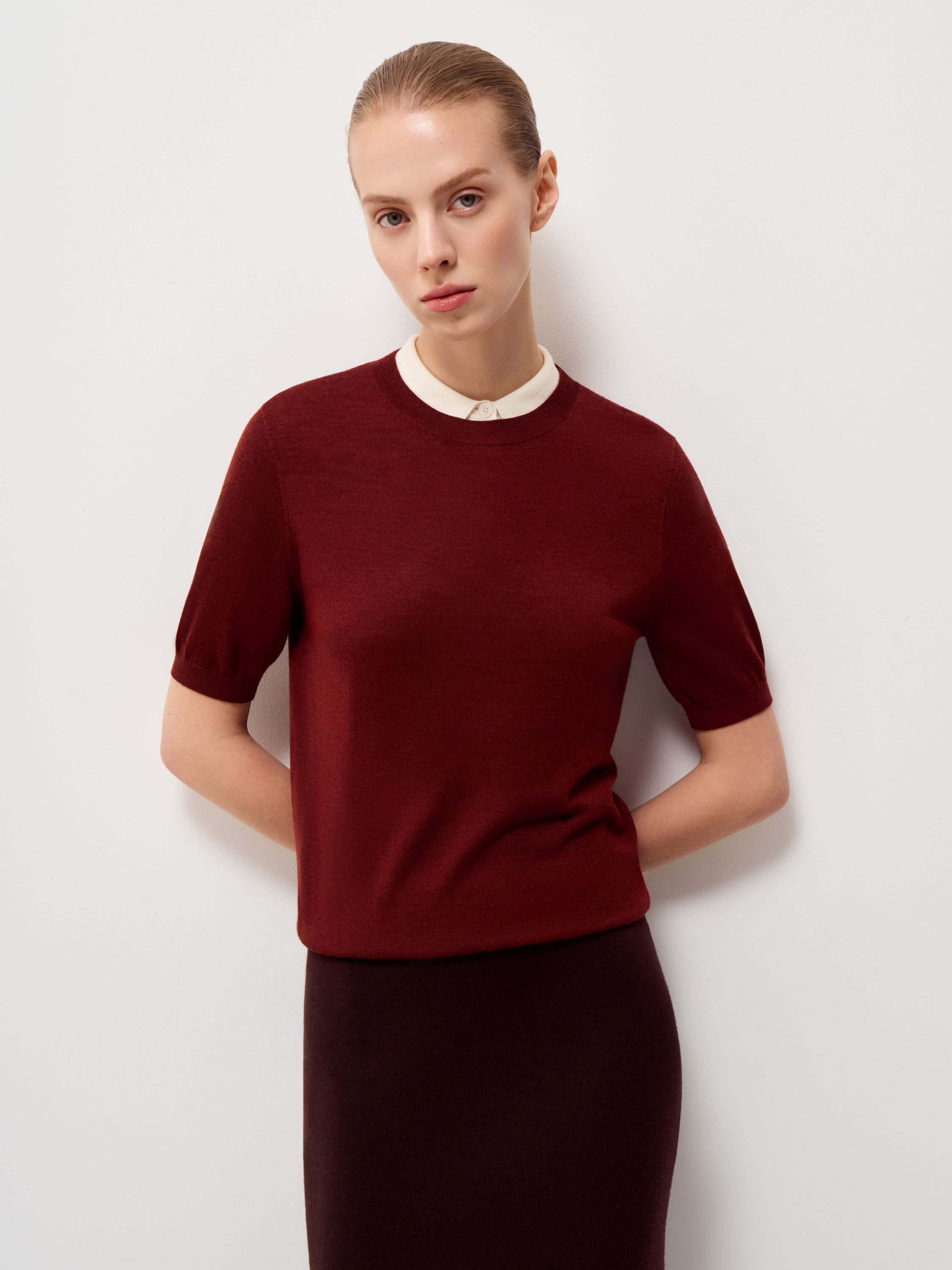Трикотажный джемпер выполнен из смесовой пряжи на основе мериносовой шерсти с добавлением шелка. Материал тонкий, гладкий, с мягкой пластикой и ровной поверхностью, комфортно прилегает к телу и сохраняет форму. Модель прямого кроя, с коротким рукавом и аккуратной круглой горловиной. Низ и рукава оформлены плотной резинкой, что фиксирует посадку и добавляет аккуратность силуэту. Оттенок светлый молочный, с нейтральным подтоном. Джемпер уместен в повседневных образах с денимом и трикотажем, а также в более формальных комплектах с костюмными брюками или юбкой.