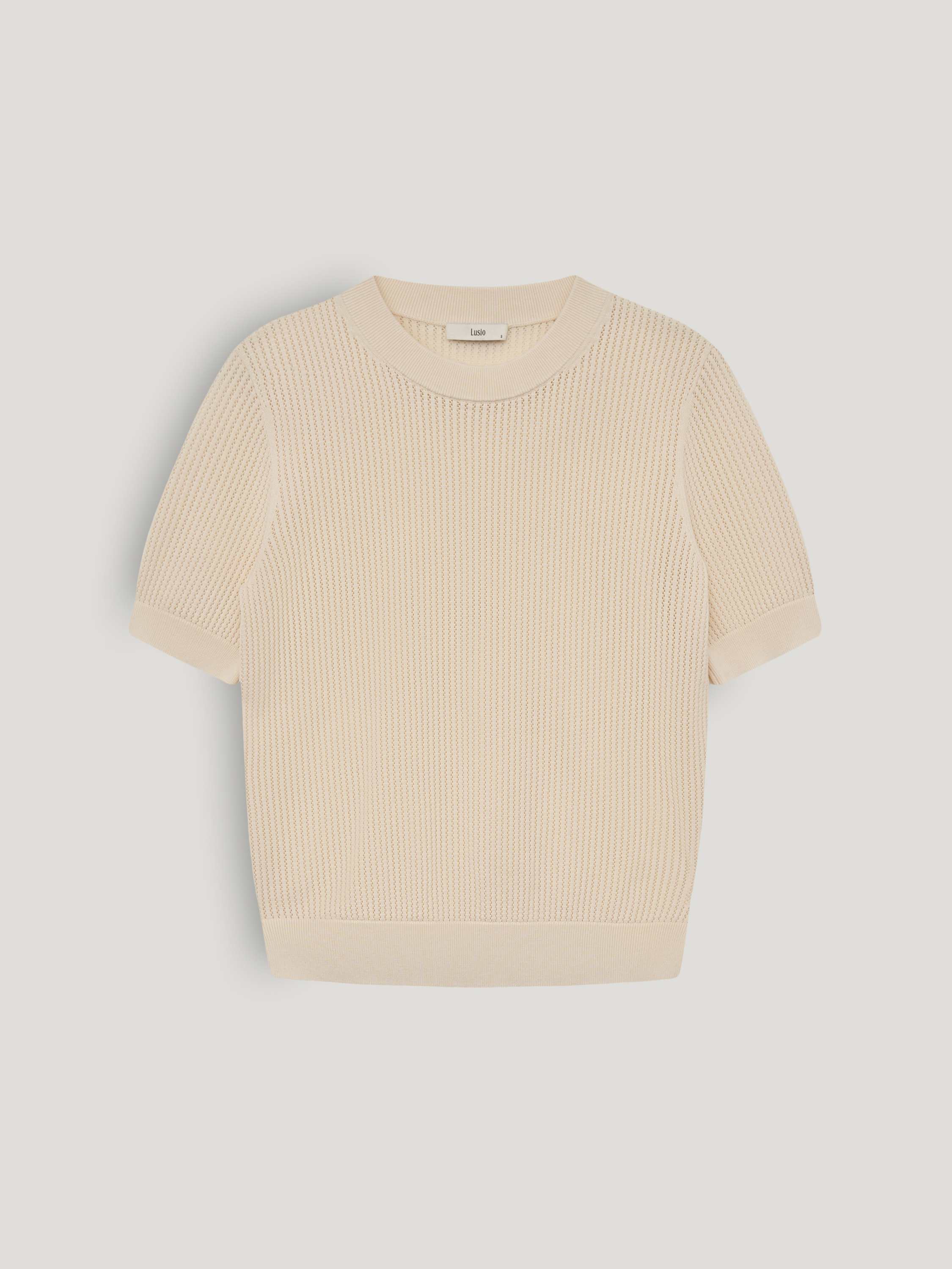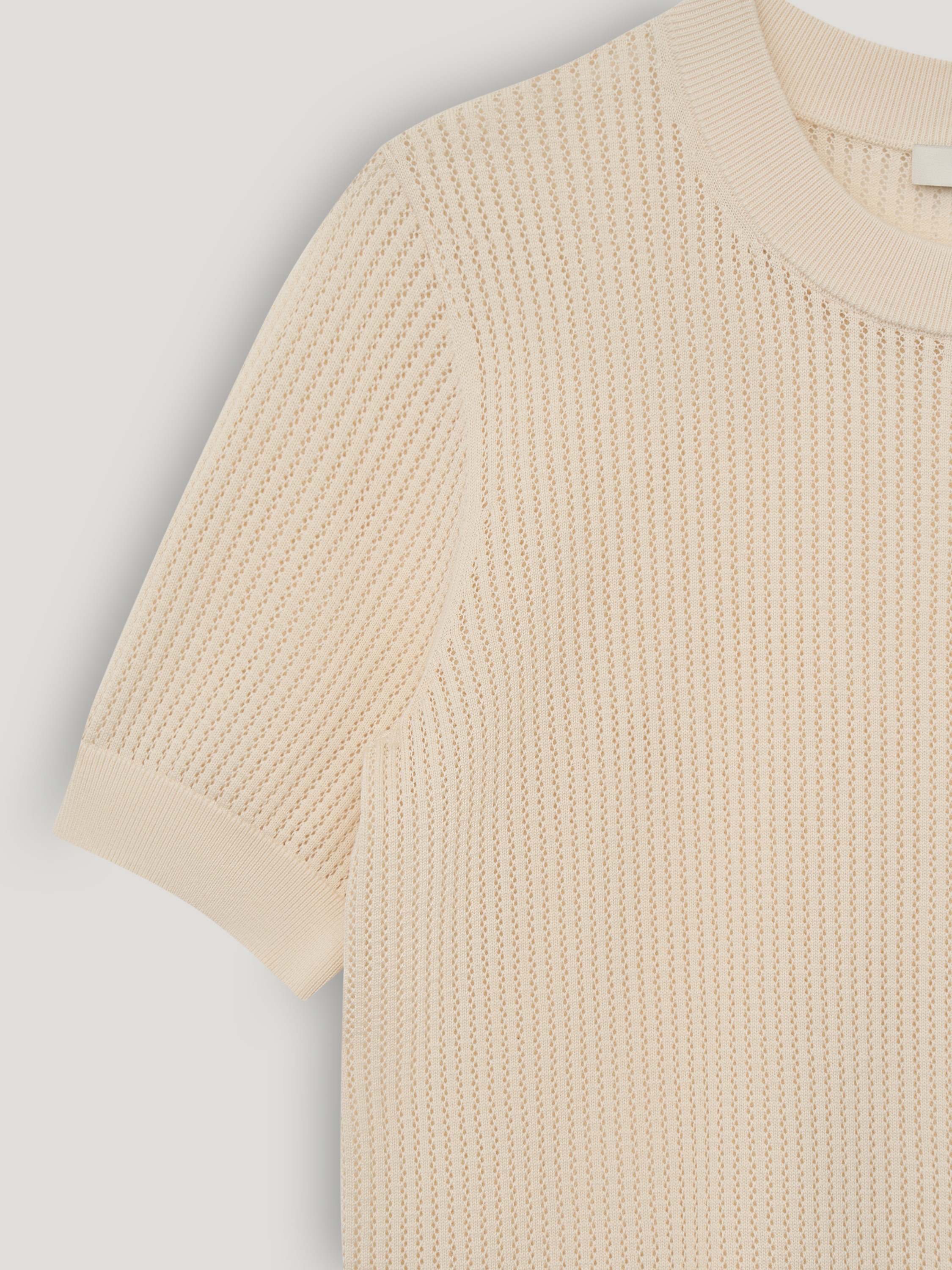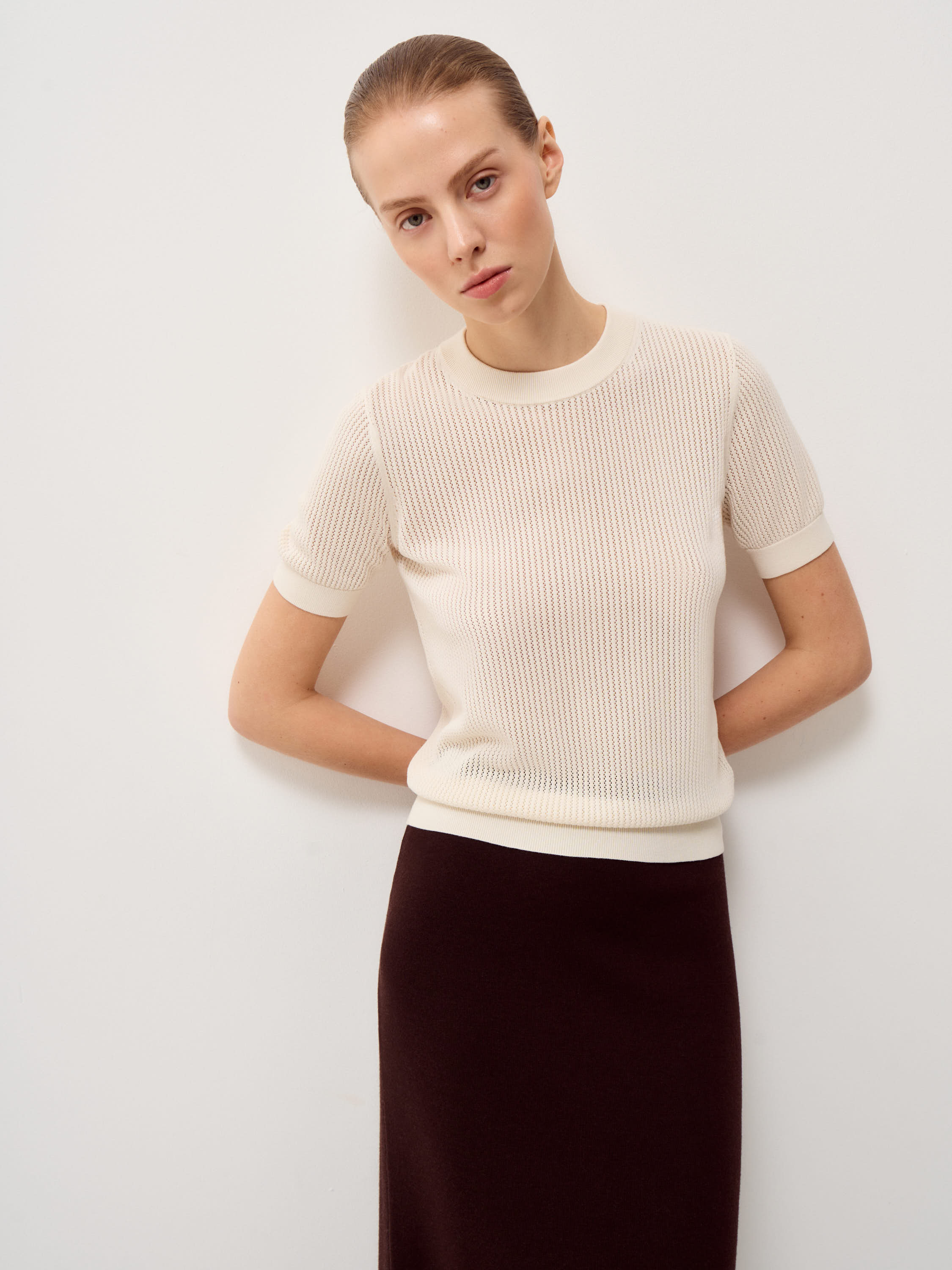Трикотажный топ с лаконичным круглым вырезом и аккуратной линией плеча выполнен из мягкого смесового полотна на основе тенсела с добавлением шерсти и шелка. Фактура остается пластичной, дышащей и комфортной к телу. Вертикальный рельеф вязки формирует аккуратный силуэт без излишнего объема. Эластичные манжеты и нижняя кромка обеспечивают точную посадку. Оттенок светлый, теплый, с мягким сливочным подтоном. Он сочетается с глубокими и нейтральными цветами гардероба и подходит как для самостоятельного образа, так и для многослойных сочетаний.