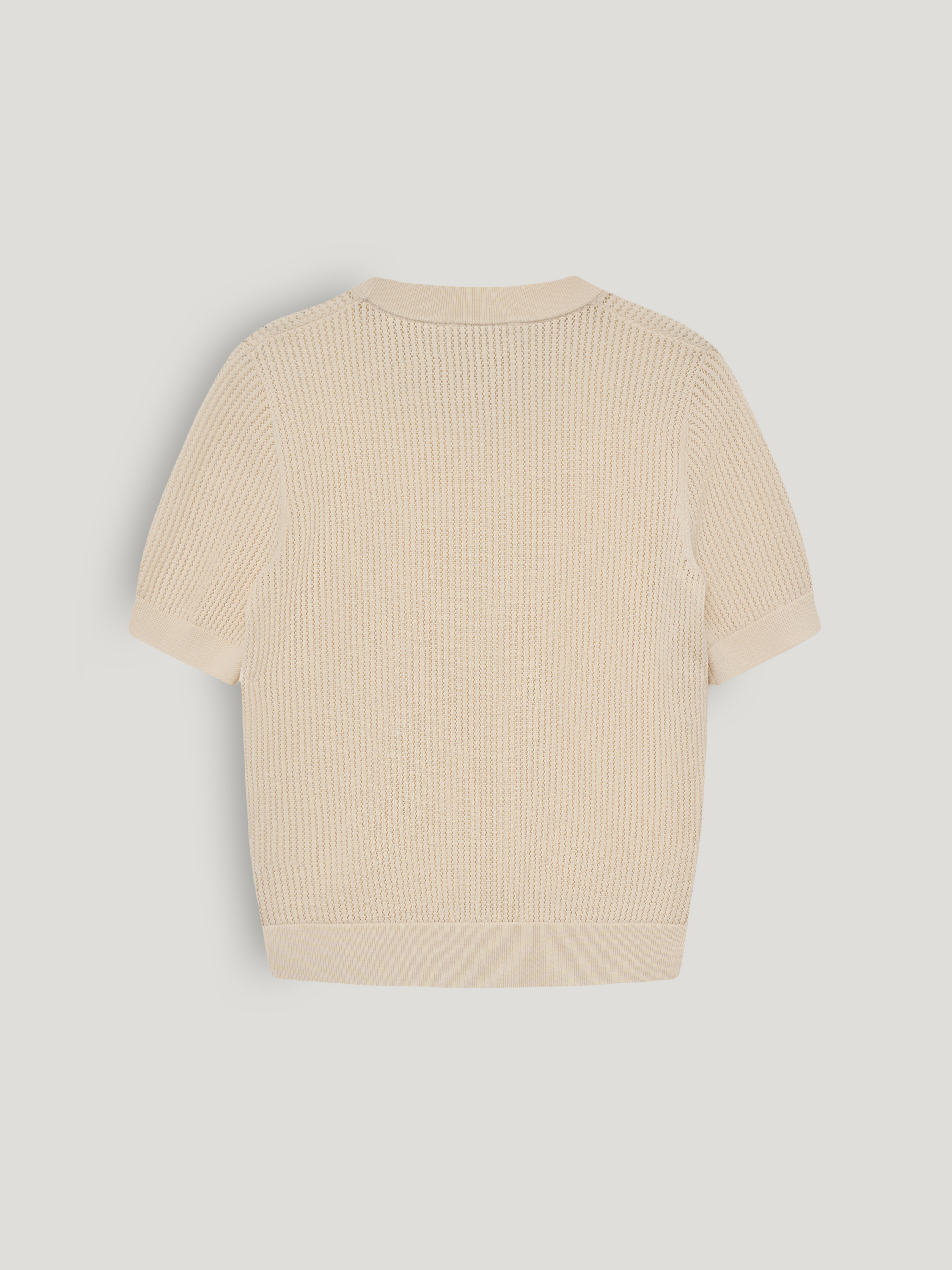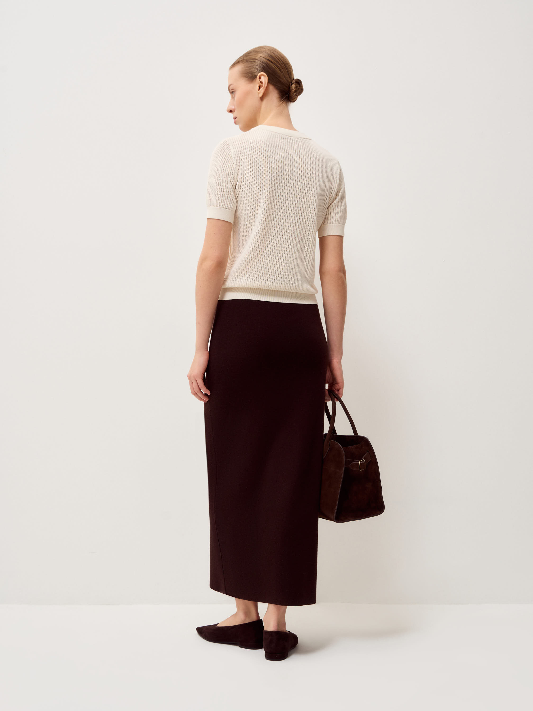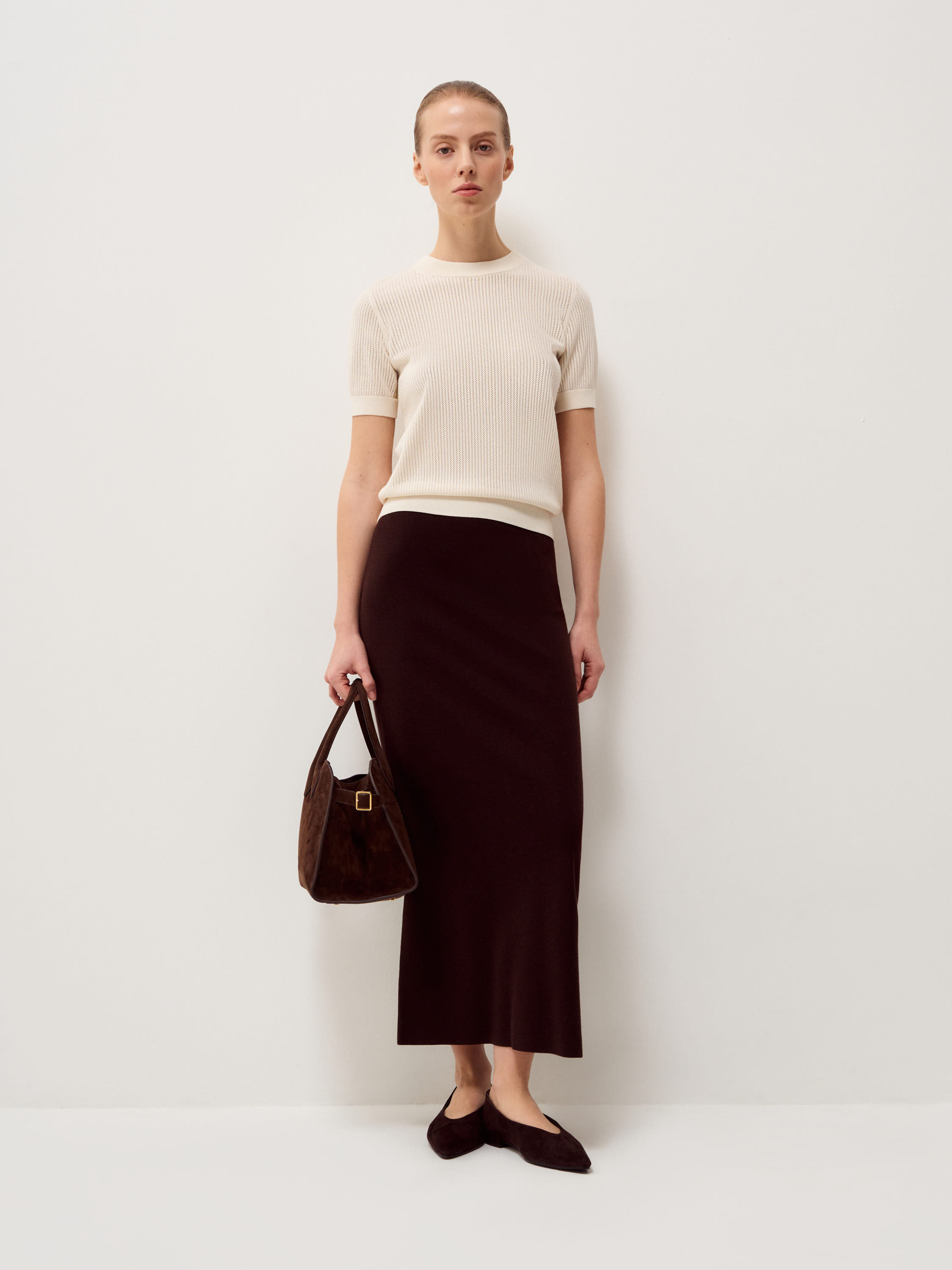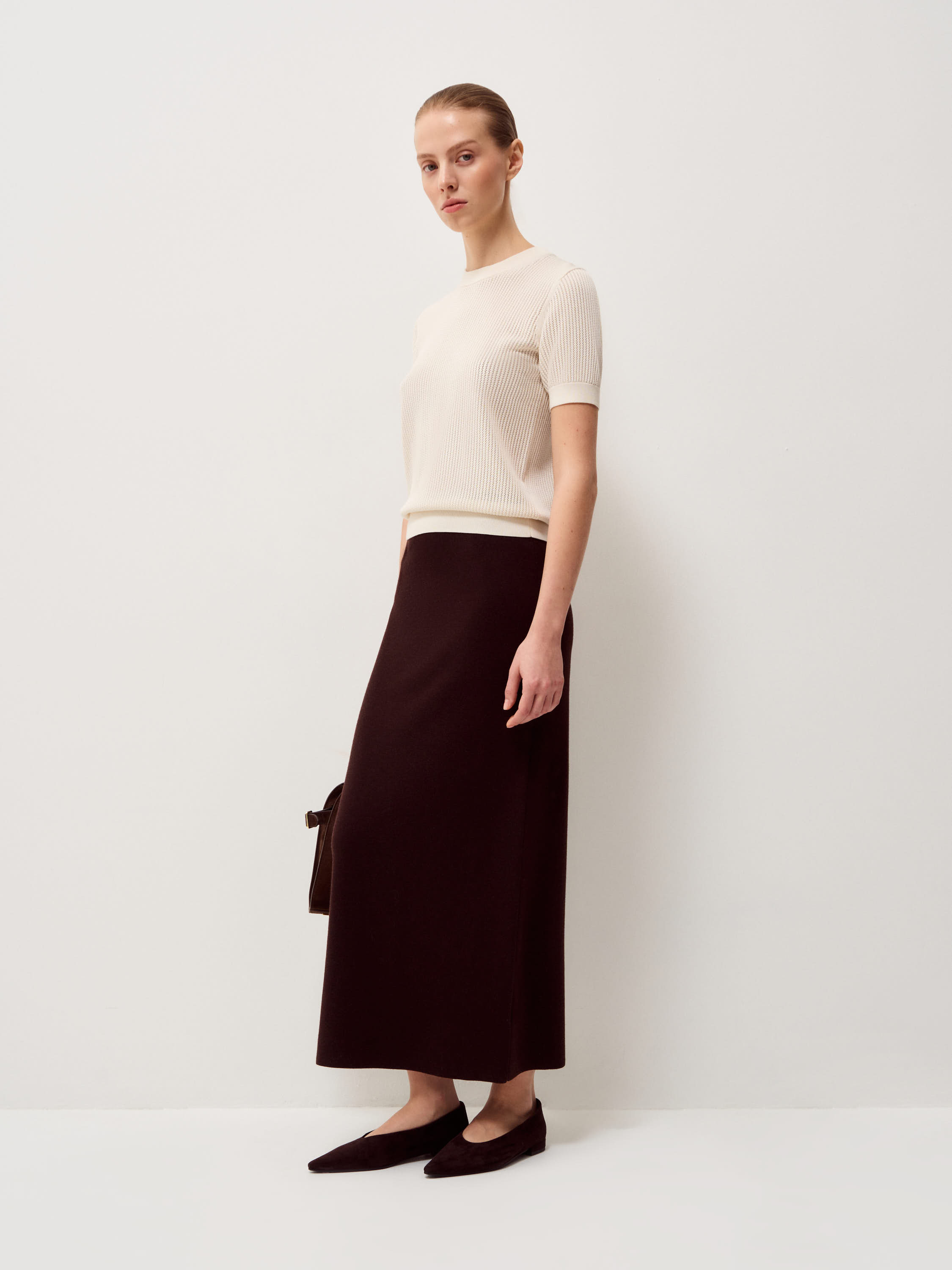 Трикотажный топ с лаконичным круглым вырезом и аккуратной линией плеча выполнен из мягкого смесового полотна на основе тенсела с добавлением шерсти и шелка. Фактура остается пластичной, дышащей и комфортной к телу. Вертикальный рельеф вязки формирует аккуратный силуэт без излишнего объема. Эластичные манжеты и нижняя кромка обеспечивают точную посадку. Оттенок светлый, теплый, с мягким сливочным подтоном. Он сочетается с глубокими и нейтральными цветами гардероба и подходит как для самостоятельного образа, так и для многослойных сочетаний.