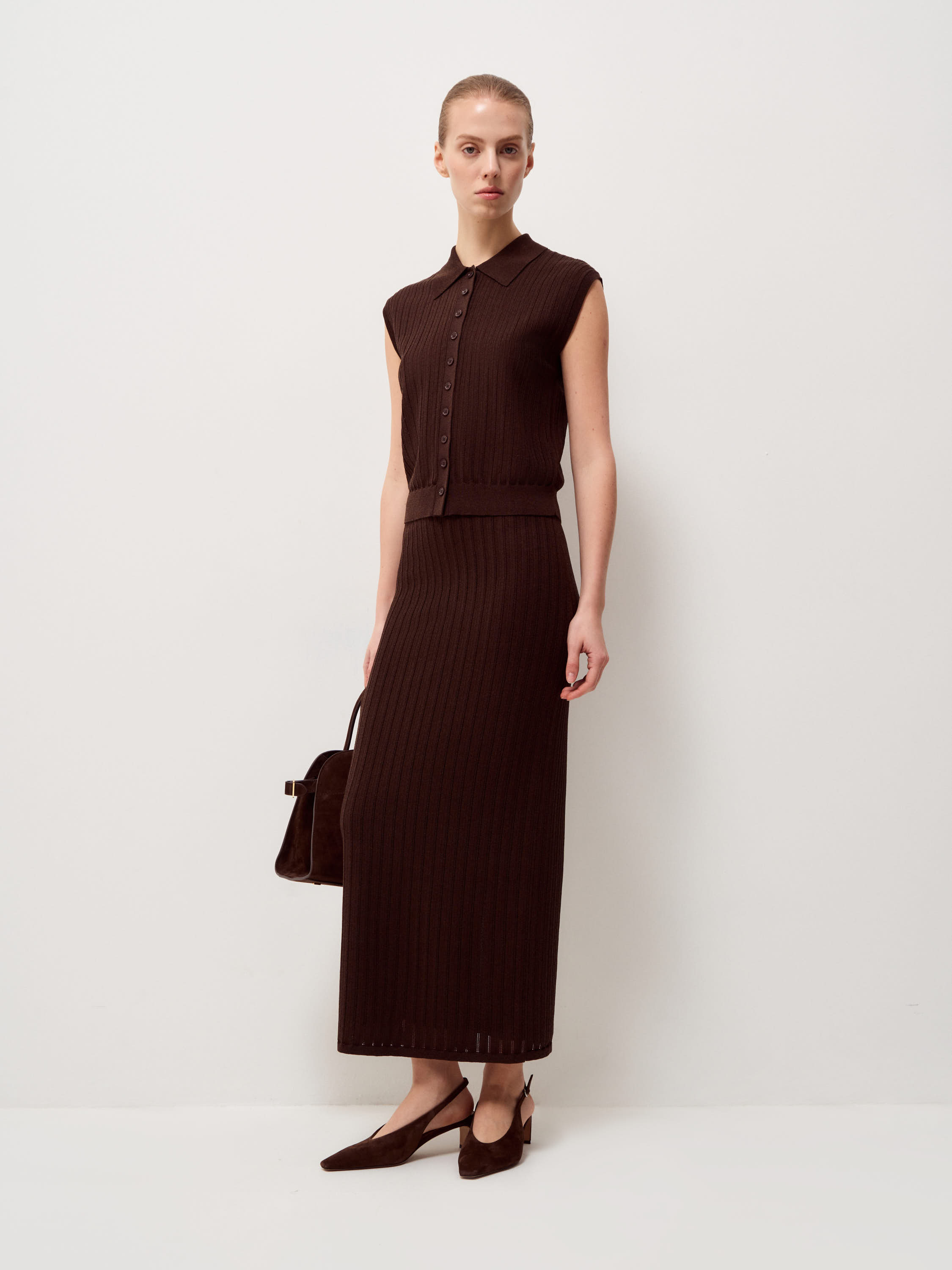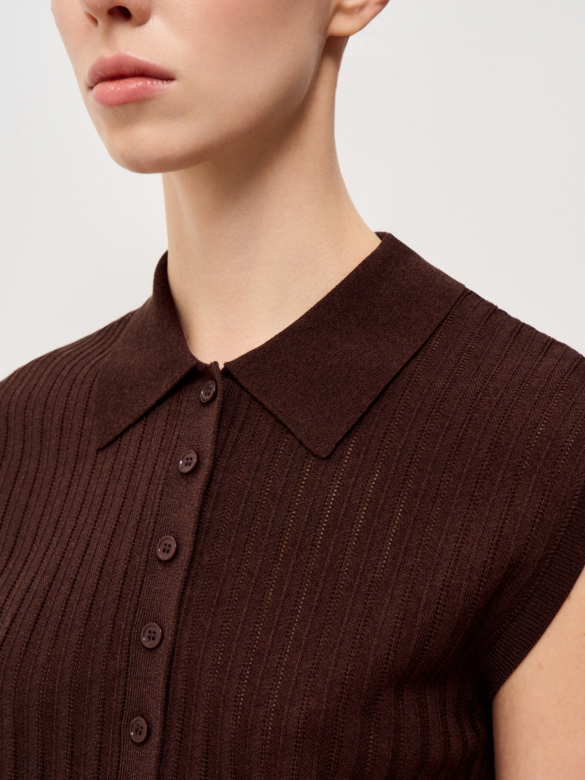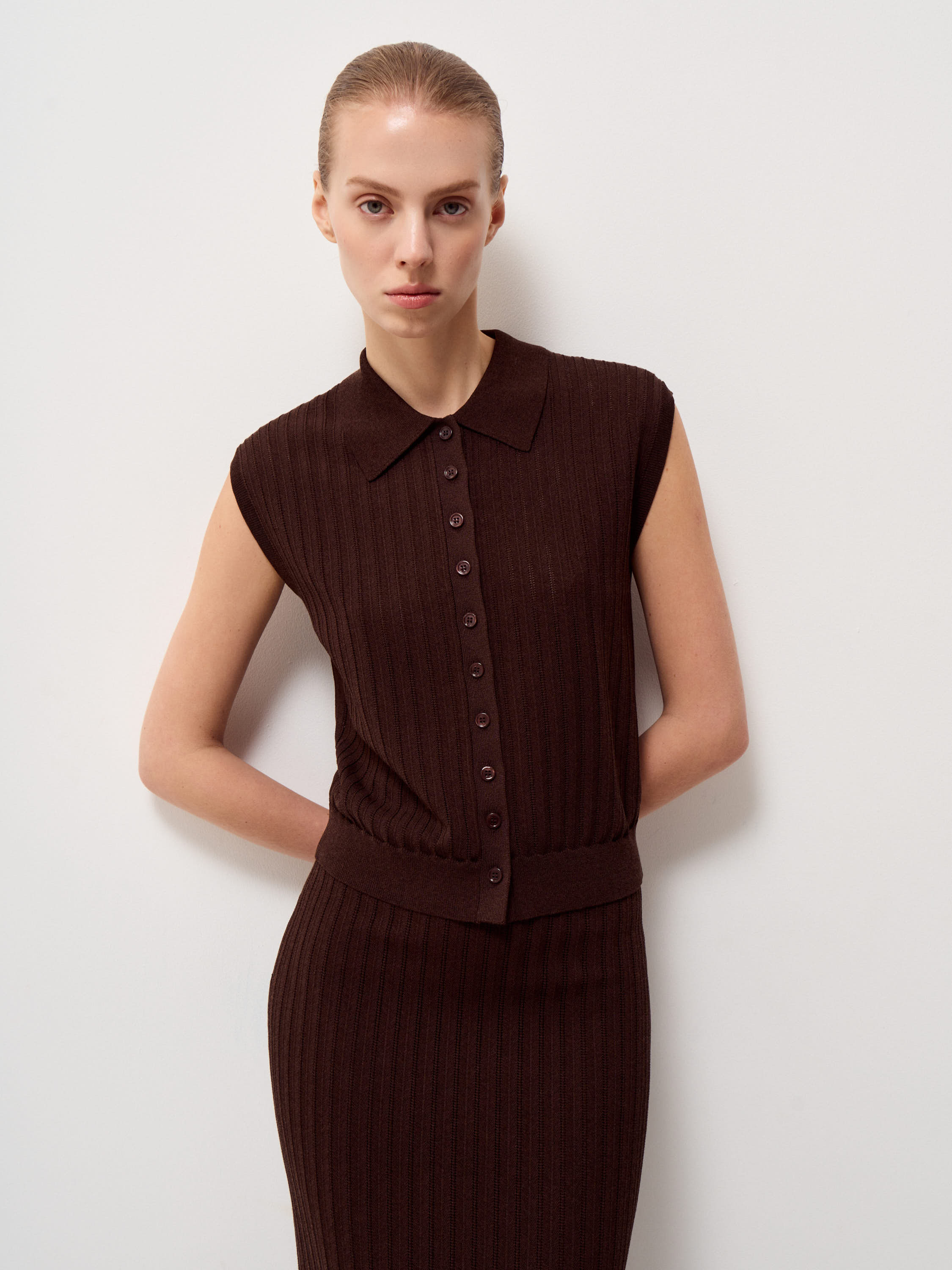 Трикотажный топ выполнен из смесового полотна на основе вискозы с добавлением хлопка и шелка, благодаря материал ощущается мягким, пластичным и при этом держит форму. Вертикальная рельефная вязка задает четкий ритм и визуально вытягивает силуэт, делая модель более собранной. Прямой крой без рукавов уравновешен аккуратным отложным воротником и планкой на пуговицах, что добавляет легкий акцент на зону декольте и позволяет варьировать степень открытости. Плотная резинка по нижнему краю фиксирует посадку и формирует аккуратную линию по талии. Глубокий темно-синий оттенок выглядит насыщенно и благородно, легко сочетается с молочным, бежевым, графитовым и коричневым и подходит как для строгих комплектов, так и для более расслабленных сочетаний.